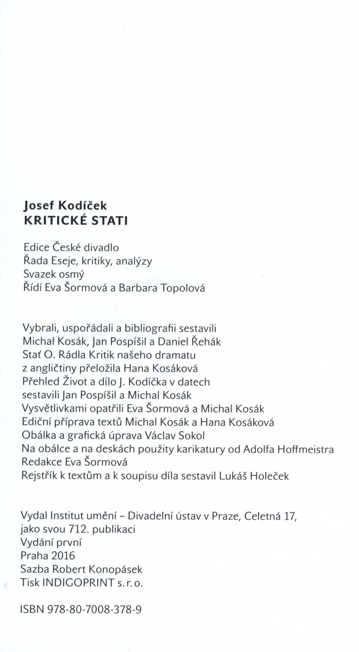 Názvové údaje Josef Svoboda - scénograf / Helena Albertová Osobní jméno Albertová, Helena, 1941- (Autor) Další autoři Svoboda, Josef, 1920-2002 (Umělec) (Ilustrátor) Korp. Institut umění - Divadelní ústav (Praha, Česko) (Nakladatel, vydavatel) Nakladatel Praha : Institut umění - Divadelní ústav, 2012 Rozsah 429 s. : il. (převážně barev.), portréty, plány, faksim. ; 28 cm + 1 DVD Osobní hesla Svoboda, Josef, 1920-2002 - architekt a divadelní výtvarník, scénograf Klíčová slova divadlo * divadelní představení * divadelní osobnosti * scénografové * scénografie * divadelní inscenace * stol. 20.-21. * obrazové publikace * monografické publikace Počet ex. 1, z toho volných 1 Druh dok. monografie Signatura C12d 1930 Názvové údaje Divadlo na Vinohradech 1907-1967 : sborník / uspořádal [a] redigoval Josef Balvín za spolupráce Františka Pavlíčka a Heleny Suchařípové ; [předmluva] František Budský ; snímky Karel Drbohlav, Olga Housková ; [obálka Milan Hegar] Osobní jméno Balvín, Josef, 1923-2009 (Sestavovatel, kompilátor) (Editor) Další autoři Pavlíček, František, 1923-2004 (Sestavovatel, kompilátor) Suchařípová, Helena, 1937-2013 (Sestavovatel, kompilátor) Budský, František, 1920- (Autor úvodu atd.) Drbohlav, Karel, 1908-1971 (Fotograf) Jílovská Housková, Olga, 1919-2015 (Fotograf) Hegar, Milan, 1921-1987 (Autor obálky) Korp. Divadlo na Vinohradech (Nakladatel, vydavatel) Divadelní ústav (Praha, Česko) (Nakladatel, vydavatel) Nakladatel Praha : Divadelní ústav, 1968 Výrobce MTZ) Rozsah 271 s. : il ; 4° Klíčová slova české divadlo * Divadlo na Vinohradech * divadelní představení * herci * dějiny divadla * sborník Počet ex. 1, z toho volných 1 Druh dok. monografie Signatura M 167 a 12 Názvové údaje Česká divadelní fotografie : 1859-2017 / Martin Bernátek, Anna Hejmová, Martina Novozámská ; grafická úprava a sazba: Klára Zápotocká, Kryštof Doležal - Studio Breisky Osobní jméno Bernátek, Martin, 1986- (Autor) Další autoři Hejmová, Anna, 1982- (Autor) Novozámská, Martina, 1974- (Autor) Zápotocká, Klára, 1985- (Knižní grafik) Doležal, Kryštof, 1976- (Knižní grafik) Korp. Institut umění - Divadelní ústav (Praha, Česko) (Nakladatel, vydavatel) Tiskárna Libertas (Tiskař) Nakladatel V Praze : Institut umění - Divadelní ústav, 2018 Výrobce Praha : Tiskárna Libertas a.s. Rozsah 223 stran : ilustrace (některé barevné), portréty, faksimile ; 29 cm Předmětová hesla theater photography - Czechia - 19th-21st centuries * history of photography - Czechia - 19th-21st centuries * theater - Czechia - 19th-21st centuries Klíčová slova česká literatura * fotografická publikace * divadlo * dějiny fotografie * divadelní fotografie * Česko * r. 1859-2017 * stol. 20.-21. Počet ex. 1, z toho volných 1 Druh dok. monografie Signatura C12d 2366 Názvové údaje Hudební divadlo v českých zemích : osobnosti 19. století / Jitka Ludvová a kolektiv ; [zpracoval Kabinet pro studium českého divadla Divadelního ústavu s externími spolupracovníky] Záhlaví-korpor. Divadelní ústav (Praha, Česko). Kabinet pro studium českého divadla (Nakladatel, vydavatel) Další autoři Ludvová, Jitka, 1943- (Autor) (Editor) Nakladatel Praha : Divadelní ústav : Academia, 2006 Rozsah 700 s. : il. Klíčová slova hudební divadlo * divadelní umělci * hudebníci * encyklopedie * slovníky * stručné biografie Počet ex. 1, z toho volných 1 Druh dok. monografie Signatura PS 0 Názvové údaje Kapitoly o režii / Antonín Dvořák Osobní jméno Dvořák, Antonín, 1920-1997 (Autor) Další autoři Divadelní ústav (Praha, Česko) (Nakladatel, vydavatel) Nakladatel Praha : Divadelní ústav, 1981 Výrobce Tiskařské závody 77) Rozsah 177 s. Klíčová slova divadlo * divadelní režie * režijní práce * režiséři * divadelní herci * studie * monografie Počet ex. 1, z toho volných 1 Druh dok. monografie Signatura C12b 14197 Názvové údaje Vy si mne s někým pletete..., aneb, Z besed na filosofické fakultě : Jan Werich, Hugo Haas, Zdeněk Štěpánek, Jiří Suchý, Ivan Vyskočil / přepsal a komentoval Josef Herman Osobní jméno Herman, Josef, 1955- (Autor) (Autor úvodu atd.) (Sestavovatel, kompilátor) (Autor komentáře) Další autoři Černý, František, 1926-2010 (Autor doslovu, tiráže atd.) Stejskal, Martin, 1944- (Knižní grafik) Korp. Divadelní ústav (Praha, Česko) (Nakladatel, vydavatel) Nakladatel V Praze : Divadelní ústav, 1994 Rozsah 167 stran : ilustrace, fotografie, portréty ; 15 cm Osobní hesla Haas, Hugo, 1901-1968 - herec a režisér * Suchý, Jiří, 1931 říjen 1.- - textař, zpěvák, autor pásem a her, divadelník, básník, spisovatel, skladatel, výtvarník a grafik * Vyskočil, Ivan, 1929-2023 - herec, dramatik, prozaik, VŠ pedagog * Werich, Jan, 1905-1980 - filmový a divadelní herec, dramatik a filmový scenárista, spisovatel * Štěpánek, Zdeněk, 1896-1968 - herec, prozaik Předmětová hesla herci - Česko * čeští herci Klíčová slova česká literatura * besedy * filozofická fakulta, UK Praha * divadlo * české osobnosti * výbor * dobové fotografie * Werich J. * Haas H. * Štěpánek Z. * Suchý J. * Vyskočil I. * stol. 20., 2. pol. Počet ex. 1, z toho volných 1 Druh dok. monografie Signatura VZinková 0017 Názvové údaje Starší divadlo v českých zemích do konce 18. století : osobnosti a díla / Alena Jakubcová a kolektiv ; [zpracoval Kabinet pro studium českého divadla Divadelního ústavu s externími spolupracovníky] Osobní jméno Jakubcová, Alena, 1960- (Autor) Další autoři Divadelní ústav (Praha, Česko). Kabinet pro studium českého divadla (Autor) Nakladatel Praha : Divadelní ústav : Academia, 2007 Rozsah 760 s. : il. Klíčová slova divadlo * divadelní osobnosti * divadelní umělci * české země * poč.-stol. 18. * encyklopedie * životopisná encykloped