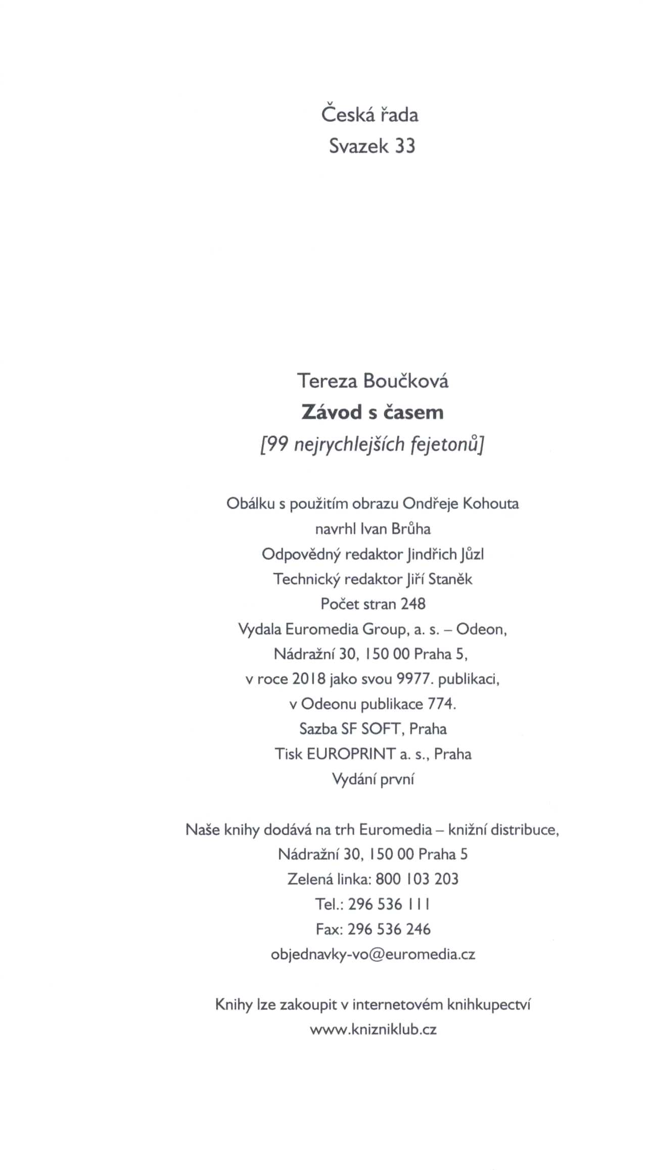 Názvové údaje O život princezny : případy královského soudce Melichara / Jan Bauer ; obálku navrhla Barbora Ondřichová Osobní jméno Bauer, Jan, 1945-2025 (Autor) Další autoři Ondřichová, Barbora, 1991- (Autor obálky) Korp. Nakladatelství BRÁNA (Nakladatel, vydavatel) Europrint (tiskárna) (Tiskař) Nakladatel Praha : Brána, 2018 Výrobce Europrint a.s. Rozsah 215 stran ; 21 cm Klíčová slova česká próza * historický román * detektivní román Počet ex. 1, z toho volných 1 Druh dok. monografie Signatura C12b 18217 Názvové údaje Žižkovské pavlače / Kateřina Bečková, Ivan Vavřík, Rudo Prekop ; grafická úprava a sazba Jiří Vašíček Osobní jméno Bečková, Kateřina, 1957- (Autor) Další autoři Vavřík, Ivan, 1958- (Autor) Prekop, Rudolf, 1959- (Fotograf) Vašíček, Jiří, 1958- (Knižní grafik) (Sazeč) Korp. Městská část Praha 3 (Nakladatel, vydavatel) Europrint (tiskárna) (Tiskař) Nakladatel Praha : Městská část Praha 3, 2015 Výrobce Europrint a.s. Rozsah 109 stran : ilustrace (převážně barevné), faksimile, portréty, plány ; 15 x 21 cm Geografické heslo Žižkov (Praha, Česko) Klíčová slova kulturní památky * architektonické památky * architektura domů * informační publikace * fotografická publikace Počet ex. 1, z toho volných 1 Druh dok. monografie Signatura C12a 5796 Názvové údaje Závod s časem : (99 nejrychlejších fejetonů) / Tereza Boučková ; obálku s použitím obrazu Ondřeje Kohouta navrhl Ivan Brůha Osobní jméno Boučková, Tereza, 1957- (Autor) Další autoři Brůha, Ivan, 1960- (Autor obálky) Kohout, Ondřej, 1953- (Umělec) Korp. Odeon (nakladatelství) (Nakladatel, vydavatel) Europrint (tiskárna) (Tiskař) Nakladatel Praha : Odeon, 2018 Výrobce Praha : EUROPRINT a. s. Rozsah 238 stran ; 21 cm Klíčová slova česká literatura * próza * výbor * fejetony Počet ex. 1, z toho volných 1 Druh dok. monografie Signatura C12b 18603 Názvové údaje Co si vyprávějí andělé? : fantasy všedního dne / Pavel Brycz ; ilustrovala Zuzana Seye ; [grafická úprava, obálka a sazba Klára Šimečková] Osobní jméno Brycz, Pavel, 1968- (Autor) Další autoři Klementová, Zuzana, 1981- (Ilustrátor) Šimečková, Klára, 1976- (Knižní grafik) (Autor obálky) (Sazeč) Korp. Mladá fronta (nakladatelství) (Nakladatel, vydavatel) Europrint (tiskárna) (Tiskař) Nakladatel Praha : Mladá fronta, 2011 Výrobce (Europrint) Rozsah 106 s. : il. ; 25 cm Klíčová slova česká literatura * česká próza * fantasy * andělé * literatura pro děti Počet ex. 1, z toho volných 1 Druh dok. monografie Signatura C12b 15813 Názvové údaje Muž bez ženy není člověk / Pavel Brycz ; [grafická úprava Michal Chodanič] Osobní jméno Brycz, Pavel, 1968- (Autor) Další autoři Chodanič, Michal, 1973- (Knižní grafik) Korp. Mladá fronta (nakladatelství) (Nakladatel, vydavatel) Europrint (tiskárna) (Tiskař) Nakladatel Praha : Mladá fronta, 2014 Rozsah 253 s. : il. Klíčová slova česká próza * humoristický román Počet ex. 1, z toho volných 1 Druh dok. monografie Signatura C12b 15461 Názvové údaje Arnošt Lustig zadním vchodem : autorizovaný životopis / František Cinger ; fotografie na přebalu Lukáš Táborský Osobní jméno Cinger, František, 1956- (Autor) Další autoři Táborský, Lukáš (Fotograf) Korp. Mladá fronta (nakladatelství) (Nakladatel, vydavatel) Europrint (tiskárna) (Tiskař) Nakladatel Praha : Mladá fronta, 2009 Výrobce Europrint, a.s. Rozsah 309 stran, 32 nečíslovaných stran obrazových příloh : ilustrace (některé barevné), portréty ; 20,5 cm Osobní hesla Lustig, Arnošt, 1926-2011 - spisovatel, scenárista, novinář a historik Klíčová slova čeští spisovatelé * židovští spisovatelé * přátelé a spolupracovníci * cesty a pobyt * literární činnost * literatura a společnost * stol. 20.-21. * vzpomínky * rozhovory Počet ex. 2, z toho volných 2 Druh dok. monografie Signatura C12b 11820, LITb 02387 Názvové údaje R.U.R. : Rossum's Universal Robots : kolektivní drama o vstupní komedii a třech dějstvích / Karel Čapek ; obálku zhotovil Jiří Miňovský Osobní jméno Čapek, Karel, 1890-1938 (Autor) Další autoři Miňovský, Jiří "Arbe", 1978- (Autor obálky) Korp. Europrint (tiskárna) (Tiskař) Nakladatel Praha : Dobrovský s.r.o., 2016 Výrobce Europrint a.s. Rozsah 123 stran ; 16 cm Klíčová slova česká dramata * vědecko-fantastická próza * divadelní hry Počet ex. 1, z toho volných 1 Druh dok. monografie Signatura C12a 6080 Názvové údaje Géniové bez potlesku / Tomáš Čechtický ; grafická úprava: Michail Stavrev Osobní jméno Čechtický, Tomáš, 1952- (Autor) Další autoři Stavrev, Michail Emilov (Knižní grafik) Korp. Empresa Media (firma) (Nakladatel, vydavatel) Europrint (tiskárna) (Tiskař) Nakladatel Praha : Empresa Media, 2018 Výrobce Praha : EUROPRINT a.s. Rozsah 176 stran : ilustrace, portréty ; 24 cm Klíčová slova česká literatura * literatura faktu * historie * medailony osobností * Česko * stol. 15.-20. Počet ex. 1, z toho volných 1 Druh dok. monografie Signatura C12c 5116 Názvové údaje Géniové ve stínu / Tomáš Čechtický ; grafická úprava: Markéta Snopová, Michail Stavrev, Jindřich Král Osobní jméno Čechtický, Tomáš, 1952- (Autor) Další autoři Snopová, Markéta (Knižní grafik) Stavrev, Michail Emilov (Knižní grafik) Král, Jindřich (Knižní grafik) Korp. Empresa Media (firma) (Nakladatel, vydavatel) Europrint (tiskárna) (Tiskař) Nakladatel Praha : Empresa Media, 2017 Výrobce Praha : EUROPRINT a.s. Rozsah 167 stran : ilustrace, portréty ; 24 cm Klíčová slova česká literatura * literatura faktu * historie * medailony osobností * Česko * stol. 17.-20. Počet ex. 1, z toho volných 1 Druh dok. monografie Signatura C12c 5117 Názvové údaje Život ve stínu smrti. Dopisy Robertovi / Josef Čermák / Franz Kafka 