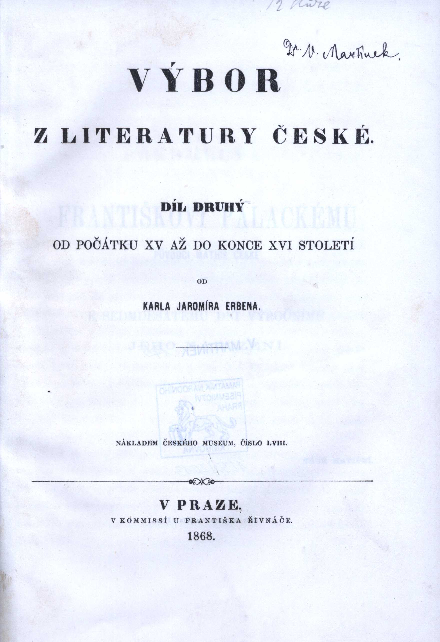 Názvové údaje Žáby : komedie Aristophanova / Aristofanés ; přeložil Václav Nebeský Autor Aristofanés, asi 445-asi 386 př. Kr. (Nakladatel, vydavatel) Další autoři Nebeský, Václav Bolemír, 1818-1882 (Překladatel) Korp. Museum Království českého (Praha, Česko) (Nakladatel, vydavatel) František Řivnáč (nakladatelství) (Nakladatel, vydavatel) Nakladatel V Praze : Museum království českého : Fr. Řivnáč, 1870 Rozsah 113 stran Klíčová slova antická literatura * komedie * hry Počet ex. 1, z toho volných 1 Druh dok. monografie Signatura L V k 59 Názvové údaje Dějiny konfiskací v Čechách po r. 1618 / dle pramenů sepsal Tomáš V. Bílek. [část 1.] Osobní jméno Bílek, Tomáš Václav, 1819-1903 (Autor) Další autoři Museum Království českého (Praha, Česko) (Nakladatel, vydavatel) František Řivnáč (nakladatelství) (Knihkupec) J. Otto (knihtiskárna) (Tiskař) Tělocvičná jednota Sokol. Úhonice - Ptíče (tělocvičná jednota) (Dřívější majitel) Čtenářský zpěvácký spolek Dalibor (spolek) (Dřívější majitel) Nakladatel V Praze : Nákladem Musea Království českého, 1882 Výrobce (J. Otto) Rozsah cl, 672 s. Klíčová slova česká literatura * české dějiny * česká historie * pobělohorská doba * konfiskace Počet ex. 2, z toho volných 2 Druh dok. monografie Signatura KaG XXIX A 11a, P IV E 7 Názvové údaje Dějiny konfiskací v Čechách po r. 1618 / dle pramenů sepsal Tomáš V. Bílek. část 2. Osobní jméno Bílek, Tomáš Václav, 1819-1903 (Autor) Další autoři Museum Království českého (Praha, Česko) (Nakladatel, vydavatel) František Řivnáč (nakladatelství) (Knihkupec) J. Otto (knihtiskárna) (Tiskař) Tělocvičná jednota Sokol. Úhonice - Ptíče (tělocvičná jednota) (Dřívější majitel) Čtenářský zpěvácký spolek Dalibor (spolek) (Dřívější majitel) Nakladatel V Praze : Nákladem Musea Království českého, 1883 Výrobce (J. Otto) Rozsah s. 673-1470 Klíčová slova česká literatura * české dějiny * česká historie * pobělohorská doba * konfiskace Počet ex. 2, z toho volných 2 Druh dok. monografie Signatura KaG XXIX A 11b, P IV E 8 Názvové údaje Řivnáč's Führer durch den Böhmerwald : ausführliche Beschreibung des ganzen Böhmerwaldes, seines Geländes, der nahen wichtigen Städte und Gegenden, und das Gratzener Gebirges / von F. A. Borovský ; durchgesehen und ergänzt von J. Krejčí Osobní jméno Borovský, František Adolf, 1852-1933 (Autor) Další autoři Krejčí, Jan, 1825-1887 (Editor) Korp. František Řivnáč (nakladatelství) (Nakladatel, vydavatel) J. Otto (knihtiskárna) (Tiskař) Nakladatel Prag : Im Verlage der Buchhandlung F. Řivnáč, 1883 Výrobce (Druck von J. Otto) Rozsah 235 s., [2] příl. : mapy Klíčová slova česká literatura * průvodce * turistický průvodce * vlastivědný průvodce * Šumava Počet ex. 1, z toho volných 1 Druh dok. monografie Signatura KaG VII C2 81 Názvové údaje Alegorie Nové rady a Theriobulie / napsal Jan B. Čapek Osobní jméno Čapek, Jan Blahoslav, 1903-1982 (Autor) (Dedikátor) Další autoři Patočka, Jan, 1907-1977 (Dedikant) Flaška z Pardubic a Rychmburku, Smil, asi 1349-1403 Nová rada (Autor) Dubravius, Jan, asi 1486-1553 Theriobulie (Autor) Korp. Královská česká společnost nauk (Nakladatel, vydavatel) František. Řivnáč (nakladatelství) (Distributor) Dr. Ed. Grégr a syn (nakladatelství, tiskárna) (Tiskař) Nakladatel Praha : Nákladem Královské české společnosti nauk, 1937 Distributor V komisi Fr. Řivnáče, knihkupce Výrobce Tiskem Dra Ed. Grégra a syna Rozsah 53 stran ; 24,5 cm Klíčová slova česká poezie * středověká poezie * literární alegorie * politické alegorie * náboženská tematika * náboženská symbolika * literárněhistorická studie * přednášky Počet ex. 1, z toho volných 1 Druh dok. monografie Signatura Patočka 0119 Názvové údaje Františka Ladisl. Čelakovského Čtení o srovnavací mluvnici slovanské na Universitě pražské Osobní jméno Čelakovský, František Ladislav, 1799-1852 (Autor) Další autoři České museum (Praha, Česko) (Nakladatel, vydavatel) František Řivnáč (nakladatelství) (Distributor) Bohumil Haase a synové (tiskárna, nakladatelství, knihkupectví) (Tiskař) Nakladatel V Praze : Nákladem Českého musea : V komisí u Františka Řivnáče [distributor], 1853 Výrobce (Tisk Synů Boh. Haase) Rozsah xii, 357 s. Klíčová slova srovnávací mluvnice * slovanské jazyky * jazykové rozbory * srovnávací studie * pražská univerzita * učební texty Počet ex. 2, z toho volných 2 Druh dok. monografie Signatura M 208 e 28, VMartínek 0789 Názvové údaje Francouzsky pro samouky : [Metoda d'Alfonsa] / Nicola d'Alfonso Osobní jméno D'Alfonso, Nicola (Autor) Další autoři František Řivnáč (nakladatelství) (Nakladatel, vydavatel) Nakladatel Praha : Fr. Řivnáč, [1929] Rozsah 48 stran Klíčová slova francouzština * jazykové učebnice Počet ex. 1, z toho volných 1 Druh dok. monografie Signatura M 61 b 218 Názvové údaje Heuristické předpoklady fysikálního badání / A. Dratvová Osobní jméno Dratvová, Albína, 1891-1969 (Autor) Další autoři Univerzita Karlova. Přírodovědecká fakulta (Nakladatel, vydavatel) František Řivnáč (nakladatelství) (Distributor) Knihtiskárna Prometheus (Tiskař) Nakladatel Praha : Přírodovědecká fakulta, 1934 Distributor Na skladě má F. Řivnáč Výrobce Tiskem knihtiskárny "Prometheus" Rozsah 32 stran ; 23,5 cm Klíčová slova přírodní vědy * fyzika * bádání Počet ex. 2, z toho volných 2 Druh dok. monografie Signatura M 76 a 387, Patočka 0276 Názvové údaje O aplikabilitě matematiky / A. Dratvová Osobní jméno Dratvová, Albína, 1891-1969 (Autor) Další autoři Patočka, Jan, 1907-1977 (Dedikant) Korp. Univerzita Karlova. Přírodovědecká fakulta (Nakladatel, vydavatel) Knihtiskárna Prometheus