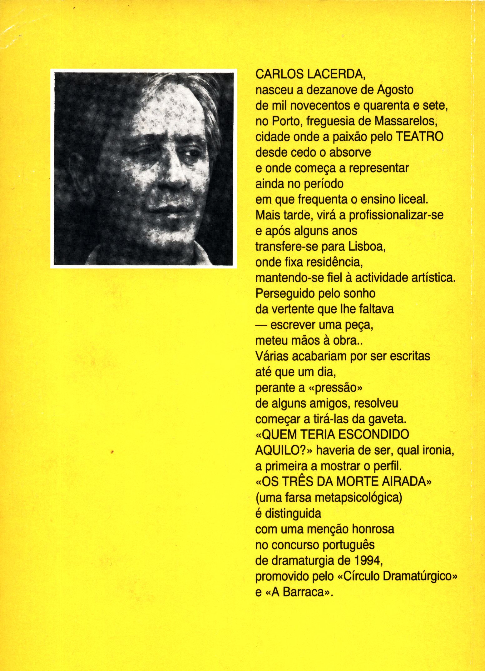 Názvové údaje Epílogo em Ialta : seguido de Adiós muchachos (a última noite de Carlos Gardel), Milena de Praga e Frida e a casa azul ; quatro peças em um acto / José Jorge Letria Osobní jméno Letria, José Jorge, 1951- (Autor) Další autoři Listopad, František, 1921-2017 (Dedikant) Korp. Publicações Dom Quixote (Nakladatel, vydavatel) Gráfica Manuel Barbosa e Filhos (firma) (Tiskař) Nakladatel Lisboa : Publicações Dom Quixote, 1998 Výrobce Gráfica Manuel Barbosa & Filhos Rozsah 140 stran ; 21 cm Klíčová slova portugalská literatura * portugalsky psaná literatura * drama * divadelní drama * stol. 20. Počet ex. 1, z toho volných 1 Druh dok. monografie Signatura Listopad 0319 Názvové údaje O estranho caso do trapezista azul : tragicomédia em três actos com prólogo e epílogo / Mário Cláudio Osobní jméno Cláudio, Mário, 1941- (Autor) Další autoři Publicações Dom Quixote (Nakladatel, vydavatel) Gráfica Manuel Barbosa e Filhos (firma) (Tiskař) Nakladatel Lisboa : Publicações Dom Quixote, 1998 Výrobce Gráfica Manuel Barbosa & Filhos Rozsah 120 stran : černobílá fotografie ; 21 cm Klíčová slova portugalská literatura * portugalsky psaná literatura * stol. 20. * drama Počet ex. 1, z toho volných 1 Druh dok. monografie Signatura Listopad 0325 Názvové údaje Garrett : uma cadeira em S. Bento / Silvina Pereira ; prefacio de Luiz Francisco Rebello Osobní jméno Pereira, Silvina, 1956- (Autor) Další autoři Rebelo, Luís Francisco, 1924-2011 (Autor úvodu atd.) Korp. Publicações Dom Quixote (Nakladatel, vydavatel) Gráfica Manuel Barbosa e Filhos (firma) (Tiskař) Nakladatel Lisboa : Publicações Dom Quixote, 1999 Výrobce Gráfica Manuel Barbosa & Filhos Rozsah 167 stran, 8 stran obrazové přílohy : černobílé ilustrace ; 21 cm Klíčová slova portugalská literatura * portugalsky psaná literatura * drama Počet ex. 1, z toho volných 1 Druh dok. monografie Signatura Listopad 0320 Názvové údaje O guardador de rebanhos / Fernando Pessoa ; ilustração Pedro Proença Osobní jméno Pessoa, Fernando, 1888-1935 (Autor) Další autoři Proença, Pedro (Ilustrátor) Korp. Colares editora (Nakladatel, vydavatel) Gráfica Manuel Barbosa e Filhos (firma) (Tiskař) Nakladatel Sintra : Colares editora, [1992] Výrobce Gráfica Manuel Barbosa e Filhos Rozsah 30 nečíslovaných stran : čb. ilustrace ; 19 cm Klíčová slova portugalská literatura * portugalsky psaná literatura * portugalsky píšící spisovatelé * poezie * básně Počet ex. 1, z toho volných 1 Druh dok. monografie Signatura Listopad 0588 Názvové údaje O Labirinto da Saudade : psicanálise mítica do destino português / Edouardo Lourenço Osobní jméno Lourenço, Eduardo, 1923-2020 (Autor) Další autoři Publicações Dom Quixote (Nakladatel, vydavatel) Gráfica Manuel Barbosa e Filhos (firma) (Tiskař) Nakladatel Lisboa : Biblioteca Dom Quixote, 1988 Výrobce Gráfica Manuel Barbosa & Filhos Rozsah 188 stran ; 21 cm Klíčová slova portugalská literatura * portugalsky psaná literatura * stol. 20. * próza * filologie * psychoanalýza a literatura * literárněvědné rozbory * mytologické aspekty * literární teorie Počet ex. 1, z toho volných 1 Druh dok. monografie Signatura Listopad 0321 Názvové údaje Madame : sobre textos de Eça de Queirós (Os maias) e Machado de Assis (Dom Casmurro) ; teatro / Maria Velho da Costa Osobní jméno Costa, Maria Velho da, 1938- (Autor) Další autoři Publicações Dom Quixote (Nakladatel, vydavatel) Gráfica Manuel Barbosa e Filhos (firma) (Tiskař) Nakladatel Lisboa : Publicações Dom Quixote, 1999 Výrobce Gráfica Manuel Barbosa & Filhos Rozsah 83 stran ; 21 cm Klíčová slova portugalská literatura * portugalsky psaná literatura * spisovatelky * divadlo * stol. 20. Počet ex. 1, z toho volných 1 Druh dok. monografie Signatura Listopad 0316 Názvové údaje Pátrias : seguido de O lixo e A catacumba / Francisco Nicholson ; Prefácio de Luiz Francisco Rebello Osobní jméno Nicholson, Francisco, 1938-2016 (Autor) Další autoři Rebelo, Luís Francisco, 1924-2011 (Autor úvodu atd.) Korp. Publicações Dom Quixote (Nakladatel, vydavatel) Gráfica Manuel Barbosa e Filhos (firma) (Tiskař) Nakladatel Lisboa : Sociedade Portuguesa de Autores/Publicações Dom Quixote, 1998 Výrobce Gráfica Manuel Barbosa & Filhos Rozsah 254 stran ; 21 cm Klíčová slova portugalská literatura * portugalsky psaná literatura * drama * divadlo * stol. 20. Počet ex. 2, z toho volných 2 Druh dok. monografie Signatura Listopad 0323, Listopad 0324 Názvové údaje Perdição : exercício sobre Antígona ; Florbela : teatro / Hélia Correia Osobní jméno Correia, Hélia, 1949- (Autor) Další autoři Publicações Dom Quixote (Nakladatel, vydavatel) Gráfica Manuel Barbosa e Filhos (firma) (Tiskař) Nakladatel Lisboa : Publicações Dom Quixote, 1991 Výrobce Gráfica Manuel Barbosa & Filhos Rozsah 100 stran ; 21 cm Klíčová slova portugalská literatura * portugalsky psaná literatura * drama * divadelní hra * scénář Počet ex. 1, z toho volných 1 Druh dok. monografie Signatura Listopad 0567 Názvové údaje Quem teria escondido aquilo? : comédia psicológica em 1 acto / Carlos Macedo-Lacerda Osobní jméno Lacerda, Carlos Macedo, 1947-2019 (Autor) Další autoři Gráfica Manuel Barbosa e Filhos (firma) (Tiskař) Nakladatel [Lisboa] : [nakladatel není známý], [1994] Výrobce Gráfica Manuel Barbosa & Filhos Copyright ©1994 Rozsah 54 stran ; 21 cm Klíčová slova portugalsky psaná literatura * portugalská literatura * divadelní hry * komedie * scénáře Počet ex. 1, z toho volných 1 Druh dok. monografie Signatura Listopad 0460 Názvové údaje Sem flores nem coroas / Orlando da Costa ; peça em três actos com um estudo cenográfico de João Abel Manta ; prefácio de Luiz Francisco Rebello Osobní jméno Costa, Orlando da, 1929-2006 (Autor) Další autoři Manta, João Abel, 1928- (Scénograf) Rebelo, L