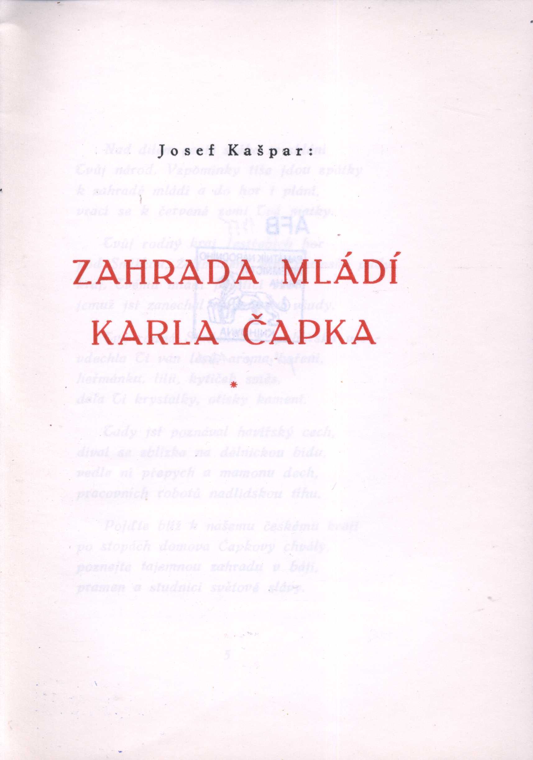 Názvové údaje Zahrada mládí Karla Čapka / Josef Kašpar ; [ilustroval autor] Osobní jméno Kašpar, Josef (Autor) (Ilustrátor) Další autoři Grafický závod V. J. Ehl (Úpice, Česko) Nakladatel [Malé Svatoňovice] : b.n., 1946 Výrobce Grafický závod V. J. Ehl) Rozsah 47 s. : il. Osobní hesla Čapek, Karel, 1890-1938 - spisovatel, dramatik, novinář Klíčová slova česká literatura * biografie * Čapek K. * rodný kraj * stol. 20., 1. pol. Počet ex. 2, z toho volných 2 Druh dok. monografie Signatura C12b 983, AFB 1755