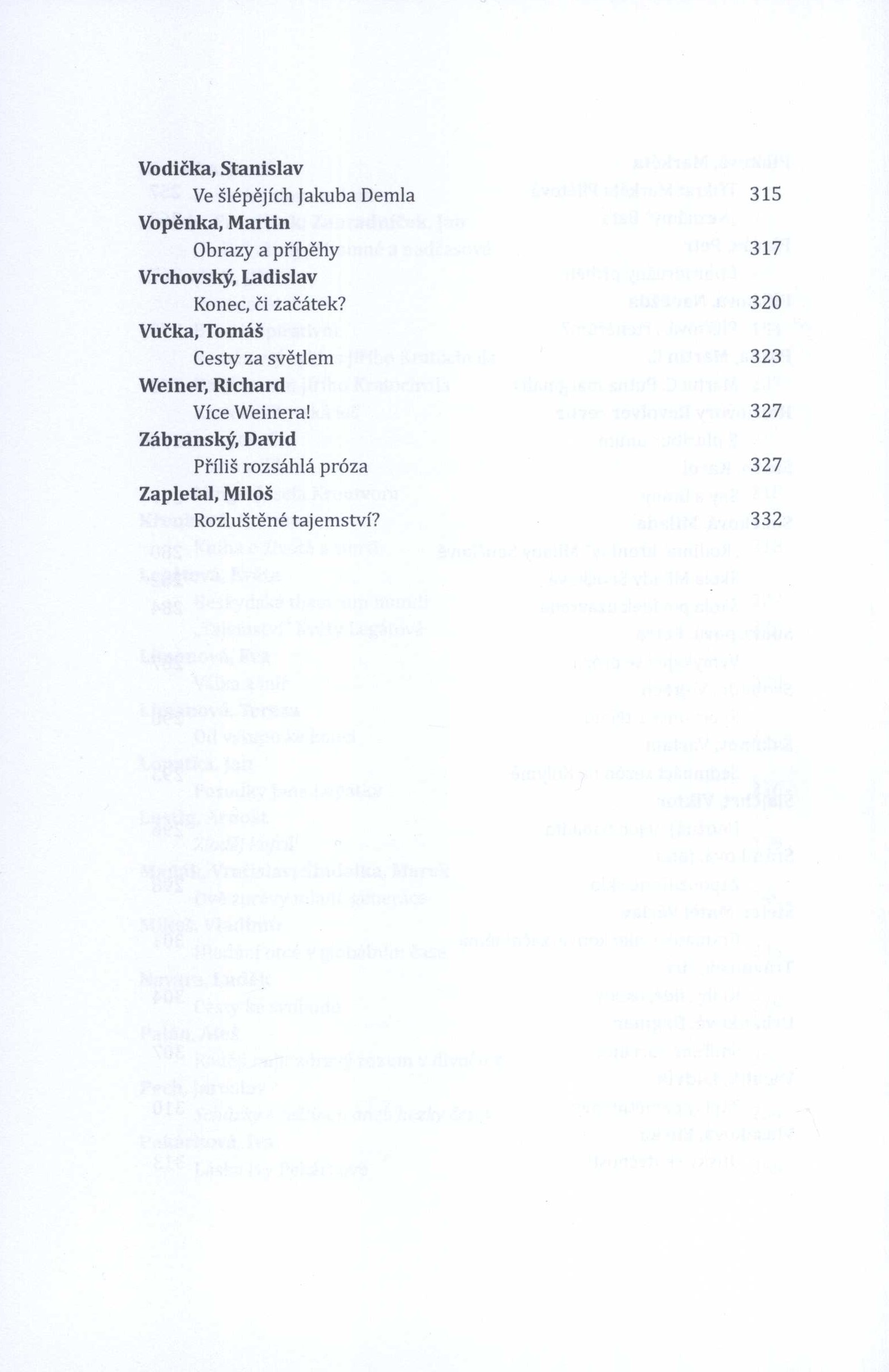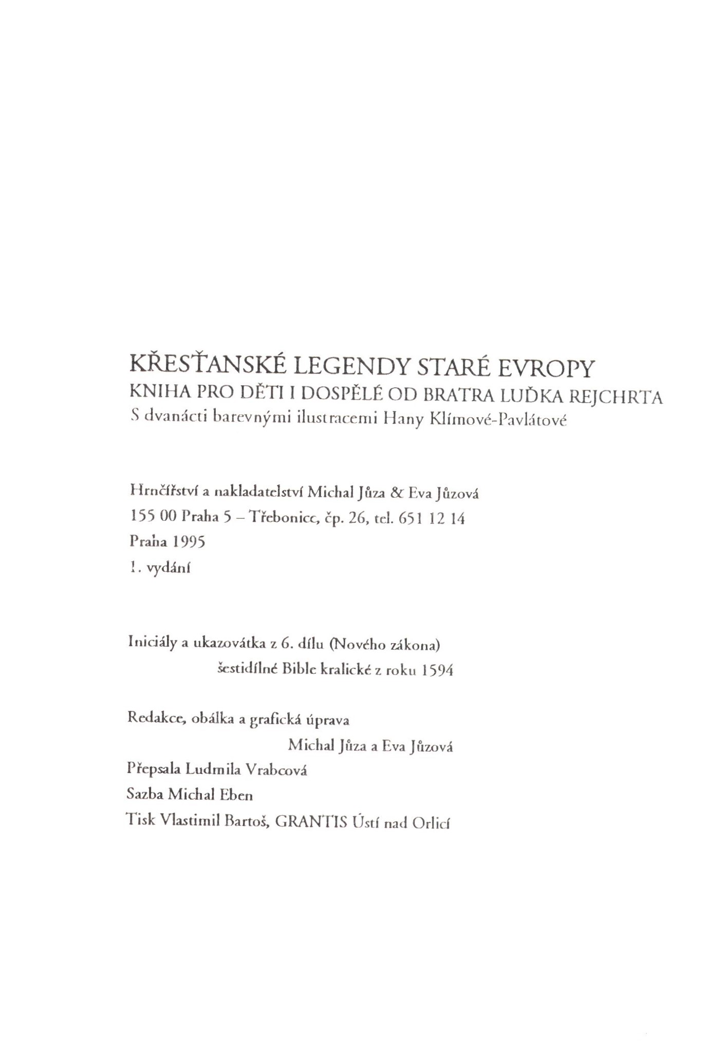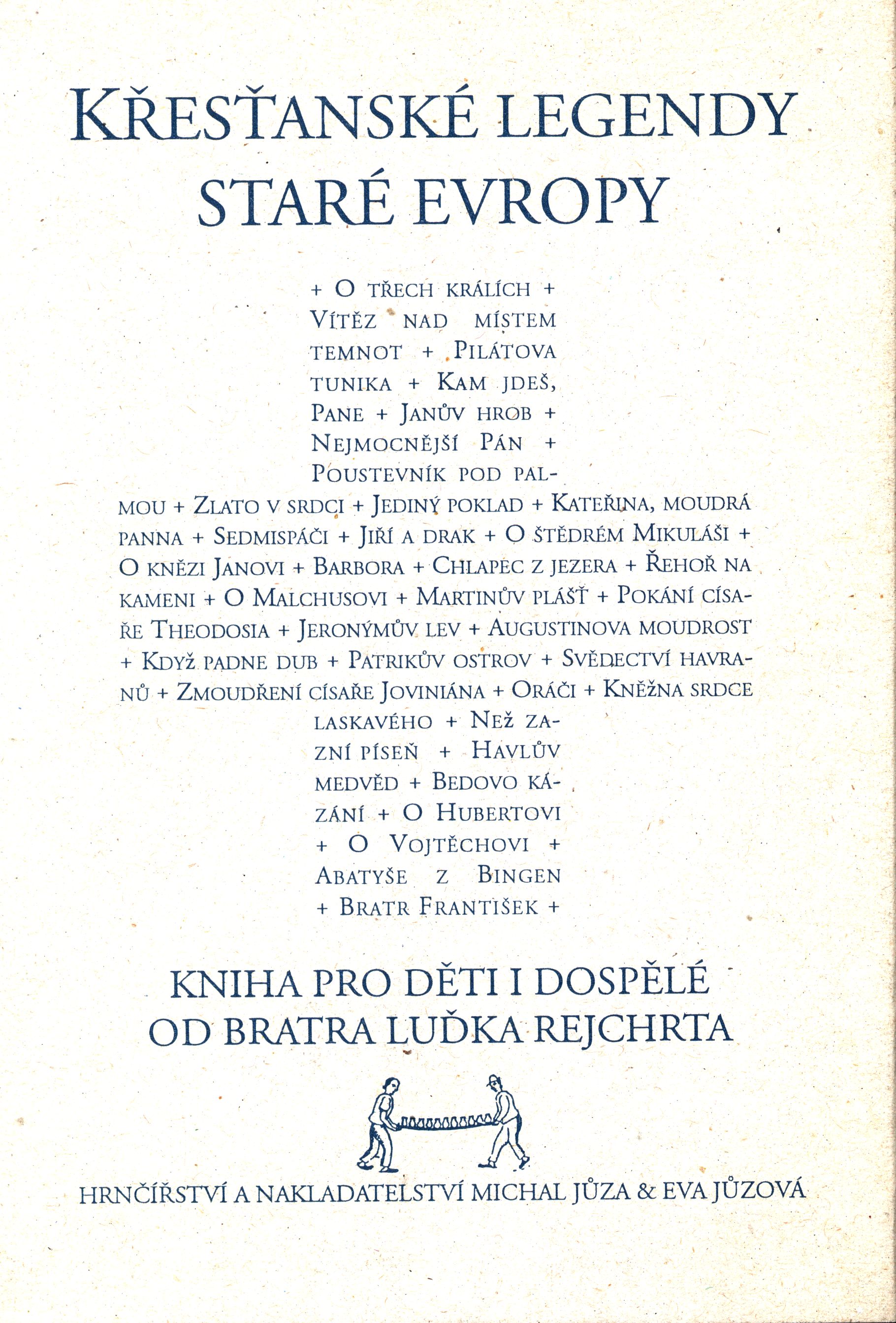 Názvové údaje Podobnost věčných témat : po stopách Gilgamešových / Věra Ludíková Osobní jméno Ludíková, Věra, 1943- (Autor) Další autoři Wagner, Zdeněk, 1957- (Knižní grafik) (Sazeč) Korp. Grantis, s.r.o. (tiskárna a vydavatelství) (Nakladatel, vydavatel) (Tiskař) Nakladatel Ústí nad Orlicí : Grantis, 2017 Rozsah 69 stran : ilustrace, 1 mapa ; 18 cm Osobní hesla Gilgameš, urucký král, činný 28. století př. Kr.-27. století př. Kr. Předmětová hesla babylonská mytologie * sumerská mytologie * akkadská literatura * sumerská literatura * Babylonian mythology * Sumerian mythology * Akkadian literature * Sumerian literature Klíčová slova česká literatura * Ludíková V. * próza * poezie * úvahy * Gilgameš * akkadská literatura * obrazové přílohy Počet ex. 1, z toho volných 1 Druh dok. monografie Signatura C12a 5923 Názvové údaje Křesťanské legendy staré Evropy : Kniha pro děti i dospělé od bratra Luďka Rejchrta / Luděk Rejchrt ; s dvanácti barevnými ilustracemi Hany Klímové-Pavlátové ; redakce, obálka a grafická úprava Michal Jůza a Eva Jůzová Osobní jméno Rejchrt, Luděk, 1939-2019 (Autor) Další autoři Bergmannová Klímová, Hana, 1963- (Ilustrátor) Jůza, Michal, 1951- (Redaktor, výkonný redaktor) (Autor obálky) (Knižní grafik) Jůzová, Eva (Redaktor, výkonný redaktor) (Autor obálky) (Knižní grafik) Korp. Hrnčířství a nakladatelství Michal Jůza & Eva Jůzová (Nakladatel, vydavatel) Grantis, s.r.o. (tiskárna a vydavatelství) (Tiskař) Nakladatel Praha : Hrnčířství a nakladatelství Michal Jůza & Eva Jůzová, 1995 Výrobce Ústí nad Orlicí : Vlastimil Bartoš, Grantis Rozsah 146 stran, 11 nečíslovaných listů obrazových příloh : barevné ilustrace ; 24 cm Osobní hesla Bergmannová Klímová, Hana, 1963- - ilustrátorka * Pavlátová, Hana, 1963- - výtvarnice, malířka, ilustrátorka Klíčová slova česká literatura * křesťanské legendy Počet ex. 2, z toho volných 2 Druh dok. monografie Signatura C12c 279, JVladislav 834 Názvové údaje Ante portas MMXXIII = Před branami 2023 / Věra Ludíková ; ilustrace František Hořejš ; grafická úprava a sazba Zdeněk Wagner - IceBearSoft Osobní jméno Ludíková, Věra, 1943- (Autor) Další autoři František, Hořejš (Ilustrátor) Wagner, Zdeněk, 1957- (Knižní grafik) (Sazeč) Korp. Grantis, s.r.o. (tiskárna a vydavatelství) (Nakladatel, vydavatel) Nakladatel Ústí nad Orlicí : Grantis, 2023 Rozsah 71 stran : ilustrace ; 18 cm Klíčová slova česká próza * úvahy Počet ex. 1, z toho volných 1 Druh dok. monografie Signatura LITa 0688 Názvové údaje Dobré umění není proti životu : recenze, kritiky, stati / Blanka Kostřicová Osobní jméno Kostřicová, Blanka, 1961- (Autor) (Autor úvodu atd.) Další autoři Grantis, s.r.o. (tiskárna a vydavatelství) (Nakladatel, vydavatel) (Tiskař) Nakladatel Ústí nad Orlicí : Grantis, s.r.o, 2021 Rozsah 334 stran ; 22 cm Klíčová slova česká literatura * sborník * literární kritika * čeští autoři * kritiky * stati * recenze * literárněvědné rozbory * interpretace literárního díla * přijetí literárního díla * stol. 20.-21. Počet ex. 1, z toho volných 1 Druh dok. monografie Signatura LITb 01277