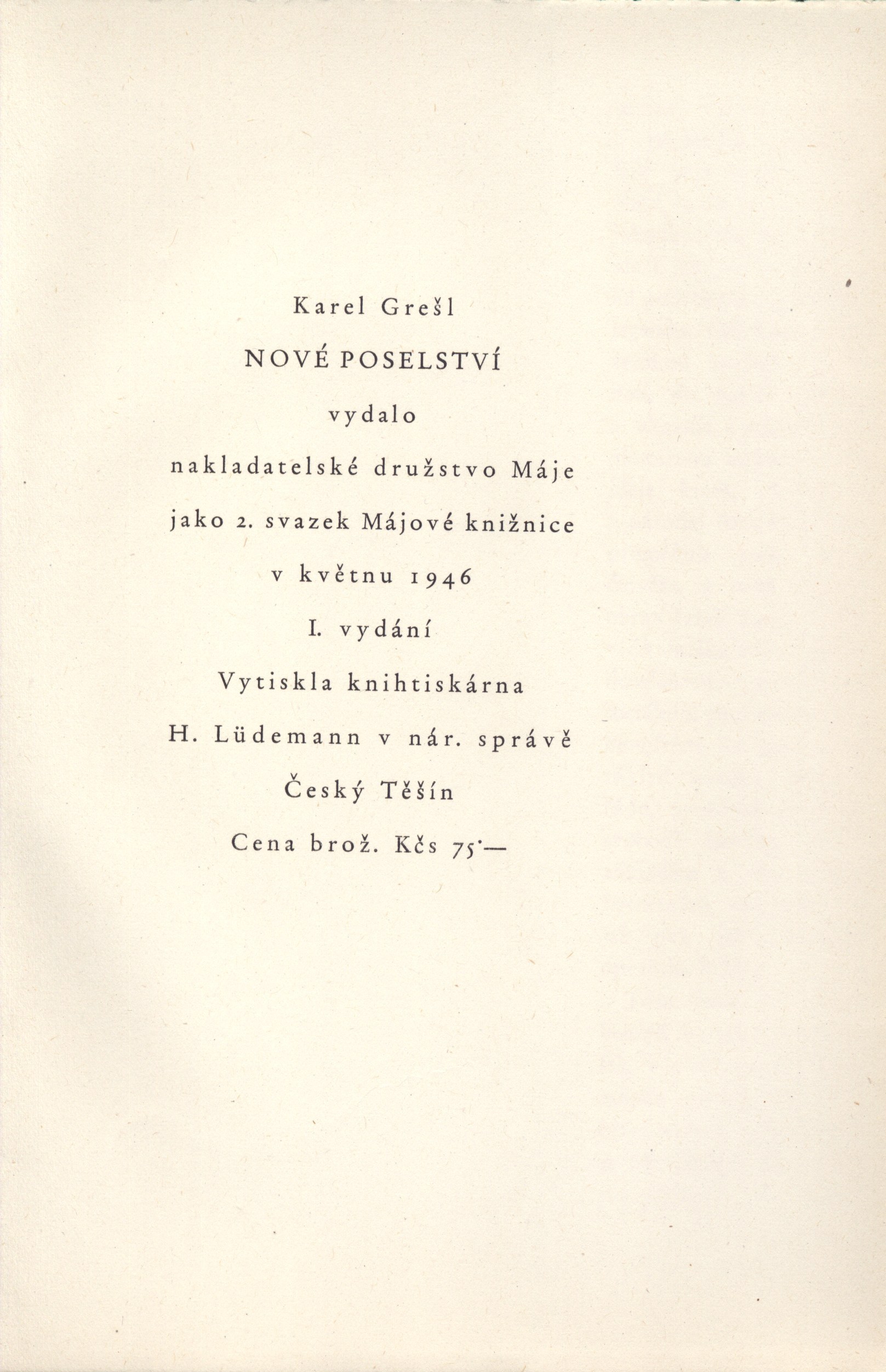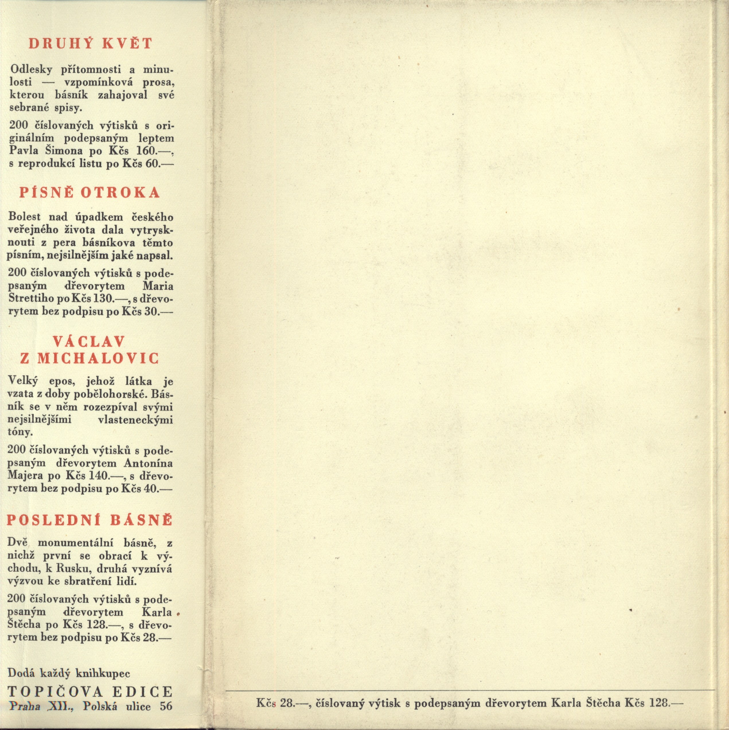 Názvové údaje Jitřní písně / Svatopluk Čech ; [v grafické úpravě Cyrila Boudy ; frontispis František Kobliha] Osobní jméno Čech, Svatopluk, 1846-1908 (Autor) Další autoři Bouda, Cyril, 1901-1984 (Grafický technik) Kobliha, František, 1877-1962 (Ilustrátor) Korp. Topičova edice (nakladatelství) (Nakladatel, vydavatel) H. Lüdemann (Český Těšín) (Tiskař) Nakladatel Praha : Topičova edice, 1946 Rozsah 69 s. : il. Klíčová slova česká literatura * poezie * výbor z díla * Čech S. * r. 1946 Počet ex. 1, z toho volných 1 Druh dok. monografie Signatura MUK 1847 Názvové údaje Nové písně / Svatopluk Čech ; [v grafické úpravě Cyrila Boudy ; frontispis Václav Fiala] Osobní jméno Čech, Svatopluk, 1846-1908 (Autor) Další autoři Bouda, Cyril, 1901-1984 (Grafický technik) Fiala, Václav, 1896-1980 (Ilustrátor) Korp. Topičova edice (nakladatelství) (Nakladatel, vydavatel) H. Lüdemann (Český Těšín) (Tiskař) Nakladatel Praha : Topičova edice, 1946 Rozsah 136 - [3] s. : il. Klíčová slova česká literatura * poezie * výbor z díla * Čech S. * r. 1946 Počet ex. 1, z toho volných 1 Druh dok. monografie Signatura MUK 1846 Názvové údaje Písně otroka / Svatopluk Čech ; [frontispis Mario Stretti ; v grafické úpravě Cyrila Boudy] Osobní jméno Čech, Svatopluk, 1846-1908 (Autor) Další autoři Stretti, Mario, 1910-1960 (Ilustrátor) Bouda, Cyril, 1901-1984 (Knižní grafik) Korp. Topičova edice (nakladatelství) (Nakladatel, vydavatel) H. Lüdemann (Český Těšín) (Tiskař) (Tiskař obrazu) Nakladatel Praha : Topičova edice, 1946 Výrobce Knihtiskárna H. Lüdemann, nár. správa) Rozsah 77 s. : il. ; 22 cm Klíčová slova česká literatura * poezie * Čech S. * politická lyrika Počet ex. 1, z toho volných 1 Druh dok. monografie Signatura Topič 0109 Názvové údaje Poslední básně / Svatopluk Čech ; [v graf. úpravě Cyrila Boudy ; frontispis Karel Štěch]. Do světa širého Osobní jméno Čech, Svatopluk, 1846-1908 (Autor) Další autoři Bouda, Cyril, 1901-1984 (Ilustrátor) (Knižní grafik) Štěch, Karel, 1908-1982 (Ilustrátor) Korp. Topičova edice (nakladatelství) (Nakladatel, vydavatel) H. Lüdemann (Český Těšín) (Tiskař) Nakladatel Praha : Topičova edice, spol. s r. o., 1946 Výrobce Knihtiskárna H. Lüdemann, národní správa) Rozsah 61 s., [1] l. obr. příl. ; 22 cm Klíčová slova česká literatura * poezie * básně * Čech S. * ilustrace * číslovaný výtisk Počet ex. 1, z toho volných 1 Druh dok. monografie Signatura Topič 0200 Názvové údaje Svatopluk Čech rodičům / uspořádal Ferdinand Strejček ; dřevoryt a grafická úprava Cyrila Boudy Osobní jméno Čech, Svatopluk, 1846-1908 (Autor) Další autoři Strejček, Ferdinand, 1878-1963 (Editor) (Autor úvodu atd.) Bouda, Cyril, 1901-1984 (Ilustrátor) (Grafický technik) Korp. Topičova edice (nakladatelství) (Nakladatel, vydavatel) H. Lüdemann (Český Těšín) (Tiskař) Nakladatel V Praze : Topičova edice, 1946 Výrobce V Českém Těšíne : Knihtiskárna H. Lüdemann Rozsah 85 stran, 10 nečíslovaných stran obrazových příloh : ilustrace ; 22 cm Osobní hesla Čech, Svatopluk, 1846-1908 - prozaik, básník, redaktor Klíčová slova česká literatura * vzpomínková literatura * korespondence * rodiče * Čech S. * r. 1946 Počet ex. 2, z toho volných 2 Druh dok. monografie Signatura MUK 1810, JVladislav 735 Názvové údaje Václav z Michalovic / Svatopluk Čech ; s úvodem od Ferdinanda Strejčka Osobní jméno Čech, Svatopluk, 1846-1908 (Autor) Další autoři Strejček, Ferdinand, 1878-1963 (Autor úvodu atd.) Korp. Topičova edice (nakladatelství) (Nakladatel, vydavatel) H. Lüdemann (Český Těšín) (Tiskař) Nakladatel Praha : Topičova edice, 1946 Výrobce Knihtiskárna H. Lüdemann) Rozsah 130 s. Klíčová slova česká poezie * epická poezie * epos * pobělohorská doba * r. 1946 Počet ex. 1, z toho volných 1 Druh dok. monografie Signatura C12b 10688 Názvové údaje Václav z Michalovic / Svatopluk Čech ; [v grafické úpravě Cyrila Boudy ; frontispis Antonín Majer] Osobní jméno Čech, Svatopluk, 1846-1908 (Autor) Další autoři Bouda, Cyril, 1901-1984 (Knižní grafik) Majer, Antonín, 1882-1963 (Ilustrátor) Korp. Topičova edice (nakladatelství) (Nakladatel, vydavatel) H. Lüdemann (Český Těšín) (Tiskař) (Tiskař obrazu) Nakladatel Praha : Topičova edice, spol. s r. o., 1946 Výrobce Knihtiskárna H. Lüdemann, národní správa) Rozsah 130 s., [1] l. il. ; 22 cm Klíčová slova česká literatura * poezie * básně * epos * pobělohorská doba Počet ex. 2, z toho volných 2 Druh dok. monografie Signatura MUK 1804, Topič 0130 Názvové údaje Die große Heimkehr / Karl Götz ; [Einband von Walter Tiemann] Osobní jméno Götz, Karl, 1903-1989 (Autor) Další autoři Spemann, Adolf, 1886-1964 (Nakladatel, vydavatel) Tiemann, Walter, 1876-1951 (Výtvarník vazby) Korp. Engelhorn Verlag (Nakladatel, vydavatel) H. Lüdemann (Český Těšín) (Tiskař) Nakladatel Stuttgart : Engelhornverlag Adolf Speman, [1941] Výrobce Druck- und Verlaghaus Hubert Lüdemann) Rozsah 246, [2] s. ; 8° ; 19,5 x 12,5 cm Klíčová slova německá literatura * německý román * stol. 20., léta 40. * německá próza Počet ex. 1, z toho volných 1 Druh dok. monografie Signatura KaG XLVIII B 9 Názvové údaje Nové poselství : román / Karel Grešl Osobní jméno Grešl, Karel (Autor) Další autoři Nakladatelské družstvo Máje (Nakladatel, vydavatel) H. Lüdemann (Český Těšín) (Tiskař) Nakladatel V Praze : Nakladatelské družstvo Máje, 1946 Výrobce Český Těšín : knihtiskárna H. Lüdemann v nár. správě Rozsah 268 stran ; 22 cm Klíčová slova česká literatura * próza * román * Ježíš Nazaretský Počet ex. 4, z toho volných 4 Druh dok. monografie Signatura Máj 098, M 39 d 8, P 56 C 31, P 138 C 20 Názvové údaje Jitřní směna / Jiří Körber ; [s obálkou 