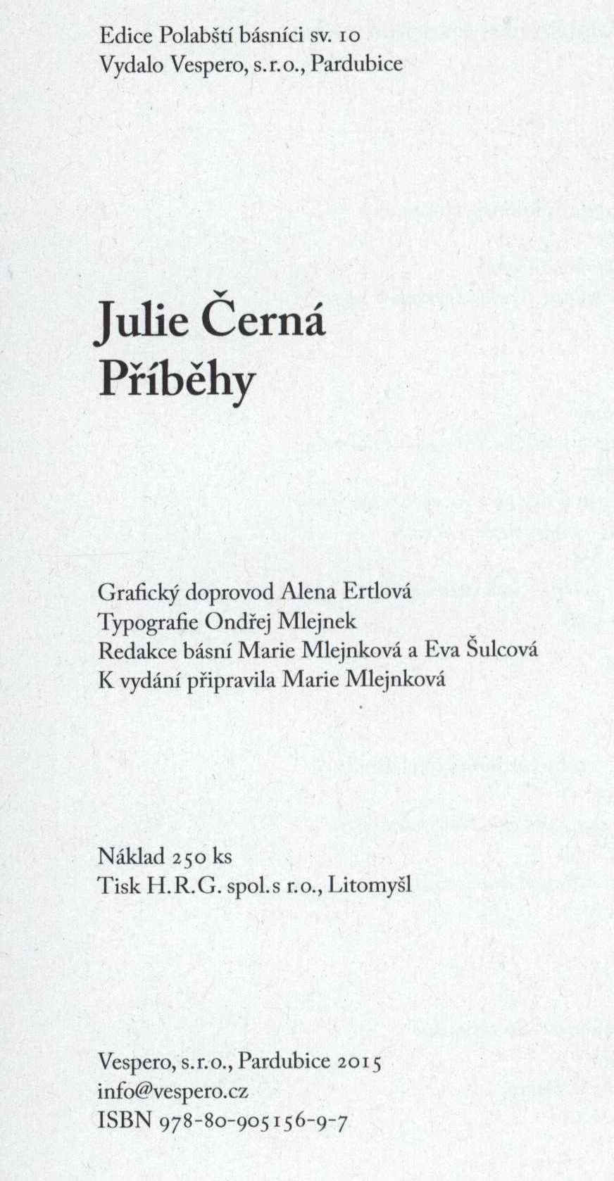 Názvové údaje Slovník spisovatelů Svitavska : (osobnosti literatury Jevíčska, Litomyšlska, Moravskotřebovska, Poličska a Svitavska) / Milan Báča Osobní jméno Báča, Milan, 1959- (Autor) Další autoři OFTIS (firma) (Nakladatel, vydavatel) HRG Litomyšl (tiskárna) (Tiskař) Nakladatel Ústí nad Orlicí : Oftis, 2018 Výrobce Litomyšl : H. R. G. spol. s r.o. Rozsah 221 stran : ilustrace, portréty, 1 barevná mapa, faksimile ; 21 cm Geografické heslo Svitavy (Česko : oblast) Klíčová slova Svitavsko * osobnosti regionu * regionální osobnosti * spisovatelé * literární život * kulturní osobnosti * biografie * Česko * biografický slovník Počet ex. 1, z toho volných 1 Druh dok. monografie Signatura C12b 18637 Názvové údaje Příběhy / Julie Černá ; grafický doprovod Alena Ertlová ; typografie Ondřej Mlejnek Osobní jméno Černá, Julie, 1972- (Autor) Další autoři Mlejnek, Ondřej, 1978- (Typograf) Ertlová, Alena, 1965- (Ilustrátor) Korp. Vespero (nakladatelství a grafické studio) (Nakladatel, vydavatel) HRG Litomyšl (tiskárna) (Tiskař) Nakladatel Pardubice : Vespero, s.r.o., 2015 Výrobce Litomyšl : Tisk H.R.G. spol.s r.o. Rozsah 89 stran : ilustrace ; 18 cm Klíčová slova česká poezie * básně * lyrické básně Počet ex. 1, z toho volných 1 Druh dok. monografie Signatura C12b 16613 Názvové údaje Zločin / Marcella Dostálová Osobní jméno Dostálová, Marcella, 1934-2019 (Autor) (Autor komentáře) Další autoři Šimon Ryšavý (nakladatelství) (Nakladatel, vydavatel) HRG Litomyšl (tiskárna) (Tiskař) Nakladatel Brno : Šimon Ryšavý, 2019 Výrobce [Litomyšl] : H.R.G. spol. s r. o. Rozsah 112 stran ; 21 cm Klíčová slova česká literatura * próza * Dostálová M. * román * kriminální román Počet ex. 1, z toho volných 1 Druh dok. monografie Signatura LITb 00151