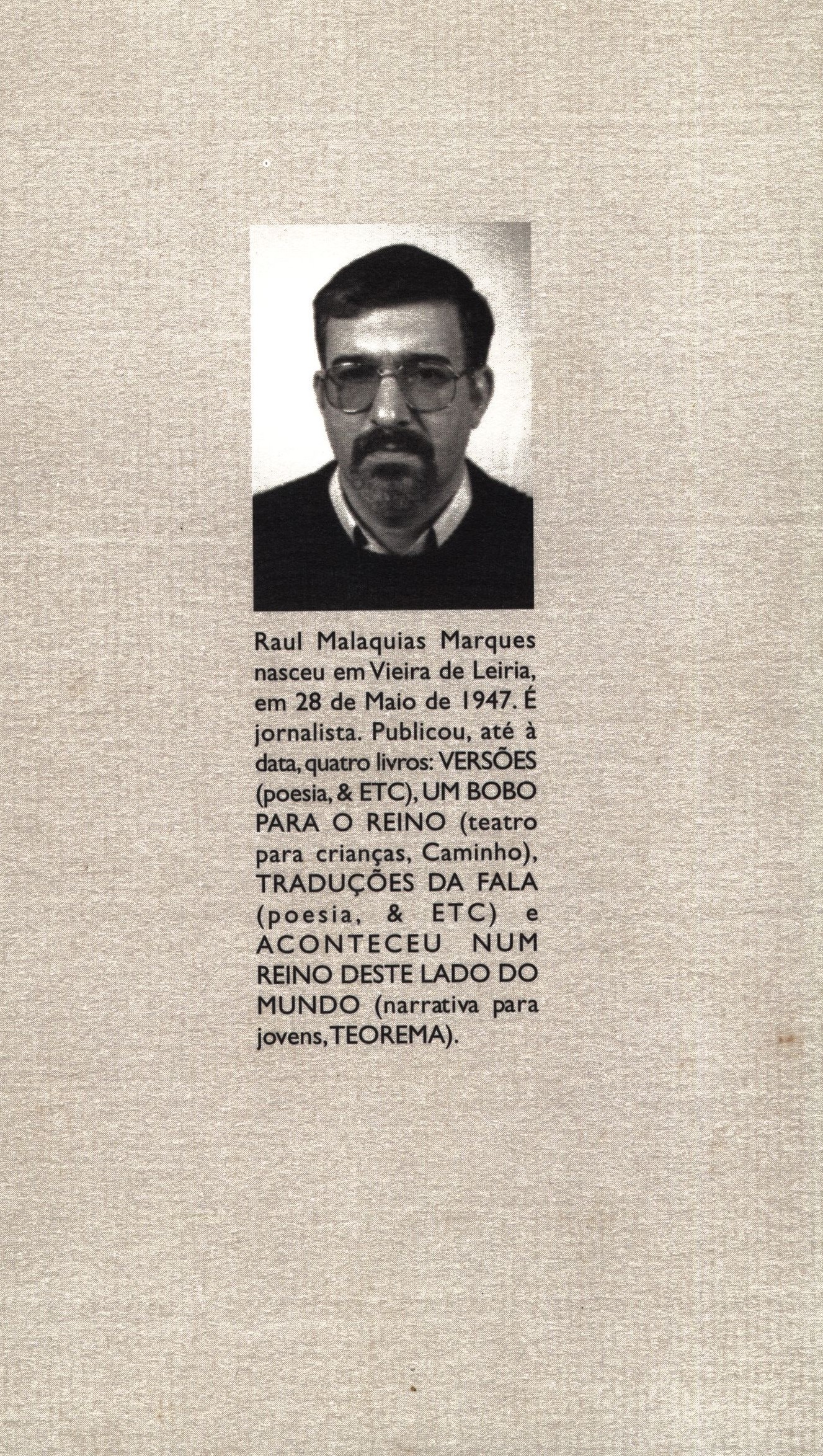 Názvové údaje "O Ensaio do Fim" : (jeu de massacre em cinco quadros) / Raul Malaquias Marques Osobní jméno Marques, Raúl Malaquias, 1947- (Autor) Další autoři Inatel (Nakladatel, vydavatel) Tipografia Grafigamelas (Tiskař) Nakladatel [Lisboa] : Inatel, [1998] Výrobce Tipografia Grafigamelas Rozsah 74 stran (správně 76 stran) : čb. ilustrace ; 21 cm Klíčová slova portugalská literatura * portugalsky psaná literatura * portugalsky píšící spisovatelé * drama * scénář Počet ex. 1, z toho volných 1 Druh dok. monografie Signatura Listopad 0611 Názvové údaje O mosquito zzz / Orlando Neves Osobní jméno Neves, Orlando (Autor) Další autoři Inatel (Nakladatel, vydavatel) QualiGrafe (Tiskař) Nakladatel [místo vydání není známé] : Inatel, 1992 Výrobce QualiGrafe Rozsah 37 stran ; 22 cm Klíčová slova portugalská literatura * portugalsky psaná literatura * drama * divadelní hra * scénář Počet ex. 1, z toho volných 1 Druh dok. monografie Signatura Listopad 0534 Názvové údaje Paixão e morte de Mateus Álvares / José Jorge Letria Osobní jméno Letria, José Jorge, 1951- (Autor) Další autoři Inatel (Nakladatel, vydavatel) QualiGrafe, Lda (Tiskař) Nakladatel [Lisboa] : Inatel, 1992 Výrobce QualiGrafe, Lda Rozsah 34 stran ; 22 cm Klíčová slova portugalská literatura * portugalsky psaná literatura * portugalsky píšící spisovatelé * divadelní hra * scénář Počet ex. 1, z toho volných 1 Druh dok. monografie Signatura Listopad 0499