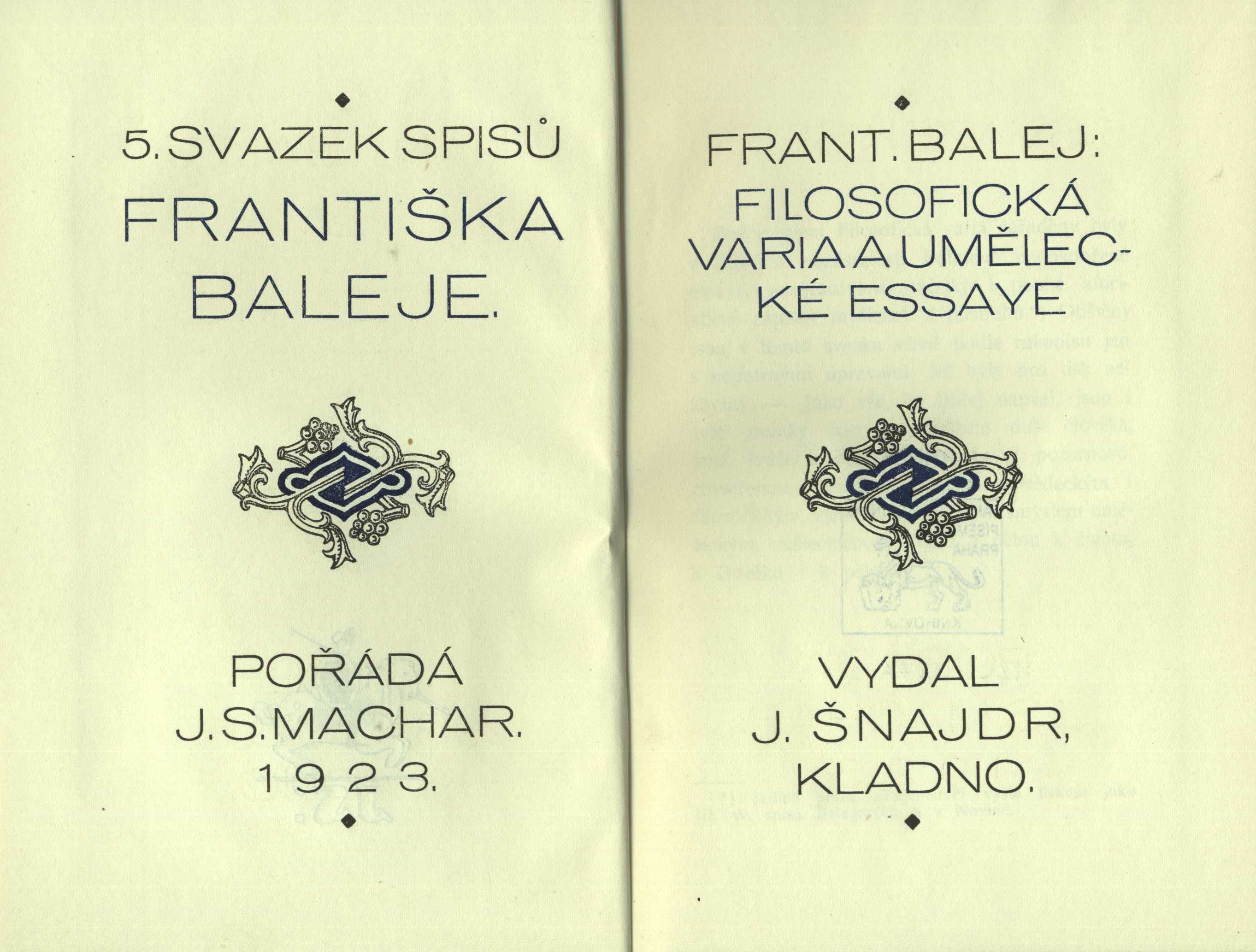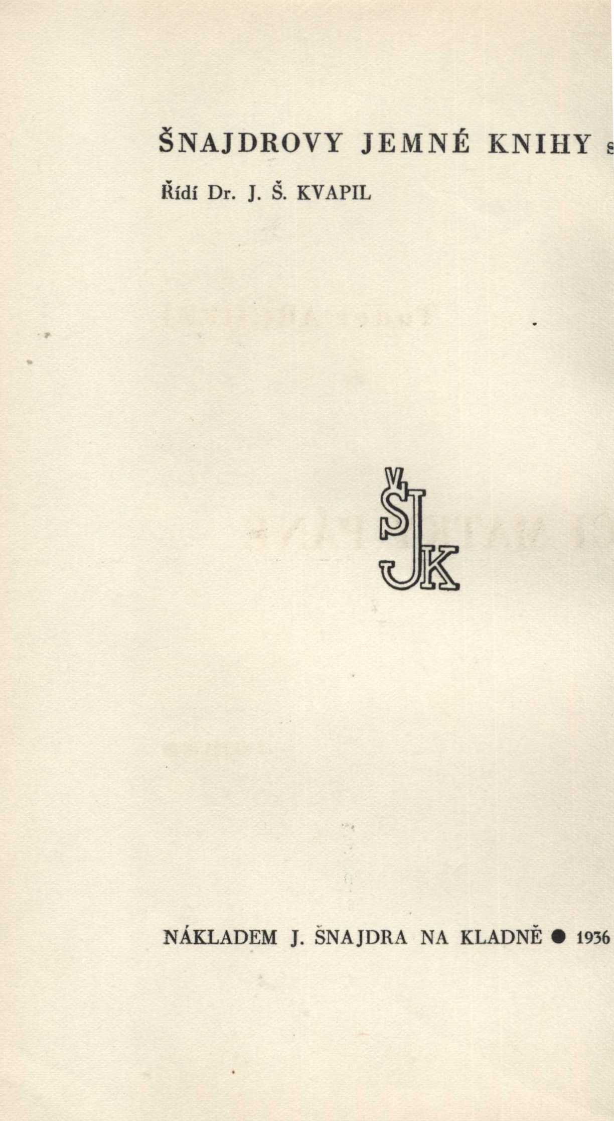 Názvové údaje Oči matky Páně : román / Tudor Arghezi ; [z rumunštiny přeložil J.S. Kvapil ; v úpravě Stan. Kulhánka] Osobní jméno Arghezi, Tudor, 1880-1967 (Autor) Další autoři Kvapil, Josef Šofferle, 1904-1975 (Překladatel) Kulhánek, Stanislav, 1885-1970 (Knižní grafik) Korp. J. Šnajdr (firma) (Nakladatel, vydavatel) Nakladatel Na Kladně : Nákladem J. Šnajdra, 1936 Výrobce (Vytiskl J. Šnajdr) Rozsah 306 s. ; 20 cm Klíčová slova rumunská literatura * romány Počet ex. 1, z toho volných 1 Druh dok. monografie Signatura VMartínek 0910 Názvové údaje Filosofická varia a umělecké essaye Osobní jméno Balej, František, 1873-1918 (Autor) Další autoři Machar, Josef Svatopluk, 1864-1942 (Autor úvodu atd.) Korp. J. Šnajdr (firma) (Nakladatel, vydavatel) Nakladatel Kladno : J. Šnajdr, 1923 Rozsah 109 s. Klíčová slova česká literatura * česká próza * filozofie * filozofická esej * filozofická próza * esej * eseje * esejistické texty Počet ex. 2, z toho volných 2 Druh dok. monografie Signatura KaG VII C2 60, VMartínek 0543 Názvové údaje Kniha feuilletonů / [umělecká výprava knihy od Jaroslava Maříka] Osobní jméno Balej, František, 1873-1918 (Autor) Další autoři Mařík, Jaroslav, 1888-1965 (Knižní grafik) Korp. J. Šnajdr (firma) (Nakladatel, vydavatel) Nakladatel V Kladně : J. Šnajdr, [1920] Rozsah 220 s. Klíčová slova česká literatura * česká próza * filozofie * filozofická esej * fejeton * kniha fejetonů * filozofická próza * esej * eseje * esejistické texty Počet ex. 1, z toho volných 1 Druh dok. monografie Signatura KaG XLI D 66 Názvové údaje O nového člověka / [pořádá J.S. Machar ; umělecká výprava knihy od Jaroslava Maříka] Osobní jméno Balej, František, 1873-1918 (Autor) Další autoři Machar, Josef Svatopluk, 1864-1942 (Editor) Mařík, Jaroslav, 1888-1965 (Knižní grafik) Korp. J. Šnajdr (firma) Nakladatel V Kladně : Nákladem J. Šnajdra, [1920] Výrobce (Tiskem J. Šnajdra) Rozsah 208 s. ; 19 cm Klíčová slova české eseje * filozofické eseje * etika * filozofie člověka * poslání člověka * společnost * r. 1915-1916 Počet ex. 1, z toho volných 1 Druh dok. monografie Signatura VMartínek 1513 Názvové údaje Zlaté péro / [umělecká výprava knihy od Jaroslava Maříka] Osobní jméno Balej, František, 1873-1918 (Autor) Další autoři Mařík, Jaroslav, 1888-1965 (Knižní grafik) Machar, Josef Svatopluk, 1864-1942 (Autor úvodu atd.) Korp. J. Šnajdr (firma) (Nakladatel, vydavatel) Nakladatel V Kladně : Nákladem J. Šnajdra, [1921] Rozsah 76 s. Klíčová slova česká literatura * česká próza * filozofie * filozofická esej * filozofická próza * esej * eseje * esejistické texty Počet ex. 2, z toho volných 2 Druh dok. monografie Signatura KaG XLI F 119, VMartínek 0161 Názvové údaje Z kroniky potulného žáka / Klemens Brentano ; přeložil Jaroslav Šťastný Osobní jméno Brentano, Clemens, 1778-1842 (Autor) Další autoři Šťastný, Jaroslav, 1868-1952 (Překladatel) (Nakladatel, vydavatel) (Dedikátor) (Autor podpisu) Zinková, Viola, 1925-2017 (Dedikant) Korp. J. Šnajdr (firma) (Tiskař) Nakladatel [Kročehlavy] : nákladem vlastním, [J. Šťastný], 1936 Výrobce V Kladně : tiskem J. Šnajdra Rozsah 54 stran ; 21 cm Osobní hesla Brentano, Clemens, 1778-1842 - německý spisovatel, básník a dramatik Klíčová slova německy psaná literatura * próza * Brentano K. * satira * český překlad * Šťastný J. Počet ex. 1, z toho volných 1 Druh dok. monografie Signatura VZinková 0598 Názvové údaje Sonety portugalské / Elizabeth Barrett-Browningová ; přeložil F. Balej ; [výzdoba Stan. Kulhánka] Osobní jméno Browning, Elizabeth Barrett, 1806-1861 (Autor) Další autoři Balej, František, 1873-1918 (Překladatel) Kulhánek, Stanislav, 1885-1970 (Ilustrátor) Korp. J. Šnajdr (firma) (Nakladatel, vydavatel) Nakladatel V Kladně : Nákladem J. Šnajdra, [1919] Rozsah xliv s., [1] l. obr. příl. : il. ; 18 cm Klíčová slova britská literatura * britská poezie Počet ex. 2, z toho volných 2 Druh dok. monografie Signatura Holan 1322, VHB 0006 Názvové údaje Sonety portugalské / Elizabeth Barrett-Browningová ; přeložil F. Balej Osobní jméno Browning, Elizabeth Barrett, 1806-1861 (Autor) Další autoři Balej, František, 1873-1918 (Překladatel) Kulhánek, Stanislav, 1885-1970 (Ilustrátor) (Výtvarník vazby) Weger, August, 1823-1892 (Ilustrátor) Korp. J. Šnajdr (firma) (Nakladatel, vydavatel) Nakladatel V Kladně : nákladem J. Šnajdra, [1919] Výrobce (tiskem nakladatele) Rozsah [8], xliv s., [1] barev. obr. příl. ; 20 cm Klíčová slova anglická literatura * poezie * anglická poezie * překlad * milostná poezie * sonety Počet ex. 1, z toho volných 1 Druh dok. monografie Signatura Topič 0074 Názvové údaje Pippa jde mimo / Robert Browning ; přeložil Fr. Balej Osobní jméno Browning, Robert, 1812-1889 (Autor) Další autoři Balej, František, 1873-1918 (Překladatel) Korp. J. Šnajdr (firma) (Nakladatel, vydavatel) Nakladatel V Kladně : Nákladem J. Šnajdra, [1919] Rozsah 84 s. Klíčová slova britská literatura * divadelní hra * divadelní hry Počet ex. 1, z toho volných 1 Druh dok. monografie Signatura KaG XLV D2 170 Názvové údaje Rukověť české archaeologie / K. Buchtela a L. Niederle ; s přídavkem J. Matiegky Osobní jméno Buchtela, Karel, 1864-1946 (Autor) Další autoři Niederle, Lubor, 1865-1944 (Autor) Matiegka, Jindřich, 1862-1941 (Autor) Korp. Jan Laichter (nakladatelství) (Nakladatel, vydavatel) J. Šnajdr (firma) (Tiskař) Nakladatel V Praze : Jan Laichter, 1910 Výrobce V Kladně : Knihtiskárna J. Šnajdra Rozsah xii, 110 stran, xxv listů obrazových příloh ; 19 cm Klíčová slova česká literatura * archeologické metody * archeologické nálezy * archeologické objevy * archeologické výzkumy * archeologie * antropologické výzkumy * antropologie P