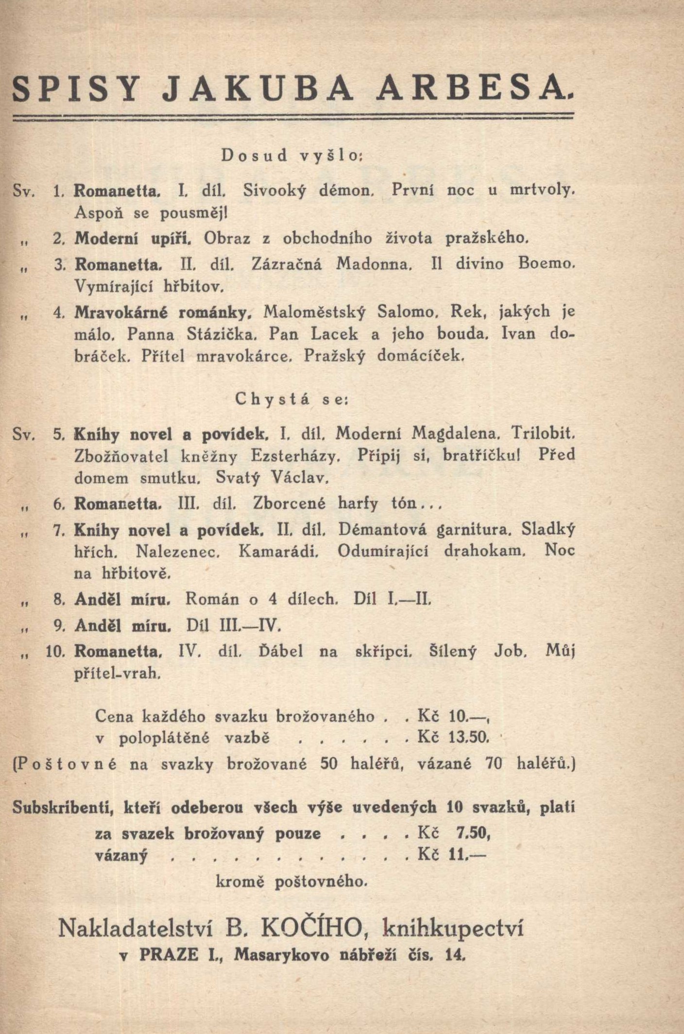 Názvové údaje Mládeži / M. Aleš Osobní jméno Aleš, Mikoláš, 1852-1913 (Autor) (Ilustrátor) Další autoři Švabinský, Max, 1873-1962 (Ilustrátor) Korp. B. Kočí (nakladatelství a knihkupectví) (Nakladatel, vydavatel) Knihtiskárna Jos. B. Zápotočný (v Rokycanech) (Tiskař) Nakladatel V Praze : Nakladatel B. Kočí, knihkupec, 1920 Výrobce V Rokycanech Knihtiskárna Jos.B. Zápotočný, 1920 Rozsah 48 stran : ilustrace Klíčová slova česká literatura * literatura pro děti * literatura pro děti a mládež * lidová slovesnost * obrazová publikace * obrazové publikace Počet ex. 1, z toho volných 1 Druh dok. monografie Signatura KaG IV D 12 Názvové údaje Agitator : roman ženského srdce Osobní jméno Arbes, Jakub, 1840-1914 (Autor) Další autoři Karásek ze Lvovic, Jiří, 1871-1951 (Autor podpisu) Korp. B. Kočí (nakladatelství a knihkupectví) (Nakladatel, vydavatel) Knihtiskárna Jos. B. Zápotočný (v Rokycanech) (Tiskař) Nakladatel V Praze : B. Kočí, 1926 Výrobce V Rokycanech : Knihtiskána Jos.B. Zápotočného Rozsah 174 stran Klíčová slova Praha * česká literatura * česká próza * český román Počet ex. 4, z toho volných 4 Druh dok. monografie Signatura KaG XXIII C2 101, P 87 d 25, P 120 d 17, F I 2429 Názvové údaje Knihy novel a povídek. Díl III / [Jakub Arbes] Osobní jméno Arbes, Jakub, 1840-1914 (Autor) Další autoři B. Kočí (nakladatelství a knihkupectví) (Nakladatel, vydavatel) Jos. B. Zápotočný (tiskárna) (Tiskař) Nakladatel V Praze : B. Kočí, 1926 Výrobce Rokycany : Jos. B. Zápotočný Rozsah 253 stran Klíčová slova česká próza * české povídky * novely Počet ex. 1, z toho volných 1 Druh dok. monografie Signatura F I 2433 Názvové údaje Knihy novel a povídek. Díl IV / Jakub Arbes Osobní jméno Arbes, Jakub, 1840-1914 (Autor) Další autoři B. Kočí (nakladatelství a knihkupectví) (Nakladatel, vydavatel) Jos. B. Zápotočný (tiskárna) (Tiskař) Nakladatel V Praze : B. Kočí, 1926 Výrobce Rokycany : Jos. B. Zápotočný Rozsah 239 stran Klíčová slova česká próza * české povídky * novely Počet ex. 1, z toho volných 1 Druh dok. monografie Signatura F I 2434 Názvové údaje Mravokárné románky / Jakub Arbes Osobní jméno Arbes, Jakub, 1840-1914 (Autor) Další autoři B. Kočí (nakladatelství a knihkupectví) (Nakladatel, vydavatel) Jos. B. Zápotočný (tiskárna) Nakladatel V Praze : B. Kočí, 1924 Výrobce V Rokycanech : Knihtiskárna Jos. B. Zápotočný Rozsah 253 stran ; 20 cm Klíčová slova česká literatura * spisy * próza * satirické povídky Počet ex. 2, z toho volných 2 Druh dok. monografie Signatura P 120 d 16, C12b 19501 Názvové údaje Romanetta. Díl V / Kandidáti existence / Jakub Arbes Osobní jméno Arbes, Jakub, 1840-1914 (Autor) Další autoři B. Kočí (nakladatelství a knihkupectví) (Nakladatel, vydavatel) Jos. B. Zápotočný (tiskárna) (Tiskař) Nakladatel V Praze : B. Kočí, 1926 Výrobce Rokycany : Jos. B. Zápotočný Rozsah 224 stran Klíčová slova česká próza * české povídky * tajuplné příběhy * romaneta Počet ex. 2, z toho volných 2 Druh dok. monografie Signatura P 120 d 14, F I 2442 Názvové údaje Satyry a rozmarné hříčky. I / Jakub Arbes Osobní jméno Arbes, Jakub, 1840-1914 (Autor) Další autoři B. Kočí (nakladatelství a knihkupectví) (Nakladatel, vydavatel) Jos. B. Zápotočný (tiskárna) (Tiskař) Nakladatel V Praze : B. Kočí, 1927 Výrobce Rokycany : Jos. B. Zápotočný Rozsah 239 stran Klíčová slova česká próza * satirická próza * publicistika * fejetony Počet ex. 2, z toho volných 2 Druh dok. monografie Signatura F I 2438, P 87d 31 Názvové údaje Silhouety divadelní. díl 1. Osobní jméno Arbes, Jakub, 1840-1914 (Autor) Další autoři B. Kočí (nakladatelství a knihkupectví) (Nakladatel, vydavatel) Knihtiskárna Jos. B. Zápotočný (v Rokycanech) (Tiskař) Nakladatel V Praze : B. Kočí, 1926 Výrobce Knihtiskána Jos.B. Zápotočného) Rozsah 206 s. Klíčová slova česká literatura * česká próza * divadlo * divadelní herci * divadelní herečky Počet ex. 1, z toho volných 1 Druh dok. monografie Signatura KaG LII D 122 Názvové údaje Silhouety divadelní. Díl I / Jakub Arbes Osobní jméno Arbes, Jakub, 1840-1914 (Autor) Další autoři B. Kočí (nakladatelství a knihkupectví) (Nakladatel, vydavatel) Knihtiskárna Jos. B. Zápotočný (v Rokycanech) (Tiskař) Nakladatel V Praze : B. Kočí, 1926 Výrobce V Rokycanech : Knihtiskána Jos.B. Zápotočného Rozsah 206 stran Klíčová slova česká próza * divadelní prostředí * divadelní herci * divadelní herečky Počet ex. 3, z toho volných 3 Druh dok. monografie Signatura P 87 d 29, F I 2435, F I 2452 Názvové údaje Československé menšiny za hranicemi / Jan Auerhan Osobní jméno Auerhan, Jan, JUDr. 1880-1942 (Autor) Další autoři Hajn, Antonín, 1868-1949 (Nakladatel, vydavatel) Korp. Knihtiskárna Jos. B. Zápotočný (v Rokycanech) (Tiskař) Nakladatel V Praze : Ant. Hajn, 1918 Výrobce V Rokycanech : Knihtiskárna Jos. B. Zápotočného Rozsah 31 stran Klíčová slova česká literatura * stol. 20., léta 10. * politické články * politické otázky * politické názory * úvahy Počet ex. 2, z toho volných 2 Druh dok. monografie Signatura KaG XXIII D2 41, H B X 68