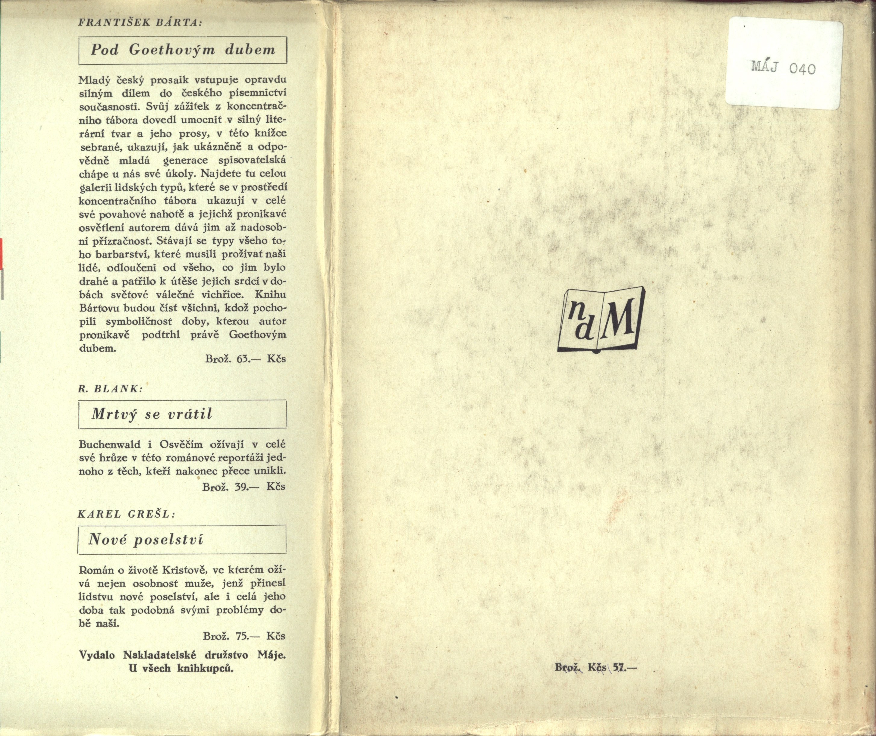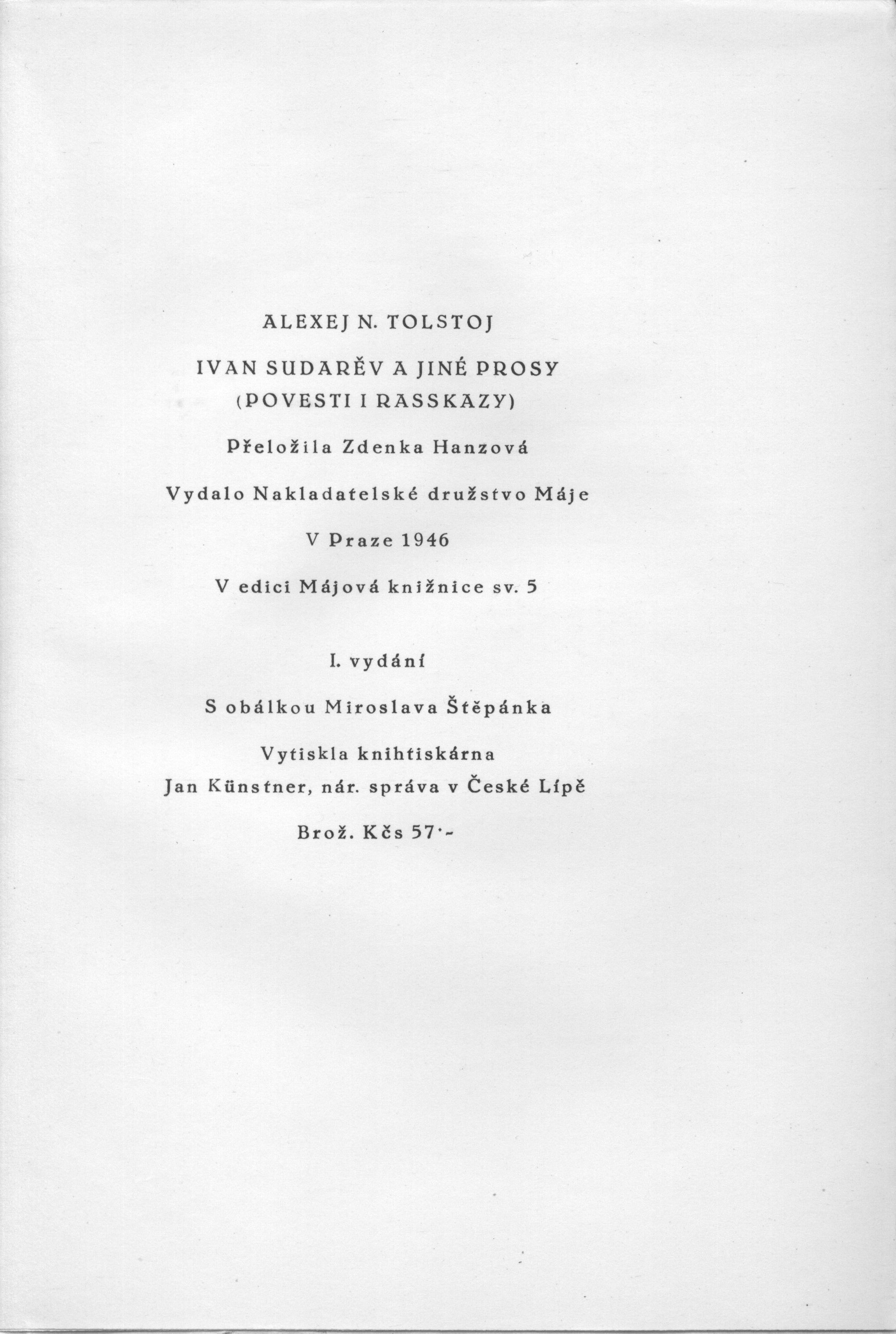 Názvové údaje Zelená ratolest / Čestmír Jeřábek ; s obálkou Jaroslava Mařana Osobní jméno Jeřábek, Čestmír, 1893-1981 (Autor) Další autoři Mařan, Jaroslav, 1923-1997 (Autor obálky) Korp. Nakladatelské družstvo Máje (Nakladatel, vydavatel) Künstner, Jan (Česká Lípa) (Tiskař) Nakladatel V Praze : Nakladatelské družstvo Máje pro Literární klub Máj, 1946 Výrobce Č. Lípa : knihtiskárna J. Künstner n. s. Rozsah 229 stran ; 21 cm Klíčová slova česká literatura * próza * autobiografické prvky * dětství Počet ex. 1, z toho volných 1 Druh dok. monografie Signatura Máj 090 Názvové údaje Papierkunde : kurze Darstellung der Geschichte und Fabrikation von Papier, sowie der Erzeugnisse der Papierindustrie / verfaßt von Adolf Linhardt Osobní jméno Linhardt, Adolf, nar. 1881 (Autor) Další autoři Künstner, Jan (Česká Lípa) (Nakladatel, vydavatel) Nakladatel B. Leipa : Johann Künstner, [1932] Rozsah 75 stran, 16 nečíslovaných listů příloh : ilustrace Klíčová slova papír * papírenský průmysl * papírny * historie * využití papíru Počet ex. 2, z toho volných 2 Druh dok. monografie Signatura C12a 3894, KaG II D2 85 Názvové údaje Holýma rukama / Miloslav Nohejl ; [s obálkou a kresbami O. Mrkvičky] Osobní jméno Nohejl, Miloslav, 1896-1974 (Autor) Další autoři Mrkvička, Otakar, 1898-1957 (Autor obálky) (Ilustrátor) Korp. Nakladatelské družstvo Máje (Nakladatel, vydavatel) Künstner, Jan (Česká Lípa) (Tiskař) Nakladatel V Praze : Nakladatelské družstvo Máje, 1946 Výrobce knihtiskárna Jan Künstner, nár. správa) Rozsah 68 s., [1+5] l. il. ; 21 cm Klíčová slova česká literatura * próza * autobiografické prvky * Pražské povstání * Spořilov (Praha) Počet ex. 1, z toho volných 1 Druh dok. monografie Signatura Máj 091 Názvové údaje Holýma rukama / Miloslav Nohejl ; [s obálkou a kresbami O. Mrkvičky] Osobní jméno Nohejl, Miloslav, 1896-1974 (Autor) Další autoři Mrkvička, Otakar, 1898-1957 (Autor obálky) (Ilustrátor) Korp. Nakladatelské družstvo Máje (Nakladatel, vydavatel) Künstner, Jan (Česká Lípa) (Tiskař) Nakladatel V Praze : Nakladatelské družstvo Máje, 1946 Výrobce knihtiskárna Jan Künstner, nár. správa) Rozsah 68 s., [1+5] l. il. ; 22 cm Klíčová slova česká literatura * próza * autobiografické prvky * Pražské povstání * Spořilov (Praha) Počet ex. 1, z toho volných 1 Druh dok. monografie Signatura Máj 091a Názvové údaje Ivan Sudarěv a jiné prosy = [Povesti i rasskazy] / Alexej N. Tolstoj ; [přeložila Zdenka Hanzová ; s obálkou Miroslava Štěpánka] Osobní jméno Tolstoj, Aleksej Nikolajevič, 1882-1945 (Autor) Další autoři Hanzová, Zdenka, 1908-1958 (Překladatel) Štěpánek, Miroslav, 1923-2005 (Autor obálky) Korp. Nakladatelské družstvo Máje (Nakladatel, vydavatel) Künstner, Jan (Česká Lípa) (Tiskař) Nakladatel V Praze : Nakladatelské družstvo Máje, 1946 Výrobce knihtiskárna Jan Künstner, nár. správa) Rozsah 235 s. ; 21 cm Klíčová slova ruská literatura * próza * překlad * Tolstoj A. N. * povídky * prózy Počet ex. 1, z toho volných 1 Druh dok. monografie Signatura Máj 040 Názvové údaje Ivan Sudarěv a jiné prosy = [Povesti i rasskazy] / Alexej N. Tolstoj ; [přeložila Zdenka Hanzová ; s obálkou Miroslava Štěpánka] Osobní jméno Tolstoj, Aleksej Nikolajevič, 1882-1945 (Autor) Další autoři Hanzová, Zdenka, 1908-1958 (Překladatel) Štěpánek, Miroslav, 1923-2005 (Autor obálky) Korp. Nakladatelské družstvo Máje (Nakladatel, vydavatel) Künstner, Jan (Česká Lípa) (Tiskař) Nakladatel V Praze : Nakladatelské družstvo Máje, 1946 Výrobce knihtiskárna Jan Künstner, nár. správa) Rozsah 235 s. ; 22 cm Klíčová slova ruská literatura * próza * překlad * Tolstoj A. N. * povídky * prózy Počet ex. 1, z toho volných 1 Druh dok. monografie Signatura Máj 040a Názvové údaje Štvanec / F.L. Green ; z anglického originálu (Odd Man Out) přeložila Milada Krausová-Lesná Osobní jméno Green, F. L. (Frederick Lawrence), 1902-1953 (Autor) Další autoři Krausová-Lesná, Milada, 1888-1961 (Překladatel) Korp. Aventinum (nakladatelství) (Nakladatel, vydavatel) Künstner, Jan (Česká Lípa) (Překladatel) Nakladatel Praha : Aventinum, 1948 Výrobce Česká Lípa : Jan Künstner, n.p. Rozsah 251 stran ; 8° Klíčová slova anglická literatura * anglická próza * romány * psychologický román * překlad * stol. 20., 1. pol. Počet ex. 1, z toho volných 1 Druh dok. monografie Signatura Aventinum 105 Názvové údaje Zelená ratolest / Čestmír Jeřábek Osobní jméno Jeřábek, Čestmír, 1893-1981 (Autor) Další autoři Künstner, Jan (Česká Lípa) (Tiskař) Nakladatelské družstvo Máje (Nakladatel, vydavatel) Nakladatel Praha : Nakladatelské Družstvo Máje, 1946 Výrobce Č. Lípa : Künstner Rozsah 229 stran Klíčová slova česká próza * autobiografické prvky * dětství Počet ex. 1, z toho volných 1 Druh dok. monografie Signatura P 132 c 6