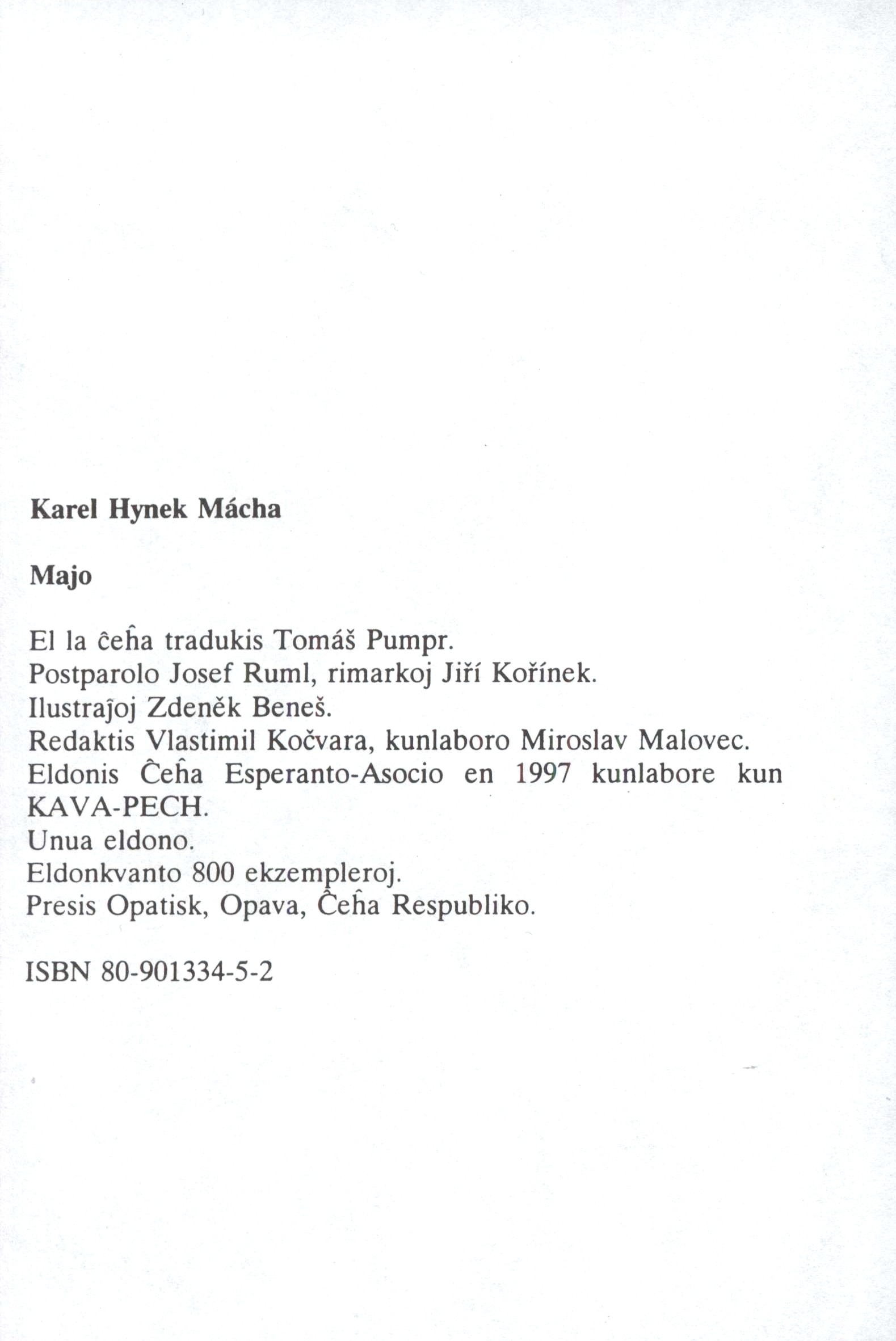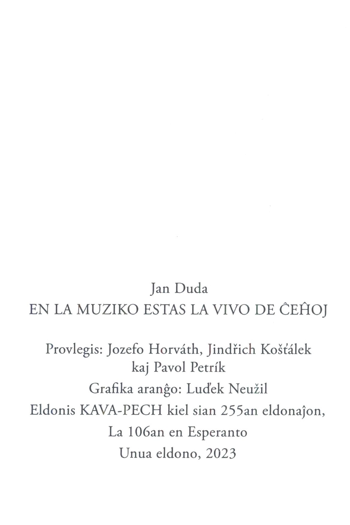 Názvové údaje Majo / Karel Hynek Mácha ; el la ĉeĥa tradukis Tomáš Pumpr ; postparolo Josef Rumler, rimarkoj Jiří Kořínek ; ilustraĵoj Zdeněk Beneš Osobní jméno Mácha, Karel Hynek, 1810-1836 (Autor) Další autoři Pumpr, Tomáš, 1906-1972 (Překladatel) Rumler, Josef, 1922-1999 (Autor doslovu, tiráže atd.) Kořínek, Jiří, 1906-1988 (Jiná role) Beneš, Zdeněk, 1958- (Ilustrátor) Korp. Český esperantský svaz (spolek) (Nakladatel, vydavatel) KAVA-PECH (nakladatelství) (Nakladatel, vydavatel) Opatisk (tiskárna) (Tiskař) Nakladatel [Praha] : Ĉeĥa Esperanto-Asocio, 1997 Výrobce Opava : Opatisk Rozsah 55 stran : ilustrace ; 21 cm Klíčová slova česká poezie * lyrická poezie * epická poezie * básnická skladba Počet ex. 2, z toho volných 2 Druh dok. monografie Signatura C12b 2302, LITb 02949 Názvové údaje Bona fide = V dobrém úmyslu / Otakar Štanc ; grafická úprava a DTP: Luděk Neužil Osobní jméno Štanc, Otakar, 1936- (Autor) Další autoři Neužil, Luděk, 1955- (Knižní grafik) (Typograf) Korp. KAVA-PECH (nakladatelství) (Nakladatel, vydavatel) Typodesign (firma) (Tiskař) Nakladatel Dobřichovice : KAVA-PECH, 2018 Výrobce České Budějovice : Typodesign Rozsah 94 stran ; 20 cm Klíčová slova česká literatura * próza * soubor * články * náměty * fejetony * úvahy Počet ex. 1, z toho volných 1 Druh dok. monografie Signatura C12b 18542 Názvové údaje En la muziko estas la vivo de ĉeĥoj / Jan Duda ; grafika aranĝo: Luděk Neužil Osobní jméno Duda, Jan, 1938- (Autor) Další autoři Neužil, Luděk, 1955- (Knižní grafik) Chrdle, Petr, 1946- (Autor úvodu atd.) Korp. KAVA-PECH (nakladatelství) (Nakladatel, vydavatel) Nakladatel Dobřichovice : KAVA-PECH, 2023 Rozsah 41 stran ; 17 cm Klíčová slova hudba * dějiny hudby * hudební skladatelé * Česko * přednášky Počet ex. 1, z toho volných 1 Druh dok. monografie Signatura LITa 0687 Názvové údaje Francisko Valdomiro Lorenz : atesto pri la vivo kaj verko de eksterordinara homo / Vlastimil Novobilský ; tradukis: Margit Turková ; grafika aranĝo, kovrilo kaj enpaĝigo: Luděk Neužil Osobní jméno Novobilský, Vlastimil, 1935-2021 (Autor) Další autoři Turková, Margit, 1939- (Překladatel) Neužil, Luděk, 1955- (Knižní grafik) (Typograf) (Autor obálky) Korp. KAVA-PECH (nakladatelství) (Nakladatel, vydavatel) Nakladatel Dobřichovice : KAVA-PECH, 2017 Rozsah 159 stran : ilustrace, portréty, faksimile ; 20 cm Osobní hesla Lorenc, František Vladimír, 1872-1957 - lékař, učitel, novinář, redaktor, beletrista, překladatel, esperantista Klíčová slova esperantisté * překladatelé * Češi * emigrace a imigrace * Česko * Brazílie * r. 1872-1957 * stol. 19.-20. * autobiografické vzpomínky Počet ex. 1, z toho volných 1 Druh dok. monografie Signatura LITb 02946 Názvové údaje František Vladimír Lorenc : svědectví o životě a díle neobyčejného člověka / Vlastimil Novobilský ; grafická úprava, DTP a obálka: Luděk Neužil Osobní jméno Novobilský, Vlastimil, 1935-2021 (Autor) Další autoři Neužil, Luděk, 1955- (Knižní grafik) (Typograf) (Autor obálky) Korp. KAVA-PECH (nakladatelství) (Nakladatel, vydavatel) Akcent tiskárna Vimperk (Tiskař) Nakladatel Dobřichovice : KAVA-PECH, 2017 Výrobce Akcent tiskárna Vimperk, s.r.o. Rozsah 151 stran : ilustrace, portréty, faksimile ; 20 cm Osobní hesla Lorenc, František Vladimír, 1872-1957 - lékař, učitel, novinář, redaktor, beletrista, překladatel, esperantista Klíčová slova esperantisté * překladatelé * Češi * emigrace a imigrace * Česko * Brazílie * r. 1872-1957 * stol. 19.-20. * autobiografické vzpomínky Počet ex. 1, z toho volných 1 Druh dok. monografie Signatura LITb 02945 Názvové údaje Golemo kaj aliaj judaj mitoj de la malnova Prago / Eduard Petiška ; tradukis Vladimír Türk ; ilustrajoj: Miroslava Tomečková ; foto sur la lasta kovrilpaĝo: Alena Petišková ; grafika aranĝo kaj enpaĝigo: Luděk Neužil Osobní jméno Petiška, Eduard, 1924-1987 (Autor) Další autoři Türk, Vladimír, 1958- (Překladatel) Tomečková, Miroslava, 1960- (Ilustrátor) Petišková, Alena, 1926-2020 (Fotograf) Neužil, Luděk, 1955- (Knižní grafik) Korp. KAVA-PECH (nakladatelství) (Nakladatel, vydavatel) Nakladatel Dobřichovice : KAVA-PECH, 2024 Rozsah 159 stran : barevné ilustrace ; 21 cm Geografické heslo Židovské Město (Praha, Česko) Klíčová slova česká próza * české příběhy * židovské pověsti * židovské pohádky * literární adaptace * publikace pro děti Počet ex. 1, z toho volných 1 Druh dok. monografie Signatura LITb 02904 Názvové údaje Honore al Eli Urbanová : cent jaroj post la naskiĝo, dek jaroj post la forpaso / redaktoro kaj fotoj Petr Chrdle ; desegnitaj ilustraĵoj Pavel Rak ; grafika prilaboro Luděk Neužil Osobní jméno Urbanová, Eli, 1922-2012 (Autor) (Poctěná osoba) Další autoři Chrdle, Petr, 1946- (Editor) (Fotograf) Rak, Pavel, 1939- (Ilustrátor) Neužil, Luděk, 1955- (Knižní grafik) Korp. KAVA-PECH (nakladatelství) (Nakladatel, vydavatel) Nakladatel Dobřichovice : KAVA-PECH, 2022 Rozsah 71 stran : ilustrace, portréty, fotografie ; 21 cm Osobní hesla Urbanová, Eli, 1922-2012 - hudební pedagožka, básnířka a spisovatelka Předmětová hesla Esperanto women poets - Czechia - 20th-21st centuries * women teachers - Czechia - 20th-21st centuries Klíčová slova jubilejní publikace * pocty * esperanto * osobnosti * básnířky * spisovatelky * učitelky * biografie * vzpomínky * stol. 20.-21. Počet ex. 1, z toho volných 1 Druh dok. monografie Signatura LITb 02173