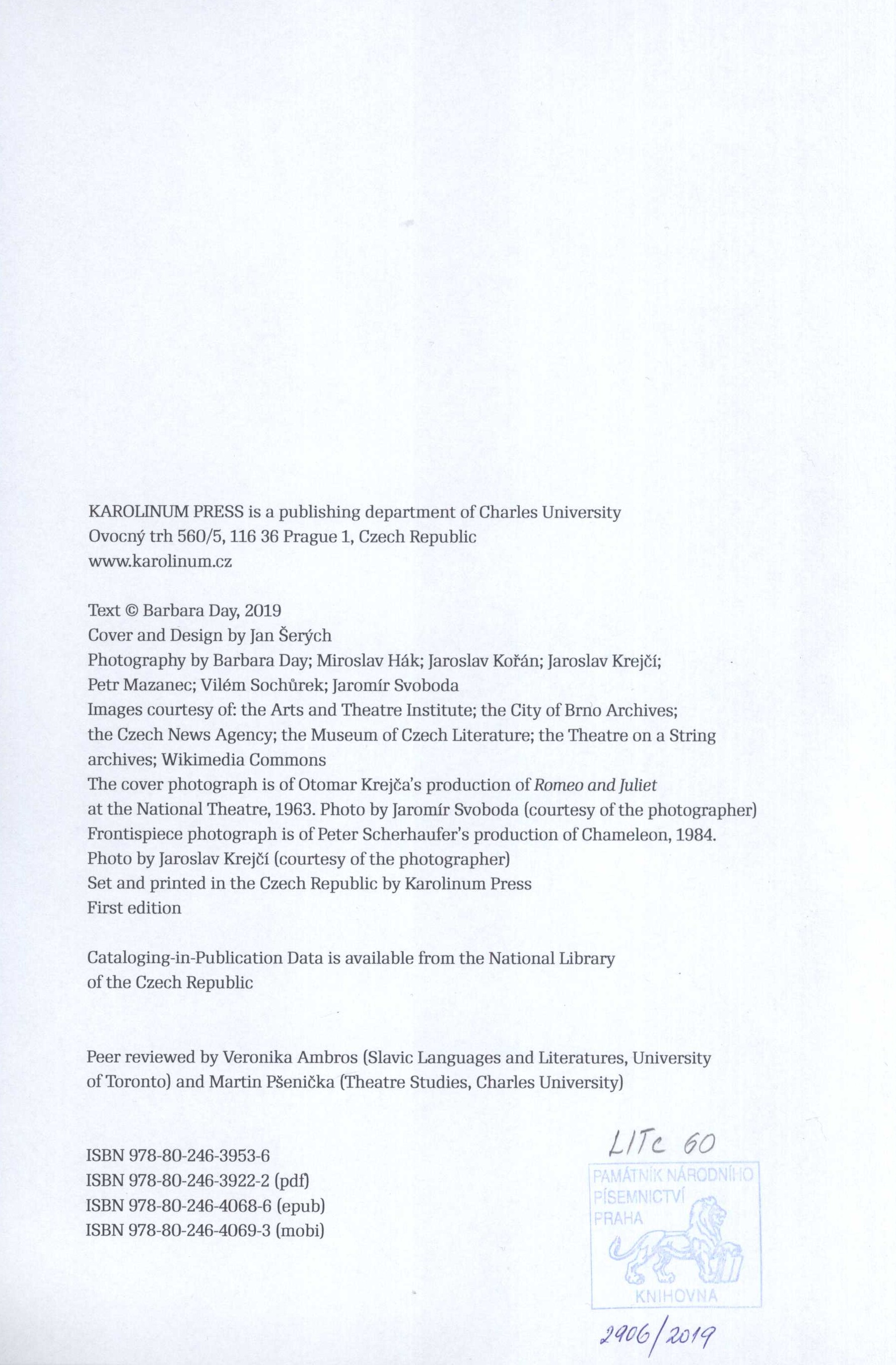 Názvové údaje Obecné dobré podle Melantricha a Veleslavínů : studie k završení knižní tvorby Mistra Daniela Adama z Veleslavína [zemřelého] 18.10.1599 / Mirjam Bohatcová ; latinské dedikace a předmluvy přeložila Marie Kyralová Osobní jméno Bohatcová, Mirjam, 1919-2007 (Autor) Další autoři Kyralová, Marie, 1937- (Překladatel) Korp. Univerzita Karlova (Nakladatel, vydavatel) Karolinum (nakladatelství, tiskárna) (Nakladatel, vydavatel) Nakladatel Praha : Karolinum, 2005 Rozsah 592 s. : faksim. ; 24 cm Osobní hesla Melantrich z Aventinu, Jiří, st., asi 1511-1580 - tiskař, nakladatel, humanista * Adam z Veleslavína, Daniel, 1546-1599 - knihtiskař, historik Klíčová slova nakladatelé * vydavatelství * tiskaři * vydavatelská činnost * dějiny knihtisku * knižní produkce * literární náměty * Česko * stol. 16. * literární život * studie * soupisy Počet ex. 1, z toho volných 1 Druh dok. monografie Signatura C12c 2171 Názvové údaje Česky, prosím I : pracovní sešit : [úroveň A1] / Jitka Cvejnová ; [ilustrace Jiří Franta ; grafická úprava Jan Šerých] Osobní jméno Cvejnová, Jitka, 1955- (Autor) Další autoři Franta, Jiří, 1978- (Ilustrátor) Šerých, Jan, 1972- (Knižní grafik) Korp. Univerzita Karlova (Nakladatel, vydavatel) Karolinum (nakladatelství, tiskárna) (Nakladatel, vydavatel) Lacerta (grafické studio) (Sazeč) Finidr (tiskárna) (Tiskař) Nakladatel V Praze : Univerzita Karlova : Nakladatelství Karolinum, 2008 Výrobce Finidr, s. r. o.) Rozsah 170 s. : il. ; 29,8 cm + 1 CD Předmětová hesla čeština Klíčová slova učebnice * čeština * cizinci * učební lekce * pracovní sešit Počet ex. 1, z toho volných 1 Druh dok. monografie Signatura C12d 1529/2 Názvové údaje Česky, prosím I : učebnice češtiny pro cizince : [úroveň A1] / Jitka Cvejnová ; [ilustrace Jiří Franta ; grafická úprava Jan Šerých] Osobní jméno Cvejnová, Jitka, 1955- (Autor) Další autoři Franta, Jiří, 1978- (Ilustrátor) Šerých, Jan, 1972- (Knižní grafik) Korp. Univerzita Karlova (Nakladatel, vydavatel) Karolinum (nakladatelství, tiskárna) (Nakladatel, vydavatel) Lacerta (grafické studio) (Sazeč) Finidr (tiskárna) (Tiskař) Nakladatel V Praze : Univerzita Karlova : Nakladatelství Karolinum, 2008 Výrobce Finidr, s. r. o.) Rozsah 219 s. : il. (převážně barev.), portréty ; 29,8 cm + 1 CD Předmětová hesla čeština Klíčová slova učebnice * čeština * cizinci * učební lekce Počet ex. 1, z toho volných 1 Druh dok. monografie Signatura C12d 1529/1 Názvové údaje Česká čítanka pro starší školní věk v letech 1870-1970 a její kanonické texty / Jana Čeňková ; [grafická úprava Jan Šerých] Osobní jméno Čeňková, Jana, 1957- (Autor) Další autoři Šerých, Jan, 1972- (Grafický technik) Korp. Karolinum (nakladatelství, tiskárna) (Nakladatel, vydavatel) Nakladatel Praha : Univerzita Karlova : Karolinum, 2011 Rozsah 148 s. : il., faksim. Klíčová slova česká literatura * monografie * literární výchova * výchova a vzdělávání * předmětová didaktika * literární kánon * interpretace literárního díla * čítanky * Čechy a Morava * stol. 19.-20. Počet ex. 1, z toho volných 1 Druh dok. monografie Signatura C12b 13683 Názvové údaje Česká věda a Pražské jaro (1963-1970) : sborník z konference : [Praha 22.-23.listopadu 2000 / pořádané Ústavem dějin a Archivem Univerzity Karlovy ; editoři Blanka Zilynská a Petr Svobodný] Záhlaví-akce Česká věda a Pražské jaro (1963-1970) (konference) (2000 : Praha, Česko) (Jiná role) Další autoři Zilynská, Blanka, 1956- (Editor) Svobodný, Petr, 1958- (Editor) Korp. Univerzita Karlova. Ústav dějin a Archiv UK (Praha (Česko)) (Organizátor akce) Karolinum (nakladatelství, tiskárna) (Nakladatel, vydavatel) Nakladatel Praha : Karolinum, 2001 Rozsah 425 s. : il. ; 21 cm Klíčová slova věda * politika * Pražské jaro 1968 * vědecké ústavy * dějiny vědy * vysoké školy * Československo * stol. 20., léta 60. Počet ex. 1, z toho volných 1 Druh dok. monografie Signatura C12b 5696 Názvové údaje Trial by theatre : reports on Czech drama / Barbara Day ; Cover and Design by Jan Šerých Osobní jméno Day, Barbara, 1944- (Autor) (Fotograf) Další autoři Šerých, Jan, 1972- (Autor obálky) (Knižní grafik) Korp. Karolinum (nakladatelství, tiskárna) (Nakladatel, vydavatel) Tiskárna nakladatelství Karolinum (Tiskař) Nakladatel Praha : Univerzita Karlova, Nakladatelství Karolinum, 2019 Výrobce Praha : tiskárna Nakladatelství Karolinum Rozsah 320 stran : ilustrace, portréty, plánky ; 24 cm Klíčová slova anglická literatura * studie * pojednání * dějiny * české divadlo * historický význam * osobnosti * politický kontext * sociologický kontext * společnost * význam divadla * Československo * stol. 20. Počet ex. 2, z toho volných 2 Druh dok. monografie Signatura LITc 0060, LITc 0060a Názvové údaje Václav Chaloupecký : hledání československých dějin / Milan Ducháček ; [grafická úprava Jan Šerých] Osobní jméno Ducháček, Milan, 1978- (Autor) Další autoři Šerých, Jan, 1972- (Knižní grafik) Korp. Univerzita Karlova (Nakladatel, vydavatel) Karolinum (nakladatelství, tiskárna) (Nakladatel, vydavatel) Tiskárna nakladatelství Karolinum (Tiskař) Nakladatel Praha : Univerzita Karlova v Praze : Nakladatelství Karolinum, 2014 Výrobce (tiskárna Nakladatelství Karolinum) Rozsah 515 s. : il., portréty, faksim. Osobní hesla Chaloupecký, Václav, 1882-1951 - český historik Klíčová slova čeští historici * česká historiografie * Chaloupecký V. * monografie Počet ex. 1, z toho volných 1 Druh dok. monografie Signatura C12b 15714 Názvové údaje Texterritorium : v souřadnicích moderního francouzského písemnictví / Catherine Ébert-Zeminová ; [prorektor-editor Ivan Jakubec ; grafická úprava Jan Šerých ; na obálce použita re