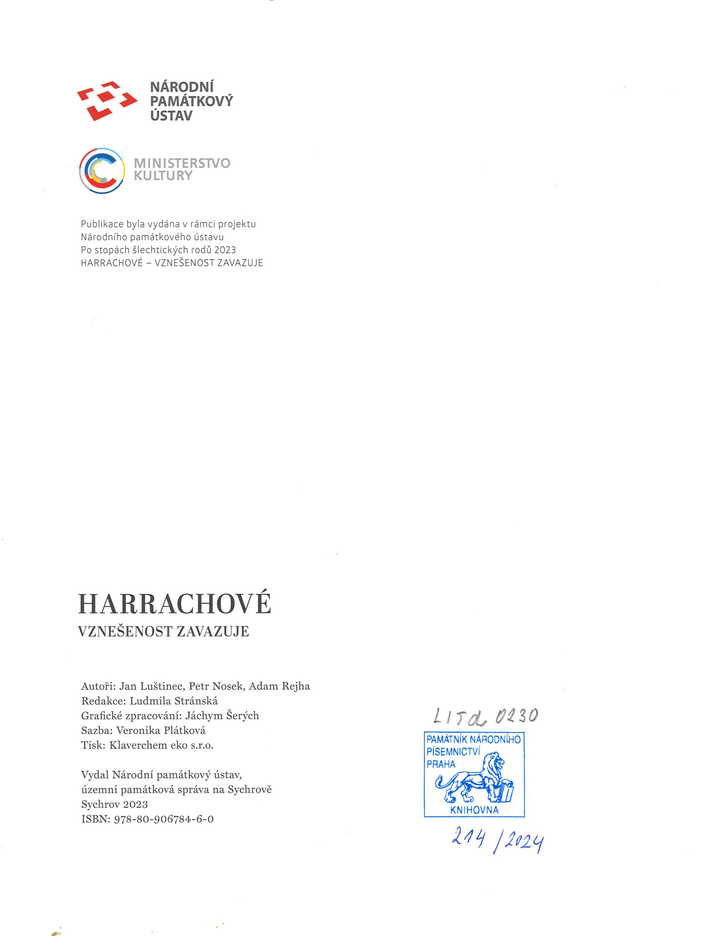 Názvové údaje Harrachové : vznešenost zavazuje / Jan Luštinec, Petr Nosek, Adam Rejha Osobní jméno Luštinec, Jan, 1953- (Autor) Další autoři Nosek, Petr (Autor) Rejha, Adam (Autor) Korp. Národní památkový ústav (Nakladatel, vydavatel) Klaverchem eko (firma) (Herec) Nakladatel Sychrov : Národní památkový ústav, 2023 Výrobce [Petřvald] : Klaverchem eko, s.r.o. Rozsah 203 stran : ilustrace (některé barevné), portréty, faksimile ; 29 cm + 1 genealogická tabulka (59 x 27 cm, složeno na 20 x 27 cm) Osobní hesla Harrachové (rod) Klíčová slova české dějiny * šlechtické rody * genealogie * genealogie rodu * odborné studie * biografie * regionální literatura * obrazové publikace Počet ex. 1, z toho volných 1 Druh dok. monografie Signatura LITd 0230