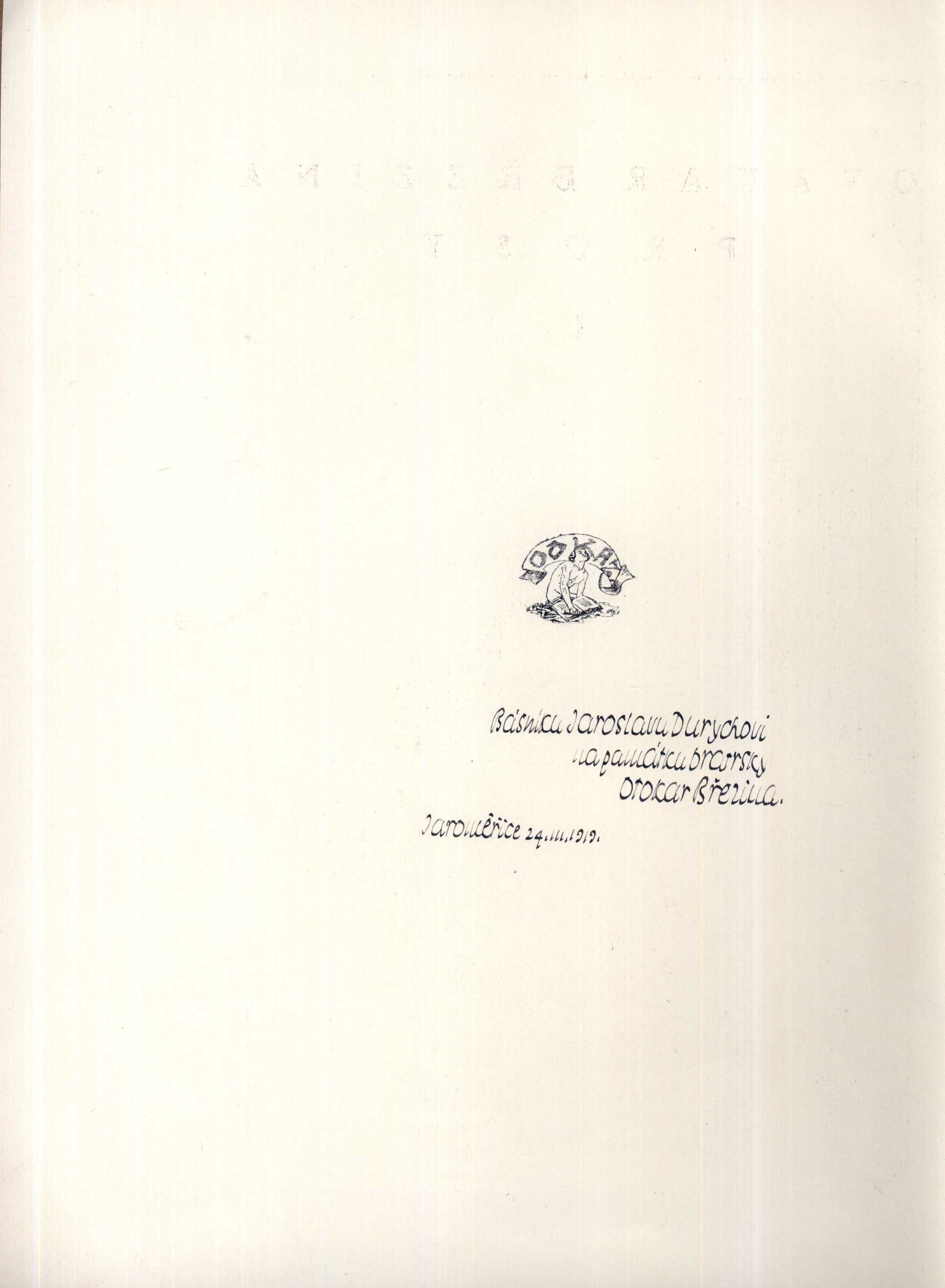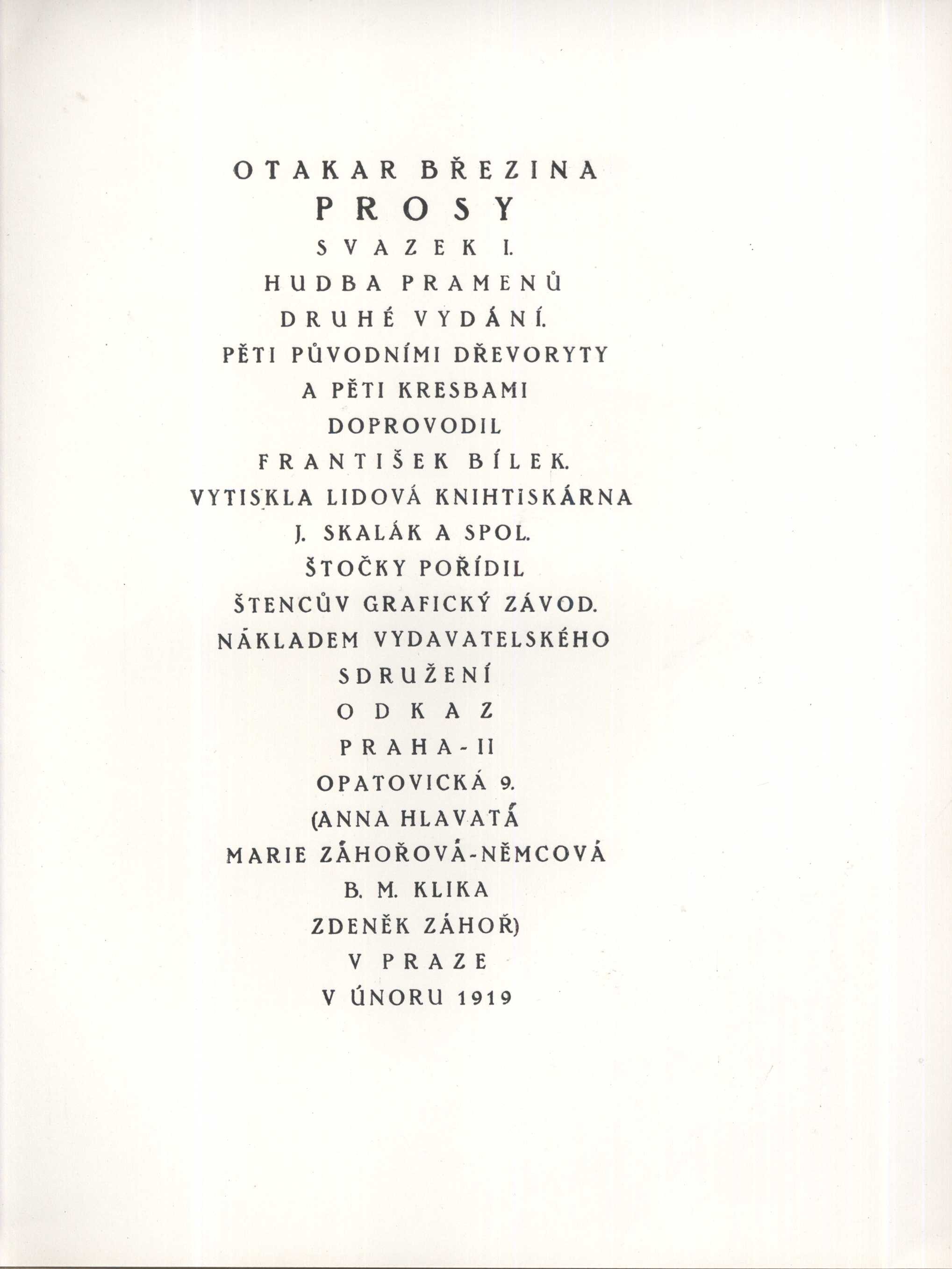 Názvové údaje Osamělý / Juhani Aho ; [knihu tuto z finštiny přeložil Ivan Schulz ; vypravil Miloš Klicman] Osobní jméno Aho, Juhani, 1861-1921 (Autor) Další autoři Schulz, Ivan, 1871-1935 (Překladatel) Klicman, Miloš František, 1890-1957 (Ilustrátor) (Knižní grafik) Korp. Nakladatelství Kamilla Neumannová (Nakladatel, vydavatel) Lidová knihtiskárna J. Skalák a spol. (Tiskař) Nakladatel V Praze : Knihy dobrých autorů, Kamilla Neumannová, 1912 Výrobce (vytiskla Knihtiskárna J. Skaláka a spol.) Rozsah 94 s. : il. ; 21 cm Klíčová slova finská literatura * próza * překlad * novela Počet ex. 1, z toho volných 1 Druh dok. monografie Signatura Topič 0303 Názvové údaje Osamělý / Juhani Aho ; knihu tuto z finštiny přeložil Ivan Schulz ; vypravil Miloš Klicman Osobní jméno Aho, Juhani, 1861-1921 (Autor) Další autoři Klicman, Miloš František, 1890-1957 (Grafický technik) Schulz, Ivan, 1871-1935 (Překladatel) Hellmuthová, Marta, 1917-1988 (Dřívější majitel) Neumannová, Kamila, 1874-1956 (Nakladatel, vydavatel) Korp. Nakladatelství Kamilla Neumannová (Nakladatel, vydavatel) Lidová knihtiskárna J. Skalák a spol. (Tiskař) Nakladatel V Praze : Kamilla Neumannová, 1912 Výrobce V Praze : Knihtiskárna J. Skaláka a spol., 1912 Rozsah 94 stran Klíčová slova finská literatura * prózy * novely Počet ex. 4, z toho volných 4 Druh dok. monografie Signatura Hoffmeister 0374, VMartínek 0958, VHB 2972, P 113 e 6 Názvové údaje Kresby k "Sirotku" / Mikuláš Aleš ; rozborem doprovází František Žákavec ; Josef Váchal Osobní jméno Aleš, Mikoláš, 1852-1913 (Ilustrátor) Další autoři Žákavec, František, 1878-1937 (Autor komentáře) Váchal, Josef, 1884-1969 Korp. B. Kočí (nakladatelství a knihkupectví) (Nakladatel, vydavatel) Lidová knihtiskárna J. Skalák a spol. (Tiskař) Nakladatel Praha : B. Kočí, 1917 Výrobce (Tiskem Lidové knihtiskárny J. Skalák a spol.) Rozsah 19 s. : il. Klíčová slova česká literatura * české písně * národní písně * lidové písně * česká kresba * čeští malíři * Aleš M. * stol. 19. Počet ex. 1, z toho volných 1 Druh dok. monografie Signatura Váchal 217 Názvové údaje Kresby k Sirotku / Mikuláš Aleš ; přístupným rozborem doprovází František Žákavec Osobní jméno Aleš, Mikoláš, 1852-1913 (Ilustrátor) Další autoři Žákavec, František, 1878-1937 (Autor úvodu atd.) Korp. B. Kočí (nakladatelství a knihkupectví) (Nakladatel, vydavatel) Lidová knihtiskárna J. Skalák a spol. (Tiskař) Nakladatel V Praze : Vede a vydává nakladatel B. Kočí, 1917 Výrobce (Tiskem Lidové knihtiskárny J. Skalák a spol.) Rozsah 19 s., [14] l. obr. příl. : il. ; 16 cm Klíčová slova česká literatura * české písně * národní písně * lidové písně * česká kresba * čeští malíři * Aleš M. * stol. 19. * r. 1917 Počet ex. 2, z toho volných 2 Druh dok. monografie Signatura Holan 1631, AVrbova 377 Názvové údaje Ex Ponto / Ivo Andrić ; ze srbochorvatštiny přeložil Josef Pelíšek Osobní jméno Andrić, Ivo, 1892-1975 (Autor) Další autoři Pelíšek, Josef, 1889-1969 (Překladatel) Minařík, Stanislav, 1884-1944 (Nakladatel, vydavatel) Bartulović, Niko, 1890-1943 (Autor úvodu atd.) Korp. Lidová knihtiskárna J. Skalák a spol. (Tiskař) Stanislav Minařík (nakladatelství) (Nakladatel, vydavatel) Nakladatel Na Smíchově : Stanislav Minařík, 1919 Výrobce Tiskem J. Skaláka) Rozsah 131 s. Klíčová slova srbochorvatská literatura * srbochorvatská poezie * básně * próza * básně v próze * reflexe * vězení * vězeňská literatura * vězeňská próza * lyrika * lyrizovaná próza * stol. 20., léta 10. Počet ex. 2, z toho volných 2 Druh dok. monografie Signatura KaG I C2 59, VHB 1673 Názvové údaje Jediný návrat / Zdeněk Bár ; [v úpravě a s kresbami V. Bilovského] Osobní jméno Bár, Zdeněk, 1904-1980 (Autor) (Dedikátor) Další autoři Beneš Buchlovan, Bedřich, 1885-1953 (Dedikant) (Dřívější majitel) (Dárce) Bilovský, Václav, 1902-1967 (Ilustrátor) (Nakladatel, vydavatel) Korp. Oborný a Bradna (Moravská Ostrava, Česko) (Tiskař obrazu) Lidová knihtiskárna J. Skalák a spol. (Tiskař) Nakladatel V Moravské Ostravě : V. Bilovský, 1937 Výrobce (Lidová knihtiskárna) Rozsah 9 s. : il. Klíčová slova česká literatura * stol. 20., léta 30. * bibliofilská vydání * bibliofilské tisky * česká próza * bibliofilie Počet ex. 1, z toho volných 1 Druh dok. monografie Signatura KaG LXI 34 Názvové údaje Peklo / Henri Barbusse ; přeložil Jindřich Hořejší Osobní jméno Barbusse, Henri, 1873-1935 (Autor) Další autoři Hořejší, Jindřich, 1886-1941 (Překladatel) (Dedikátor) Hořejší, Růžena, 1899- (Dedikant) Korp. Ústřední dělnické nakladatelství a knihkupectví (Nakladatel, vydavatel) Lidová knihtiskárna J. Skalák a spol. (Tiskař) Nakladatel V Praze : Ústřední dělnické nakladatelství a knihkupectví (Ant. Svěcený), 1920 Výrobce Lidová knihtiskárna (J. Skalák a spol.) Rozsah 227 stran ; 20 cm Klíčová slova francouzská literatura * překlady do češtiny * romány Počet ex. 3, z toho volných 3 Druh dok. monografie Signatura VMartínek 1536, AHO 0478, AHO 0486 Názvové údaje Hudba pramenů / Otakar Březina ; obrazy doprovodil František Bílek Osobní jméno Březina, Otokar, 1868-1929 (Autor) (Dedikátor) (Autor podpisu) Další autoři Bílek, František, 1872-1941 (Ilustrátor) Durych, Jaroslav, 1886-1962 (Dedikant) Holman, Petr, 1951-2019 (Korektor tištěných materiálů) Bělohlávek, Bedřich, 1902-1991 (Autor podpisu) Korp. Odkaz (nakladatelství) (Nakladatel, vydavatel) Lidová knihtiskárna J. Skalák a spol. (Tiskař) Nakladatel V Praze : nákladem Vydavatelského sdružení Odkaz, 1918 Výrobce Lidová knihtiskárna J. Skalák a spol. Rozsah 51 stran, 10 nečíslovaných listů obrazových příloh : ilustrace ; 23 cm Kl