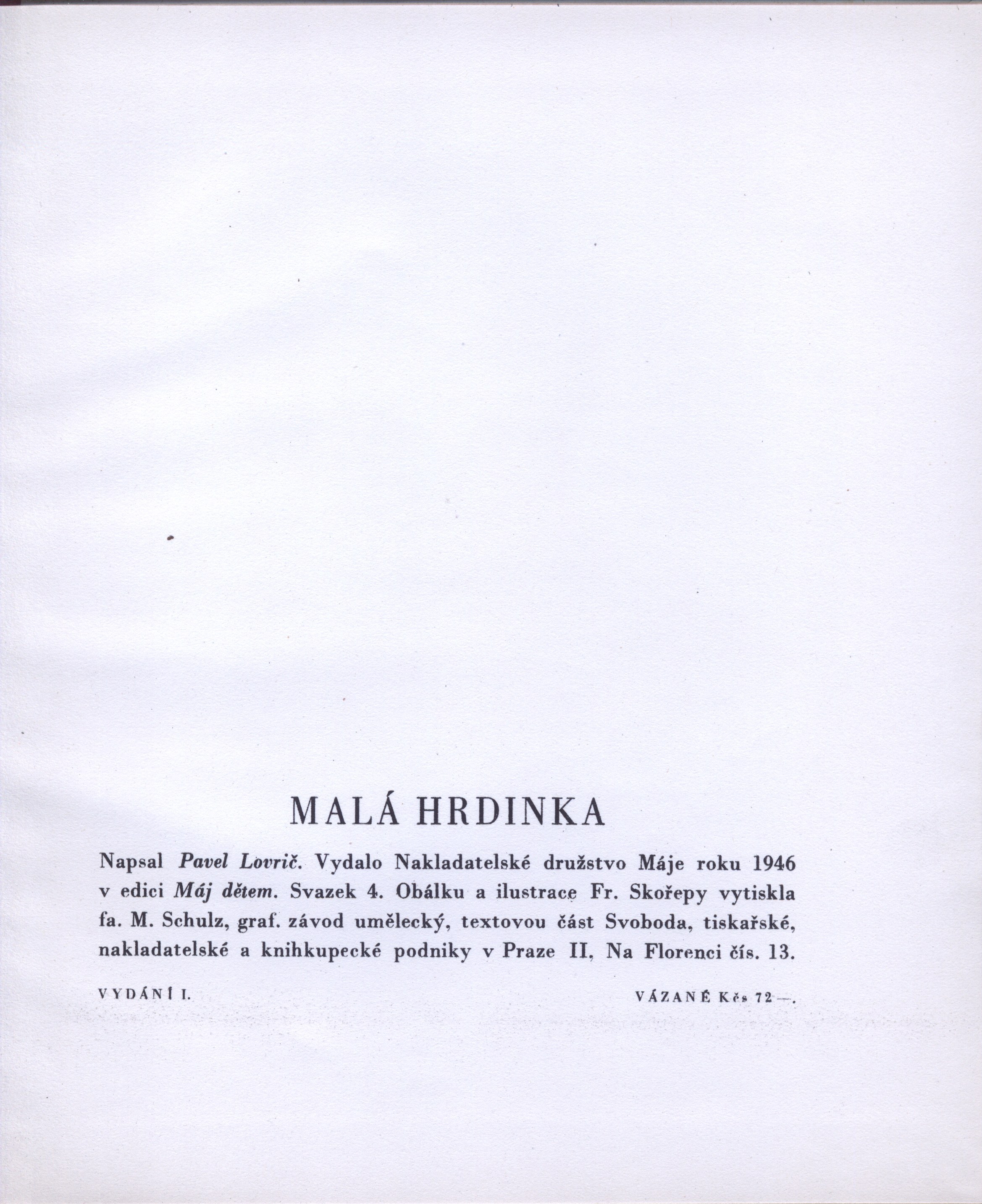 Názvové údaje Romaneta. Svatý Xaverius, Ukřižovaná, Newtonův mozek / Jakub Arbes ; upravil Jiří Karásek ze Lvovic ; ilustrace Františka Tichého Osobní jméno Arbes, Jakub, 1840-1914 (Autor) Další autoři Karásek ze Lvovic, Jiří, 1871-1951 (Editor) Tichý, František, 1896-1961 (Ilustrátor) Korp. Jos. R. Vilímek (nakladatelství) (Nakladatel, vydavatel) Jos. R. Vilímek (knihtiskárna) (Tiskař) M. Schulz (Praha, Česko) (Tiskař obrazu) Nakladatel V Praze : nakladatelství Jos. R. Vilímek, 1940 Rozsah 301 stran, 8 nečíslovaných barevných obrazových příloh : ilustrace Klíčová slova česká próza * české povídky * romaneta * tajuplné příběhy Počet ex. 3, z toho volných 3 Druh dok. monografie Signatura M 147 d 29, P 23 a 32, ZA 3 b 49 Názvové údaje Romaneta : Svatý Xaverius. Ukřižovaná. Newtonův mozek / Jakub Arbes ; [upravil Jiří Karásek ze Lvovic ; ilustrace Frant. Tichého] Osobní jméno Arbes, Jakub, 1840-1914 (Autor) Další autoři Karásek ze Lvovic, Jiří, 1871-1951 (Editor) Tichý, František, 1896-1961 (Ilustrátor) (Autor obálky) Korp. Jos. R. Vilímek (nakladatelství) (Nakladatel, vydavatel) M. Schulz (Praha, Česko) (Tiskař obrazu) Nakladatel V Praze : Nakladatelství Jos. R. Vilímek, 1940 Rozsah 301 s., [8] l. obrazových příloh : il. Klíčová slova česká literatura * romaneto * česká próza * romaneta * tajemné příběhy Počet ex. 2, z toho volných 2 Druh dok. monografie Signatura KaG LII D2 40, VHB 0233 Názvové údaje Sigismund Ludvík Bouška : informační stať o životě a díle básníka / napsal Vilém Bitnar Osobní jméno Bitnar, Vilém, 1874-1948 (Autor) (Autor podpisu) Další autoři Bouška, Sigismund, 1867-1942 (Ilustrátor) Korp. M. Schulz (Praha, Česko) (Tiskař obrazu) Českoslovanská akciová tiskárna (Tiskař) Universum, nakladatelství dobré knihy (Nakladatel, vydavatel) Nakladatel Praha : Universum, 1932 Výrobce (Českoslovanská akciová tiskárna) Rozsah 75 s. : il. Osobní hesla Bouška, Sigismund, 1867-1942 - katolický kněz, básník, prozaik, literární a výtvarný kritik, překladatel Klíčová slova česká literatura * čeští spisovatelé * literární historie * katolická literatura * katolická moderna Počet ex. 2, z toho volných 2 Druh dok. monografie Signatura KaG XXXII D2 22, VHB 1440 Názvové údaje Čtvrtá překážka : příběh jednoho krátkého života / Jelena Iljina ; [z ruského originálu ... přeložila Olga Ptáčková-Macháčková ; obálku a ilustrace Vladimíra Bidla provedla ...] Osobní jméno Il'jina, Jelena Jakovlevna, 1901-1964 (Autor) Další autoři Ptáčková-Macháčková, Olga, 1906-1992 (Překladatel) Bidlo, Vladimír, 1926-1997 (Autor obálky) (Ilustrátor) Korp. Nakladatelské družstvo Máje (Nakladatel, vydavatel) Svoboda (Hradec Králové) (Tiskař) M. Schulz (Praha, Česko) (Tiskař obrazu) Nakladatel V Praze : Nakladatelské družstvo Máje, 1947 Výrobce tiskárna Svoboda) Rozsah 255 s., [1+4] l. il. ; 21 cm Klíčová slova ruská literatura * próza * překlad * 2. světová válka * Rusko * biografické romány * válečné události * literatura pro děti a mládež Počet ex. 1, z toho volných 1 Druh dok. monografie Signatura Máj 048 Názvové údaje Broučci : pro malé i veliké děti / Jan Karafiát ; zobrazil Rudolf Mates Osobní jméno Karafiát, Jan, 1846-1929 (Autor) Další autoři Mates, Rudolf, 1881-1966 (Ilustrátor) Korp. Nakladatelství Alois Hynek (Nakladatel, vydavatel) M. Schulz (Praha, Česko) (Tiskař) Nakladatel V Praze : A. Hynek, [mezi 1928 a 1930] Výrobce Tiskem M. Schulz Rozsah 107 stran : barevné ilustrace ; 27 cm Klíčová slova česká literatura * próza * literatura pro děti * literatura pro děti a mládež Počet ex. 1, z toho volných 0 Druh dok. monografie Signatura C12c 5486 Názvové údaje Malá hrdinka / Pavel Lovrič ; [obálku a ilustrace Fr. Skořepy ...] Osobní jméno Lovrič, Pavel, 1913-1997 (Autor) Další autoři Skořepa, František, 1912-1976 (Autor obálky) (Ilustrátor) Korp. Nakladatelské družstvo Máje (Nakladatel, vydavatel) M. Schulz (Praha, Česko) (Tiskař obrazu) Svoboda (tiskárna) (Tiskař) Nakladatel V Praze : Nakladatelské družstvo Máje, 1946 Výrobce (Svoboda, tiskařské, nakladatelské a knihkupecké podniky) Rozsah 39 s., [4] l. barev. il. : il. ; 25 cm Klíčová slova česká literatura * próza * literatura pro děti * ilustrované knihy Počet ex. 1, z toho volných 1 Druh dok. monografie Signatura Máj 117 Názvové údaje Drašar : román kněze buditele / Teréza Nováková ; [ilustroval V. Kocourek] Osobní jméno Nováková, Teréza, 1853-1912 (Autor) Další autoři Kocourek, Václav, 1915-1986 (Ilustrátor) Korp. Jos. R. Vilímek (nakladatelství) (Nakladatel, vydavatel) (Tiskař) M. Schulz (Praha, Česko) (Tiskař obrazu) Nakladatel V Praze : Jos. R. Vilímek, 1940 Rozsah 422 s., [8] l. obr. příl. : il. Klíčová slova česká literatura * česká próza * český román Počet ex. 1, z toho volných 1 Druh dok. monografie Signatura VHB 0932 Názvové údaje Červen jde písčinami / Jan Ryba ; obálka a kresby od J. Istlera Osobní jméno Ryba, Jan, 1913-1982 (Autor) Další autoři Istler, Josef, 1919-2000 (Ilustrátor) Korp. Josef Lukasík (nakladatelství) (Nakladatel, vydavatel) H. Lüdemann (Český Těšín) (Tiskař) M. Schulz (Praha, Česko) (Tiskař obrazu) Nakladatel Moravská Ostrava ; Praha : Nakladatelství J. Lukasík, 1946 Výrobce V Čes. Těšíně : knihtiskárna H. Lüdemann ; Praha : grafické závody M. Schulz Rozsah 232 stran, 5 nečíslovaných obrazových příloh ; 22,5 cm Klíčová slova česká próza * české povídky Počet ex. 1, z toho volných 1 Druh dok. monografie Signatura C12b 18731 Názvové údaje Černí myslivci : horské romány / Růžena Svobodová ; [obálka, 8 barevných a 53 jednobarevných ilustrací Václava Karla] Osobní jméno Svobodová, Růžena, 1868-1920 (Autor) Dalš