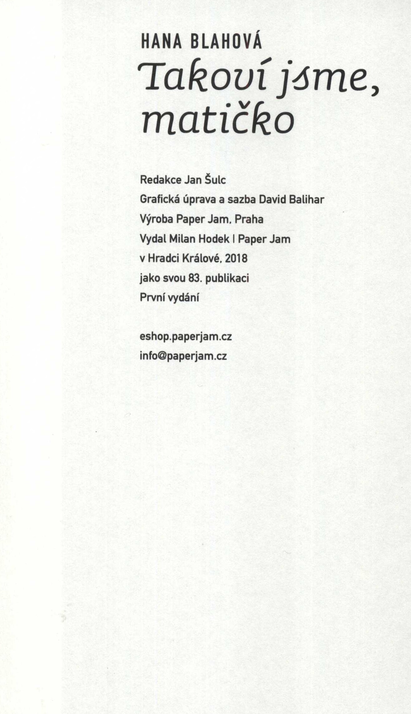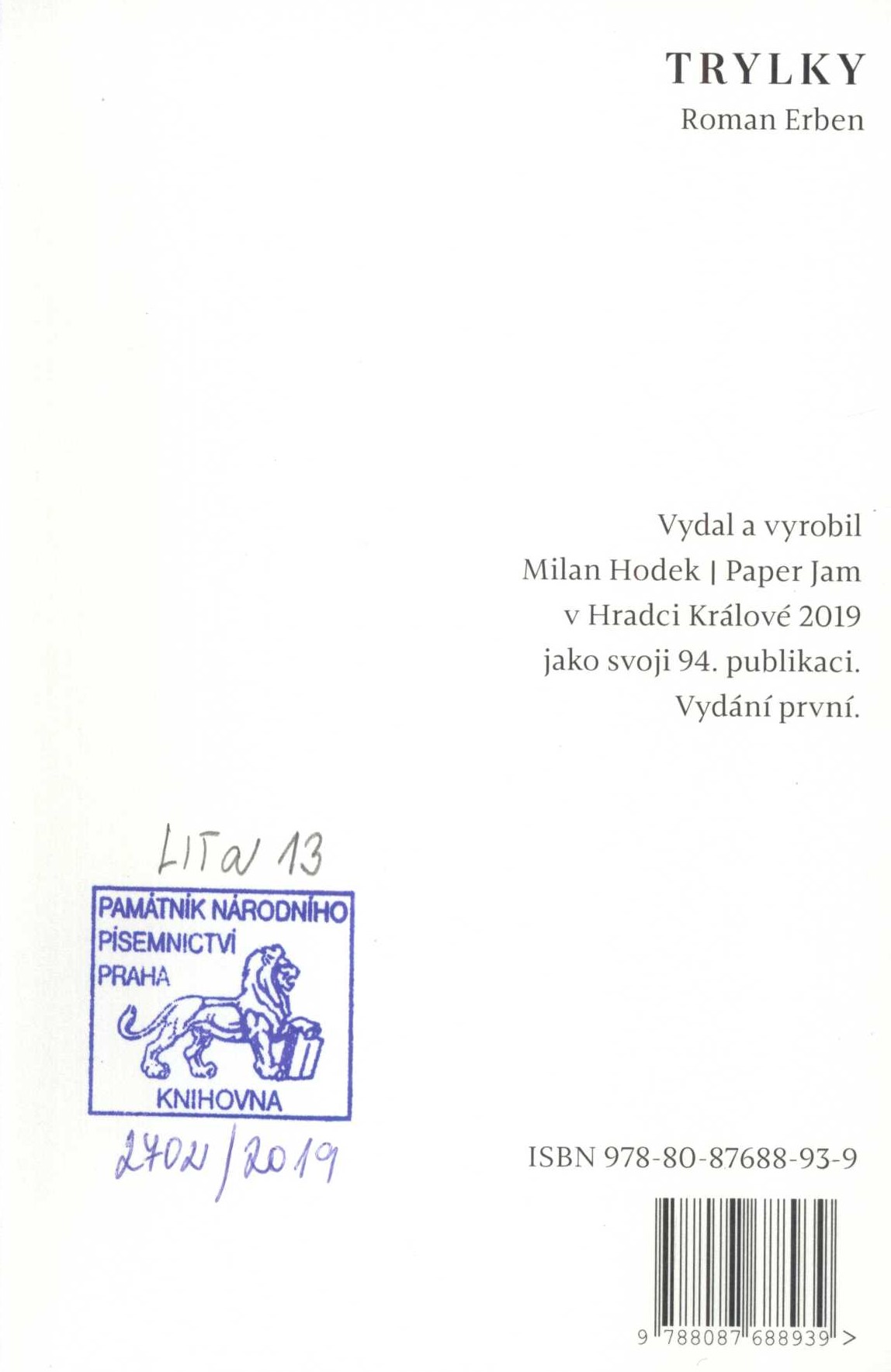 Názvové údaje Kufr s milenkami a jiné příběhy / Zdena Bratršovská, František Hrdlička Osobní jméno Bratršovská, Zdena, 1951- (Autor) Další autoři Hrdlička, František, 1937- (Autor) Korp. Paper Jam (tiskárna) (Nakladatel, vydavatel) (Tiskař) Milan Hodek (nakladatelství) (Nakladatel, vydavatel) Nakladatel V Hradci Králové : Milan Hodek - Paper Jam, 2015 Rozsah 251 stran ; 17 cm Klíčová slova česká próza * české povídky Počet ex. 1, z toho volných 1 Druh dok. monografie Signatura C12a 5700 Názvové údaje Šprýmy s/z rýmy : limericky pro malé i velké / Zdena Bratršovská, František Hrdlička ; ilustrace Alena Krchová Osobní jméno Bratršovská, Zdena, 1951- (Autor) Další autoři Hrdlička, František, 1937- (Autor) Krchová, Alena, 1990- (Ilustrátor) Korp. Milan Hodek (nakladatelství) (Nakladatel, vydavatel) Paper Jam (tiskárna) (Tiskař) Nakladatel V Hradci Králové : Milan Hodek - Paper Jam, 2019 Výrobce Praha : Paper Jam Rozsah 102 stran : barevné ilustrace ; 17 cm Klíčová slova česká poezie * limeriky Počet ex. 1, z toho volných 1 Druh dok. monografie Signatura LITa 0051 Názvové údaje Trylky / Roman Erben Osobní jméno Erben, Roman, 1940- (Autor) (Ilustrátor) Další autoři Milan Hodek (nakladatelství) (Nakladatel, vydavatel) Paper Jam (tiskárna) (Tiskař) Nakladatel V Hradci Králové : Milan Hodek - Paper Jam, 2019 Rozsah 49 nečíslovaných listů : ilustrace ; 16 cm Klíčová slova česká literatura * autorská kniha * poezie * básně * ilustrované vydání Počet ex. 1, z toho volných 1 Druh dok. monografie Signatura LITa 0013