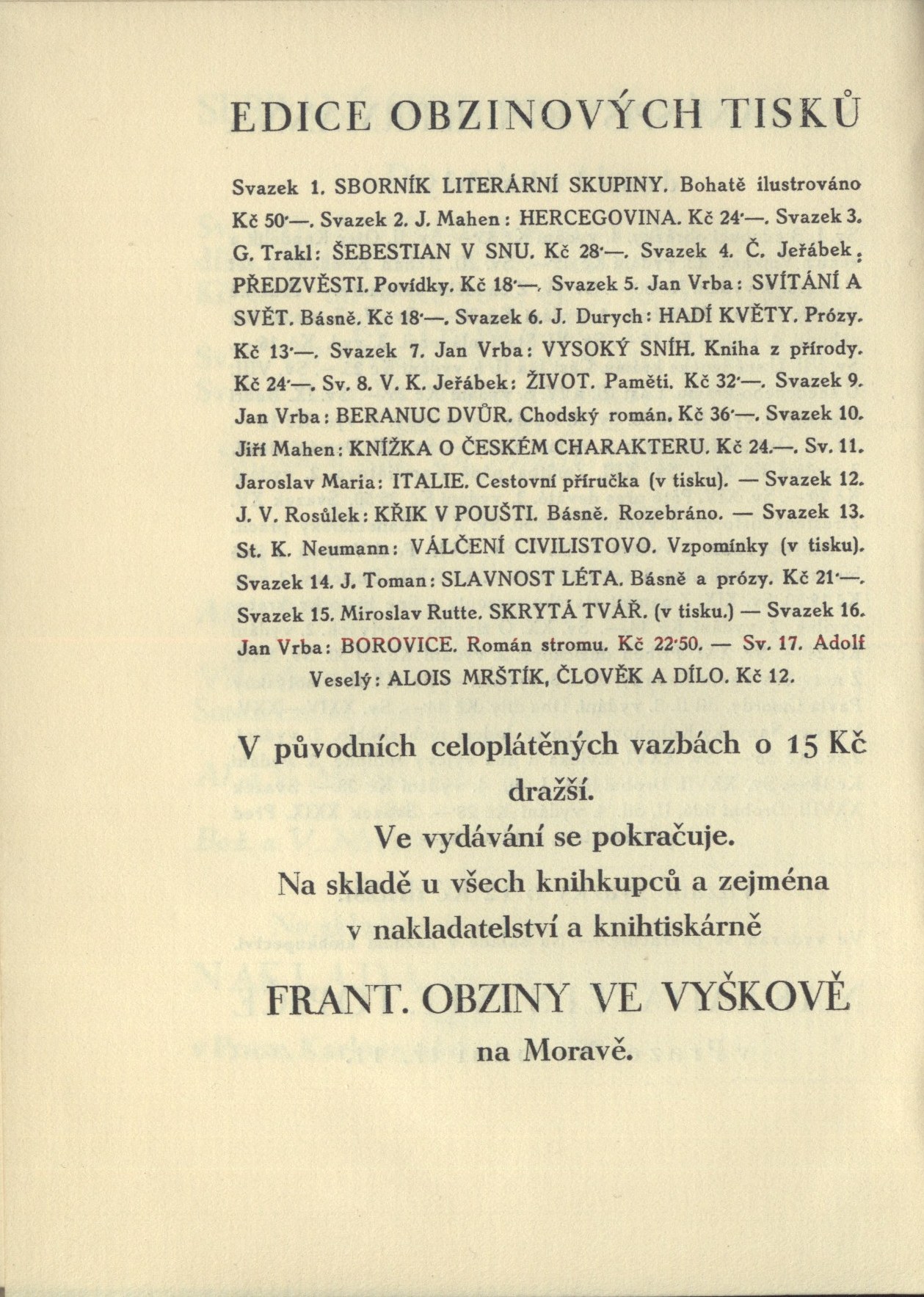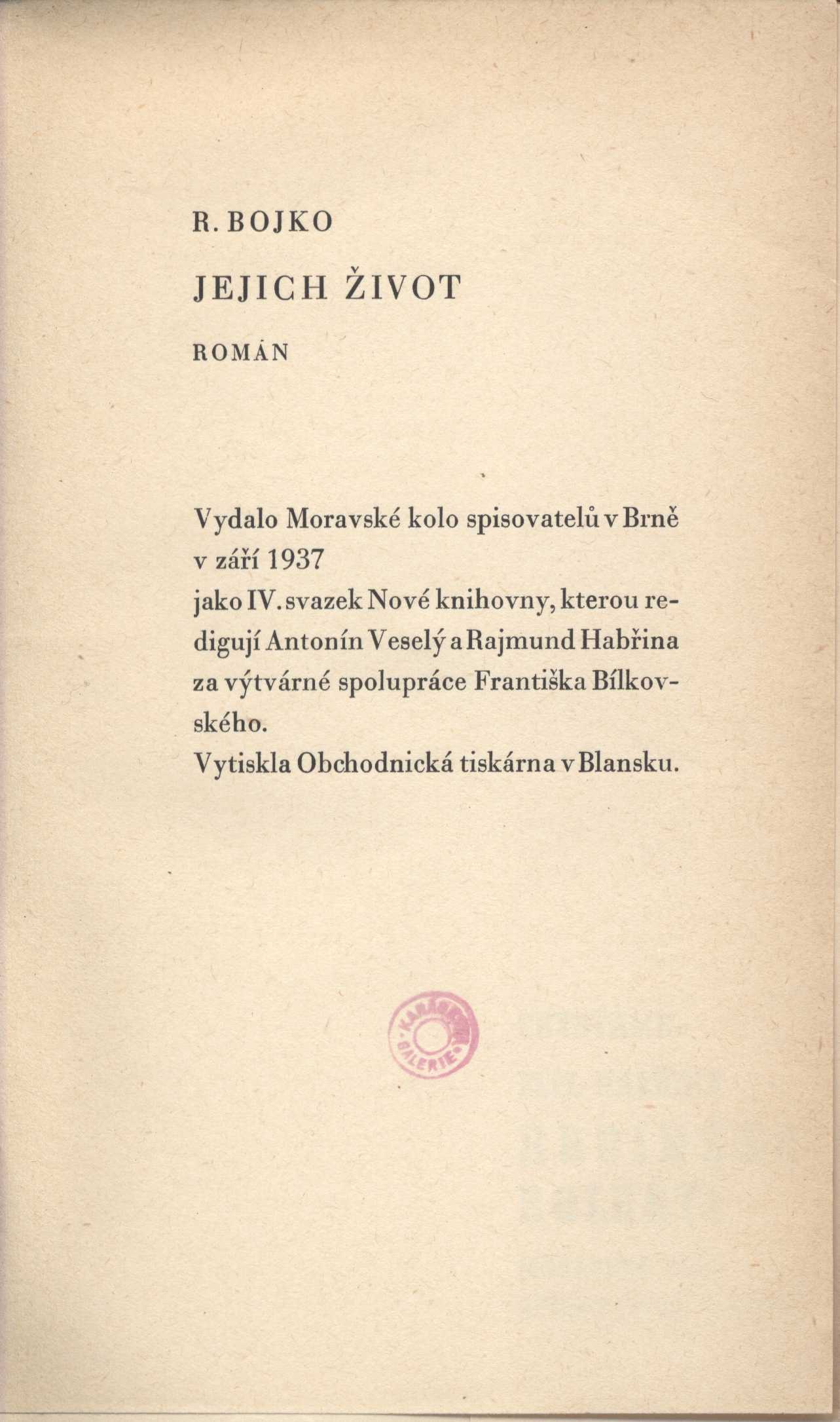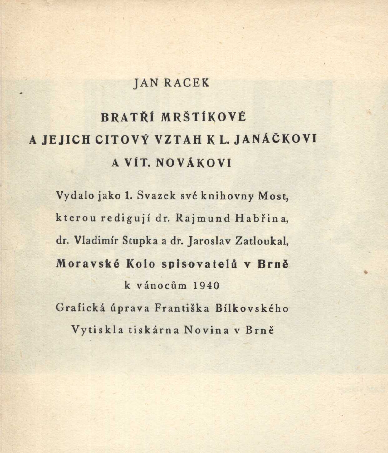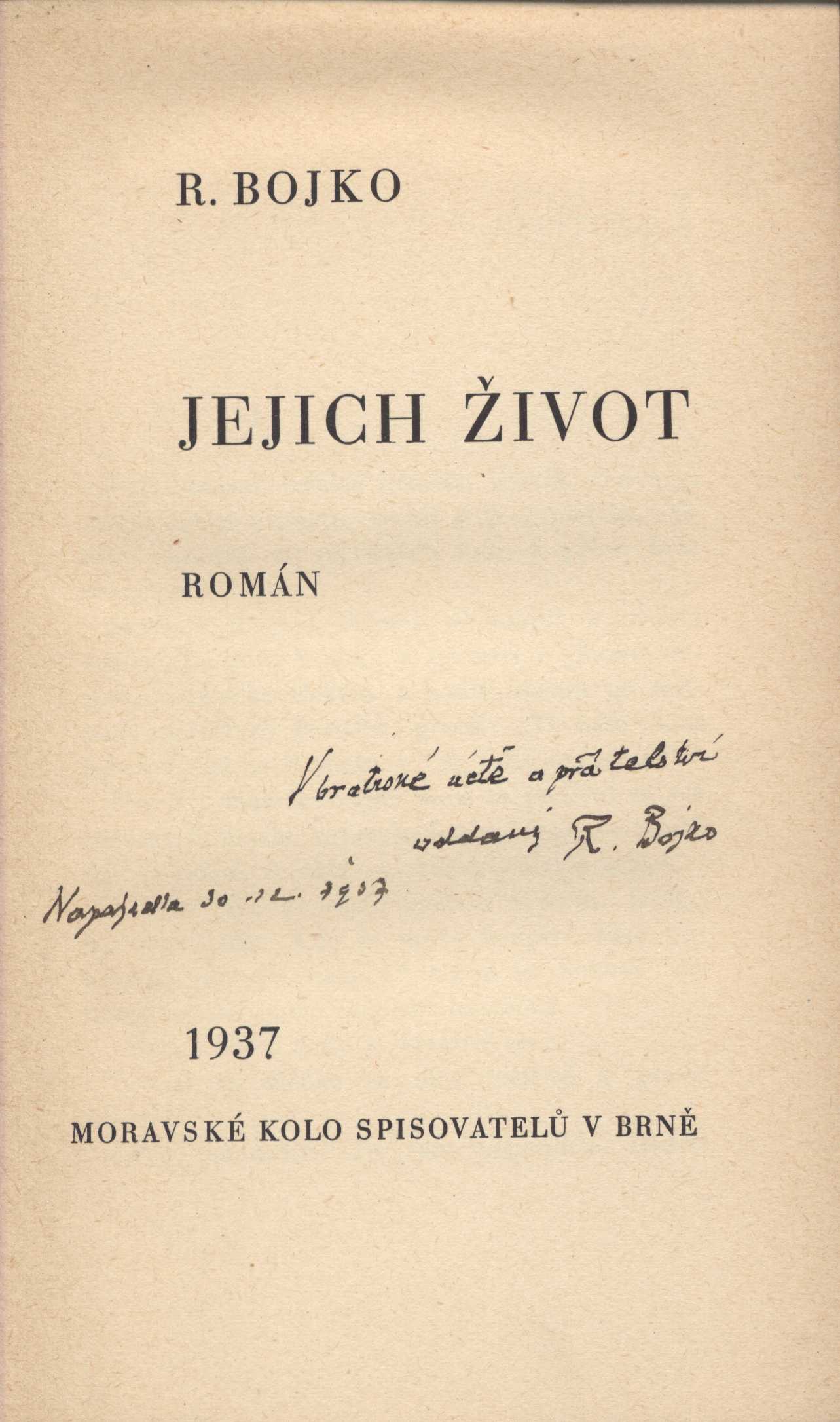 Názvové údaje Krev a zlato / básně Endre Adyho ; přebásnil Mirek Elpl ; frontispic J. Horn Osobní jméno Ady, Endre, 1877-1919 (Autor) Další autoři Elpl, Mirek, 1905-1960 (Překladatel) Horn, Josef, 1902-1951 (Ilustrátor) Korp. Moravské kolo spisovatelů (1912-1949) (Nakladatel, vydavatel) Obchodnická tiskárna (Blansko, Česko) (Tiskař) Nakladatel V Brně : Moravské kolo spisovatelů, 1935 Výrobce V Blansku : Obchodnická tiskárna Rozsah 39 stran Počet ex. 2, z toho volných 2 Druh dok. monografie Signatura P 94 d 16, P 94 c 98 Názvové údaje Sen ve stínu / Zdeněk Bár ; [za redakce Antonína Veselého, Rajmunda Habřiny a Mirka Elpla ; v grafické úpravě Frant. Bílkovského ; s kresbou Aljo Berana] Osobní jméno Bár, Zdeněk, 1904-1980 (Autor) (Dedikátor) Další autoři Beneš Buchlovan, Bedřich, 1885-1953 (Dedikant) Veselý, Antonín, 1888-1945 (Editor) Habřina, Rajmund, 1907-1960 (Editor) Elpl, Mirek, 1905-1960 (Editor) Bílkovský, František, 1909-1998 (Knižní grafik) Beran, Aljo, 1907-1990 (Ilustrátor) Korp. Moravské kolo spisovatelů (1912-1949) (Nakladatel, vydavatel) Obchodnická tiskárna (Blansko, Česko) (Tiskař) Nakladatel V Brně : Moravské kolo spisovatelů, 1940 Rozsah 50 s. : il. Klíčová slova česká poezie * česká literatura * lyrické básně * stol. 20., léta 10.-40. Počet ex. 2, z toho volných 2 Druh dok. monografie Signatura C12b 7687, KaG V23 A 148 Názvové údaje Jejich život : román / R. Bojko ; [za výtvarné spolupráce Františka Bílkovského.] Osobní jméno Bojko, R., 1877-1952 (Autor) (Dedikátor) Další autoři Bílkovský, František, 1909-1998 (Autor obálky) Korp. Moravské kolo spisovatelů (1912-1949) (Nakladatel, vydavatel) Obchodnická tiskárna (Blansko, Česko) (Tiskař) Nakladatel V Brně : Moravské kolo spisovatelů, 1937 Rozsah 289, [3] s. Klíčová slova česká próza * česká literatura * romány * stol. 20., léta 30. Počet ex. 2, z toho volných 2 Druh dok. monografie Signatura C12b 7708, KaG XLVII C 23 Názvové údaje Kamarádi : [verše pro mládež] / Josef Cipr Osobní jméno Cipr, Josef, 1881-1956 (Autor) Další autoři Moravské kolo spisovatelů (1912-1949) (Nakladatel, vydavatel) Nakladatel Brno : Moravské Kolo spisovatelů, 1929 Rozsah 36 s. : barev. il. ; 8° Klíčová slova literatura pro děti a mládež * česká poezie * básně * stol. 20., léta 20. Počet ex. 1, z toho volných 1 Druh dok. monografie Signatura C12c 1829 Názvové údaje Sasanky : básně / Rajmund Habřina Osobní jméno Habřina, Rajmund, 1907-1960 (Autor) Další autoři Moravské kolo spisovatelů (1912-1949) (Nakladatel, vydavatel) Obchodnická tiskárna (Blansko, Česko) (Tiskař) Nakladatel V Brně : Moravské kolo spisovatelů, 1938 Výrobce V Blansku : Obchodnická tiskárna Rozsah 49 stran ; 18,5 cm Klíčová slova česká literatura * česká poezie * lyrika * dekadence * stol. 20., léta 30. Počet ex. 3, z toho volných 3 Druh dok. monografie Signatura Hora I 487, P 124 e 10, Eisner 0058 Názvové údaje Proutěná píšťala : básně 1933-1935 / Zdeněk Kriebel Osobní jméno Kriebel, Zdeněk, 1911-1989 (Autor) Další autoři Moravské kolo spisovatelů (1912-1949) (Nakladatel, vydavatel) Obchodnická tiskárna (Blansko, Česko) (Tiskař) Nakladatel V Brně : Moravské kolo spisovatelů, 1938 Výrobce V Blansku : Obchodnická tiskárna Rozsah 68 stran ; 21 cm Klíčová slova česká poezie * sbírka básní * r. 1933-1935 Počet ex. 2, z toho volných 2 Druh dok. monografie Signatura C12b 7739, P 42 F 82 Názvové údaje Zlé znamení / František Kropáč ; [za výtvarné spolupráce Františka Bílkovského] Osobní jméno Kropáč, František, 1898-1966 (Autor) (Dedikátor) Další autoři Hellmuth-Brauner, Vladimír, 1910-1982 (Dedikant) Bílkovský, František, 1909-1998 (Knižní grafik) Korp. Moravské kolo spisovatelů (1912-1949) (Nakladatel, vydavatel) Obchodnická tiskárna (Blansko, Česko) (Tiskař) Nakladatel V Brně : Moravské kolo spisovatelů, 1938 Rozsah 254 s. Klíčová slova česká literatura * česká próza * český román * román * psychologická próza * psychologický román Počet ex. 1, z toho volných 1 Druh dok. monografie Signatura VHB 0715 Názvové údaje Pastýř z Javorníků / Jaroslav Marcha ; [obálka a frontispic F. Bílkovský] Osobní jméno Marcha, Jaroslav, 1880-1961 (Autor) Další autoři Bílkovský, František, 1909-1998 (Ilustrátor) (Autor obálky) Korp. Moravské kolo spisovatelů (1912-1949) (Nakladatel, vydavatel) Obchodnická tiskárna (Blansko, Česko) (Tiskař) Nakladatel V Brně : Moravské kolo spisovatelů, 1937 Výrobce (Moravské kolo spisovatelů) Rozsah 35 s. Klíčová slova česká poezie * epická poezie * epická báseň * Morava Počet ex. 1, z toho volných 1 Druh dok. monografie Signatura VHB 0800 Názvové údaje Alois Mrštík člověk a dílo / [uspořádal a vypravil Adolf Veselý] Osobní jméno Mrštík, Alois, 1861-1925 (Umělec) (Autor) Další autoři Veselý, Adolf, 1886-1961 (Sestavovatel, kompilátor) Kopřiva, Emil, 1885-1938 (Ilustrátor) Bezruč, Petr, 1867-1958 (Autor) Martínek, Vojtěch, 1887-1960 (Autor doslovu, tiráže atd.) Korp. František Obzina (tiskárna, nakladatelství) (Nakladatel, vydavatel) Moravské kolo spisovatelů (1912-1949) (Nakladatel, vydavatel) Nakladatel Ve Vyškově : vytiskl a vydal František Obzina, 1925 Rozsah 42 s., [1+16] l. obr. příl. ; 16 cm Osobní hesla Mrštík, Alois, 1861-1925 - prozaik Klíčová slova česká literatura * životopis * Mrštík A. * fotografie * číslovaný výtisk Počet ex. 1, z toho volných 1 Druh dok. monografie Signatura Topič 0631 Názvové údaje Bratří Mrštíkové a jejich citový vztah k Leoši Janáčkovi a Vítězslavu Novákovi : hrst vzpomínek a dopisů / Jan Racek ; [grafická úprava Františka Bílkovského] Osobní jméno Racek, Jan, 1905-1979 (Autor) Další autoři Bílkovský, František, 1909-1998 (Knižní