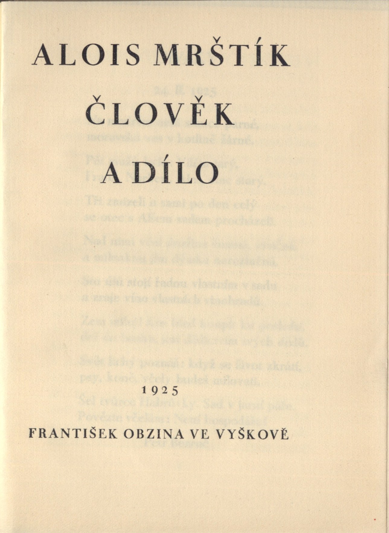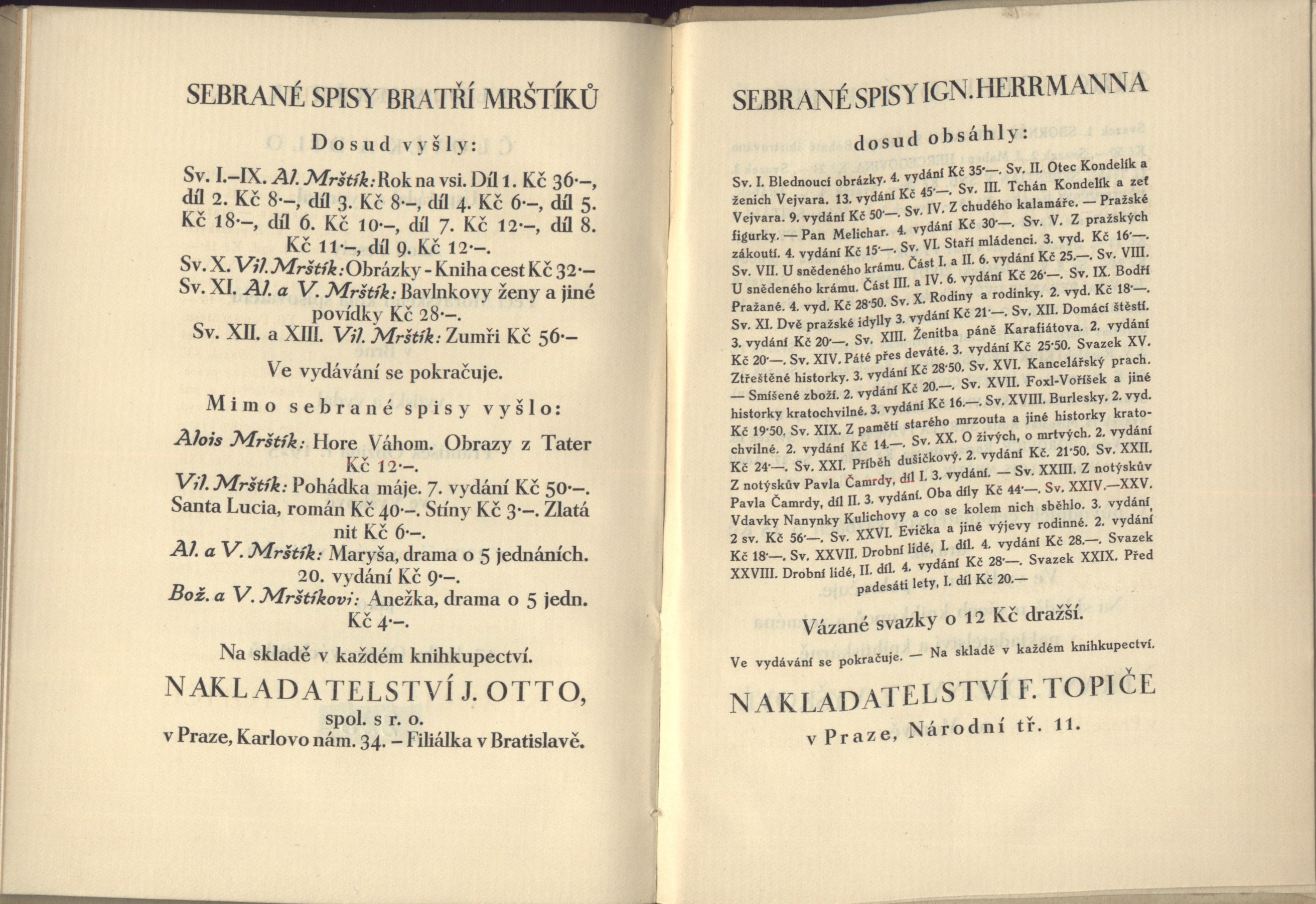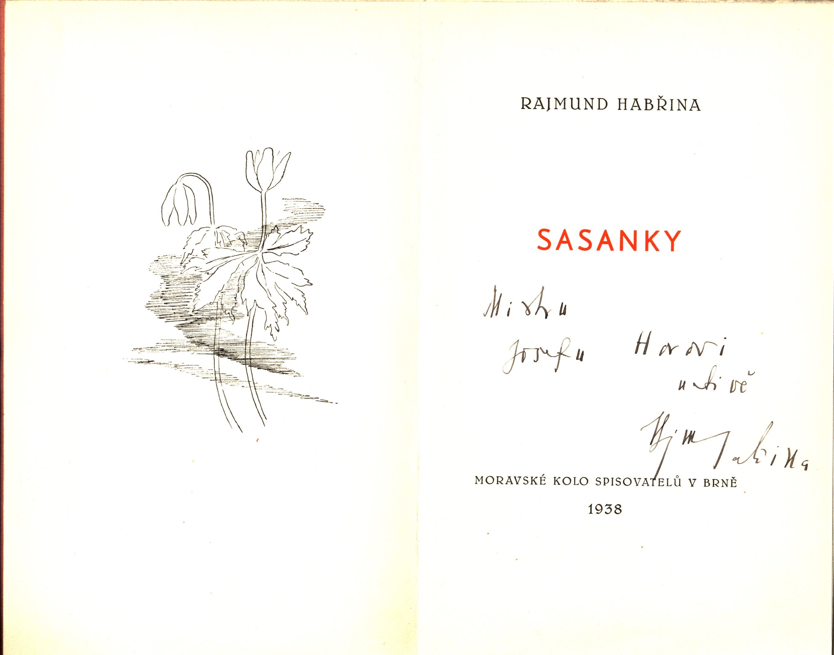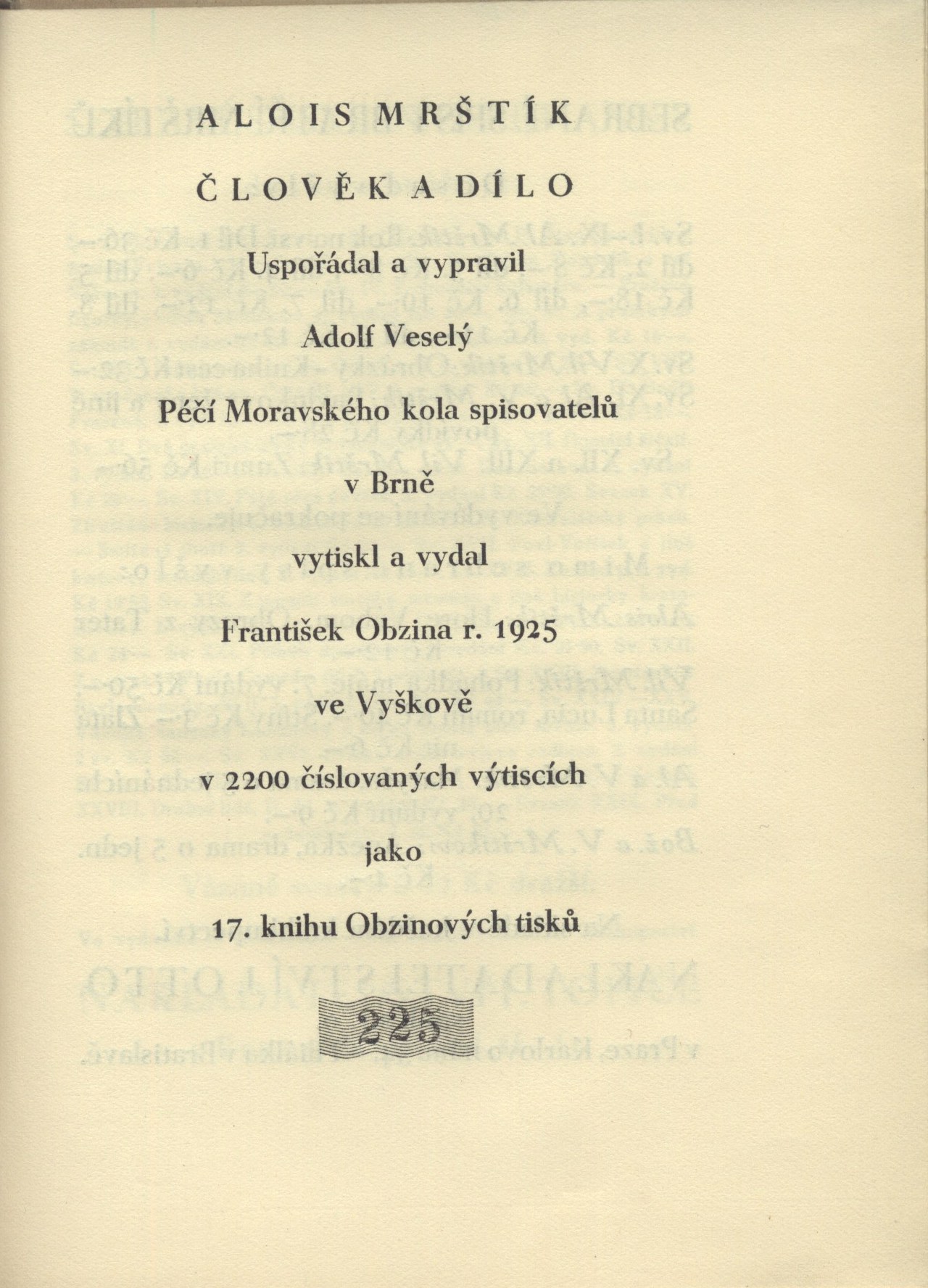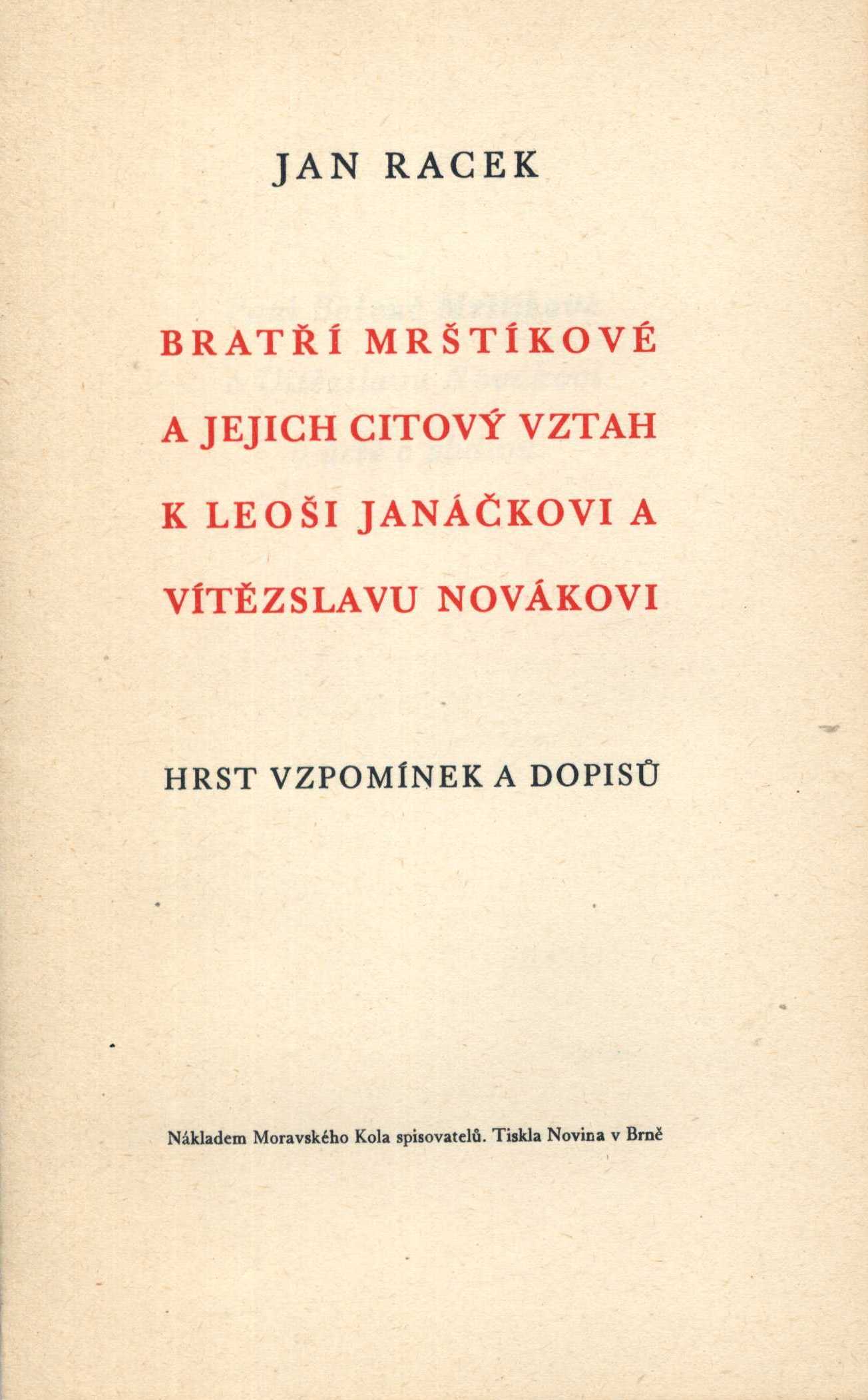 Názvové údaje Krev a zlato / básně Endre Adyho ; přebásnil Mirek Elpl ; frontispic J. Horn Osobní jméno Ady, Endre, 1877-1919 (Autor) Další autoři Elpl, Mirek, 1905-1960 (Překladatel) Horn, Josef, 1902-1951 (Ilustrátor) Korp. Moravské kolo spisovatelů (1912-1949) (Nakladatel, vydavatel) Obchodnická tiskárna (Blansko, Česko) (Tiskař) Nakladatel V Brně : Moravské kolo spisovatelů, 1935 Výrobce V Blansku : Obchodnická tiskárna Rozsah 39 stran Počet ex. 2, z toho volných 2 Druh dok. monografie Signatura P 94 d 16, P 94 c 98 Názvové údaje Sen ve stínu / Zdeněk Bár ; [za redakce Antonína Veselého, Rajmunda Habřiny a Mirka Elpla ; v grafické úpravě Frant. Bílkovského ; s kresbou Aljo Berana] Osobní jméno Bár, Zdeněk, 1904-1980 (Autor) (Dedikátor) Další autoři Beneš Buchlovan, Bedřich, 1885-1953 (Dedikant) Veselý, Antonín, 1888-1945 (Editor) Habřina, Rajmund, 1907-1960 (Editor) Elpl, Mirek, 1905-1960 (Editor) Bílkovský, František, 1909-1998 (Knižní grafik) Beran, Aljo, 1907-1990 (Ilustrátor) Korp. Moravské kolo spisovatelů (1912-1949) (Nakladatel, vydavatel) Obchodnická tiskárna (Blansko, Česko) (Tiskař) Nakladatel V Brně : Moravské kolo spisovatelů, 1940 Rozsah 50 s. : il. Klíčová slova česká poezie * česká literatura * lyrické básně * stol. 20., léta 10.-40. Počet ex. 2, z toho volných 2 Druh dok. monografie Signatura C12b 7687, KaG V23 A 148 Názvové údaje Jejich život : román / R. Bojko ; [za výtvarné spolupráce Františka Bílkovského.] Osobní jméno Bojko, R., 1877-1952 (Autor) (Dedikátor) Další autoři Bílkovský, František, 1909-1998 (Autor obálky) Korp. Moravské kolo spisovatelů (1912-1949) (Nakladatel, vydavatel) Obchodnická tiskárna (Blansko, Česko) (Tiskař) Nakladatel V Brně : Moravské kolo spisovatelů, 1937 Rozsah 289, [3] s. Klíčová slova česká próza * česká literatura * romány * stol. 20., léta 30. Počet ex. 2, z toho volných 2 Druh dok. monografie Signatura C12b 7708, KaG XLVII C 23 Názvové údaje Kamarádi : [verše pro mládež] / Josef Cipr Osobní jméno Cipr, Josef, 1881-1956 (Autor) Další autoři Moravské kolo spisovatelů (1912-1949) (Nakladatel, vydavatel) Nakladatel Brno : Moravské Kolo spisovatelů, 1929 Rozsah 36 s. : barev. il. ; 8° Klíčová slova literatura pro děti a mládež * česká poezie * básně * stol. 20., léta 20. Počet ex. 1, z toho volných 1 Druh dok. monografie Signatura C12c 1829 Názvové údaje Sasanky : básně / Rajmund Habřina Osobní jméno Habřina, Rajmund, 1907-1960 (Autor) Další autoři Moravské kolo spisovatelů (1912-1949) (Nakladatel, vydavatel) Obchodnická tiskárna (Blansko, Česko) (Tiskař) Nakladatel V Brně : Moravské kolo spisovatelů, 1938 Výrobce V Blansku : Obchodnická tiskárna Rozsah 49 stran ; 18,5 cm Klíčová slova česká literatura * česká poezie * lyrika * dekadence * stol. 20., léta 30. Počet ex. 3, z toho volných 3 Druh dok. monografie Signatura Hora I 487, P 124 e 10, Eisner 0058 Názvové údaje Proutěná píšťala : básně 1933-1935 / Zdeněk Kriebel Osobní jméno Kriebel, Zdeněk, 1911-1989 (Autor) Další autoři Moravské kolo spisovatelů (1912-1949) (Nakladatel, vydavatel) Obchodnická tiskárna (Blansko, Česko) (Tiskař) Nakladatel V Brně : Moravské kolo spisovatelů, 1938 Výrobce V Blansku : Obchodnická tiskárna Rozsah 68 stran ; 21 cm Klíčová slova česká poezie * sbírka básní * r. 1933-1935 Počet ex. 2, z toho volných 2 Druh dok. monografie Signatura C12b 7739, P 42 F 82 Názvové údaje Zlé znamení / František Kropáč ; [za výtvarné spolupráce Františka Bílkovského] Osobní jméno Kropáč, František, 1898-1966 (Autor) (Dedikátor) Další autoři Hellmuth-Brauner, Vladimír, 1910-1982 (Dedikant) Bílkovský, František, 1909-1998 (Knižní grafik) Korp. Moravské kolo spisovatelů (1912-1949) (Nakladatel, vydavatel) Obchodnická tiskárna (Blansko, Česko) (Tiskař) Nakladatel V Brně : Moravské kolo spisovatelů, 1938 Rozsah 254 s. Klíčová slova česká literatura * česká próza * český román * román * psychologická próza * psychologický román Počet ex. 1, z toho volných 1 Druh dok. monografie Signatura VHB 0715 Názvové údaje Pastýř z Javorníků / Jaroslav Marcha ; [obálka a frontispic F. Bílkovský] Osobní jméno Marcha, Jaroslav, 1880-1961 (Autor) Další autoři Bílkovský, František, 1909-1998 (Ilustrátor) (Autor obálky) Korp. Moravské kolo spisovatelů (1912-1949) (Nakladatel, vydavatel) Obchodnická tiskárna (Blansko, Česko) (Tiskař) Nakladatel V Brně : Moravské kolo spisovatelů, 1937 Výrobce (Moravské kolo spisovatelů) Rozsah 35 s. Klíčová slova česká poezie * epická poezie * epická báseň * Morava Počet ex. 1, z toho volných 1 Druh dok. monografie Signatura VHB 0800 Názvové údaje Alois Mrštík člověk a dílo / [uspořádal a vypravil Adolf Veselý] Osobní jméno Mrštík, Alois, 1861-1925 (Umělec) (Autor) Další autoři Veselý, Adolf, 1886-1961 (Sestavovatel, kompilátor) Kopřiva, Emil, 1885-1938 (Ilustrátor) Bezruč, Petr, 1867-1958 (Autor) Martínek, Vojtěch, 1887-1960 (Autor doslovu, tiráže atd.) Korp. František Obzina (tiskárna, nakladatelství) (Nakladatel, vydavatel) Moravské kolo spisovatelů (1912-1949) (Nakladatel, vydavatel) Nakladatel Ve Vyškově : vytiskl a vydal František Obzina, 1925 Rozsah 42 s., [1+16] l. obr. příl. ; 16 cm Osobní hesla Mrštík, Alois, 1861-1925 - prozaik Klíčová slova česká literatura * životopis * Mrštík A. * fotografie * číslovaný výtisk Počet ex. 1, z toho volných 1 Druh dok. monografie Signatura Topič 0631 Názvové údaje Bratří Mrštíkové a jejich citový vztah k Leoši Janáčkovi a Vítězslavu Novákovi : hrst vzpomínek a dopisů / Jan Racek ; [grafická úprava Františka Bílkovského] Osobní jméno Racek, Jan, 1905-1979 (Autor) Další autoři Bílkovský, František, 1909-1998 (Knižní