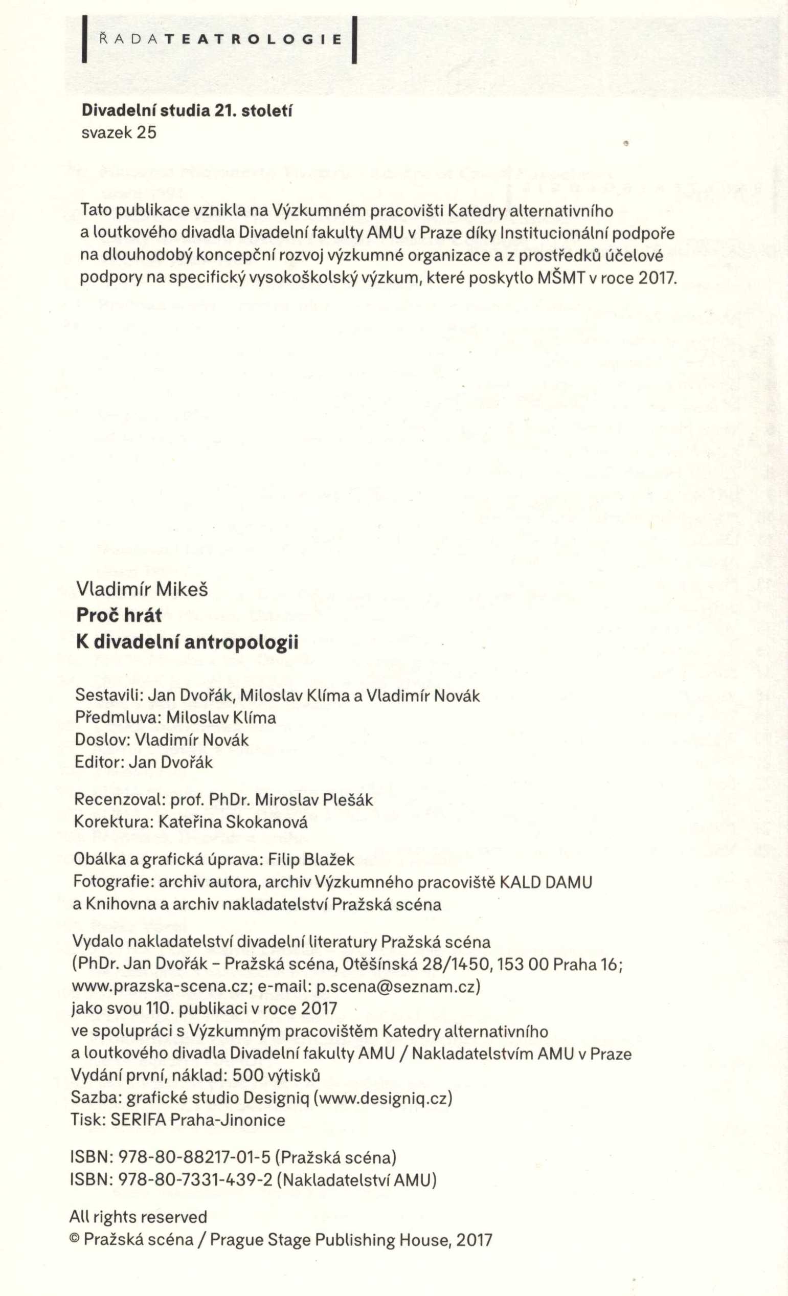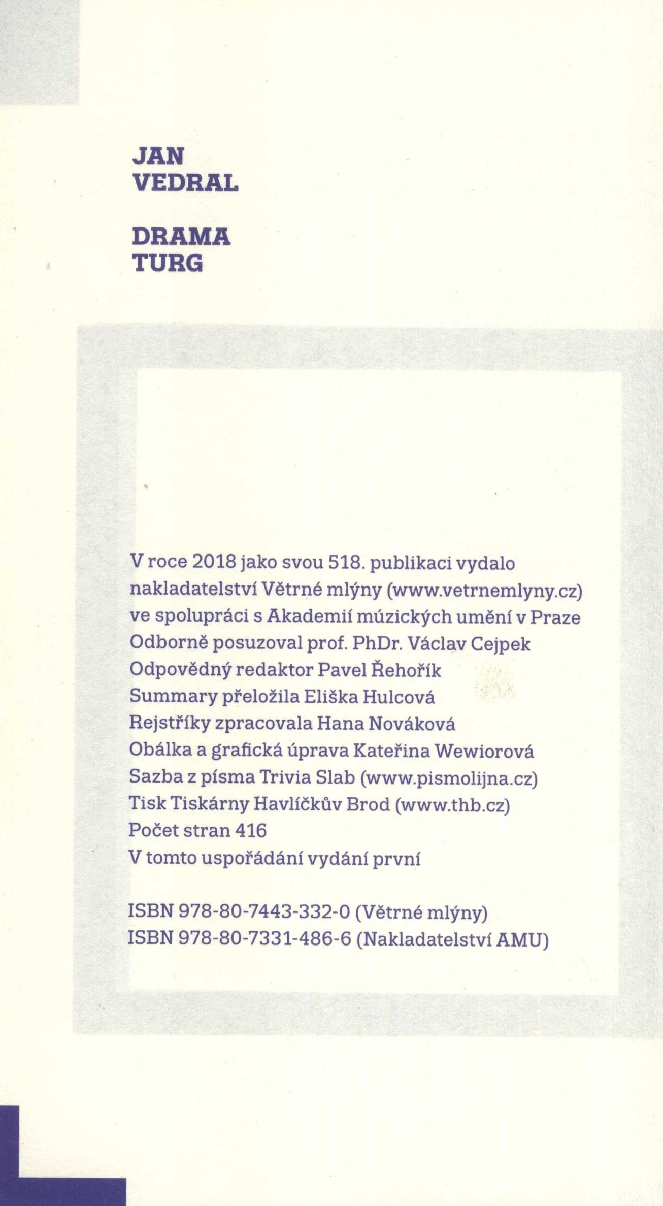 Názvové údaje Hagiografie a kulinárie besední : k 145 výročí Umělecké besedy / autoři textů Ilja Hurník a Václav Daněk ; autoři ilustrací Pravoslav Rada a Jaroslav Šerých ; obálka Rostislav Vaněk Osobní jméno Hurník, Ilja, 1922-2013 Hagiografie (Autor) Další autoři Daněk, Václav, 1929-2025 Kulinárie (Autor) Rada, Pravoslav, 1923-2011 (Ilustrátor) Šerých, Jaroslav, 1928-2014 (Ilustrátor) Vaněk, Rostislav, 1945- (Autor obálky) Korp. Umělecká beseda (spolek, Praha) (Nakladatel, vydavatel) Nakladatelství Akademie múzických umění (Tiskař) Nakladatel Praha : Umělecká beseda, 2008 Výrobce Nakladatelství AMU Rozsah 50 stran : ilustrace ; 21 cm Klíčová slova česká próza * krátké texty * kalendárium * křesťanské svátky * hagiografie * náměty * česká poezie * veršovaná próza * kuchařské recepty Počet ex. 1, z toho volných 1 Druh dok. monografie Signatura C12b 18493 Názvové údaje Proč hrát : k divadelní antropologii / Vladimír Mikeš ; editor Jan Dvořák ; předmluva Miroslav Klíma ; doslov Vladimír Novák Osobní jméno Mikeš, Vladimír, 1927- (Autor) Další autoři Dvořák, Jan, 1951- (Editor) Klíma, Miloslav, 1941- (Autor úvodu atd.) Novák, Vladimír, 1977- (Autor doslovu, tiráže atd.) Korp. Pražská scéna (nakladatelství) (Nakladatel, vydavatel) Nakladatelství Akademie múzických umění (Nakladatel, vydavatel) Serifa (tiskárna) (Tiskař) Nakladatel Praha : Pražská scéna ve spolupráci s Výzkumným pracovištěm katedry alternativního a loutkového divadla Divadelní fakulty AMU v Praze, Nakladatelstvím AMU, 2017 Výrobce SERIFA Rozsah 259 stran : portréty, faksimile ; 24 cm Klíčová slova divadlo * divadelní antropologie * herectví * literární tvorba * dramatická literatura * dramatická tvorba * světová literatura * próza * poezie * literární eseje * studie Počet ex. 1, z toho volných 1 Druh dok. monografie Signatura C12c 4947 Názvové údaje Dramaturg / Jan Vedral ; obálka a grafická úprava Kateřina Wewiorová Osobní jméno Vedral, Jan, 1955- (Autor) Další autoři Wewiorová, Kateřina, 1979- (Autor obálky) (Knižní grafik) Korp. Větrné mlýny (nakladatelství) (Nakladatel, vydavatel) Nakladatelství Akademie múzických umění (Nakladatel, vydavatel) Tiskárny Havlíčkův Brod (firma) (Tiskař) Nakladatel [Brno] : Větrné mlýny, 2018 Výrobce Havlíčkův Brod : Tiskárny Havlíčkův Brod Rozsah 413 stran ; 21 cm Klíčová slova česká literatura * výbor * divadlo * dramaturgie * studie * stati * eseje Počet ex. 1, z toho volných 1 Druh dok. monografie Signatura C12b 18952 Názvové údaje 5 1/2 scénáře Ester Krumbachové / Jan Bernard (ed.) ; autoři doprovodných textů: Jan Bernard, Kristýna Vaňková, Jan Krumbach ; ilustrace Arleta Němcová, Libuše Jarcovjáková, Jaromír Komárek ; grafická úprava a sazba bloku Robert Konopásek ; grafická úprava obálky Zdeněk Mareš Osobní jméno Krumbachová, Ester, 1923-1996 (Scénárista) Další autoři Bernard, Jan, 1948- (Editor) (Autor) Vaňková, Kristýna, 1993- (Autor) Krumbach, Jan (Autor) Němcová, Arleta, 2003- (Fotograf) Jarcovjáková, Libuše, 1952- (Fotograf) Komárek, Jaromír, 1933-2005 (Fotograf) Konopásek, Robert, 1969- (Knižní grafik) (Sazeč) Mareš, Zdeněk (Autor obálky) Fikejz, Miloš, 1959-2019 (Autor komentáře) Korp. Akademie múzických umění v Praze (Nakladatel, vydavatel) Nakladatelství Akademie múzických umění (Nakladatel, vydavatel) TNM PRINT s. r. o. (tiskárna) (Tiskař) Nakladatel V Praze : Akademie múzických umění v Nakladatelství AMU, 2021 Výrobce Nové Město : TNM Print Rozsah 542 stran : ilustrace, portréty, faksimile ; 25 cm Osobní hesla Krumbachová, Ester, 1923-1996 - filmová režisérka, scenáristka, kostýmní výtvarnice a scénografka Klíčová slova česká literatura * kolektivní monografie * film * televize * scenáristika * scénáře * bibliografie * filmografie * osobnosti * Krumbachová E. * Česko * stol. 20. Počet ex. 1, z toho volných 1 Druh dok. monografie Signatura LITc 0372 Názvové údaje Disk : časopis pro studium dramatického umění Další autoři Vostrý, Jaroslav, 1931- (Šéfredaktor, odpovědný redaktor) Radimecký, Martin, 1963- (Typograf) (Sazeč) Korp. Nakladatelství Akademie múzických umění (Nakladatel, vydavatel) Akademie múzických umění v Praze. Divadelní fakulta (Nakladatel, vydavatel) Roč., číslo Číslo 6, 2003 Nakladatel Praha : Nakladatelství AMU, 2003 Rozsah 186 stran : fotografie, portréty ; 24 cm Osobní hesla Scheinpflugová, Olga, 1902-1968 - herečka a spisovatelka * Haas, Hugo, 1901-1968 - herec a režisér Klíčová slova divadlo * divadelní herci * divadelní herečky * divadelní osobnosti * divadelní představení * divadelní inscenace * r. 2003 * odborný časopis Nadřízená jednotka Disk Počet ex. 1, z toho volných 1 Druh dok. PERIODIKA - Přijatá čísla Signatura Ad 0372