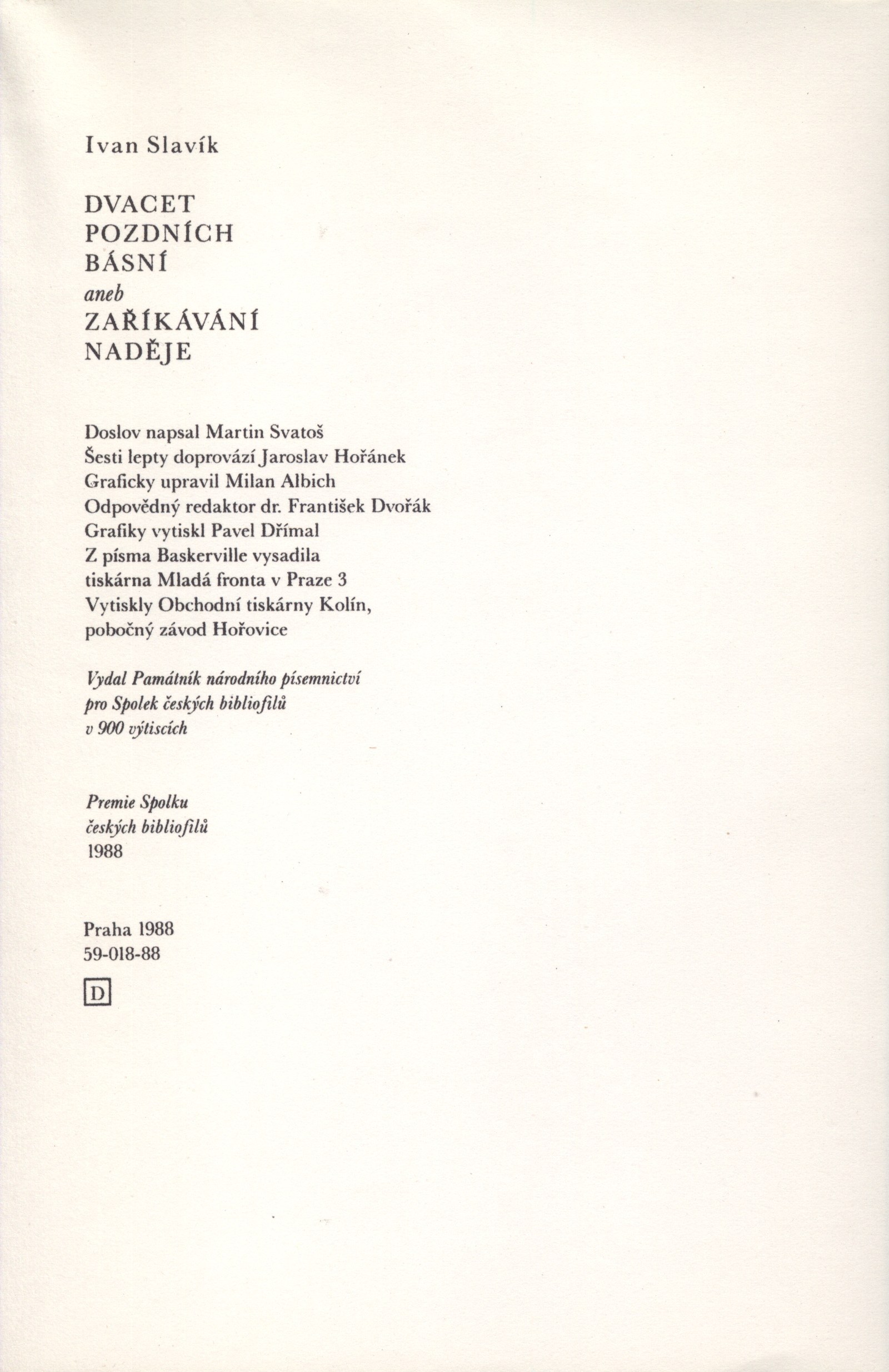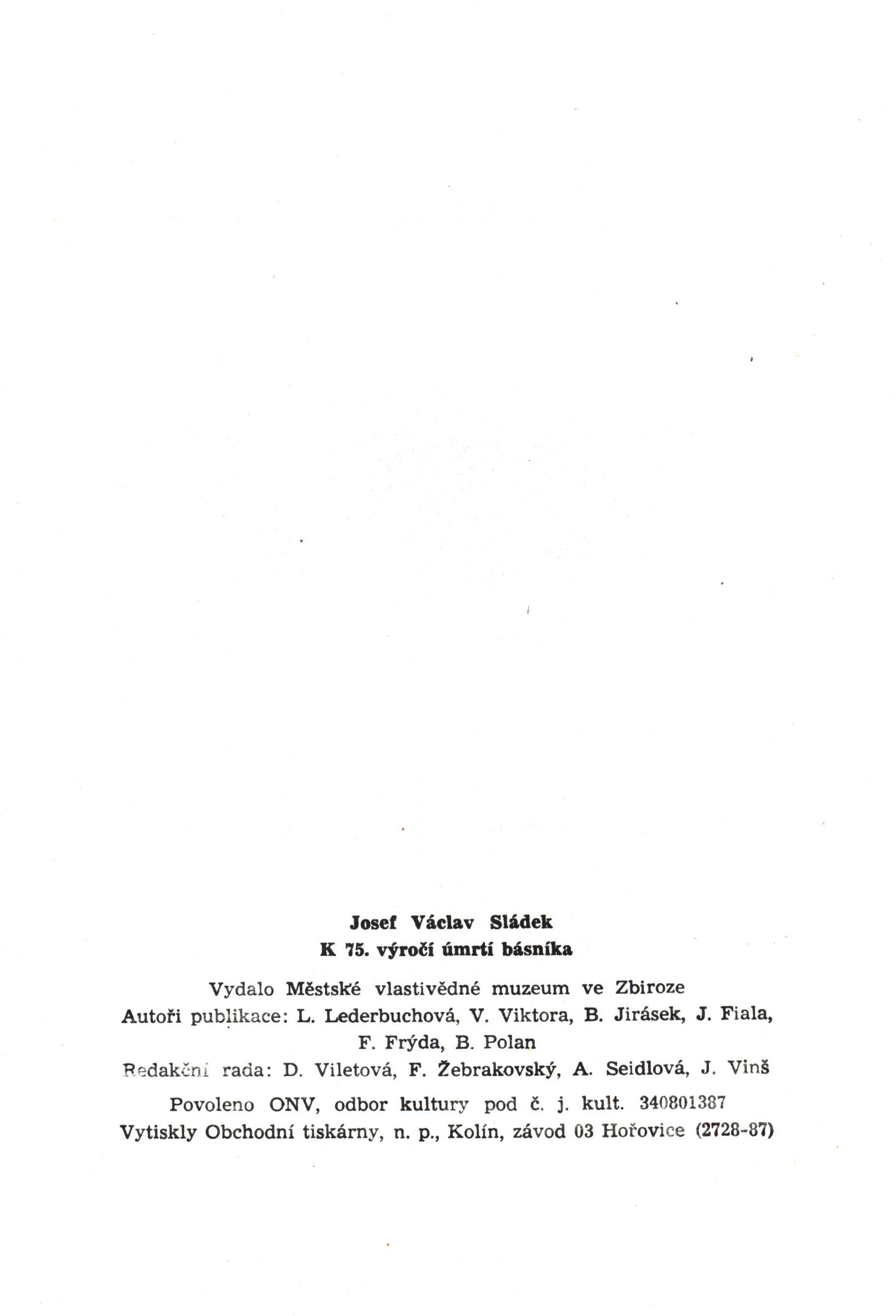 Názvové údaje Buď velebeno víno / Jan Goldhammer ; ilustroval V. Kafka Osobní jméno Goldhammer, Jan, 1910-1990 (Autor) Další autoři Jacák, Vladislav, 1927- (Typograf) (Autor obálky) Korp. Potravinářský obchod Praha (Nakladatel, vydavatel) Obchodní tiskárny Kolín (tiskárna) (Tiskař) Nakladatel Praha : Potravinařský obchod Praha, 1965 Výrobce Hořovice : Obchodní tiskárny, n. p., Kolín Rozsah 38 stran, 10 nečíslovaných stran ; 17 cm Klíčová slova víno * vinařství * propagační brožura Počet ex. 1, z toho volných 1 Druh dok. monografie Signatura C12a 5721 Názvové údaje Dvacet pozdních básní, aneb, Zaříkávání naděje / Ivan Slavík ; [doslov napsal Martin Svatoš ; šesti lepty doprovází Jaroslav Hořánek ; graficky upravil Milan Albich] Osobní jméno Slavík, Ivan, 1920-2002 (Autor) (Autor podpisu) Další autoři Svatoš, Martin, 1951- (Autor doslovu, tiráže atd.) Hořánek, Jaroslav, 1925-1995 (Ilustrátor) (Grafický technik) Albich, Milan, 1925-2000 (Knižní grafik) Korp. Spolek českých bibliofilů v Praze (Nakladatel, vydavatel) Památník národního písemnictví (muzeum literatury) (Nakladatel, vydavatel) Obchodní tiskárny Kolín (tiskárna) (Tiskař) Nakladatel Praha : vydal Památník národního písemnictví pro Spolek českých bibliofilů, 1988 Výrobce Obchodní tiskárny Kolín, pobočný závod) Rozsah 39 s. ; 22 cm Klíčová slova česká literatura * poezie * básně Počet ex. 1, z toho volných 1 Druh dok. monografie Signatura Topič 0032 Názvové údaje Dvě města na světě : cestopis o nacistickém Německu a Sovětském svazu, přepracovaný a rozšířený podle knih V zemi hákového kříže (Praha 1933) a Dvě města na světě (Praha 1935) / Géza Včelička Osobní jméno Včelička, Géza, 1901-1966 (Autor) Další autoři Mír - Družstevní práce (nakladatelství) (Nakladatel, vydavatel) Obchodní tiskárny Kolín (tiskárna) (Tiskař) Nakladatel Praha : Mír, 1950 Výrobce V Kolíně : Obchodní tiskárny, n. p. Rozsah 460 stran, 8 stran nečíslovaných obrazových příloh : mapy, fotografie ; 22 cm Klíčová slova cestopisy * reportáže z cest * reportážní fotografie * sovětské Rusko * německý fašismus Počet ex. 1, z toho volných 1 Druh dok. monografie Signatura P 74 A 53 Názvové údaje Jos. V. Sládek : 110. výročí narození Josefa Václava Sládka / úvodní stať Jaroslava Václavková ; kresby Járy Pika Další autoři Václavková, Jaroslava, 1905-1978 (Autor úvodu atd.) Pik, Jára, 1899-1978 (Ilustrátor) Korp. Památník národního písemnictví (muzeum literatury) (Nakladatel, vydavatel) Obchodní tiskárny Kolín (tiskárna) (Tiskař) Nakladatel V Praze : Památník národního písemnictví, 1955 Výrobce Kolín : Obchodní tiskárny Rozsah 19 stran : ilustrace ; 21 cm Osobní hesla Sládek, Josef Václav, 1845-1912 - básník a překladatel Geografické heslo Zbiroh (Česko) Klíčová slova česká literatura * čeští spisovatelé * čeští básníci * Sládek J. V. * život a dílo * Zbiroh * výročí narození Druh dok. monografie Signatura Branald 0282 Názvové údaje Josef Václav Sládek : k 75. výročí úmrtí básníka / autoři publikace: L. Lederbuchová, V. Viktora, B. Jirásek, J. Fiala, F. Frýda, B. Polan Osobní jméno Sládek, Josef Václav, 1845-1912 (Autor) Další autoři Lederbuchová, Ladislava, 1949- (Autor) Viktora, Viktor, 1942-2022 (Autor) Jirásek, Bohumil, 1931-2021 (Autor) Fiala, Jaroslav, 1929- (Autor) Frýda, František, 1946- (Autor) Polan, Bohumil, 1887-1971 (Autor) Korp. Městské vlastivědné muzeum ve Zbiroze (Nakladatel, vydavatel) Obchodní tiskárny Kolín (tiskárna) (Tiskař) Nakladatel Ve Zbiroze : Městské vlastivědné muzeum, 1987 Výrobce Hořovice : Obchodní tiskárny, n.p., Kolín, závod 03 Rozsah 20 stran (nečíslováno) : ilustrace, fotografie ; 21 cm Osobní hesla Sládek, Josef Václav, 1845-1912 Klíčová slova čeští básníci * literární historie * kulturní vlivy * sborníky * články * jubilejní publikace * jubilejní sborník * muzejní sbírky * regionální dějiny * regionální muzea Počet ex. 1, z toho volných 1 Druh dok. monografie Signatura LITb 01841 Názvové údaje Operativní plánování výroby v tiskárnách knih a časopisů / A. Ajzenberg ; podle 2. přepracovaného vydání přeložil Jaroslav Oliva ; předmluva k českému vydání Jan Adámek Osobní jméno Ajzenberg, Abram Zel'manovič (Autor) Další autoři Oliva, Jaroslav (Překladatel) Adámek, Jan (Autor úvodu atd.) Korp. Průmyslové nakladatelství (Nakladatel, vydavatel) Obchodní tiskárny Kolín (tiskárna) (Tiskař) Nakladatel Praha : Průmyslové vydavatelství, 1952 Výrobce Kolín : Obchodní tiskárny, n.p. Rozsah 147 stran Klíčová slova tiskárny * plánování * výroba Počet ex. 1, z toho volných 1 Druh dok. monografie Signatura M 24 e 43 Názvové údaje Praha poetická / sestavil M. Horyna ; verše vybral J. Šerých ; grafická úprava J. Ambož Další autoři Horyna, Mojmír, 1945-2011 (Sestavovatel, kompilátor) Šerých, Jiří, 1934-2019 (Sestavovatel, kompilátor) Ambrož, Jan (Knižní grafik) Korp. Panorama (nakladatelství) (Nakladatel, vydavatel) Obchodní tiskárny Kolín (tiskárna) (Tiskař) Nakladatel Praha : Panorama [1970] Výrobce Kolín : Obchodní tiskárny Kolín Rozsah 15 volných listů : ilustrace ; 21 cm Klíčová slova Praha * pražské památky * architektura * fotografické publikace Počet ex. 1, z toho volných 1 Druh dok. monografie Signatura BVolkova 0898