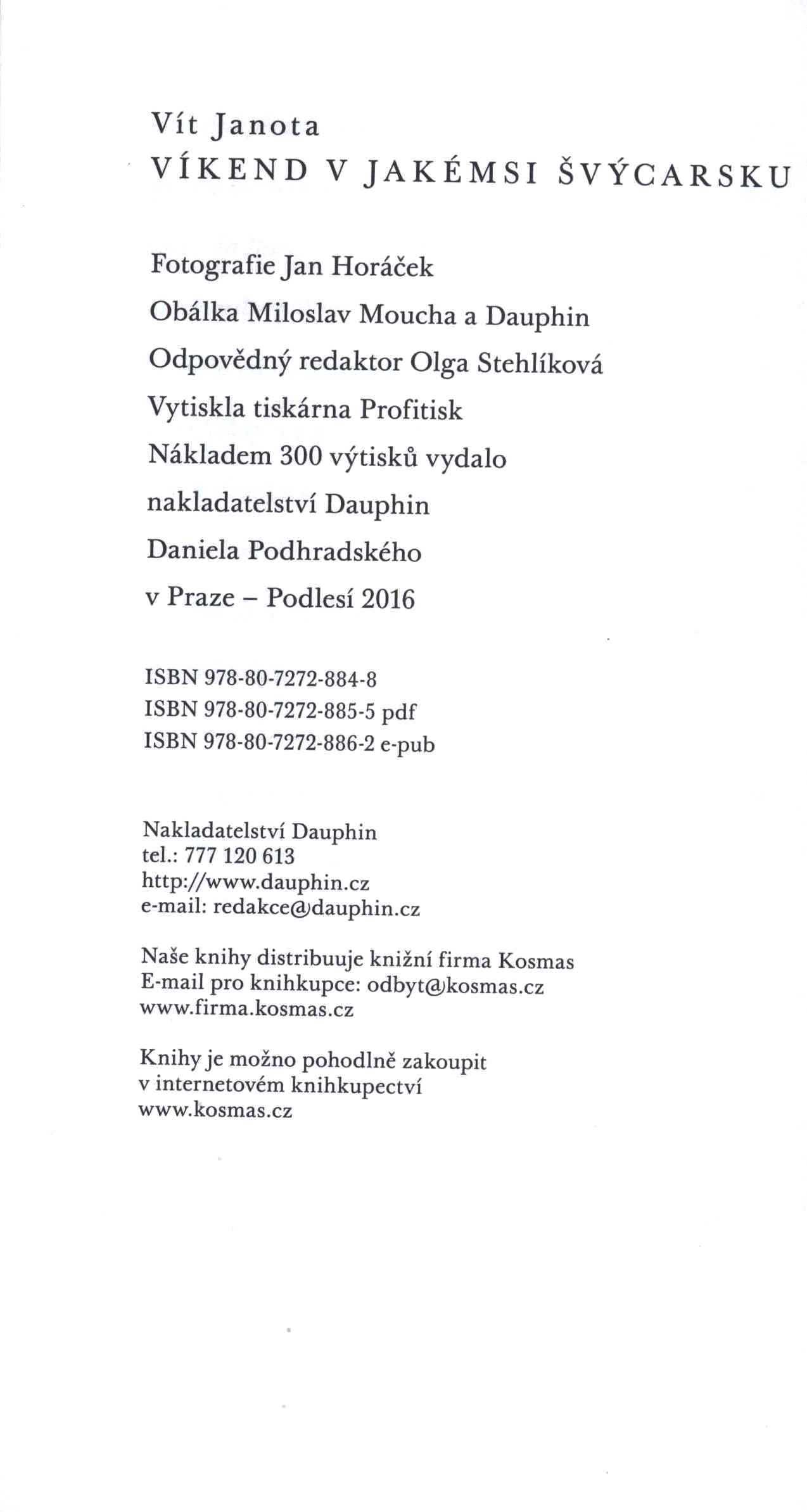 Názvové údaje Mona Lisa s rovnátky / Ondřej Abrahám ; fotografie autor ; grafická spolupráce Alžběta Kašinová Osobní jméno Abrahám, Ondřej, 1954-2025 (Autor) Další autoři Kašinová, Alžběta (Knižní grafik) Korp. Nakladatelství Dauphin (Nakladatel, vydavatel) Profitisk (tiskárna) (Tiskař) Nakladatel V Praze - Podlesí : Dauphin, 2018 Výrobce Profitisk Rozsah 308 stran : ilustrace ; 20 cm Klíčová slova česká próza * české povídky Počet ex. 1, z toho volných 1 Druh dok. monografie Signatura C12b 18621 Názvové údaje Zdeněk Rossmann : horizonty modernismu / editoři Marta Sylvestrová a Jindřich Toman ; grafická úprava Robert V. Novák Záhlaví-akce Horizonty modernismu: Zdeněk Rossmann (1905-1984) (2015 : Brno, Česko) Další autoři Sylvestrová, Marta, 1955- (Editor) Toman, Jindřich, 1944- (Editor) Novák, Robert V., 1962- (Knižní grafik) Korp. Moravská galerie (Brno, Česko) (Nakladatel, vydavatel) Profitisk (tiskárna) (Tiskař) Uměleckoprůmyslové muzeum (Brno, Česko) (Organizátor akce) Nakladatel Brno : Moravská galerie v Brně, 2015 Výrobce [Olomouc] : Profi-tisk group s.r.o. Rozsah 256 stran : ilustrace (převážně barevné), portréty, faksimile ; 29 cm Osobní hesla Rossmann, Zdeněk, 1905-1984 - architekt, typograf, scénograf, fotograf, pedagog Klíčová slova česká literatura * kolektivní monografie * obrazové publikace * moderní umění * výtvarné umění * fotografie * čeští výtvarní umělci * čeští architekti * čeští scénografové * čeští fotografové * Rossmann Z. * Česko * čeští architekti * stol. 20. * Nejkrásnější české knihy * r. 2015 Počet ex. 3, z toho volných 3 Druh dok. monografie Signatura C12d 2055, C12d 2056, NK/15 058 Názvové údaje Vniveč / Ivana Kašpárková ; fotografie na obálce Jan Horáček Osobní jméno Kašpárková, Ivana, 1983- (Autor) Další autoři Horáček, Jan, 1973- (Fotograf) Korp. Nakladatelství Dauphin (Nakladatel, vydavatel) Profitisk (tiskárna) (Tiskař) Nakladatel V Praze - Podlesí : Dauphin, 2018 Výrobce Profitisk, s.r.o. Rozsah 74 stran ; 20 cm Klíčová slova česká poezie * básně Počet ex. 1, z toho volných 1 Druh dok. monografie Signatura C12b 18658 Názvové údaje Romaneto / Vladimír Martinec ; fotografie na obálce Jan Horáček Osobní jméno Martinec, Vladimír, 1934- (Autor) Další autoři Horáček, Jan, 1973- (Fotograf) Korp. Nakladatelství Dauphin (Nakladatel, vydavatel) Profitisk (tiskárna) (Tiskař) Nakladatel V Praze - Podlesí : Dauphin, 2018 Výrobce Profitisk, s.r.o. Rozsah 187 stran ; 20 cm Klíčová slova česká poezie * milostná poezie * básně Počet ex. 1, z toho volných 1 Druh dok. monografie Signatura C12b 18623