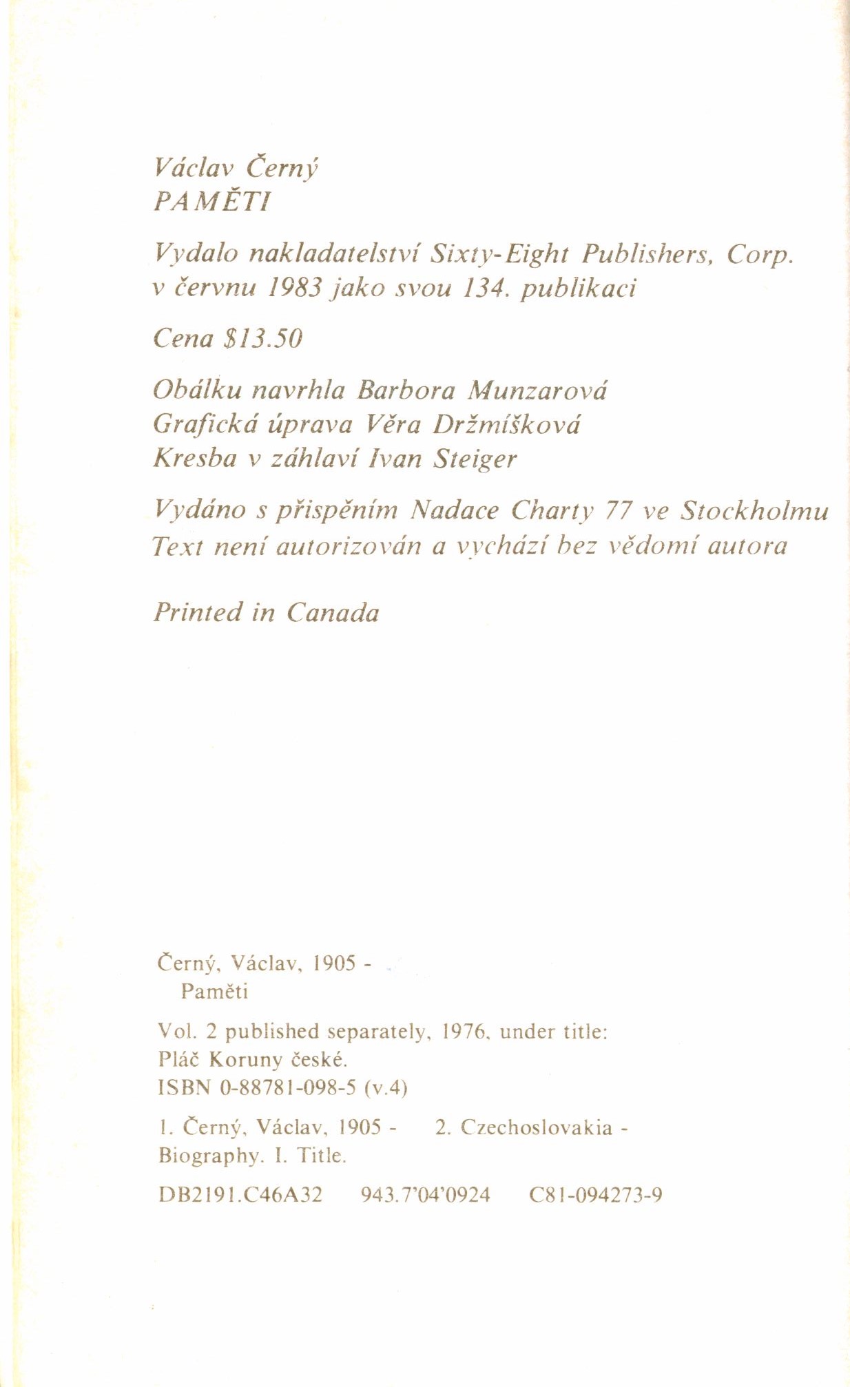 Názvové údaje Pláč koruny české / Václav Černý ; obálku s použitím vlastní malby navrhla Lucie Radová ; grafická úprava Věra Držmíšková ; kresba v záhlaví Ivan Steiger Osobní jméno Černý, Václav, 1905-1987 (Autor) Další autoři Radová, Lucie, 1931-2016 (Ilustrátor) Držmíšková, Věra, 1933-2025 (Grafický technik) Steiger, Ivan, 1939-2025 (Ilustrátor) Korp. Sixty-Eight Publishers (exilové nakladatelství) (Nakladatel, vydavatel) Nakladatel Toronto : Sixty-Eight Publishers, 1977 Rozsah 516 stran ; 18 cm Osobní hesla Držmíšková, Věra, 1933-2025 - grafička, výtvarnice * Salivarová, Zdena, 1933-2025 - prozaička a překladatelka Klíčová slova česká literatura * exilová literatura * dějiny * Československo * 2. světová válka * r. 1939-1945 Počet ex. 2, z toho volných 2 Druh dok. monografie Signatura C12a 1527, JVladislav 468 Názvové údaje Zpráva o smrti Růžového Kavalíra / Jan Drábek ; [grafická úprava Věra Držmíšková ; obálka Barbora Munzarová] Osobní jméno Drábek, Jan, 1935- (Autor) Další autoři Držmíšková, Věra, 1933-2025 (Knižní grafik) Munzarová, Barbora (Autor obálky) Korp. Sixty-Eight Publishers (exilové nakladatelství) (Nakladatel, vydavatel) Nakladatel Toronto : Sixty-Eight Publishers, 1977 Rozsah 250 s. Klíčová slova česká literatura * exilová literatura * exilová próza * špionážní román Počet ex. 2, z toho volných 2 Druh dok. monografie Signatura M 197 d 9, M 214 g 5 Názvové údaje Poskvrněné početí / Ota Filip ; obálku s použitím obrazu Jana Brychty navrhl a grafickou úpravu knihy provedl Mikuláš Kravjanský ; kresba v záhlaví Ivan Steiger Osobní jméno Filip, Ota, 1930-2018 (Autor) Další autoři Kravjanský, Mikuláš, 1928- (Autor obálky) (Knižní grafik) Brychta, Jan, 1928-2013 (Ilustrátor) Steiger, Ivan, 1939-2025 (Ilustrátor) Korp. Sixty-Eight Publishers (exilové nakladatelství) (Nakladatel, vydavatel) Nakladatel Toronto : Sixty-Eight Publishers, 1976 Rozsah 211 stran ; 18 cm Klíčová slova česká literatura * exilová literatura * próza * román * stol. 20., léta 70. Počet ex. 2, z toho volných 2 Druh dok. monografie Signatura C12a 1529, BVolkova 1571 Názvové údaje Valdštýn a Lukrecie / Ota Filip ; obálku s použitím fotografie Heleny Pospíšilové-Wilson navrhla Barbora Munzarová ; kresba v záhlaví Ivan Steiger ; grafická úprava Věra Držmíšková Osobní jméno Filip, Ota, 1930-2018 (Autor) Další autoři Munzarová, Barbora (Autor obálky) Steiger, Ivan, 1939-2025 (Ilustrátor) Držmíšková, Věra, 1933-2025 (Knižní grafik) Korp. Sixty-Eight Publishers (exilové nakladatelství) (Nakladatel, vydavatel) Nakladatel Toronto : Sixty-Eight Publishers, 1978 Rozsah 169 stran ; 18 cm Osobní hesla z Valdštejna, Albrecht, vévoda, 1583-1634 - šlechtic a vojevůdce Klíčová slova česká literatura * česká próza * historická novela Počet ex. 1, z toho volných 1 Druh dok. monografie Signatura BVolkova 1535