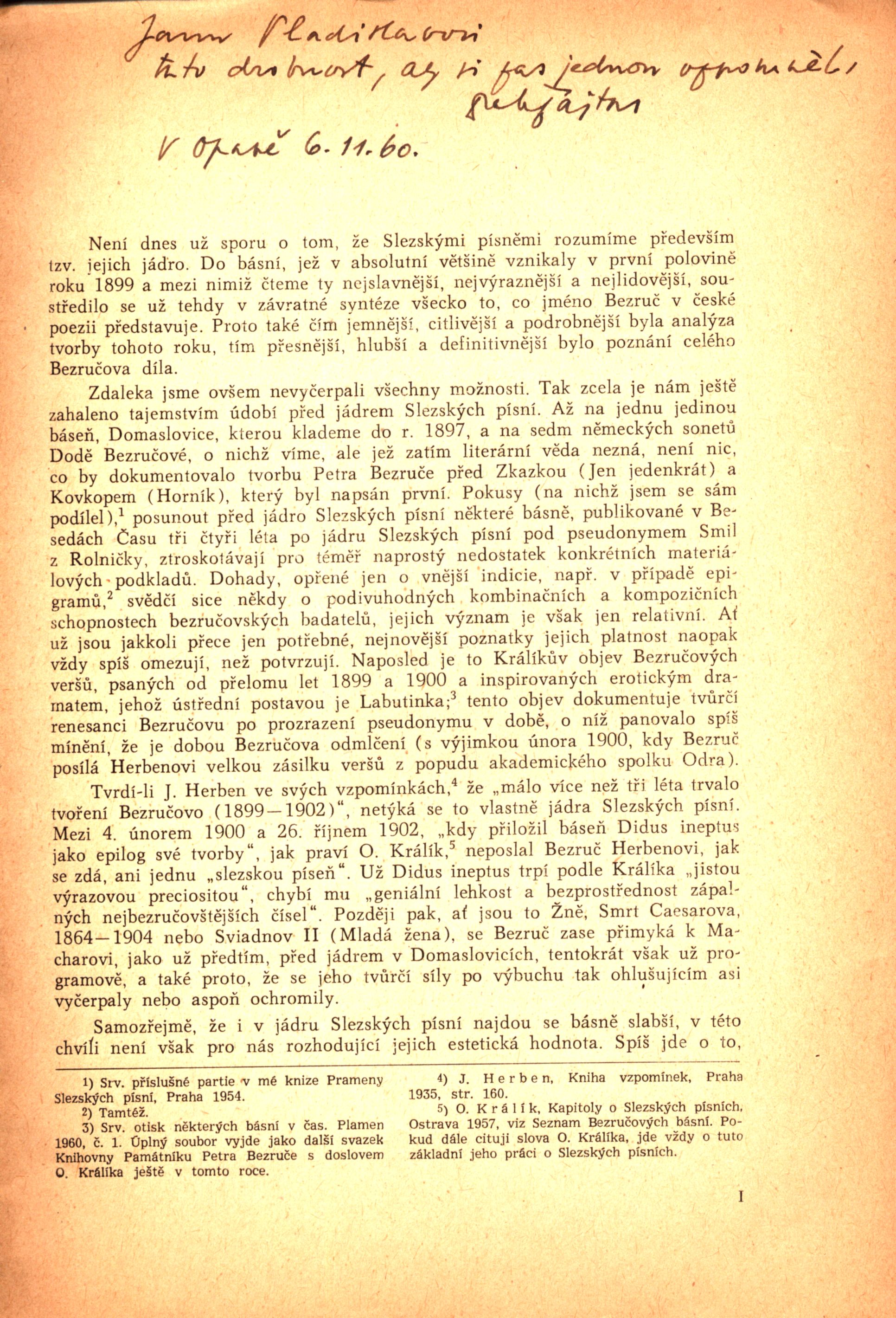 Názvové údaje Zelené klenoty : zámecké parky na Hlučínsku a Opavsku / Josef Duda, Fr. Krkavec Osobní jméno Duda, Josef, 1925-2012 (Autor) Další autoři Krkavec, František, 1922-1986 (Autor) Korp. Slezské muzeum (Opava, Česko) (Nakladatel, vydavatel) Slezský studijní ústav (Československá akademie věd) (Nakladatel, vydavatel) Krajské nakladatelství Ostrava (Nakladatel, vydavatel) Nakladatel Ostrava : Krajské nakladatelství, 1959 Výrobce MTZ) Rozsah 165, [4] s. : [22] mp., 6 barev. obr. příl., [4] barev. fot. příl. [64] s. fot. příl. ; 8° Klíčová slova zámecké parky * botanika * dendrologie * dřeviny * Opavsko * Slezsko * přehledy Počet ex. 1, z toho volných 1 Druh dok. monografie Signatura J Z II 34 Názvové údaje Bibliografie numismatické literatury o Slezsku a Kladsku / Jaromír Kalus Osobní jméno Kalus, Jaromír, 1911-1999 (Autor) Další autoři Slezské muzeum (Opava, Česko) (Nakladatel, vydavatel) Moravské tiskařské závody (Tiskař) Nakladatel Opava : Slezské museum, 1958 Výrobce (Mor. tisk. záv. 25) Rozsah 58 s. ; 8° Klíčová slova numismatika * regionální bibliografie Počet ex. 1, z toho volných 1 Druh dok. monografie Signatura M 76 b 108 Názvové údaje Památník Petra Bezruče, Opava. Srub Petra Bezruče, Ostravice : průvodce / autorka textu Martina Klézlová ; redakce textu a produkce Simona Juračková ; autoři fotografií Luděk Wünsch, Archiv SZM Osobní jméno Klézlová, Martina, 1984- (Autor) Další autoři Klézlová, Martina, 1984- Památník Petra Bezruče, Opava Juračková, Simona, 1977- (Redaktor, výkonný redaktor) Wünsch, Luděk (Fotograf) Korp. Slezské muzeum (Opava, Česko) (Nakladatel, vydavatel) Retis Group, s.r.o. (tiskárna, vydavatelství) (Tiskař) Nakladatel [Opava] : Slezské zemské muzeum, 2012 Výrobce Retis Group, s.r.o. Rozsah 23 stran : ilustrace (převážně barevné), mapy, portréty, faksimile ; 22 cm Osobní hesla Bezruč, Petr, 1867-1958 - básník Heslo korporace (zkrác. heslo korp.) : Památník Petra Bezruče (Opava, Česko) * Srub Petra Bezruče (Ostravice, Česko) Geografické heslo Opava (Česko) * Ostravice (Česko) Klíčová slova čeští básníci * stol. 19.-20. * stálá expozice * Česko * průvodce * průvodce expozicí * informační publikace Počet ex. 1, z toho volných 1 Druh dok. monografie Signatura C12b 18895 Názvové údaje Časopis Slezského muzea. Série B, Vědy historické Záhlaví-korpor. Slezské muzeum (Opava, Česko) (pbl (Opava, Česko)) Další autoři Plaček, Vilém, 1928-2020 (Editor) Roč., číslo ročník 27, číslo 1-2, 1978 Nakladatel Opava : Slezské muzeum, 1978 Rozsah il., faksim. Klíčová slova historie * archivnictví * pomocné vědy historické * studie * zprávy * recenze * muzejní časopis Nadřízená jednotka Časopis Slezského muzea Počet ex. 1, z toho volných 1 Druh dok. PERIODIKA - Svázaný ročník periodika Signatura O 14 D 44 Názvové údaje Arnošt Rychlý a jeho bezručovské inspirace : 1901-1987 / Karel Boženek ; fotografie Luděk Wünsch, Emanuel Křenek, Merita Haverlantová ; fotodokumentace Slezské muzeum v Opavě Osobní jméno Boženek, Karel, 1938-2022 (Autor) Další autoři Wünsch, Luděk (Fotograf) Křenek, Emanuel, 1932-2016 (Fotograf) Haverlantová, Merita, 1950- (Fotograf) Korp. Slezské muzeum (Opava, Česko) (Fotograf) Opava (Česko). Magistrát (Nakladatel, vydavatel) Retis, s.r.o. (tiskárna) (Tiskař) Nakladatel Opava : Statutární město Opava, [2008] Výrobce [Krnov] : Retris, s.r.o. Copyright ©2008 Rozsah 143 stran : ilustrace, portréty, noty, faksimile ; 31 cm + 1 CD Osobní hesla Rychlý, Arnošt, 1901-1987 - hudební pedagog a skladatel, práce z oboru Geografické heslo Opava (Česko) Klíčová slova hudba * pedagogové * hudební skladatelé * hudební život * Česko * stol. 20. * biografie * monografie * stol. 20. Počet ex. 1, z toho volných 1 Druh dok. monografie Signatura LITd 0047 Názvové údaje Bibliografie prací 1945-1967 / Slezské muzeum v Opavě ; uspořádl Eustach Bittner Další autoři Bittner, Eustach, 1912-2001 (Sestavovatel, kompilátor) Korp. Slezské muzeum (Opava, Česko) (Nakladatel, vydavatel) Nakladatel Opava : Slezské muzeum, 1968 Výrobce MTZ 25 Rozsah 31 stran Heslo korporace (zkrác. heslo korp.) : Slezské muzeum (Opava, Česko) Klíčová slova muzea * muzeologická literatura * bibliografie * publikace * r. 1945-1967 Počet ex. 3, z toho volných 3 Druh dok. monografie Signatura R XXIII f 10, R XXXI f 67, R IV e 44 Názvové údaje Časopis Slezského muzea. Série B, Vědy historické Další autoři Slezské muzeum (Opava, Česko) (pbl (Opava, Česko)) Nakladatel Opava : Slezské muzeum, [1951]-1990 Rozsah sv. Klíčová slova historie * dějiny umění * dějiny literatury * muzejnictví * studie * zprávy * Slezsko * muzejní časopis Druh dok. PERIODIKA - Souborný záznam periodika Odkazy (1) - PERIODIKA - Souborný záznam periodika (1) - PERIODIKA - Svázaný ročník periodika Názvové údaje Fragmenty "Slezských písní" / Drahomír Šajtar Osobní jméno Šajtar, Drahomír, 1922-2009 (Autor) (Dedikátor) Další autoři Vladislav, Jan, 1923-2009 (Dedikant) Korp. Slezské muzeum (Opava, Česko) (Nakladatel, vydavatel) Moravské tiskařské závody (Tiskař) Nakladatel [Opava : Slezské muzeum Opava, 1960] Výrobce Ostrava : Moravské tiskařské závody Rozsah XI stran ; 25 cm Osobní hesla Bezruč, Petr, 1867-1958 Klíčová slova literární historie * poezie * separáty Počet ex. 1, z toho volných 1 Druh dok. separáty Signatura JVladislav 1079 Názvové údaje Listy Památníku Petra Bezruče. Nová řada Další autoři Urbanec, Jiří, 1932-2014 (Šéfredaktor, odpovědný redaktor) Korp. Slezské muzeum (Opava, Česko) (Nakladatel, vydavatel) Moravské tiskařské závody (Tiskař) Roč., číslo Číslo 9-11, 1962 Nakladatel V Opavě : Slezské muzeum, 1962 Výrobce Opava : Moravské tiskařské závody, n. 