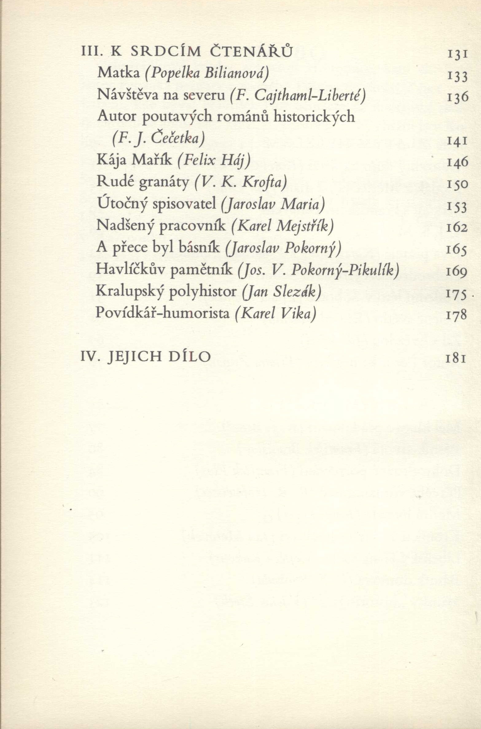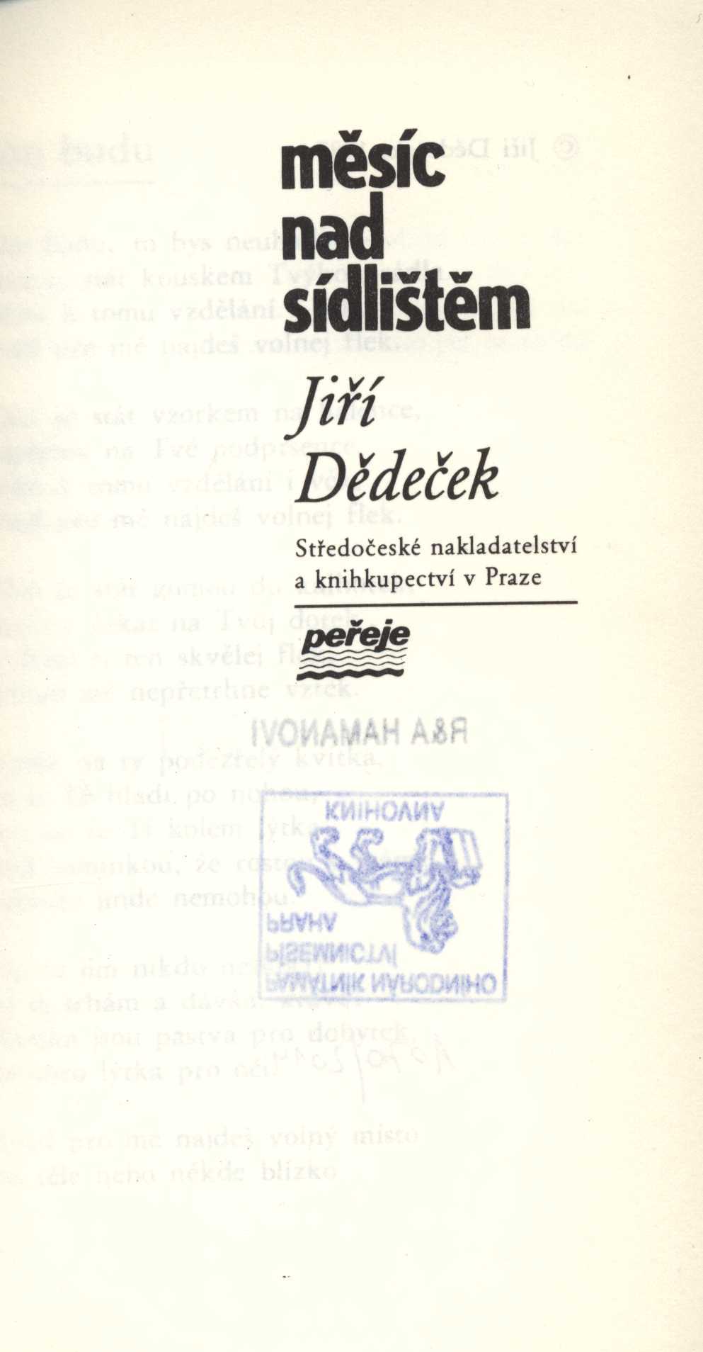 Názvové údaje Středočeským krajem / Mikoláš Aleš ; obrázky vybral, uspořádal a výroky Mikoláše Alše i doslovem opatřil Karel Cvejn Osobní jméno Aleš, Mikoláš, 1852-1913 (Autor) Další autoři Cvejn, Karel, 1911-1986 (Sestavovatel, kompilátor) Korp. Středočeské nakladatelství a knihkupectví (Nakladatel, vydavatel) Nakladatel Praha : Středočeské nakladatelství a knihkupectví, [1970?] Rozsah 8 nečíslovaných volných listů : 1 příloha Klíčová slova čeští malíři * kresby * středočeský kraj * Příbram * umělecké náměty * novoroční tisk Počet ex. 2, z toho volných 2 Druh dok. monografie Signatura M 156 g 8, M 177 b 112 Názvové údaje Kutnohorsko / [text:] Marie Kapavíková a kol. ; fot.: Karel Klement, Otakar Matoušek Osobní jméno Bisingerová, Marie, 1944- (Autor) Další autoři Klement, Karel (Fotograf) Matoušek, Otakar, 1938-2008 (Fotograf) Korp. Středočeské nakladatelství a knihkupectví (Nakladatel, vydavatel) Nakladatel Praha : Středočeské nakladatelství a knihkupectví, 1978 Výrobce SG 01) Rozsah 32, [10] s., [64] s. obr. příl. : il. ; 4° Klíčová slova Kutnohorsko * obrazová publikace Počet ex. 1, z toho volných 1 Druh dok. monografie Signatura P III 168 Názvové údaje Gazely a kola / Václav Daněk ; [ilustrace Jaroslav Šerých ; typografie Hana Blažejová] Osobní jméno Daněk, Václav, 1929-2025 (Autor) Další autoři Šerých, Jaroslav, 1928-2014 (Ilustrátor) Blažejová, Hana, 1937- (Typograf) Korp. Středočeské nakladatelství a knihkupectví (Nakladatel, vydavatel) Severografia Liberec (tiskárna) (Tiskař) Nakladatel Praha : Středočeské nakladatelství a knihkupectví, 1989 Výrobce Severografia) Rozsah 133 s. : il. Osobní hesla Daněk, Václav, 1929-2025 - básník, překladatel, editor, rozhlasový pracovník Klíčová slova česká literatura * česká poezie * sbírka básní Počet ex. 1, z toho volných 1 Druh dok. monografie Signatura RSzpuk 0817 Názvové údaje Měsíc nad sídlištěm / Jiří Dědeček ; [typografie Pavla Šubrtová] Osobní jméno Dědeček, Jiří, 1953- (Autor) Další autoři Šubrtová, Pavla (Typograf) Korp. Středočeské nakladatelství a knihkupectví (Nakladatel, vydavatel) Východočeské tiskárny (Tiskař) Nakladatel V Praze : Středočeské nakladatelství a knihkupectví, 1987 Výrobce Východočeské tiskárny) Rozsah 115 s. ; 17 cm Klíčová slova česká literatura * poezie * básně Počet ex. 1, z toho volných 1 Druh dok. monografie Signatura R&AHamanovi 0689 Názvové údaje Oběžník / Jiří Dědeček ; [kresba na obálce Jiří Jirásek ; typografie Vlasta Herrmannová] Osobní jméno Dědeček, Jiří, 1953- (Autor) Další autoři Jirásek, Jiří, 1932- (Autor obálky) Herrmannová, Vlasta (Typograf) Korp. Středočeské nakladatelství a knihkupectví (Nakladatel, vydavatel) Východočeské tiskárny (Havlíčkův Brod) (Tiskař) Nakladatel München : Středočeské nakladatelství a knihkupectví, 1990 Výrobce Východočeské tiskárny) Rozsah 77 s. Klíčová slova česká literatura * poezie * próza * básně * krátké texty * exilová literatura * stol. 20., léta 80. Počet ex. 1, z toho volných 1 Druh dok. monografie Signatura R&AHamanovi 0690 Názvové údaje Posázaví = Dolina reki Sazavy = Region am Sázava-Fluss = Along the Sázava River = Región del río Sázava : [fotografická publikace] / Ivan a Jiří Doležalovi ; textem doprovodil Evžen Veselý ; [obálka, vazba a předsádky Vladimír Jansta] Osobní jméno Doležal, Ivan, 1950- (Autor) (Fotograf) Další autoři Doležal, Jiří, 1921- (Autor) (Fotograf) Veselý, Evžen (Autor) Jansta, Vladimír (Autor obálky) (Knižní grafik) Korp. Středočeské nakladatelství a knihkupectví (Nakladatel, vydavatel) Nakladatel Praha : Středočeské nakladatelství a knihkupectví, 1982 Výrobce SG 1) Rozsah 181 s. : il. ; 26 cm Klíčová slova Posázaví * fotografické publikace Počet ex. 1, z toho volných 1 Druh dok. monografie Signatura P III 284 Názvové údaje Dobrodružství Jaroslava Seiferta : a jiné vzpomínky na známé i méně známé spisovatele / František Hampl Osobní jméno Hampl, František, 1901-1977 (Autor) (Autor úvodu atd.) (Autor komentáře) Další autoři Lisý, Pavel, 1912-1990 (Ilustrátor) Šimanovský, František (Autor obálky) (Výtvarník vazby) (Typograf) Korp. Středočeské nakladatelství a knihkupectví (Nakladatel, vydavatel) Svoboda (tiskárna) (Tiskař) Nakladatel Praha : Středočeské nakladatelství a knihkupectví, [1969] Výrobce Praha : Svoboda, grafické závody, n. p. Copyright ©1969 Rozsah 199 stran : ilustrace ; 21 cm Osobní hesla Hampl, František, 1901-1977 - prozaik, básník, redaktor beletrie, novinové kritiky Klíčová slova česká literatura * Hampl F. * vzpomínky * příběhy * čeští spisovatelé * stol. 19.-20. Počet ex. 5, z toho volných 6 Druh dok. monografie Signatura C12b 4375, LK P 122 a 49, LK P 136 a 37, LK Janeček 207, Branald 0594, VZinková 0616 Názvové údaje Bohemus : památce Václava Hollara (1607-1677) / Jaromír Hořec ; [grafické listy Václav Hollar ; typografie Jarmila Mašková] Osobní jméno Hořec, Jaromír, 1921-2009 (Autor) Další autoři Hollar, Václav, 1607-1677 (Ilustrátor) Hořec, Jaromír, 1921-2009 (Dedikátor) Mašková, Jarmila (Typograf) Vacík, Miloš, 1922-1999 (Dedikant) Korp. Středočeské nakladatelství a knihkupectví (Nakladatel, vydavatel) Tiskárny Havlíčkův Brod (firma) (Tiskař) Nakladatel Praha : Středočeské nakladatelství a knihkupectví, 1991 Výrobce Tiskárny) Rozsah 78 s. : il Klíčová slova poezie * básně * česká literatura Počet ex. 3, z toho volných 3 Druh dok. monografie Signatura M 216 f 85, C12a 1722, R&AHamanovi 0675 Názvové údaje Podivné souvislosti / Jaroslav Kalát ; ilustrace Miloš Kánský Osobní jméno Kalát, Jaroslav, 1925-2008 (Autor) Další autoři Kánský, Miloš, (Ilustrátor) 1945-