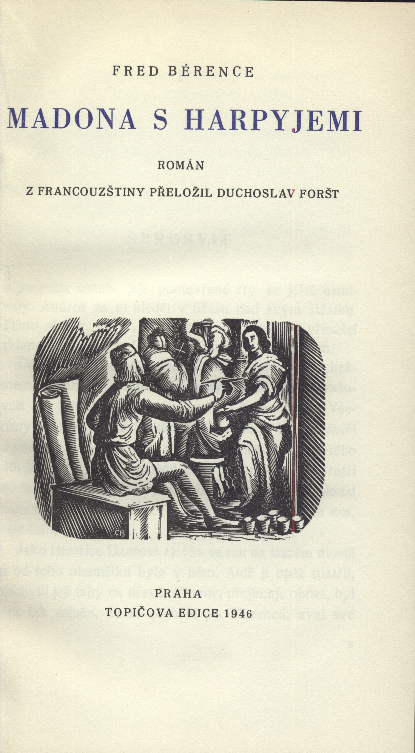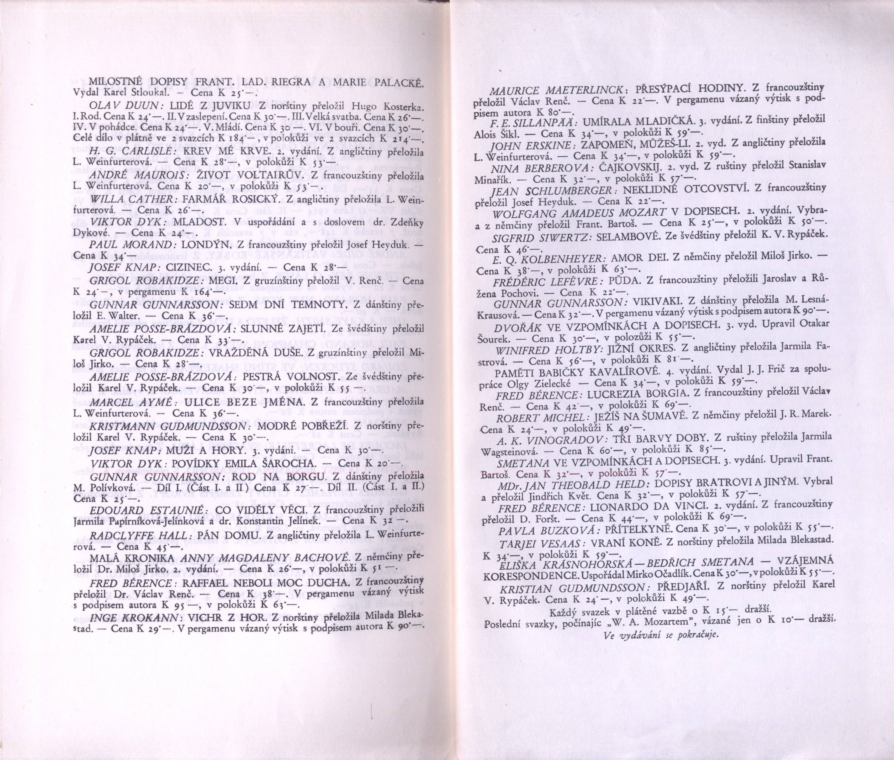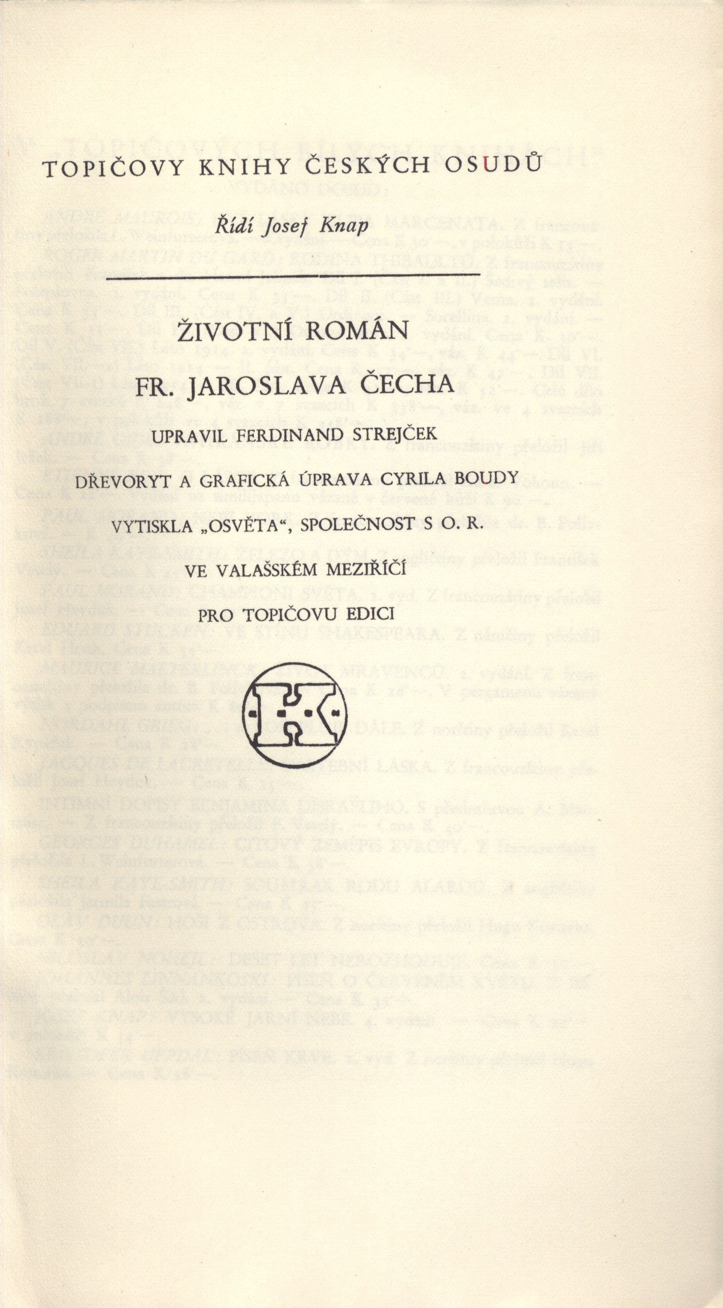 Názvové údaje Akty / Mikoláš Aleš ; vybral a úvodní slovo napsal Emanuel Svoboda ; graficky upravil Cyril Bouda Osobní jméno Aleš, Mikoláš, 1852-1913 (Umělec) (Ilustrátor) Další autoři Svoboda, Emanuel, 1883-1967 (Sestavovatel, kompilátor) (Autor doslovu, tiráže atd.) Bouda, Cyril, 1901-1984 (Knižní grafik) Korp. Topičova edice (nakladatelství) (Nakladatel, vydavatel) Družstvo knihtiskárny (tiskárna, Hranice, Přerov) (Tiskař) Nakladatel V Praze : Topičova edice, 1942 Výrobce V Hranicích : Družstvo knihtiskárny Rozsah xliv, 189 srean : ilustrace ; 24 cm Osobní hesla Aleš, Mikoláš, 1852-1913 - malíř, kreslíř a ilustrátor Klíčová slova české výtvarné umění * Aleš M. * akty * obrazové publikace Počet ex. 2, z toho volných 2 Druh dok. monografie Signatura Topič 0684, Knytl 1834 Názvové údaje Všehochuť : knížka veselých obrázků / nakreslil Mikoláš Aleš ; srovnal a slovem doprovodil Adolf Wenig Osobní jméno Aleš, Mikoláš, 1852-1913 (Ilustrátor) Další autoři Wenig, Adolf, 1874-1940 (Sestavovatel, kompilátor) (Autor) Korp. Topičova edice (nakladatelství) (Nakladatel, vydavatel) Českoslovanská akciová tiskárna (Tiskař) Nakladatel V Praze : Topičova edice, 1939 Výrobce Českoslovanská akciová tiskárna Rozsah 81 stran : ilustrace Klíčová slova česká próza * příběhy Počet ex. 1, z toho volných 1 Druh dok. monografie Signatura P 78 a 67 Názvové údaje Památník z Beethovenových slov / [uspořádal] Richard Benz ; [z němčiny] přeložil Antonín Němec ; obálka a grafická úprava Cyrila Boudy] Osobní jméno Beethoven, Ludwig van, 1770-1827 (Umělec) Další autoři Benz, Richard, 1884-1966 (Sestavovatel, kompilátor) Němec, Antonín, 1894-1958 (Překladatel) Bouda, Cyril, 1901-1984 (Autor obálky) (Knižní grafik) Korp. Topičova edice (nakladatelství) (Nakladatel, vydavatel) Müller a spol. (tiskárna) (Tiskař) Nakladatel V Praze : Topičova edice, 1941 Výrobce knihtiskárna Müller a spol.) Rozsah 80 s. ; 20 cm Osobní hesla Beethoven, Ludwig van, 1770-1827 - německý skladatel Klíčová slova hudebníci * němečtí umělci * Beethoven L. van * autobiografický text * překlad Počet ex. 1, z toho volných 1 Druh dok. monografie Signatura Topič 0335 Názvové údaje Vlastní životopis jejž pro své děti a potomky roku 1763 napsal František Benda královský pruský koncertní mistr / přeložil a vysvětlivkami opatřil Jaroslav Čeleda Osobní jméno Benda, František, 1709-1786 (Autor) Další autoři Čeleda, Jaroslav, 1890-1974 (Překladatel) (Autor úvodu atd.) Korp. Topičova edice (nakladatelství) (Nakladatel, vydavatel) Osvěta (tiskárna) (Tiskař) Nakladatel V Praze : Topičova edice, 1939 Výrobce Osvěta) Rozsah 63 s., [8] l. obr. příl. : il. Osobní hesla Benda, František, 1709-1786 - houslový virtuos, skladatel, pruský koncertní mistr, pedagog Klíčová slova česká literatura * německy psaná literatura * životopis * česká hudba * čeští hudebníci * České království * Prusko * Německo * stol. 18. Počet ex. 2, z toho volných 2 Druh dok. monografie Signatura Leschinger 178, KaG XLV D 34 Názvové údaje Čajkovskij / Nina Berberova ; z ruštiny přeložil Stanislav Minařík ; [dřevoryt a grafická úprava Cyrila Boudy] Osobní jméno Berberova, Nina Nikolajevna, 1901-1993 (Autor) Další autoři Minařík, Stanislav, 1884-1944 (Překladatel) Bouda, Cyril, 1901-1984 (Ilustrátor) (Knižní grafik) Korp. Topičova edice (nakladatelství) (Nakladatel, vydavatel) Osvěta (tiskárna) (Tiskař) Nakladatel V Praze : Topičova edice, 1937 Výrobce Osvěta, společnost s o. r.) Rozsah 261 s. : il. ; 23 cm Osobní hesla Čajkovskij, Petr Il‘jič, 1840-1893 - ruský skladatel, hudební kritik, teoretik a dirigent Klíčová slova ruská literatura * překlad * próza * román * životopisný román * Čajkovskij P. I. Počet ex. 1, z toho volných 1 Druh dok. monografie Signatura Topič 0195 Názvové údaje Lionardo da Vinci, dělník rozumu / Fred Bérence ; z francouzštiny přeložil Duchoslav Foršt ; [dřevoryt a grafická úprava Cyrila Boudy] Osobní jméno Bérence, Fred, 1889-1977 (Autor) Další autoři Foršt, Duchoslav, 1901-1983 (Překladatel) Bouda, Cyril, 1901-1984 (Ilustrátor) (Knižní grafik) Korp. Topičova edice (nakladatelství) (Nakladatel, vydavatel) Osvěta (tiskárna) (Tiskař) Nakladatel V Praze : Topičova edice, 1939 Výrobce Osvěta, společnost s o. r.) Rozsah 369 s., [2] l. obr. příl. : il. ; 22 cm Osobní hesla Leonardo, da Vinci, 1452-1519 - italský malíř, sochař, architekt a vědec Klíčová slova francouzská literatura * próza * překlad * monografie * biografie * Leonardo da Vinci * italské malířství * obrazové přílohy Počet ex. 1, z toho volných 1 Druh dok. monografie Signatura Topič 0101 Názvové údaje Lucrezia Borgia / Fred Bérence ; z francouzštiny přeložil Václav Renč ; [dřevoryt a grafická úprava Cyrila Boudy] Osobní jméno Bérence, Fred, 1889-1977 (Autor) Další autoři Renč, Václav, 1911-1973 (Překladatel) Bouda, Cyril, 1901-1984 (Ilustrátor) (Knižní grafik) Korp. Topičova edice (nakladatelství) (Nakladatel, vydavatel) Osvěta (tiskárna) (Tiskař) Nakladatel V Praze : Topičova edice, 1940 Výrobce Osvěta, společnost s o. r.) Rozsah 358 s. : il. ; 22 cm Osobní hesla Borgia, Lucrezia, vévodkyně z Ferrary, 1480-1519 - italská šlechtična Klíčová slova francouzská literatura * překlad * próza * román * historický román * Borgia L. Počet ex. 1, z toho volných 1 Druh dok. monografie Signatura Topič 0194 Názvové údaje Madona s harpyjemi : román / Fred Bérence ; z francouzštiny přeložil Duchoslav Foršt ; [dřevoryt a grafická úprava Cyrila Boudy] Osobní jméno Bérence, Fred, 1889-1977 (Autor) Další autoři Foršt, Duchoslav, 1901-1983 (Překladatel) Bouda, Cyril, 1901-1984 (Ilustrátor) (Knižní grafik) Korp. Topičova edice (nakladat