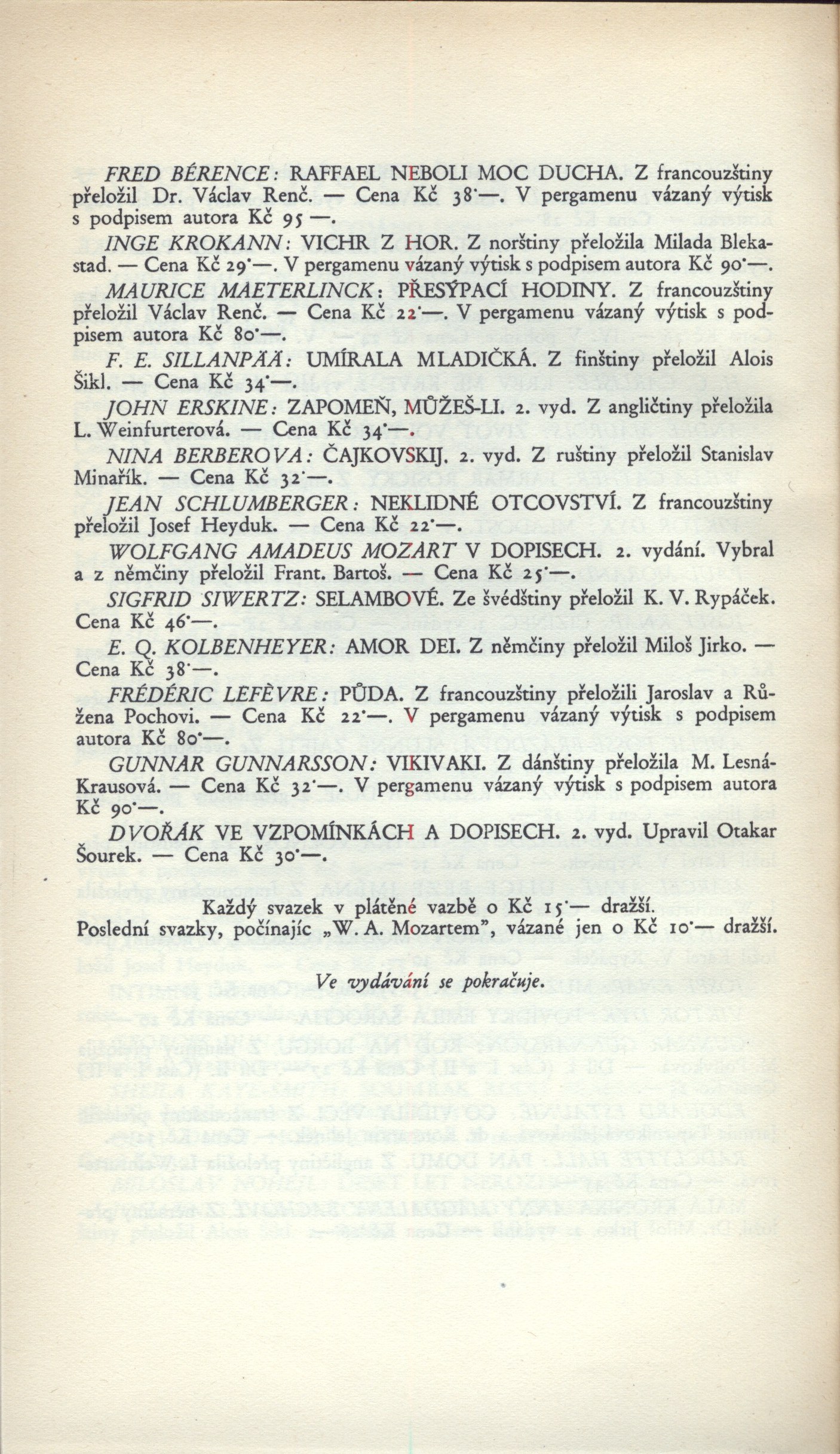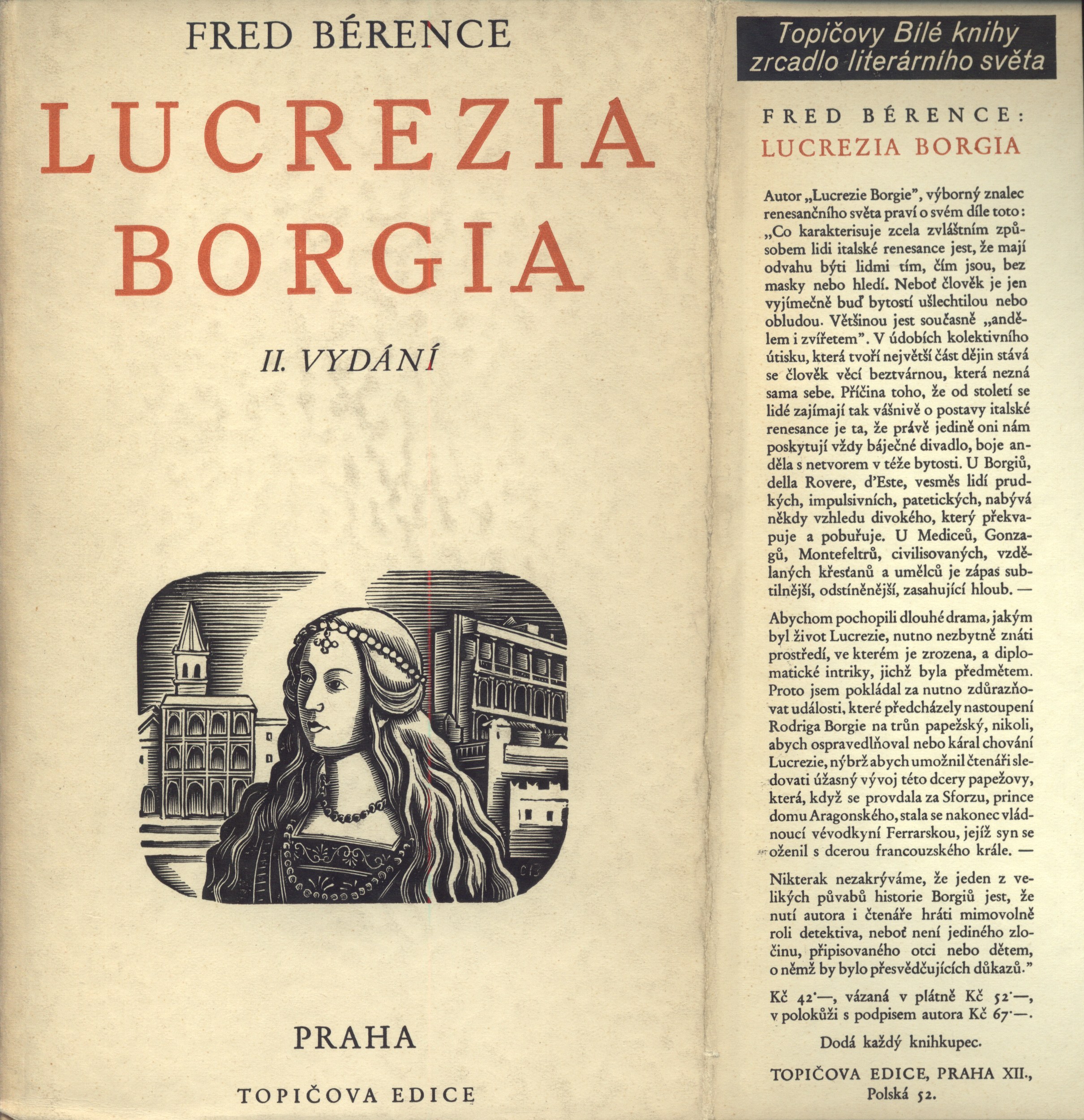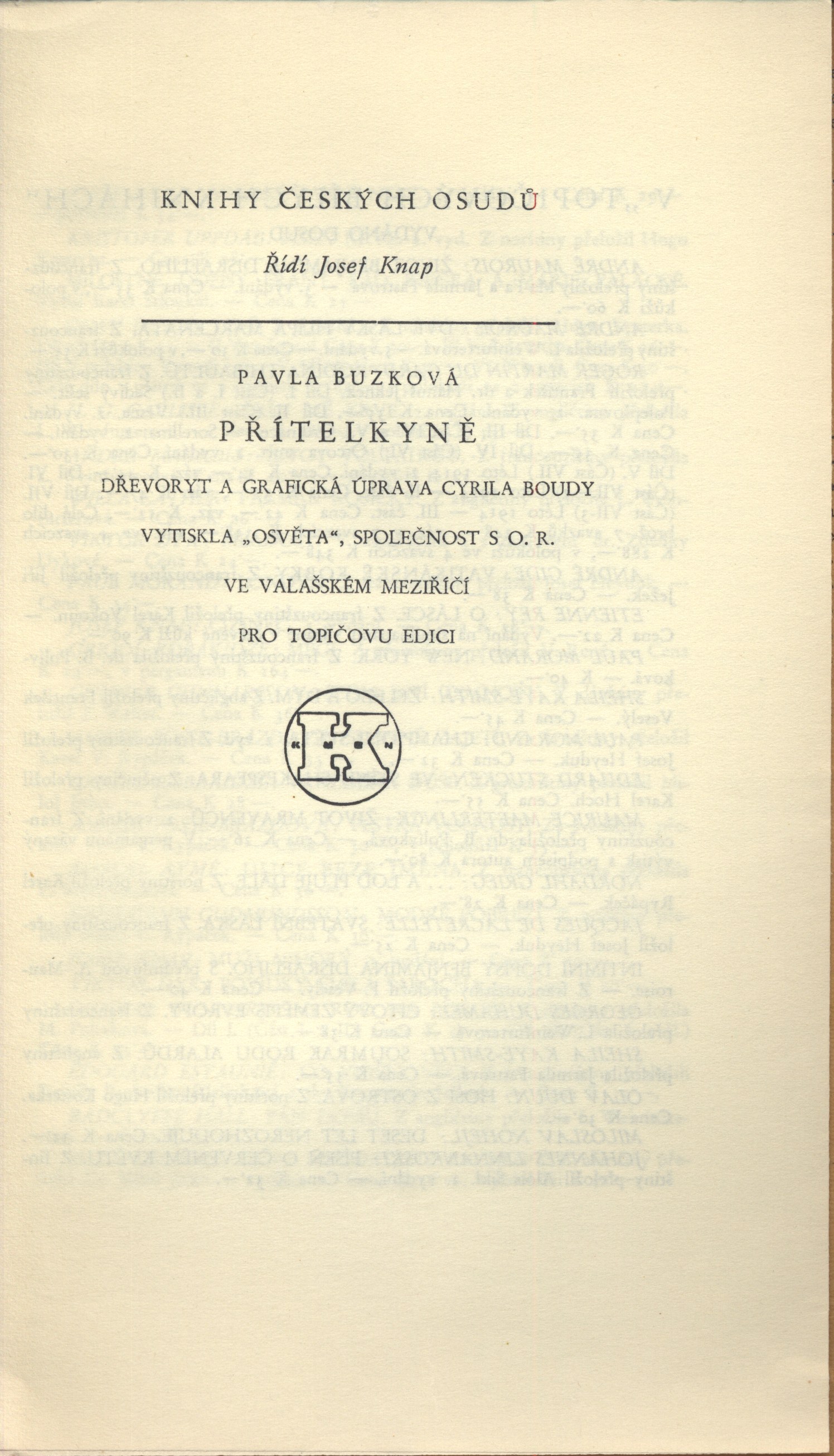 Názvové údaje Akty / Mikoláš Aleš ; vybral a úvodní slovo napsal Emanuel Svoboda ; graficky upravil Cyril Bouda Osobní jméno Aleš, Mikoláš, 1852-1913 (Umělec) (Ilustrátor) Další autoři Svoboda, Emanuel, 1883-1967 (Sestavovatel, kompilátor) (Autor doslovu, tiráže atd.) Bouda, Cyril, 1901-1984 (Knižní grafik) Korp. Topičova edice (nakladatelství) (Nakladatel, vydavatel) Družstvo knihtiskárny (tiskárna, Hranice, Přerov) (Tiskař) Nakladatel V Praze : Topičova edice, 1942 Výrobce V Hranicích : Družstvo knihtiskárny Rozsah xliv, 189 srean : ilustrace ; 24 cm Osobní hesla Aleš, Mikoláš, 1852-1913 - malíř, kreslíř a ilustrátor Klíčová slova české výtvarné umění * Aleš M. * akty * obrazové publikace Počet ex. 2, z toho volných 2 Druh dok. monografie Signatura Topič 0684, Knytl 1834 Názvové údaje Všehochuť : knížka veselých obrázků / nakreslil Mikoláš Aleš ; srovnal a slovem doprovodil Adolf Wenig Osobní jméno Aleš, Mikoláš, 1852-1913 (Ilustrátor) Další autoři Wenig, Adolf, 1874-1940 (Sestavovatel, kompilátor) (Autor) Korp. Topičova edice (nakladatelství) (Nakladatel, vydavatel) Českoslovanská akciová tiskárna (Tiskař) Nakladatel V Praze : Topičova edice, 1939 Výrobce Českoslovanská akciová tiskárna Rozsah 81 stran : ilustrace Klíčová slova česká próza * příběhy Počet ex. 1, z toho volných 1 Druh dok. monografie Signatura P 78 a 67 Názvové údaje Památník z Beethovenových slov / [uspořádal] Richard Benz ; [z němčiny] přeložil Antonín Němec ; obálka a grafická úprava Cyrila Boudy] Osobní jméno Beethoven, Ludwig van, 1770-1827 (Umělec) Další autoři Benz, Richard, 1884-1966 (Sestavovatel, kompilátor) Němec, Antonín, 1894-1958 (Překladatel) Bouda, Cyril, 1901-1984 (Autor obálky) (Knižní grafik) Korp. Topičova edice (nakladatelství) (Nakladatel, vydavatel) Müller a spol. (tiskárna) (Tiskař) Nakladatel V Praze : Topičova edice, 1941 Výrobce knihtiskárna Müller a spol.) Rozsah 80 s. ; 20 cm Osobní hesla Beethoven, Ludwig van, 1770-1827 - německý skladatel Klíčová slova hudebníci * němečtí umělci * Beethoven L. van * autobiografický text * překlad Počet ex. 1, z toho volných 1 Druh dok. monografie Signatura Topič 0335 Názvové údaje Vlastní životopis jejž pro své děti a potomky roku 1763 napsal František Benda královský pruský koncertní mistr / přeložil a vysvětlivkami opatřil Jaroslav Čeleda Osobní jméno Benda, František, 1709-1786 (Autor) Další autoři Čeleda, Jaroslav, 1890-1974 (Překladatel) (Autor úvodu atd.) Korp. Topičova edice (nakladatelství) (Nakladatel, vydavatel) Osvěta (tiskárna) (Tiskař) Nakladatel V Praze : Topičova edice, 1939 Výrobce Osvěta) Rozsah 63 s., [8] l. obr. příl. : il. Osobní hesla Benda, František, 1709-1786 - houslový virtuos, skladatel, pruský koncertní mistr, pedagog Klíčová slova česká literatura * německy psaná literatura * životopis * česká hudba * čeští hudebníci * České království * Prusko * Německo * stol. 18. Počet ex. 2, z toho volných 2 Druh dok. monografie Signatura Leschinger 178, KaG XLV D 34 Názvové údaje Čajkovskij / Nina Berberova ; z ruštiny přeložil Stanislav Minařík ; [dřevoryt a grafická úprava Cyrila Boudy] Osobní jméno Berberova, Nina Nikolajevna, 1901-1993 (Autor) Další autoři Minařík, Stanislav, 1884-1944 (Překladatel) Bouda, Cyril, 1901-1984 (Ilustrátor) (Knižní grafik) Korp. Topičova edice (nakladatelství) (Nakladatel, vydavatel) Osvěta (tiskárna) (Tiskař) Nakladatel V Praze : Topičova edice, 1937 Výrobce Osvěta, společnost s o. r.) Rozsah 261 s. : il. ; 23 cm Osobní hesla Čajkovskij, Petr Il‘jič, 1840-1893 - ruský skladatel, hudební kritik, teoretik a dirigent Klíčová slova ruská literatura * překlad * próza * román * životopisný román * Čajkovskij P. I. Počet ex. 1, z toho volných 1 Druh dok. monografie Signatura Topič 0195 Názvové údaje Lionardo da Vinci, dělník rozumu / Fred Bérence ; z francouzštiny přeložil Duchoslav Foršt ; [dřevoryt a grafická úprava Cyrila Boudy] Osobní jméno Bérence, Fred, 1889-1977 (Autor) Další autoři Foršt, Duchoslav, 1901-1983 (Překladatel) Bouda, Cyril, 1901-1984 (Ilustrátor) (Knižní grafik) Korp. Topičova edice (nakladatelství) (Nakladatel, vydavatel) Osvěta (tiskárna) (Tiskař) Nakladatel V Praze : Topičova edice, 1939 Výrobce Osvěta, společnost s o. r.) Rozsah 369 s., [2] l. obr. příl. : il. ; 22 cm Osobní hesla Leonardo, da Vinci, 1452-1519 - italský malíř, sochař, architekt a vědec Klíčová slova francouzská literatura * próza * překlad * monografie * biografie * Leonardo da Vinci * italské malířství * obrazové přílohy Počet ex. 1, z toho volných 1 Druh dok. monografie Signatura Topič 0101 Názvové údaje Lucrezia Borgia / Fred Bérence ; z francouzštiny přeložil Václav Renč ; [dřevoryt a grafická úprava Cyrila Boudy] Osobní jméno Bérence, Fred, 1889-1977 (Autor) Další autoři Renč, Václav, 1911-1973 (Překladatel) Bouda, Cyril, 1901-1984 (Ilustrátor) (Knižní grafik) Korp. Topičova edice (nakladatelství) (Nakladatel, vydavatel) Osvěta (tiskárna) (Tiskař) Nakladatel V Praze : Topičova edice, 1940 Výrobce Osvěta, společnost s o. r.) Rozsah 358 s. : il. ; 22 cm Osobní hesla Borgia, Lucrezia, vévodkyně z Ferrary, 1480-1519 - italská šlechtična Klíčová slova francouzská literatura * překlad * próza * román * historický román * Borgia L. Počet ex. 1, z toho volných 1 Druh dok. monografie Signatura Topič 0194 Názvové údaje Madona s harpyjemi : román / Fred Bérence ; z francouzštiny přeložil Duchoslav Foršt ; [dřevoryt a grafická úprava Cyrila Boudy] Osobní jméno Bérence, Fred, 1889-1977 (Autor) Další autoři Foršt, Duchoslav, 1901-1983 (Překladatel) Bouda, Cyril, 1901-1984 (Ilustrátor) (Knižní grafik) Korp. Topičova edice (nakladat