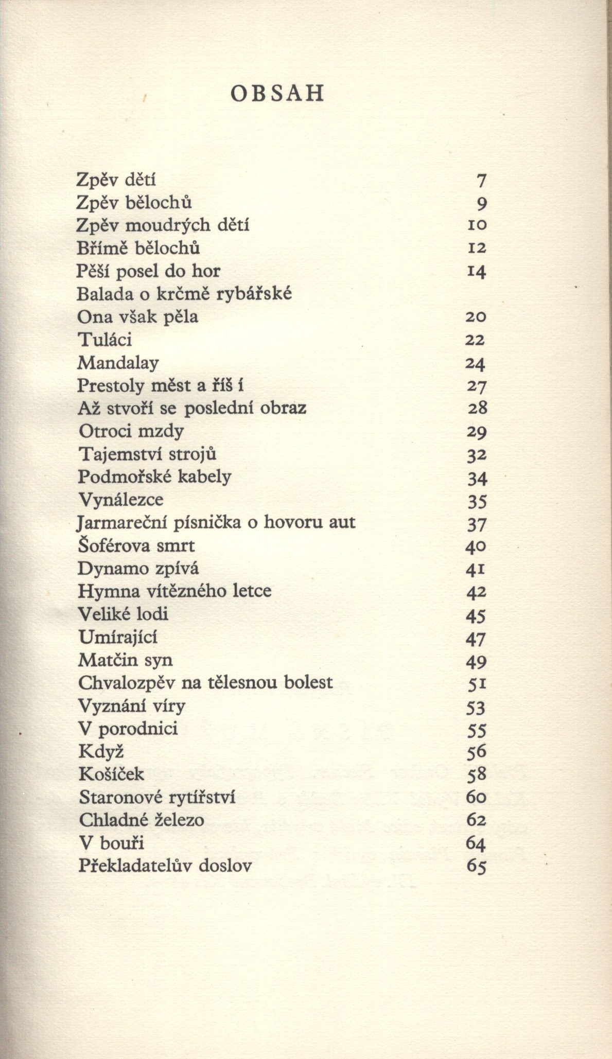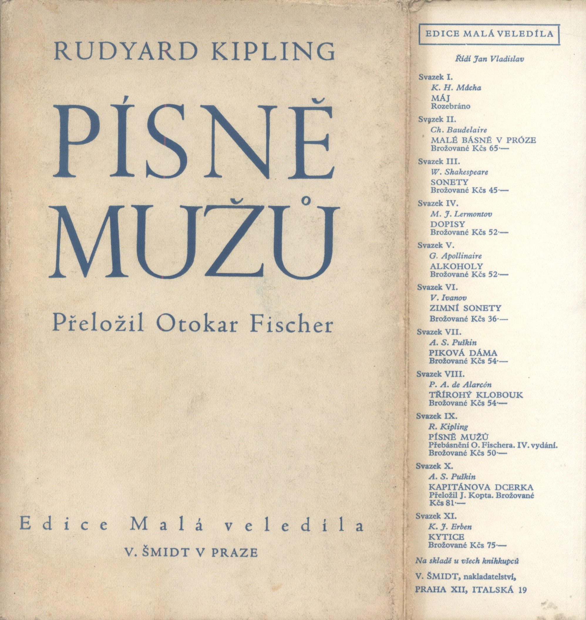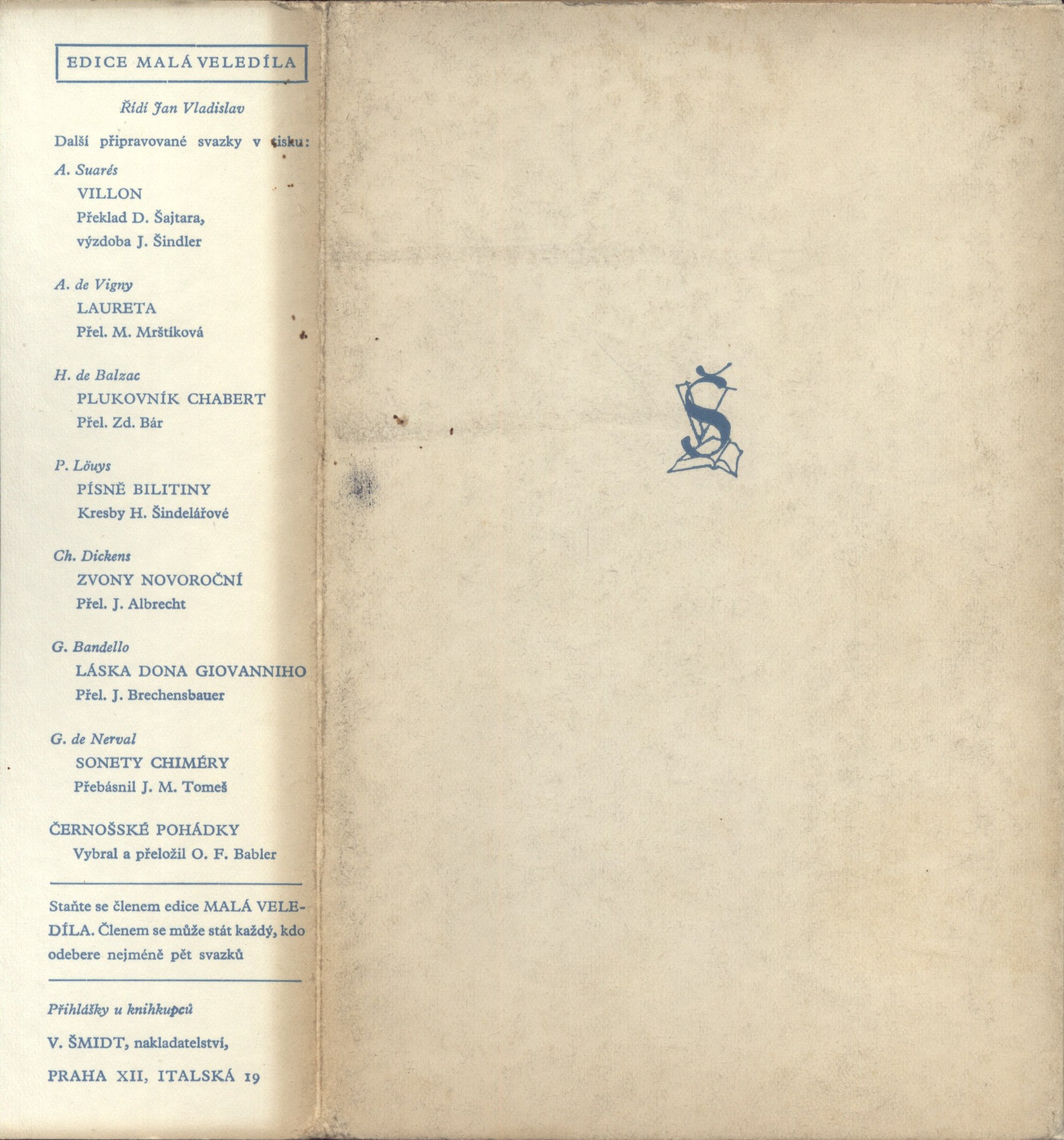 Názvové údaje Štědrý den bratří Mánesů / J. Arbes ; kresby a úprava Karel Svolinský Osobní jméno Arbes, Jakub, 1840-1914 (Autor) Další autoři Svolinský, Karel, 1896-1986 (Ilustrátor) (Grafický technik) Korp. Vilém Šmidt (nakladatelství) (Nakladatel, vydavatel) Karel Kryl (firma: Kroměříž, Česko) (Tiskař) Nakladatel Praha : Vilém Šmidt, 1940 Výrobce V Kroměříži : Karel Kryl Rozsah 35 stran : ilustrace Klíčová slova česká literatura * vánoční povídka * bratři Mánesové Počet ex. 4, z toho volných 4 Druh dok. monografie Signatura C12a 1437, KNYTL 481, P 54 E 106, P 74 F 110 Názvové údaje Slovo má básník / poesie Eduarda Bagrického ; přeložil a doslov napsal J. Teichmann ; děma dřevoryty vyzdobil J. Lukavský Osobní jméno Bagrickij, Èduard Georgijevič, 1895-1934 (Autor) Další autoři Teichmann, Jaroslav, 1904-1999 (Překladatel) (Autor úvodu atd.) Lukavský, Jaroslav, 1924-1984 (Ilustrátor) Korp. Vilém Šmidt (nakladatelství) (Nakladatel, vydavatel) Frant. Bartoš (tiskárna) (Tiskař) Nakladatel Praha : V. Šmidt, 1947 Výrobce Přerov : Frant. Bartoš Rozsah 91 stran : ilustrace Klíčová slova ruská poezie * výbor básní * r. 1918-1932 Počet ex. 2, z toho volných 2 Druh dok. monografie Signatura C12b 10256, P 95 d 65 Názvové údaje Malé básně v próze / Charles Baudelaire ; přeložil Hanuš Jelínek ; vyzdobil Zdeněk Sklenář ; typograficky upravil Method Kaláb Osobní jméno Baudelaire, Charles, 1821-1867 (Autor) Další autoři Jelínek, Hanuš, 1878-1944 (Překladatel) Sklenář, Zdeněk, 1910-1986 (Autor obálky) Kaláb, Method, 1885-1963 (Typograf) Korp. Vilém Šmidt (nakladatelství) (Nakladatel, vydavatel) Průmyslová tiskárna v Praze (Tiskař) Nakladatel Praha : V. Šmidt, 1946 Výrobce Průmyslová tiskárna Rozsah 119 stran ; 18,5 cm Klíčová slova francouzská literatura * francouzská poezie * prokletí básníci * básně v próze Počet ex. 1, z toho volných 1 Druh dok. monografie Signatura P 73 E 27 Názvové údaje Malé básně v próze / Charles Baudelaire ; přeložil Hanuš Jelínek Osobní jméno Baudelaire, Charles, 1821-1867 (Autor) (Autor úvodu atd.) Další autoři Jelínek, Hanuš, 1878-1944 (Překladatel) Šmíd, Zdeněk, 1908-1989 (Editor) Sklenář, Zdeněk, 1910-1986 (Ilustrátor) Kaláb, Method, 1885-1963 (Typograf) Korp. Vilém Šmidt (nakladatelství) (Nakladatel, vydavatel) Průmyslová tiskárna v Praze (Tiskař) (Tiskař obrazu) Nakladatel Praha : V. Šmidt, 1945 Výrobce V Praze : Průmyslová tiskárna Rozsah 119 stran ; 19 cm Klíčová slova francouzská literatura * básně v próze * Baudelaire Ch. * překlad * Jelínek H. * ilustrace * Sklenář Z. * r. 1945 Počet ex. 1, z toho volných 1 Druh dok. monografie Signatura VZinková 0108 Názvové údaje Knižní ilustrace Adolfa Kašpara : rukověť milovníka knih / Bedřich Beneš Buchlovan Osobní jméno Beneš Buchlovan, Bedřich, 1885-1953 (Autor) Další autoři Vilém Šmidt (nakladatelství) (Nakladatel, vydavatel) Karel Kryl (firma: Kroměříž, Česko) (Tiskař) Nakladatel Praha : Vilém Šmidt, 1942 Výrobce Karel Kryl) Rozsah 49 s., [10] l. obr. příl. : il. Osobní hesla Kašpar, Adolf, 1877-1934 - malíř a ilustrátor Klíčová slova česká literatura * knižní kultura * ilustrace * ilustrace knih * ilustrátoři * česká ilustrace * čeští ilustrátoři * soupis Počet ex. 5, z toho volných 5 Druh dok. monografie Signatura KaG XLI D 119, KaG XXXIII D 28, VMartínek 0589, M 122 c 10, R 35 c 33 Názvové údaje Ruce pryč : několik slov o tak zvaném moravském vydání Máchova Máje / Bedřich Beneš Buchlovan ; frontispice kresba Mikuláše Galandy ze studií pro Máchův Máj Osobní jméno Beneš Buchlovan, Bedřich, 1885-1953 (Autor) Další autoři Galanda, Mikuláš, 1895-1938 (Ilustrátor) Korp. Karel Kryl (firma: Kroměříž, Česko) (Tiskař) Vilém Šmidt (nakladatelství) (Nakladatel, vydavatel) Nakladatel Praha : Vilém Šmidt, 1940 Výrobce V Kroměříži : Vytiskl Karel Kryl, 1940 Rozsah 19 stran : ilustrace Osobní hesla Mácha, Karel Hynek, 1810-1836 - básník, beletrista, dramatik Klíčová slova česká literatura * česká poezie * editologie * polemiky * polemika Počet ex. 2, z toho volných 2 Druh dok. monografie Signatura KaG V23B 75, Sáňka 1366 Názvové údaje Večerní písně / Vítězslav Hálek ; [kresby a typografická úprava Karla Svolinského] Osobní jméno Hálek, Vítězslav, 1835-1874 (Autor) Další autoři Svolinský, Karel, 1896-1986 (Ilustrátor) (Typograf) Korp. Karel Kryl (firma: Kroměříž, Česko) (Tiskař) Vilém Šmidt (nakladatelství) (Nakladatel, vydavatel) Nakladatel Praha : Vilém Šmidt, 1941 Výrobce Karel Kryl) Rozsah 61 s. : il. Klíčová slova česká literatura * česká poezie * lyrická poezie * sbírka básní Počet ex. 1, z toho volných 1 Druh dok. monografie Signatura RSzpuk 0747 Názvové údaje Večerní písně / Vítězslav Hálek ; [podle I. vyd. přehlédl a úpravu navrhl B[edřich] B[eneš] B[uchlovan] ; kresbami doprovodil Aljo Beran] Osobní jméno Hálek, Vítězslav, 1835-1874 (Autor) Další autoři Beneš Buchlovan, Bedřich, 1885-1953 (Knižní grafik) (Editor) Beran, Aljo, 1907-1990 (Ilustrátor) Korp. Vilém Šmidt (nakladatelství) (Nakladatel, vydavatel) Karel Kryl (firma : Nový Jičín, Česko) (Tiskař) Nakladatel Praha : Vilém Šmidt, 1938 Výrobce Karel Kryl) Rozsah 68 s. Klíčová slova česká poezie * básně * lyrické básně Počet ex. 1, z toho volných 1 Druh dok. monografie Signatura VMartínek 1197 Názvové údaje Písně mužů / Rudyard Kipling ; přeložil Otokar Fischer Osobní jméno Kipling, Rudyard, 1865-1936 (Autor) Další autoři Fischer, Otokar, 1883-1938 (Překladatel) (Autor doslovu, tiráže atd.) Kaláb, Method, 1885-1963 (Typograf) Korp. Vilém Šmidt (nakladatelství) (Nakladatel, vydavatel) Průmyslová tiskárna v Praze (Tiskař) Nakladatel Praha : V. Šm