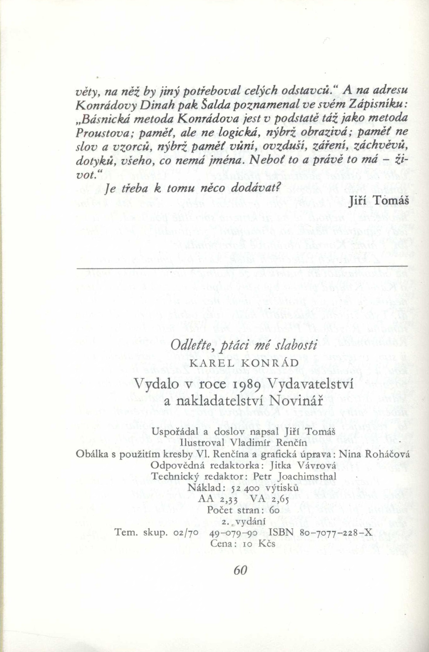 Názvové údaje Novinář František Xaver Šalda / Nora Dolanská ; [obálka a grafická úprava Nina Roháčová] Osobní jméno Dolanská, Nora, 1950- (Autor) Další autoři Roháčová, Nina, 1930-2012 (Autor obálky) Korp. Vydavatelství Novinář (Nakladatel, vydavatel) Tisk Brno (tiskárna) (Tiskař) Nakladatel Praha : Novinář, 1987 Výrobce Tisk 2) Rozsah 311 s., [14] s. fot. ; 17 cm Osobní hesla Šalda, F. X. (František Xaver) 1867-1937 Klíčová slova česká žurnalistika * čeští novináři * Šalda F. X. * život a dílo * monografie Počet ex. 2, z toho volných 2 Druh dok. monografie Signatura M 161 h 2, M 161 h 2/a Názvové údaje Žánry umělecké publicistiky / Nora Dolanská, Vladimír Kalina ; [obálka Milan Kopřiva] Osobní jméno Dolanská, Nora, 1950- (Autor) Další autoři Kalina, Vladimír, 1927-1995 (Autor) Kopřiva, Milan, 1929-1997 (Autor obálky) Korp. Vydavatelství Novinář (Nakladatel, vydavatel) Tisk Brno (tiskárna) (Tiskař) Nakladatel Praha : Novinář, 1984 Výrobce Tisk 52) Rozsah 255 s. ; 20 cm Klíčová slova publicistika * žánry * studie Počet ex. 1, z toho volných 1 Druh dok. monografie Signatura F I 1167 Názvové údaje Jak se rozhoupával zrady zvon / Karel Douděra ; [obálka Nina Roháčová] Osobní jméno Douděra, Karel, 1915-2001 (Autor) Další autoři Roháčová, Nina, 1930-2012 (Autor obálky) Korp. Vydavatelství Novinář (Nakladatel, vydavatel) Tisk Brno (tiskárna) (Tiskař) Nakladatel Praha : Novinář, 1983 Výrobce Tisk 52) Rozsah 272 s., [14] s. obr. příl. ; 20 cm Klíčová slova Československo * dějiny Československa * Mnichovská dohoda * monografie Počet ex. 1, z toho volných 1 Druh dok. monografie Signatura M 141 f 45 Názvové údaje Republika na úvěr / Karel Douděra ; [obálka a grafická úprava Jiří Brich] Osobní jméno Douděra, Karel, 1915-2001 (Autor) Další autoři Vydavatelství Novinář (Nakladatel, vydavatel) Nakladatel Praha : Novinář, 1987 Výrobce MTZ 21) Rozsah 282 s., 27 s. obr. přílohy : il. ; 21 cm Klíčová slova Československo * dějiny Československa * Mnichov * Mnichovská dohoda * 2. světová válka Počet ex. 1, z toho volných 1 Druh dok. monografie Signatura M 163 d 9 Názvové údaje Paměti komorníka císaře Františka Josefa I. : skoro holá pravda o životě a konání Františka Josefa I., jak ji denodenně zblízka vídal jeho dlouholetý osobní komorník Eugen Ketterl / Milan Hodík Osobní jméno Hodík, Milan, 1933-2010 (Autor) (Sestavovatel, kompilátor) (Autor komentáře) Další autoři Ketterl, Eugen, 1859-1928 (Jiná role) Rytina, Václav, 1945-2004 (Knižní grafik) Haštaba, Stanislav (Autor obálky) Korp. Vydavatelství Novinář (Nakladatel, vydavatel) Státní tiskárna v Praze (Tiskař) Nakladatel Praha : vydavatelství Novinář, 1970 Výrobce Praha : Státní tiskárna, závod 2 Rozsah 125 stran, 22 nečíslovaných stran obrazové přílohy : ilustrace, potrtréty, fotografie ; 21 cm Osobní hesla František Josef I., rakouský císař, 1830-1916 Klíčová slova paměti * komorníci * životopisná literatura * František Josef I. rakouský císař * Rakousko-Uhersko * obrazové přílohy Počet ex. 1, z toho volných 1 Adr. el. zdr. http://kramerius4.nkp.cz/search/handle/uuid:189e8040-8d35-11e2-a920-005056827e51 Druh dok. monografie Signatura VZinková 0529 Názvové údaje Zrada na křídlech Hurricanu / František Kavan Osobní jméno Kavan, František (Autor) Další autoři Haštaba, Stanislav (Autor obálky) Korp. Vydavatelství Novinář (Nakladatel, vydavatel) Nakladatel Praha : Novinář, 1970 Výrobce (ST 2) Rozsah 110, [2] s. ; 8° Klíčová slova česká próza Počet ex. 1, z toho volných 1 Druh dok. monografie Signatura P 124 a 51 Názvové údaje Odleťte, ptáci mé slabosti / Karel Konrád, Zdeněk Tábor Osobní jméno Konrád, Karel, 1899-1971 (Autor) Další autoři Tábor, Zdeněk, 1899-1971 (Autor) Renčín, Vladimír, 1941-2017 (Ilustrátor) Tomáš, Jiří, 1944-2025 (Sestavovatel, kompilátor) Roháčová, Nina, 1930-2012 (Autor obálky) (Knižní grafik) Korp. Vydavatelství Novinář (Nakladatel, vydavatel) Nakladatel Praha : Vydavatelství a nakladatelství Novinář, 1989 Rozsah 60, 60 stran : ilustrace ; 18 cm Osobní hesla Konrád, Karel, 1899-1971 - redaktor, publicista, prozaik, dramatik, člen skupiny Devětsil Klíčová slova česká literatura * próza * Konrád K. * výbory * ilustrované knihy * ilustrace * Renčín V. * r. 1989 Počet ex. 1, z toho volných 1 Adr. el. zdr. http://krameriusndk.nkp.cz/search/handle/uuid:b5249790-bd25-11e2-8b87-005056827e51 Druh dok. monografie Signatura VZinková 0724 Názvové údaje Jan Palach : zpráva o životě, činu a smrti českého studenta / Jiří Lederer Osobní jméno Lederer, Jiří, 1922-1983 (Autor) Další autoři Teprt, Lubomír, 1953- (Autor obálky) (Knižní grafik) Korp. Vydavatelství Novinář (Nakladatel, vydavatel) Grafia (Zlín, Česko) (Tiskař) Nakladatel Praha : vydavatelství a nakladatelství Novinář, 1990 Výrobce Zlín : Grafia, st. p. Rozsah 149 stran ; 21 cm Osobní hesla Palach, Jan, 1948-1969 - student Předmětová hesla vysokoškolští studenti - Československo - 1968-1969 * sebeupálení - Československo * Srpen (1968 : Československo) * protestní hnutí - Československo - 1968-1969 Klíčová slova česká literatura * monografie * Palach J. * oběti komunismu Počet ex. 1, z toho volných 1 Adr. el. zdr. http://krameriusndk.nkp.cz/search/handle/uuid:2b9972f0-ff1d-11e6-8830-005056827e51 Druh dok. monografie Signatura VZinková 0537 Názvové údaje Domovní důvěrnosti / Jindřiška Smetanová ; [ilustrace Vladimír Renčín ; návrh přebalu, vazby a grafická úprava Leo Novotný] Osobní jméno Smetanová, Jindřiška, 1923-2012 (Autor) Další autoři Renčín, Vladimír, 1941-2017 (Ilustrátor) Novotný, Leo, 1931- (Grafický technik) (Autor obálky) Korp. Vydavatelství Novinář (Nakladatel, vydav
