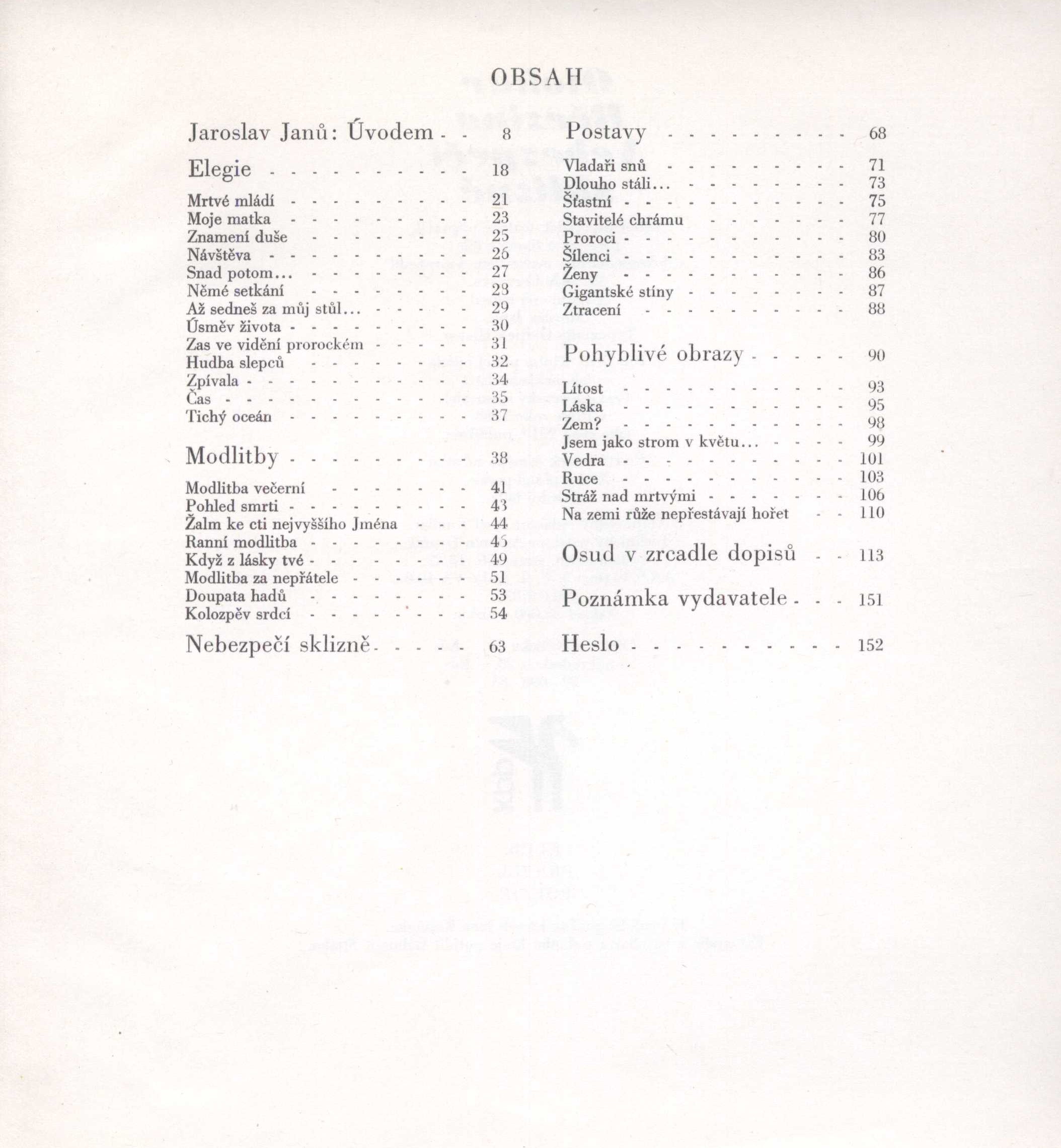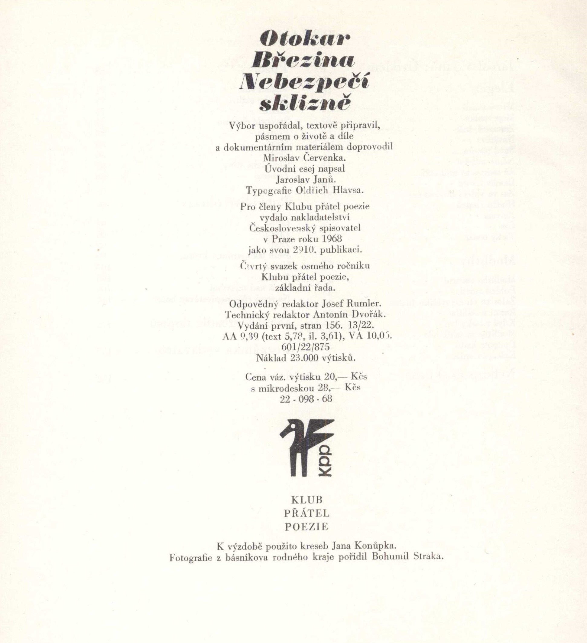 Názvové údaje Denní hvězdy / Olga Berggolcová ; Z ruš. přel. Anna Nováková ; Verše přel. Miroslav Červenka ; Verše Majakovského přel. Jiří Taufer ; Typogr. upr. Zdenek Seydl ; Obálku navrhl Karel Teissig Osobní jméno Berggol‘c, Ol‘ga Fedorovna, 1910-1975 (Autor) Další autoři Nováková, Anna, 1921-2005 (Překladatel) Červenka, Miroslav, 1932-2005 (Překladatel) Taufer, Jiří, 1911-1986 (Překladatel) Seydl, Zdenek, 1916-1978 (Grafický technik) Teissig, Karel, 1925-2000 (Grafický technik) Nakladatel Praha : Československý spisovatel, 1961 Rozsah 178 s. Osobní hesla Berggol‘c, Ol‘ga Fedorovna, 1910-1975 - ruská básnířka * Berggol‘c, Ol‘ga Fedorovna, 1910-1975 - ruská básnířka * Berggol‘c, Ol‘ga Fedorovna, 1910-1975 - ruská básnířka Klíčová slova ruská literatura * sovětská literatura * vzpomínky Počet ex. 1, z toho volných 1 Druh dok. monografie Signatura AČS 04063 Názvové údaje Básně / Petr Bezruč ; [uspořádali a textově připravili Miroslav Červenka, Břetislav Štorek ; úvodní esej napsal Vilém Závada ; typograficky upravil, obálku, předsádku a vazbu navrhl Vladimír Fuka] Osobní jméno Bezruč, Petr, 1867-1958 (Autor) Další autoři Červenka, Miroslav, 1932-2005 (Sestavovatel, kompilátor) (Editor) Štorek, Břetislav, 1930-1976 (Sestavovatel, kompilátor) (Editor) Závada, Vilém, 1905-1982 (Autor úvodu atd.) Fuka, Vladimír, 1926-1977 (Typograf) (Knižní grafik) Nakladatel Praha : Československý spisovatel, 1964 Rozsah 178 s. Klíčová slova česká literatura * poezie * básně Počet ex. 3, z toho volných 3 Druh dok. monografie Signatura AČS 04513, AČS 04513a, EJulis 0648 Názvové údaje Básně / Petr Bezruč ; [uspoř. a text. připr. Miroslav Červenka a Břetislav Štorek ; úvod. esej naps. Vilém Závada ; typogr. upr., obálku, předsádku a vazbu navrhl Vlad. Fuka] Osobní jméno Bezruč, Petr, 1867-1958 (Autor) Další autoři Červenka, Miroslav, 1932-2005 (Editor) Štorek, Břetislav, 1930-1976 (Editor) Závada, Vilém, 1905-1982 (Autor úvodu atd.) Fuka, Vladimír, 1926-1977 (Typograf) (Knižní grafik) Nakladatel Praha : Československý spisovatel, 1964 Rozsah 178 s. Klíčová slova česká literatura * poezie * sbírka básní * stol. 20., 1. pol. Počet ex. 3, z toho volných 3 Druh dok. monografie Signatura C12b 3646, LK P 29 h 86, LK ZA 6 f 15 Názvové údaje Slezské písně / Petr Bezruč ; [ilustroval Bohdan Kopecký ; obálku, vazbu a grafickou úpravu navrhl Oldřich Hlavsa ; k vydání připravil Miroslav Červenka a Břetislav Štorek] Osobní jméno Bezruč, Petr, 1867-1958 (Autor) Další autoři Kopecký, Bohdan, 1928-2010 (Ilustrátor) Hlavsa, Oldřich, 1909-1995 (Autor obálky) (Výtvarník vazby) (Grafický technik) Červenka, Miroslav, 1932-2005 (Editor) Štorek, Břetislav, 1930-1976 (Editor) Nakladatel Praha : Odeon, 1967 Rozsah 159 s. : il Klíčová slova česká literatura * poezie * sbírka básní * stol. 20., léta 20. Počet ex. 3, z toho volných 3 Druh dok. monografie Signatura C12c 1284, LK P 63 a 4, LK ZF 1 c 20 Názvové údaje Korespondence. I, (1884-1908) / Otokar Březina ; v letech 1973-2004 sebral, k vydání připravil, komentáře, doslov a ediční poznámku napsal a soupisy zpracoval Petr Holman ; spolupráce na komentářích Miroslav Červenka, na soupisech Miroslav Balaštík ; obálka a grafická úprava Boris Mysliveček Osobní jméno Březina, Otokar, 1868-1929 (Autor) Další autoři Holman, Petr, 1951-2019 (Sestavovatel, kompilátor) (Editor) (Autor komentáře textu) (Autor doslovu, tiráže atd.) Červenka, Miroslav, 1932-2005 (Sestavovatel, kompilátor) (Autor komentáře textu) Balaštík, Miroslav, 1971- (Sestavovatel, kompilátor) Mysliveček, Boris, 1948- (Autor obálky) (Knižní grafik) Korp. Host (nakladatelství) (Nakladatel, vydavatel) Tiskárna Reprocentrum (Tiskař) Nakladatel Brno : Host, 2004 Výrobce Blansko : Reprocentrum Rozsah 863 stran, xiv stran obrazových příloh : ilustrace, portréty, faksimile ; 23 cm Osobní hesla Březina, Otokar, 1868-1929 - učitel, básník, esejista, prozaik a myslitel Klíčová slova čeští spisovatelé * čeští básníci * korespondence * r. 1884-1908 * stol. 19.-20. * komentované vydání Počet ex. 4, z toho volných 4 Druh dok. monografie Signatura C12c 1699/1, C12c 2025/1, C12c 2305/1, Holman-Březina 0515/1 Názvové údaje Korespondence. II, (1909-1929) / Otokar Březina ; v letech 1973-2004 sebral, k vydání připravil, komentáře, doslov a ediční poznámku napsal a soupisy zpracoval Petr Holman ; spolupráce na komentářích Miroslav Červenka, na soupisech Miroslav Balaštík ; obálka a grafická úprava Boris Mysliveček Osobní jméno Březina, Otokar, 1868-1929 (Autor) Další autoři Holman, Petr, 1951-2019 (Sestavovatel, kompilátor) (Editor) (Autor komentáře textu) (Autor doslovu, tiráže atd.) Červenka, Miroslav, 1932-2005 (Sestavovatel, kompilátor) (Autor komentáře textu) Balaštík, Miroslav, 1971- (Sestavovatel, kompilátor) Mysliveček, Boris, 1948- (Autor obálky) (Knižní grafik) Korp. Host (nakladatelství) (Nakladatel, vydavatel) Tiskárna Reprocentrum (Tiskař) Nakladatel Brno : Host, 2004 Výrobce Blansko : Reprocentrum Rozsah Strana 871-1815, xxviii stran obrazových příloh : ilustrace, portréty a faksimile ; 23 cm Osobní hesla Březina, Otokar, 1868-1929 - učitel, básník, esejista, prozaik a myslitel Klíčová slova čeští spisovatelé * čeští básníci * korespondence * r. 1909-1929 * stol. 19.-20. * komentované vydání Počet ex. 4, z toho volných 4 Druh dok. monografie Signatura C12c 1699/2, C12c 2025/2, C12c 2305/2, Holman-Březina 0515/2 Názvové údaje Nebezpečí sklizně / Otokar Březina ; výbor uspořádal, textově připravil, pásmem o životě a díle a dokumentárním materiálem doprovodil Miroslav Červenka ; úvodní esej napsal Jaroslav Janů ; typografie Oldřich Hlavsa ; k výzdobě p