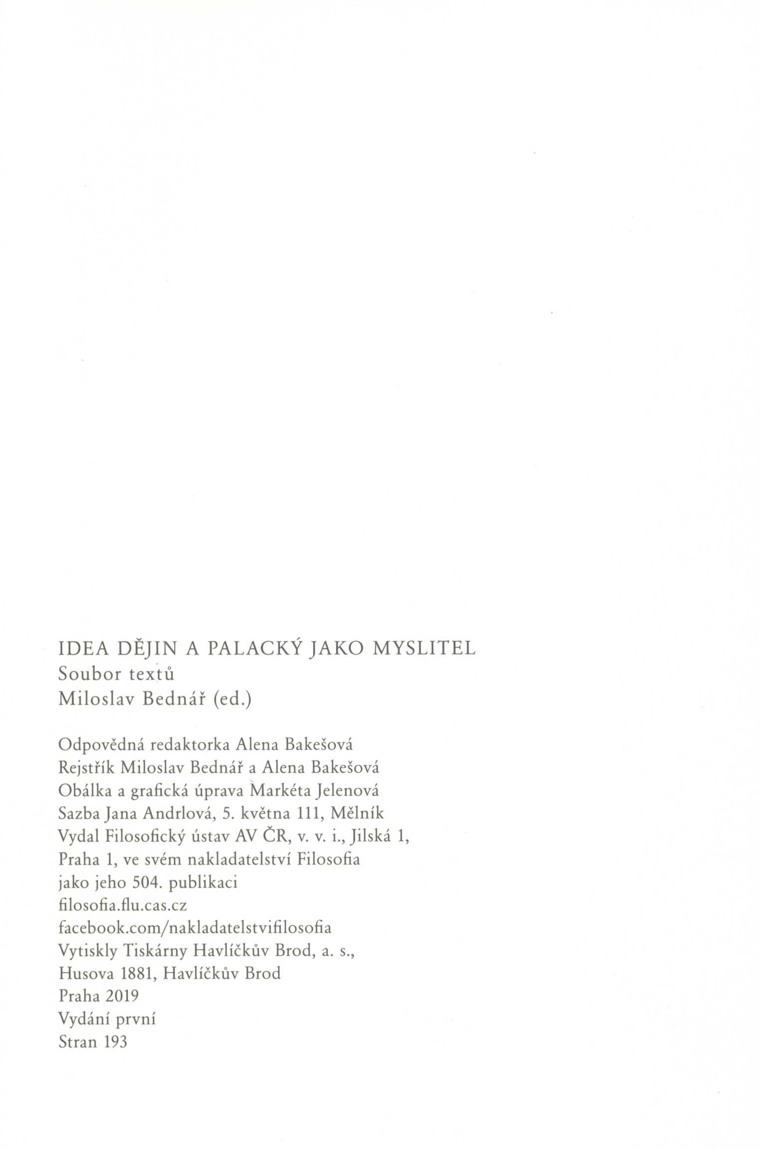 Názvové údaje František Palacký : otec národa / F. M. Bartoš Osobní jméno Bartoš, František Michálek, 1889-1972 (Autor) Další autoři Orbis (tiskárna) (Nakladatel, vydavatel) Nakladatel Praha : Orbis, 1948 Rozsah 53 s. Osobní hesla Palacký, František, 1798-1876 - zemský historiograf království Českého, estetik, politik, historik, literární historik Klíčová slova česká literatura * stol. 19. * česká politika * čeští politici * čeští historici * národní obrození Počet ex. 1, z toho volných 1 Druh dok. monografie Signatura VHB 0256 Názvové údaje Korrespondence a zápisky Frant. Ladislava Čelakovského / vydal František Bílý. svazek III, [sešit 1] Osobní jméno Čelakovský, František Ladislav, 1799-1852 (Autor) (Adresát, příjemce) Další autoři Bílý, František, 1854-1920 (Editor) Staněk, Václav, 1804-1871 (Autor) (Adresát, příjemce) Amerling, Karel, 1807-1884 (Autor) (Adresát, příjemce) Palacký, František, 1798-1876 (Autor) (Adresát, příjemce) Rajská, Bohuslava, 1817-1852 (Autor) (Adresát, příjemce) Vinařický, Karel Alois, 1803-1869 (Autor) (Adresát, příjemce) Korp. Česká akademie císaře Františka Josefa pro vědy, slovesnost a umění (Nakladatel, vydavatel) Alois Wiesner, knihtiskař České akademie císaře Františka Josefa pro vědy, slovesnost a umění (Praha) (Tiskař) Nakladatel V Praze : Nákladem České akademie císaře Františka Josefa pro vědy a slovesnost a umění, 1912 Výrobce (Alois Wiesner) Rozsah [4], 320 s. Osobní hesla Čelakovský, František Ladislav, 1799-1852 - profesor slavistiky a bohemistiky, básník, sběratel a vydavatel * Rajská, Bohuslava, 1817-1852 - pracovnice ženského hnutí * Staněk, Václav, 1804-1871 - lékař a spisovatel * Čelakovská, Marie, zemř.1844 - první manželka F. L. Čelakovského Klíčová slova slavistika * česká literatura * česká poezie * jižní Čechy * literární historie * poezie * milostná korespondence * korespondence * čeští spisovatelé * český jazyk * přátelství * dějiny literatury * stol. 19. * básnická tvorba * národní obrození * slovanské literatury * osobní korespondence * básníci * edice * tvorba * čeští básníci * diskuse * přátelé * literární život * vzájemná korespondence * vlastenectví * Prácheňsko * edice pramenů Počet ex. 1, z toho volných 1 Druh dok. monografie Signatura KaG XIII C2 12/5 Odkazy (1) - Monografie Názvové údaje František Palacký a numismatika / přednesl na valné schůzi Československé Numismatické Společnosti v Praze dne 20. března 1936 Josef Dobrý Osobní jméno Dobrý, Josef, 1875-1961 (Autor) Nakladatel Praha : [nákladem vlastním], 1936 Výrobce (Frant. Rebec) Rozsah 29 s. : il. ; 8° Osobní hesla Palacký, František, 1798-1876 - zemský historiograf království Českého, estetik, politik, historik, literární historik Klíčová slova numismatika * přednášky Počet ex. 1, z toho volných 1 Druh dok. monografie Signatura M 27 b 13 Názvové údaje Medaile a plakety ražené k poctě a na památku Františka Palackého / Josef Dobrý ; [typografie E. Stivín] Osobní jméno Dobrý, Josef, 1875-1961 (Autor) Další autoři Stivín, Emanuel, 1848-1925 (Typograf) Korp. Numismatická společnost československá (Nakladatel, vydavatel) Nakladatel Praha : Numismatická společnost, 1936 Rozsah 10 s., [8] s. obr. příl. ; 8° Osobní hesla Palacký, František, 1798-1876 - zemský historiograf království Českého, estetik, politik, historik, literární historik Klíčová slova numismatika * Palacký F. * medaile * plakety Počet ex. 1, z toho volných 1 Druh dok. monografie Signatura K L VI 115 Názvové údaje František Palacký, Otec národa / napsal Josef B. Dolenský Osobní jméno Dolenský, Josef B. (Autor) Další autoři Státní nakladatelství (Nakladatel, vydavatel) Nakladatel V Praze : Státní nakladatelství, 1946 Rozsah 15 stran : ilustrace, faksimile ; 21 cm Osobní hesla Palacký, František, 1798-1876 - zemský historiograf království Českého, estetik, politik, historik, literární historik Klíčová slova česká literatura * Palacký F. * životopisná studie Počet ex. 1, z toho volných 2 Druh dok. monografie Signatura M 9 g 8, Branald 0270 Názvové údaje František Palacký, Otec národa : životopisná studie / Josef B. Dolenský Osobní jméno Dolenský, Josef B. (Autor) Nakladatel V Praze : Státní nakladatelství, 1945 Rozsah 15 s. : il. ; 8° Osobní hesla Palacký, František, 1798-1876 - zemský historiograf království Českého, estetik, politik, historik, literární historik Klíčová slova česká literatura * Palacký F. * životopisná studie Počet ex. 1, z toho volných 1 Druh dok. monografie Signatura P 87 c 36 Názvové údaje Fr. Palacký/ V. Chaloupecký ; s původ. litografií Maxe Švabinského Osobní jméno Chaloupecký, Václav, 1882-1951 (Autor) Další autoři Švabinský, Max, 1873-1962 (Ilustrátor) Karásek ze Lvovic, Jiří, 1871-1951 (Autor podpisu) Korp. Dělnická knihtiskárna a nakladatelství (Praha) (Tiskař) Spolek výtvarných umělců Mánes (Nakladatel, vydavatel) Nakladatel V Praze : Nákladem Spolku výtv. umělců Manes, 1912 Výrobce V Praze : Tiskem Dělnické knihtiskárny, 1912 Rozsah iii, 195 stran, 31 nečíslovaných listů obrazových příloh : ilustrace Osobní hesla Palacký, František, 1798-1876 - zemský historiograf království Českého, estetik, politik, historik, literární historik, spisovatel, archivář, publicista, novinář Klíčová slova česká literatura * česká historie * národní obrození * česká historiografie * čeští historici Počet ex. 1, z toho volných 1 Druh dok. monografie Signatura KaG III E 100 Názvové údaje Idea dějin a Palacký jako myslitel : soubor textů / Miloslav Bednář (ed.) ; obálka a grafická úprava Markéta Jelenová Záhlaví-akce Idea dějin a Palacký jako myslitel (workshop) (2016 : 