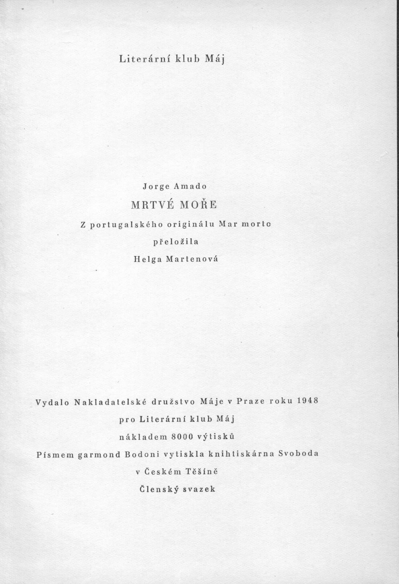 Názvové údaje Básník svobody : Život Castra Alvese / Jorge Amado ; [Z portugal.] přel. a vysvětl. opatř. Zdeněk Hampejs ; Verše přel. Kamil Bednář ; Obálku, vazbu a typogr. úpr. navrhl Josef Hanzl Osobní jméno Amado, Jorge, 1912-2001 (Autor) Další autoři Hampl, Zdeněk, 1929-1986 (Překladatel) Bednář, Kamil, 1912-1972 (Překladatel) Hanzl, Josef (Grafický technik) Nakladatel Praha : Československý spisovatel, 1952 Rozsah 243 s. Osobní hesla Castro Alves, Antônio, 1847-1871 - brazilský romantický básník a dramatik Klíčová slova brazilská literatura * próza * román * životopisný román * Castro Alves A. Počet ex. 2, z toho volných 2 Druh dok. monografie Signatura AČS 03388, AČS 03388a Názvové údaje Básník svobody : Život Castra Alvese / Jorge Amado ; [Z portugal.] přel. Zdeněk Hampejs ; Verše přel. Kamil Bednář ; Obálku navrhl Josef Paukert ; Vazbu navrhl Josef Hanzl Osobní jméno Amado, Jorge, 1912-2001 (Autor) Další autoři Hampl, Zdeněk, 1929-1986 (Překladatel) Bednář, Kamil, 1912-1972 (Překladatel) Paukert, Josef, 1915-1991 (Grafický technik) Hanzl, Josef (Grafický technik) Nakladatel Praha : Československý spisovatel, 1951 Rozsah 225 s. Osobní hesla Castro Alves, Antônio, 1847-1871 - brazilský romantický básník a dramatik Klíčová slova brazilská literatura * próza * román * životopisný román Počet ex. 1, z toho volných 1 Druh dok. monografie Signatura AČS 01388 Názvové údaje Jubiabá / Jorge Amado ; [z portugal. přel. Křišťan Bém ; obálku navrhla Ludmila Černá] Osobní jméno Amado, Jorge, 1912-2001 (Autor) Další autoři Bém, Křišťan, 1915-1996 (Překladatel) Černá, Ludmila (Grafický technik) Nakladatel Praha : Československý spisovatel - závod Máj, 1949 Rozsah 339 s. Klíčová slova brazilská literatura próza román sociální román Počet ex. 2, z toho volných 2 Druh dok. monografie Signatura AČS 05047, AČS 05047a Názvové údaje Kapitáni s písku / Jorge Amado ; Z portugal. přel. Křišťan Bém ; Obálku navrhl L. Rathauský Osobní jméno Amado, Jorge, 1912-2001 (Autor) Další autoři Bém, Křišťan, 1915-1996 (Překladatel) Rathauský, L. (Grafický technik) Nakladatel Praha : Československý spisovatel, 1949 Rozsah 287 s. Klíčová slova brazilská literatura * próza * román Počet ex. 2, z toho volných 2 Druh dok. monografie Signatura AČS 00878, AČS 00878a Názvové údaje Mrtvé moře / Jorge Amado ; Z portug. přel. Helga Martenová Osobní jméno Amado, Jorge, 1912-2001 (Autor) Další autoři Martenová, Helga (Překladatel) Nakladatel Praha : Nakladatelské družstvo Máje, 1948 Rozsah 273 s. Klíčová slova brazilská literatura * portugalsky psaná literatura * próza * román Počet ex. 1, z toho volných 1 Druh dok. monografie Signatura C12b 2389 Názvové údaje Mrtvé moře / Jorge Amado ; [z portugalského originálu ... přeložila Helga Martenová] Osobní jméno Amado, Jorge, 1912-2001 (Autor) Další autoři Martenová, Helga (Překladatel) Korp. Nakladatelské družstvo Máje (Nakladatel, vydavatel) Svoboda (tiskárna) (Tiskař) Nakladatel V Praze : vydalo Nakladatelské družstvo Máje pro Literární klub Máj, 1948 Výrobce knihtiskárna Svoboda) Rozsah 273 s. ; 22 cm Klíčová slova brazilská literatura * portugalsky psaná literatura * próza * překlad * román Počet ex. 1, z toho volných 1 Druh dok. monografie Signatura Máj 055 Názvové údaje Pot / Jorge Amado ; [ze španělského originálu ... přeložil Jan Otokar Fischer ; obálku navrhl K. Poličanský] Osobní jméno Amado, Jorge, 1912-2001 (Autor) Další autoři Fischer, Jan Otokar, 1923-1992 (Překladatel) (Autor úvodu atd.) Poličanský, Karel, 1913-1996 (Autor obálky) Slabý, Zdeněk Karel, 1930-2020 (Dedikant) Korp. Pavel Prokop (nakladatelství) (Nakladatel, vydavatel) Nakladatelství Svoboda (Nakladatel, vydavatel) Tiskové podniky Rovnost (Brno) (Tiskař) Nakladatel V Praze : Pavel Prokop : Svoboda, 1949 Výrobce Tiskové podniky Rovnost) Rozsah 160 s. ; 8° Klíčová slova brazilská literatura * překlad * brazilská próza * brazilská beletrie * brazilský román * sociálně-kritický román * román * Brazílie * městská chudina * r. 1949 Počet ex. 2, z toho volných 2 Druh dok. monografie Signatura AVrbova 426, ZKSlabý 0722 Názvové údaje Rudá setba / Jorge Amado ; [z portugalského originálu ... přeložila Jarmila Kvapilová ; obálka a ilustrace Carlose Scliara ; grafická úprava L. Sváška] Osobní jméno Amado, Jorge, 1912-2001 (Autor) (Dedikátor) Další autoři Kvapilová-Pilzová, Jarmila, 1921- (Překladatel) Scliar, Carlos, 1920-2001 Svášek, L. (Knižní grafik) Slabý, Zdeněk Karel, 1930-2020 (Dedikant) Korp. Nakladatelství Svoboda (Nakladatel, vydavatel) Nakladatel Praha : Svoboda, 1950 Výrobce (Svoboda. n.p., záv. 1) Rozsah 333 s., [8] barev. obr. příl. Klíčová slova brazilská literatura * Brazílie * sociální román Počet ex. 1, z toho volných 1 Druh dok. monografie Signatura ZKSlabý 0703 Názvové údaje Země bez konce / Jorge Amado ; [Z portugal.] přel. a pozn. opatř. Zdeněk Hampejs ; Básně přebásnil František Hrubín ; Obálku a vazbu navrhla Ludmila Černá Osobní jméno Amado, Jorge, 1912-2001 (Autor) Další autoři Hampl, Zdeněk, 1929-1986 (Překladatel) Hrubín, František, 1910-1971 (Překladatel) Černá, Ludmila (Grafický technik) Nakladatel Praha : Československý spisovatel, 1953 Rozsah 275 s. Klíčová slova brazilská literatura * próza * román Počet ex. 2, z toho volných 2 Druh dok. monografie Signatura AČS 03474, AČS 03474a Názvové údaje Země bez konce / Jorge Amado ; [z portugalského originálu ... přeložil Křišťan Bém ; s obálkou Františka Doležala] Osobní jméno Amado, Jorge, 1912-2001 (Autor) Další autoři Bém, Křišťan, 1915-1996 (Překladatel) Doležal, František, 1910-1989 (Autor obálky) Korp. Máj (nakladatelství) (Nakladatel, vydava