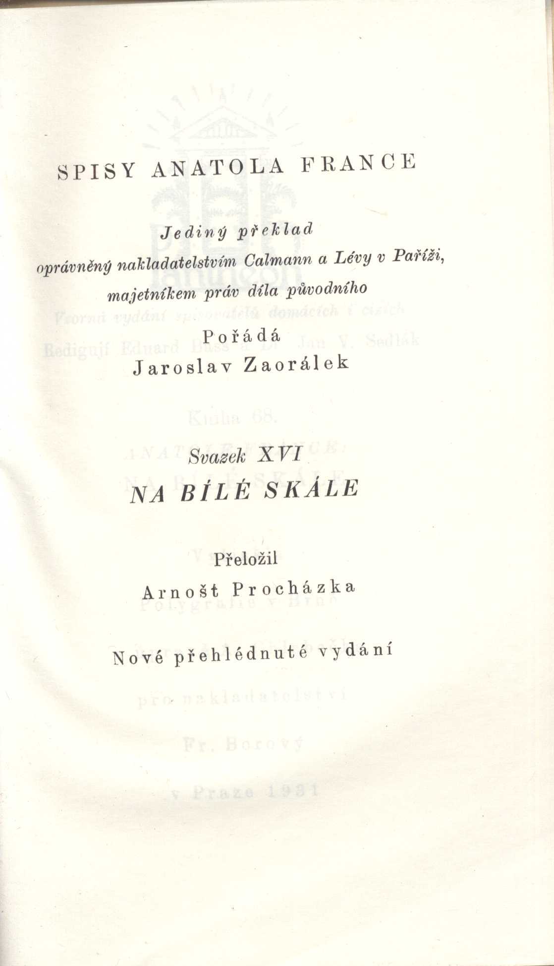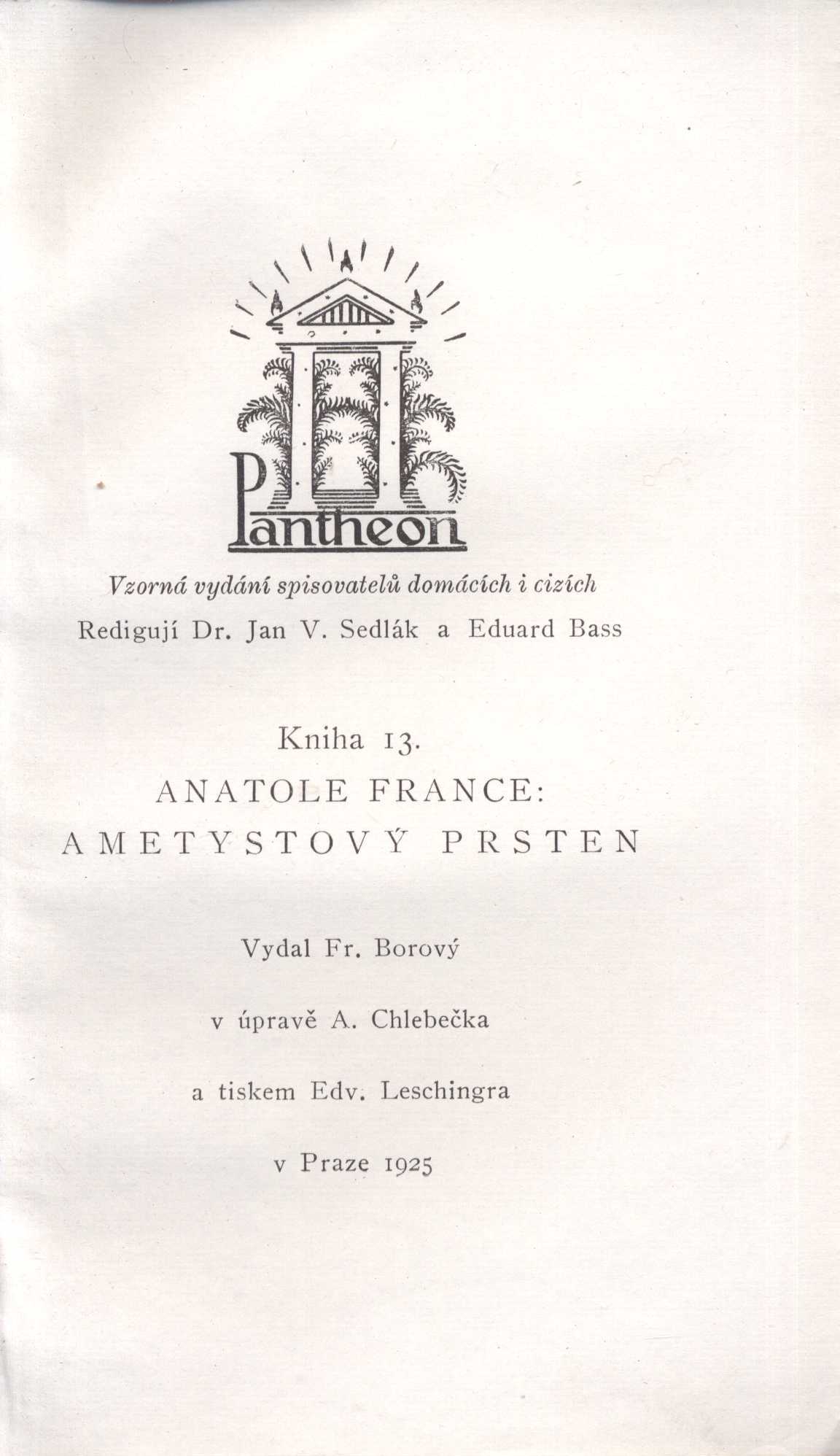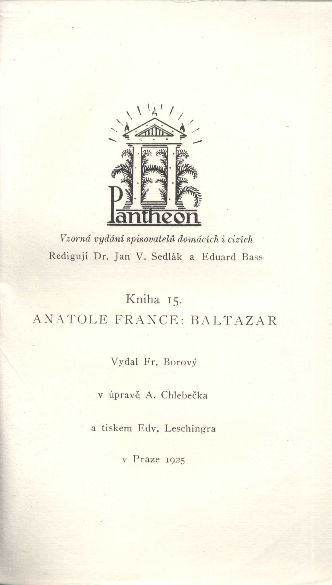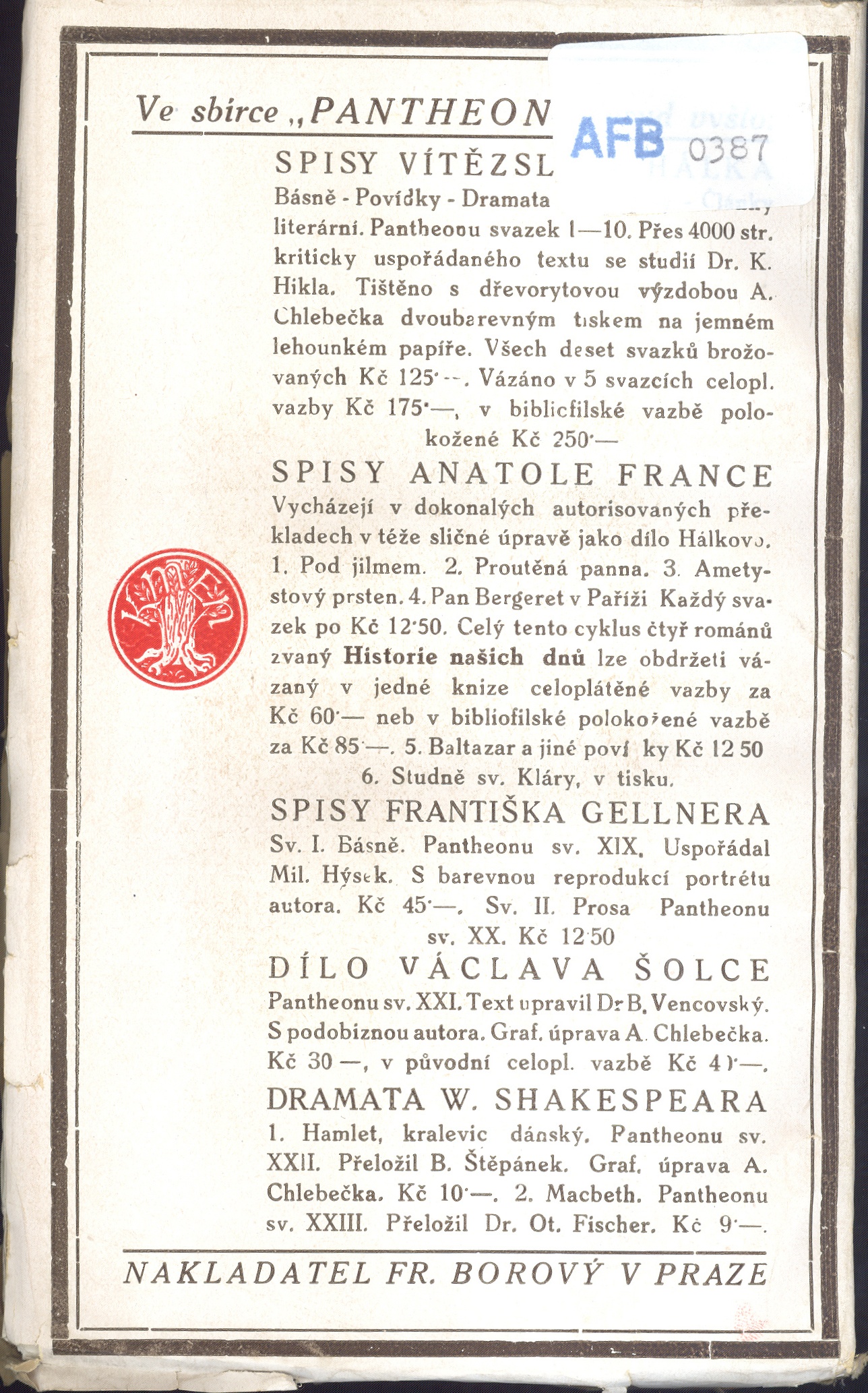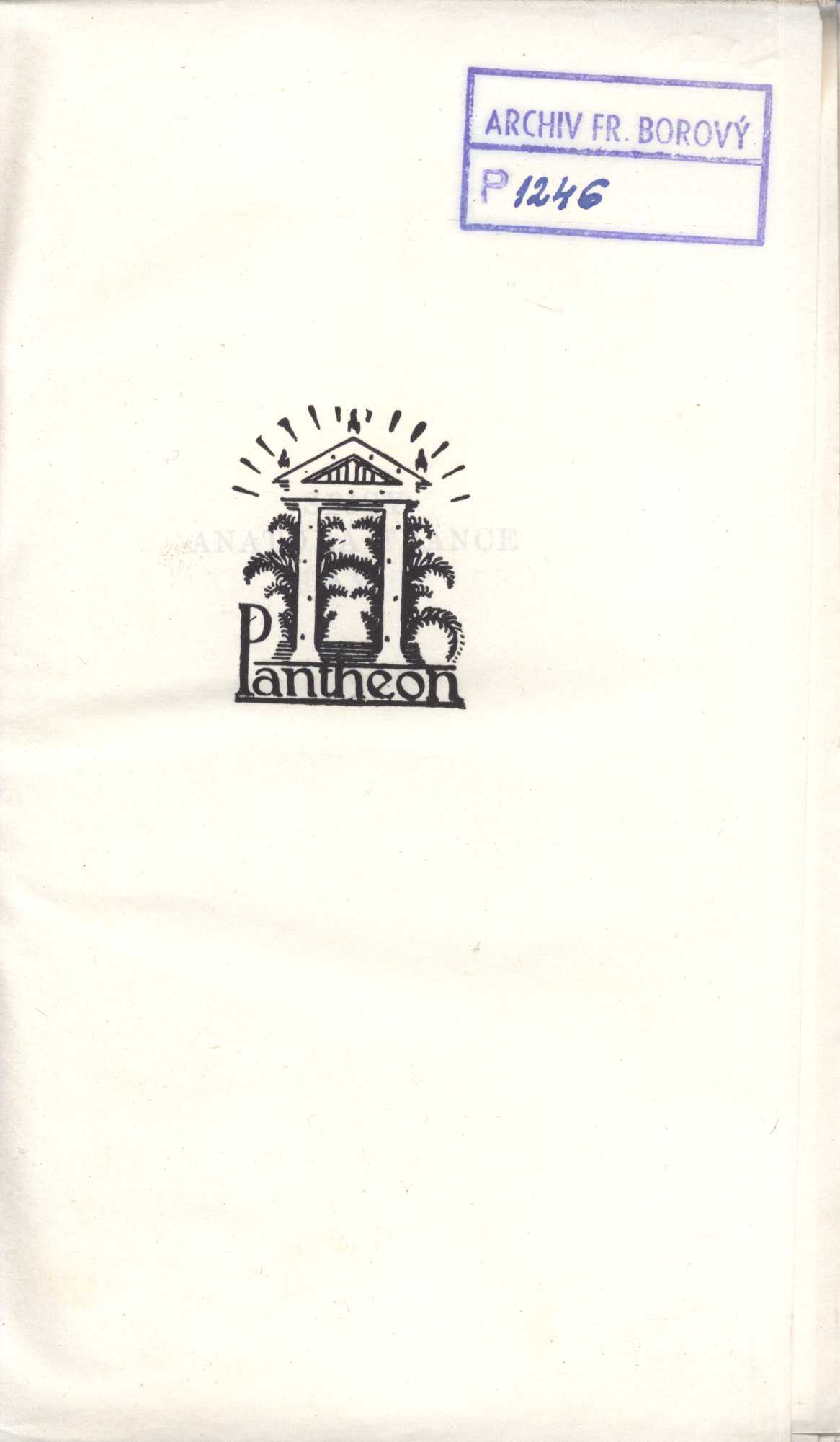 Názvové údaje Exposition Th.-A. Steinlen / préface par Anatole France Záhlaví-akce Exposition Th.-A. Steinlen (listopad - prosinec 1903 : L'Hôtel Thiers, Paříž) Další autoři France, Anatole, 1844-1924 (Autor úvodu atd.) Pelletan, Édouard, 1854-1912 (Nakladatel, vydavatel) Korp. Imprimerie nationale (tiskárna) (Tiskař) Nakladatel [S. l.] : Édouard Pelletan, 1903 Výrobce Imprimerie nationale) Rozsah 34 s. : il. Osobní hesla Steinlen, Théophile Alexandre, 1859-1923 - francouzský malíř a grafik Klíčová slova francouzská literatura * francouzské umění * francouzské výtvarné umění * francouzští umělci * katalogy výstav * katalog výstavy * výstava Počet ex. 1, z toho volných 1 Druh dok. monografie Signatura KaG II C 29 Názvové údaje Ametystový prsten : historie našich dnů 3 / Anatole France ; [přeložil Adolf Velhartický ; v úpravě A. Chlebečka] Osobní jméno France, Anatole, 1844-1924 (Autor) Další autoři Velhartický, Adolf, 1882-1932 (Překladatel) Chlebeček, Antonín, 1889- (Knižní grafik) Korp. Fr. Borový (firma) (Nakladatel, vydavatel) E. Leschinger (knihtiskař, nakladatel) (Tiskař) Nakladatel V Praze : Fr. Borový, 1925 Výrobce Edv. Leschinger) Rozsah 243 s. Klíčová slova francouzská literatura * francouzská próza * román Počet ex. 1, z toho volných 1 Druh dok. monografie Signatura AFB 2183 Názvové údaje Baltazar ; Perleťová schránka ; Studna svaté Kláry ; Sedm žen Modrovousových / Anatole France ; [z francouzských originálů přeložili a poznámkami opatřili Eduard Hodoušek a Miroslav Drápal ; verše přeložil Jindřich Pokorný ; doslov napsal Eduard Hodoušek ; graficky upravil František Muzika] Osobní jméno France, Anatole, 1844-1924 (Autor) Další autoři Hodoušek, Eduard, 1921-2004 (Překladatel) (Autor doslovu, tiráže atd.) Drápal, Miroslav, 1916-1991 (Překladatel) Pokorný, Jindřich, 1927-2014 (Překladatel) Muzika, František, 1900-1974 (Knižní grafik) Korp. Státní nakladatelství krásné literatury, hudby a umění (Nakladatel, vydavatel) Rudé právo (tiskárna, Praha) (Tiskař) Nakladatel Praha : Státní nakladatelství krásné literatury, hudby a umění, 1959 Výrobce (Rudé právo) Rozsah 526 s. Klíčová slova francouzská próza * povídky * povídky Počet ex. 1, z toho volných 1 Druh dok. monografie Signatura VMartínek 0312 Názvové údaje Baltazar a jiné povídky / Anatole France ; [přeložila M. Úlehlová-Tilschová ; v úpravě A. Chlebečka] Osobní jméno France, Anatole, 1844-1924 (Autor) Další autoři Úlehlová-Tilschová, Marie, 1896-1978 Chlebeček, Antonín, 1889- (Knižní grafik) Korp. Fr. Borový (firma) (Nakladatel, vydavatel) E. Leschinger (knihtiskař, nakladatel) (Tiskař) Nakladatel V Praze : Fr. Borový, 1925 Výrobce Edv. Leschinger) Rozsah 183 s. Klíčová slova francouzská literatura * francouzská próza * povídky Počet ex. 2, z toho volných 2 Druh dok. monografie Signatura N/A, AFB 2182 Názvové údaje Bibliofilská kniha : (prospekt) / Anatole France ; přeložil a vytiskl Jar. Picka Osobní jméno France, Anatole, 1844-1924 (Autor) Další autoři Krajc, Rudolf, 1907-1934 (Ilustrátor) (Autor podpisu) Samek, Svatopluk, 1885-1957 (Nakladatel, vydavatel) Veselský, Karel (Nakladatel, vydavatel) Stichenwirth, Jaroslav (Nakladatel, vydavatel) Lhota, Antonín (Nakladatel, vydavatel) Bureš, Josef (Nakladatel, vydavatel) Brož, Gustav (Nakladatel, vydavatel) Picka, Jaroslav, 1897-1957 (Tiskař) (Překladatel) Nakladatel V Praze : Gustav Brož ; Josef Bureš ; Antonín Lhota ; J. Picka ; Svatopluk Samek ; Jaroslav Stichewirth ; Karel Veselský, 1933 Výrobce V Praze : Jar. Picka, Rozsah 32 nečíslovaných stran : ilustrace ; 14 cm Klíčová slova francouzská literatura * esej * eseje * esejistické texty * bibliofilie * bibliofilové * bibliofilská vydání * bibliofilské tisky * bibliofilský tisk * bibliofilství * soukromé tisky * soukromý tisk Počet ex. 2, z toho volných 2 Druh dok. monografie Signatura P 136 G 36, AHO 0053 Názvové údaje Na bílé skále / Anatole France ; [přeložil Arnošt Procházka ; v úpravě A. Chlebečka] Osobní jméno France, Anatole, 1844-1924 (Autor) Další autoři Procházka, Arnošt, 1869-1925 (Překladatel) Chlebeček, Antonín, 1889- (Knižní grafik) Korp. Fr. Borový (firma) (Nakladatel, vydavatel) Polygrafia (nakladatelství a tiskárna, Brno) (Tiskař) Nakladatel V Praze : Fr. Borový, 1931 Výrobce Polygrafie) Rozsah 195 s. ; 17 cm Klíčová slova francouzská literatura * francouzská próza * román Počet ex. 1, z toho volných 1 Druh dok. monografie Signatura AFB 0694 Názvové údaje Bohové žíznějí / Anatole France ; [přeložil Jindřich Fleischner ; v úpravě A. Chlebečka] Osobní jméno France, Anatole, 1844-1924 (Autor) Další autoři Chlebeček, Antonín, 1889- (Grafický technik) Fleischner, Jindřich, 1879-1922 (Překladatel) Korp. Fr. Borový (firma) (Nakladatel, vydavatel) Studentská tiskárna (Praha) (Tiskař) (Tiskař obrazu) Nakladatel V Praze : nakladatel Fr. Borový, 1926 Výrobce (tiskem Studentské tiskárny v Praze) Rozsah 295, [4] s. : il. Klíčová slova francouzská literatura * próza * překlad * román * francouzská revoluce Počet ex. 1, z toho volných 1 Druh dok. monografie Signatura AFB 0387 Názvové údaje Bohové žíznějí / Anatol France ; přeložil Jindřich Fleischner ; [vyzdobil Miloš Klicman] Osobní jméno France, Anatole, 1844-1924 (Autor) Další autoři Fleischner, Jindřich, 1879-1922 (Signatář) Klicman, Miloš František, 1890-1957 (Grafický technik) Korp. Nakladatelství Kamilla Neumannová (Nakladatel, vydavatel) J. Skalák a spol. (Praha) (Tiskař) Nakladatel V Praze : Vydala Kamilla Neumannová, [1914] Výrobce Tiskárna J. Skaláka) Rozsah 240 s. Klíčová slova francouzská literatura * prózy * romány Počet ex. 1, z toho volných 1 Druh dok. monografie Signatura Hoffmeister 0375 Názvové údaje Cin