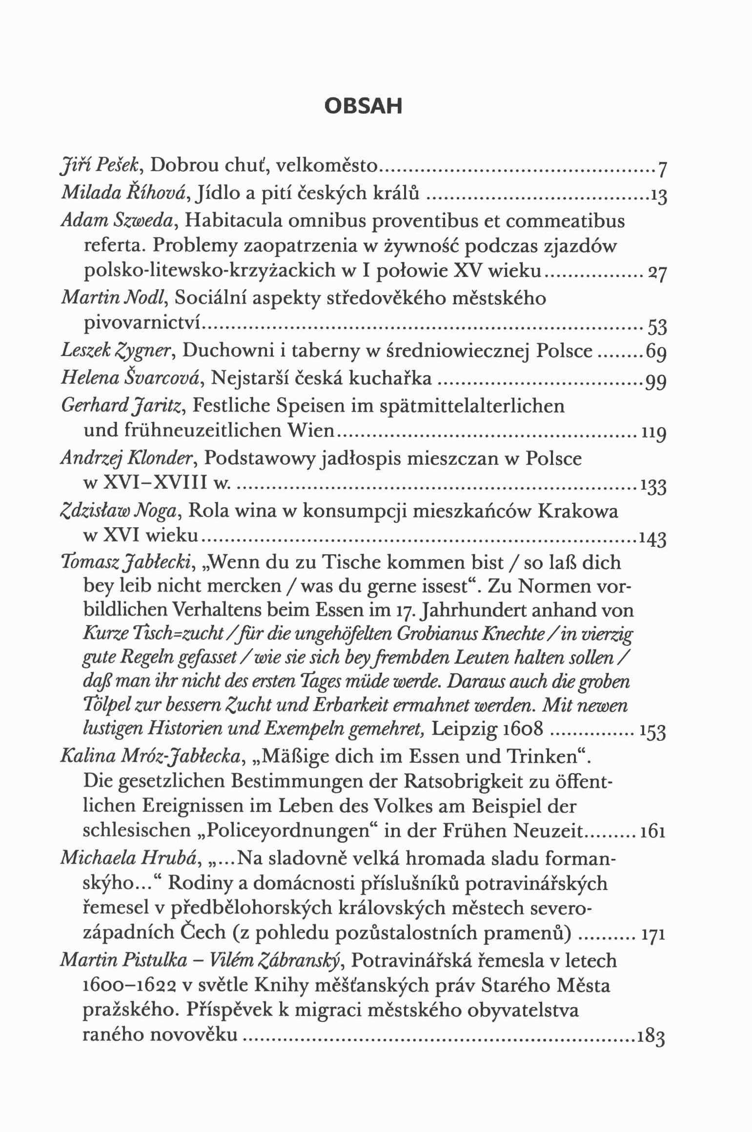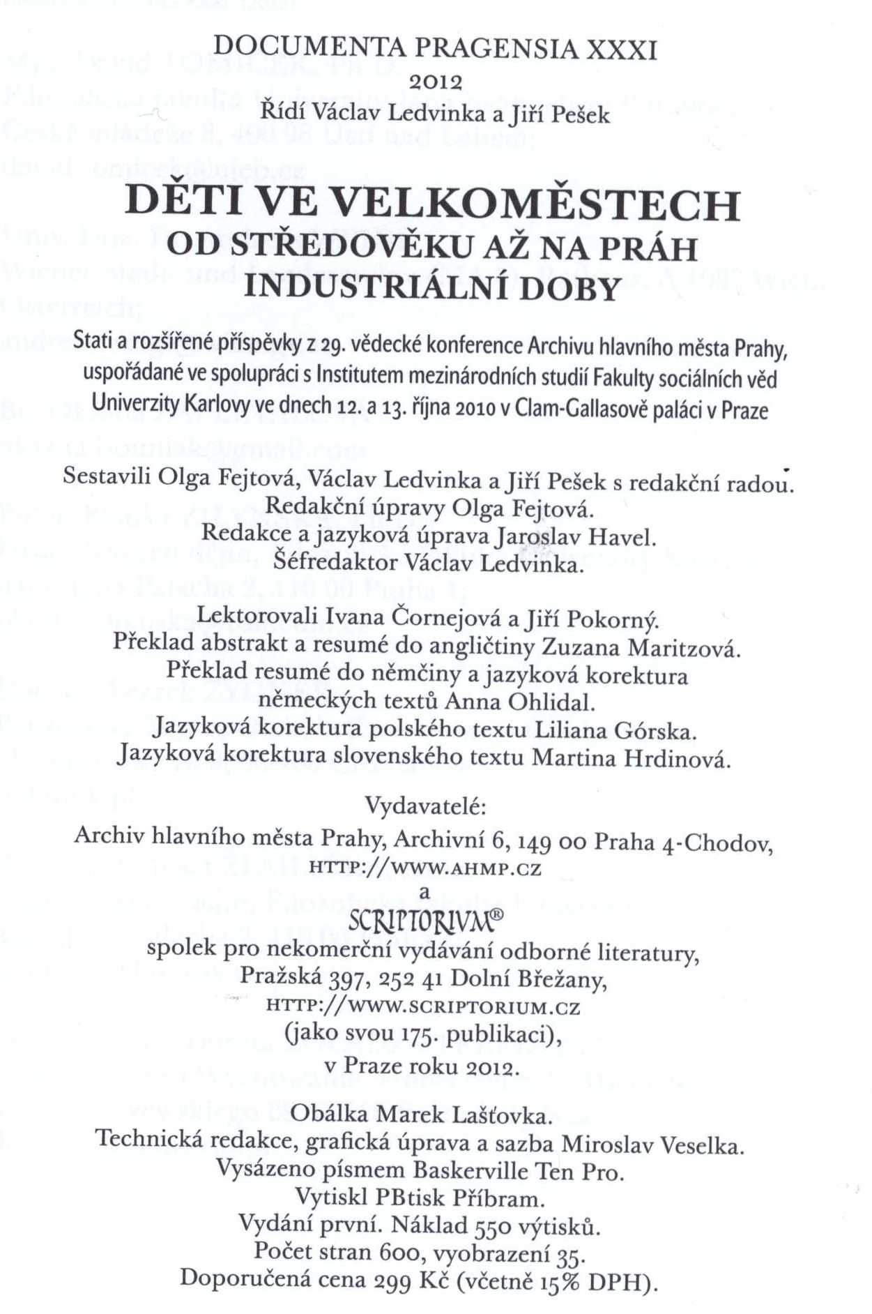 Názvové údaje Děti ve velkoměstech od středověku až na práh industriální doby : stati a rozšířené příspěvky z 29. vědecké konference Archivu hlavního města Prahy, uspořádané ve spolupráci s Institutem mezinárodních studií Fakulty sociálních věd Univerzity Karlovy ve dnech 12. a 13. října 2010 v Clam-Gallasově paláci v Praze / sestavili Olga Fejtová, Václav Ledvinka a Jiří Pešek s redakční radou ; [obálka Marek Lašťovka ; technická redakce, grafická úprava a sazba Miroslav Veselka] Záhlaví-akce Děti ve velkoměstech od středověku až na práh industriální doby (konference) (2010 : Praha, Česko) Další autoři Fejtová, Olga, 1962- (Sestavovatel, kompilátor) Ledvinka, Václav, 1947- (Sestavovatel, kompilátor) Pešek, Jiří, 1954- (Sestavovatel, kompilátor) Veselka, Miroslav (Knižní grafik) Lašťovka, Marek, 1968- (Autor obálky) Korp. Univerzita Karlova. Institut mezinárodních studií Clam-Gallasův palác (Praha, Česko) Nakladatel Praha : Scriptorium : Archiv hlavního města Prahy, 2012 Výrobce PBtisk) Rozsah 598 s. : il., faksim. ; 21 cm Klíčová slova děti * dětství * výchova dítěte * sociální poměry * velkoměsta * stol. 15.-19. * dějiny * sborníky z konferencí Počet ex. 1, z toho volných 1 Druh dok. monografie Signatura C12b 15071 Názvové údaje Dobrou chuť, velkoměsto : sborník příspěvků z 23. vědecké konference Archivu hlavního města Prahy, uspořádané ve spolupráci s Institutem mezinárodních studií Fakulty sociálních věd Univerzity Karlovy ve dnech 5. a 6. října 2004 v Clam-Gallasově paláci v Praze / sestavili Olga Fejtová, Václav Ledvinka a Jiří Pešek ; [překlad resumé do němčiny Anna Ohlídalová] Záhlaví-akce Dobrou chuť, velkoměsto (2004 : Praha, Česko) Další autoři Fejtová, Olga, 1962- (Sestavovatel, kompilátor) Ledvinka, Václav, 1947- (Sestavovatel, kompilátor) Pešek, Jiří, 1954- (Sestavovatel, kompilátor) Ohlídal, Anna, 1966- (Překladatel) Korp. Archiv hlavního města Prahy (Nakladatel, vydavatel) Univerzita Karlova. Institut mezinárodních studií Nakladatel Praha : Archiv hlavního města Prahy ; Dolní Břežany : Scriptorium, 2007 Rozsah 465 s. : il., portréty, faksim. Klíčová slova Praha * města * obyvatelstvo * způsob života * potraviny * gastronomie * zásobování * stravování * jídla * kuchyně * stol. 15.-20. * sborníky z konferencí Počet ex. 1, z toho volných 1 Druh dok. monografie Signatura C12b 14501 Názvové údaje Evropská velkoměsta mezi koncem války světové a války studené (1945-1989) : stati a rozšířené příspěvky z 28. vědecké konference Archivu hlavního města Prahy, uspořádané ve spolupráci s Institutem mezinárodních studií Fakulty sociálních věd Univerzity Karlovy ve dnech 6. a 7. října 2009 v Clam-Gallasově paláci v Praze / sestavili Olga Fejtová, Václav Ledvinka a Jiří Pešek s redakční radou Záhlaví-akce Evropská velkoměsta mezi koncem války světové a války studené (1945-1989) (konference) (2009 : Praha, Česko) Další autoři Fejtová, Olga, 1962- (Sestavovatel, kompilátor) Ledvinka, Václav, 1947- (Sestavovatel, kompilátor) Pešek, Jiří, 1954- (Sestavovatel, kompilátor) Korp. Archiv hlavního města Prahy (Nakladatel, vydavatel) Scriptorium, Spolek pro nekomerční vydávání odborné literatury (Nakladatel, vydavatel) Nakladatel Praha : Scriptorium : Archiv hlavního města Prahy, 2011 Rozsah 550 s. : il., mapy, portréty, plány, faksim. Klíčová slova Evropa * evropská velkoměsta * dějiny Evropy * společnost * mezinárodní politika * r. 1945-1989 * sborníky z konferencí Počet ex. 1, z toho volných 1 Druh dok. monografie Signatura C12b 13919 Názvové údaje Evropská velkoměsta za druhé světové války : každodennost okupovaného velkoměsta : Praha 1939-1945 v evropském srovnání / sestavili Olga Fejtová, Václav Ledvinka a Jiří Pešek s redakční radou Záhlaví-akce Evropská velkoměsta za druhé světové války (2005 : Praha, Česko) Další autoři Fejtová, Olga, 1962- (Sestavovatel, kompilátor) Ledvinka, Václav, 1947- (Sestavovatel, kompilátor) Pešek, Jiří, 1954- (Sestavovatel, kompilátor) Korp. Univerzita Karlova. Fakulta sociálních věd Archiv hlavního města Prahy (Nakladatel, vydavatel) Nakladatel Praha : Archiv hlavního města Prahy : Scriptorium, 2007 Rozsah 702 s. : il., faksim. Klíčová slova evropská velkoměsta * Evropa * německá okupace * 2. světová válka * každodenní život * kulturní poměry * společenské poměry * r. 1939-1945 * dějiny Evropy * sborníky z konferencí Počet ex. 1, z toho volných 1 Adr. el. zdr. obsah Druh dok. monografie Signatura C12b 14502 Názvové údaje Jednota bratrská v městech pražských v době předbělohorské a rejstřík členů pražského sboru / Olga Fejtová ; [grafická úprava, sazba a návrh obálky Marek Lašťovka] Osobní jméno Fejtová, Olga, 1962- (Autor) Další autoři Lašťovka, Marek, 1968- (Knižní grafik) (Sazeč) (Autor obálky) Korp. Archiv hlavního města Prahy (Nakladatel, vydavatel) Univerzita Jana Evangelisty Purkyně v Ústí nad Labem. Filozofická fakulta (Nakladatel, vydavatel) Scriptorium, Spolek pro nekomerční vydávání odborné literatury (Nakladatel, vydavatel) Nakladatel Praha : Archiv hlavního města Prahy ; Ústí nad Labem : Filozofická fakulta Univerzity Jana Evangelisty Purkyně ; Dolní Břežany : Scriptorium, 2014 Rozsah 207 s. : il., faksim. Heslo korporace (zkrác. heslo korp.) : Jednota bratrská (církev) Geografické heslo Praha (Česko) Klíčová slova evangelické sbory * čeští bratři * náboženský život * stát * církev * historické prameny * stol. 16.-17. * monografie * soupisy * reprodukce Počet ex. 2, z toho volných 2 Druh dok. monografie Signatura C12b 15184, C12b 15718 Názvové údaje "Chudé budete mít mezi sebou stále..." Od charity k sociální politice ve m