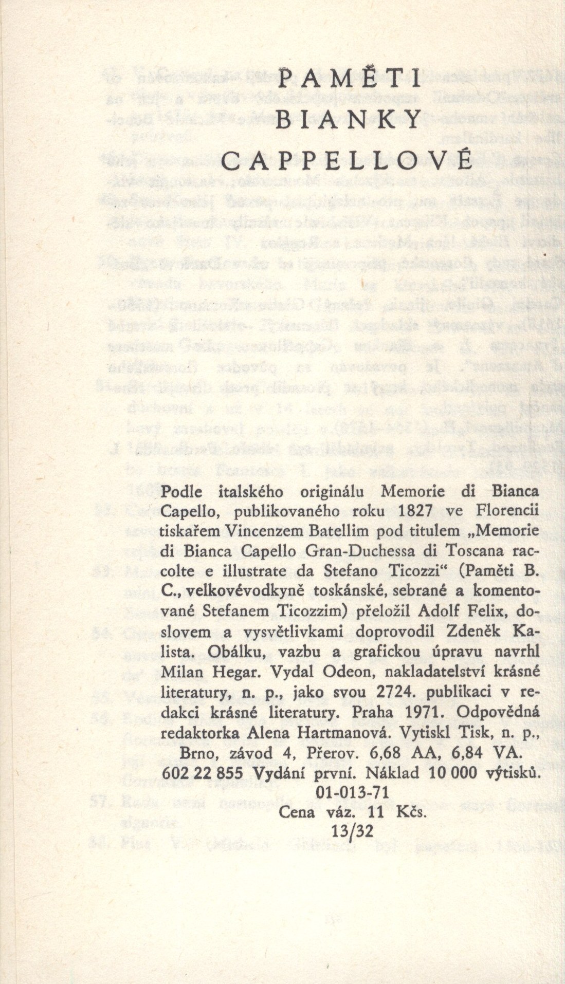 Názvové údaje Alkoholy / Guillaume Apollinaire ; [přeložil Zdeněk Kalista ; typograficky upravil Method Kaláb] Osobní jméno Apollinaire, Guillaume, 1880-1918 (Autor) Další autoři Kalista, Zdeněk, 1900-1982 (Překladatel) Kaláb, Method, 1885-1963 Šmidt, Vilém, 1908-1990 (Nakladatel, vydavatel) Nakladatel V Praze : V. Šmidt, 1946 Výrobce (Průmyslová tiskárna) Rozsah 70, [3] s. ; 8° Klíčová slova francouzská poezie * sbírka básní Počet ex. 1, z toho volných 1 Druh dok. monografie Signatura C12a 2345 Názvové údaje Alkoholy : (výbor) / Guillaume Apollinaire ; překlad Zdeněk Kalista Osobní jméno Apollinaire, Guillaume, 1880-1918 (Autor) Další autoři Kalista, Zdeněk, 1900-1982 (Překladatel) (Dedikátor) (Autor podpisu) Toyen, 1902-1980 (Ilustrátor) Štyrský, Jindřich, 1899-1942 (Typograf) Holan, Vladimír, 1905-1980 (Dedikant) Hořejší, Jindřich, 1886-1941 (Dedikant) Korp. Al. Jirout a K. Teytz (Praha) (Nakladatel, vydavatel) Kryl a Scotti (firma) (Tiskař) (Tiskař obrazu) Nakladatel Praha : Al. Jirout a K. Teytz, 1933 Výrobce [Nový Jičín] : Kryl a Scotti Rozsah 47 stran : ilustrace ; 21 cm Klíčová slova francouzská literatura * poezie * Apollinaire G. * sbírka básní * český překlad * Kalista Z. * číslovaný výtisk * bibliofilie Počet ex. 3, z toho volných 3 Druh dok. monografie Signatura Holan 1463, P 97 B 37, AHO 0340 Názvové údaje Básně / Guillaume Apollinaire ; souborné vydání českých překladů Karla Čapka, Jindřicha Hořejšího, Zdeňka Kalisty a Jaroslava Seiferta Osobní jméno Apollinaire, Guillaume, 1880-1918 (Autor) Další autoři Čapek, Karel, 1890-1938 (Překladatel) Hořejší, Jindřich, 1886-1941 (Překladatel) (Dedikátor) (Autor podpisu) Kalista, Zdeněk, 1900-1982 (Překladatel) Seifert, Jaroslav, 1901-1986 (Překladatel) Teige, Karel, 1900-1951 (Autor úvodu atd.) Toyen, 1902-1980 (Knižní grafik) (Ilustrátor) (Autor podpisu) Hořejší, Růžena, 1899- (Dedikant) Korp. Ústřední dělnické nakladatelství a knihkupectví (Nakladatel, vydavatel) Svoboda (Kladno) (Tiskař) (Tiskař obrazu) Nakladatel V Praze : Ústřední dělnické knihkupectví a nakladatelství, 1935 Výrobce V Kladně : tiskárna "Svobody" Rozsah 4 nečíslované strany, 97 stran : ilustrace ; 21 cm Osobní hesla Apollinaire, Guillaume, 1880-1918 - francouzský básník Klíčová slova Čapek K. * francouzská literatura * poezie * Apollinaire G. * básně * české překlady * Hořejší J. * Kalista Z. * Seifert J. * frontispis * Toyen * r. 1935 Počet ex. 2, z toho volných 2 Druh dok. monografie Signatura VZinková 0425, AHO 0341 Názvové údaje Básně / Guillaume Apollinaire ; souborné vydání českých překladů Karla Čapka, Jindřicha Hořejšího, Zdeňka Kalisty a Jaroslava Seiferta ; s předmluvou Karla Teiga ; v grafické úpravě Toyen Osobní jméno Apollinaire, Guillaume, 1880-1918 (Autor) Další autoři Čapek, Karel, 1890-1938 (Překladatel) Hořejší, Jindřich, 1886-1941 (Překladatel) Kalista, Zdeněk, 1900-1982 (Překladatel) Seifert, Jaroslav, 1901-1986 (Překladatel) Teige, Karel, 1900-1951 (Autor úvodu atd.) Toyen, 1902-1980 (Grafický technik) Korp. Ústřední dělnické nakladatelství a knihkupectví (Nakladatel, vydavatel) Svoboda (Kladno) (Tiskař) Nakladatel V Praze : Ústřední dělnické knihkupectví a nakladatelství, 1935 Výrobce V Kladně : tiskárna "Svobody" Rozsah 97 stran ; 21 cm Klíčová slova francouzská literatura * překlad * poezie * básně Počet ex. 2, z toho volných 2 Druh dok. monografie Signatura Holan 45, P 126 C 21 Názvové údaje Paměti Bianky Cappellové / podle italského originálu Memorie di Bianca Capello ... přeložil Adolf Felix Osobní jméno Cappello, Bianca, 1548-1587 (Autor) Další autoři Felix, Adolf, 1904-1987 (Překladatel) Kalista, Zdeněk, 1900-1982 (Autor doslovu, tiráže atd.) (Autor komentáře) Hegar, Milan, 1921-1987 (Autor obálky) (Výtvarník vazby) (Knižní grafik) Korp. Odeon (nakladatelství) (Nakladatel, vydavatel) Tisk Brno (tiskárna) (Tiskař) Unifikovaný název Memorie di Bianca Capello. Česky Nakladatel Praha : Odeon, 1971 Výrobce Přerov : Tisk, n. p., Brno Rozsah 158 stran ; 18 cm Osobní hesla Cappello, Bianca, 1548-1587 - toskánská vévodkyně, autorka memoárů Klíčová slova italská literatura * próza * paměti * Itálie * stol. 16. * překlad Počet ex. 1, z toho volných 1 Druh dok. monografie Signatura VZinková 0083 Názvové údaje Hrozny v sloupoví / Giosuĕ Carducci ; Z ital. orig. přel., předml. a vysvětl. naps. Zdeněk Kalista ; Graf. upr. František Muzika Osobní jméno Carducci, Giosue, 1835-1907 (Autor) Další autoři Kalista, Zdeněk, 1900-1982 (Překladatel) Muzika, František, 1900-1974 (Grafický technik) Nakladatel Praha : Odeon, 1955 Rozsah 196 [4] s. Osobní hesla Carducci, Giosue, 1835-1907 - italský lyrik, epik a literární kritik Klíčová slova italská literatura * poezie * výbor básní * stol. 19., léta 50.-80. Počet ex. 2, z toho volných 2 Druh dok. monografie Signatura C12a 1985, LK P 63 b 39 Názvové údaje Od pramenů Clitumna: výbor básní / Giosuè Carducci ; přeložil, úvodem a komentářem opatřil Zdeněk Kalista ; [obálku provedl František Sklář] Osobní jméno Carducci, Giosue, 1835-1907 (Autor) Další autoři Kalista, Zdeněk, 1900-1982 (Překladatel) (Autor úvodu atd.) Sklář, František, 1913- (Autor obálky) Korp. Nakladatelské družstvo Máje (Nakladatel, vydavatel) Rodina (Praha) (Tiskař) Nakladatel V Praze : Nakladatelské družstvo Máje, 1937 Výrobce (Rodina) Rozsah 76 s. Klíčová slova italská literatura * italská poezie Počet ex. 1, z toho volných 1 Druh dok. monografie Signatura VHB 1934 Názvové údaje Od pramenů Clitumna : výbor básní / Giosue Carducci ; přeložil, úvodem a komentářem opatřil Zdeněk Kalista Osobní jméno Carducci, Giosue, 1835-1907 (Autor) Další autoři Kalista, Zdeněk, 1900-1982 