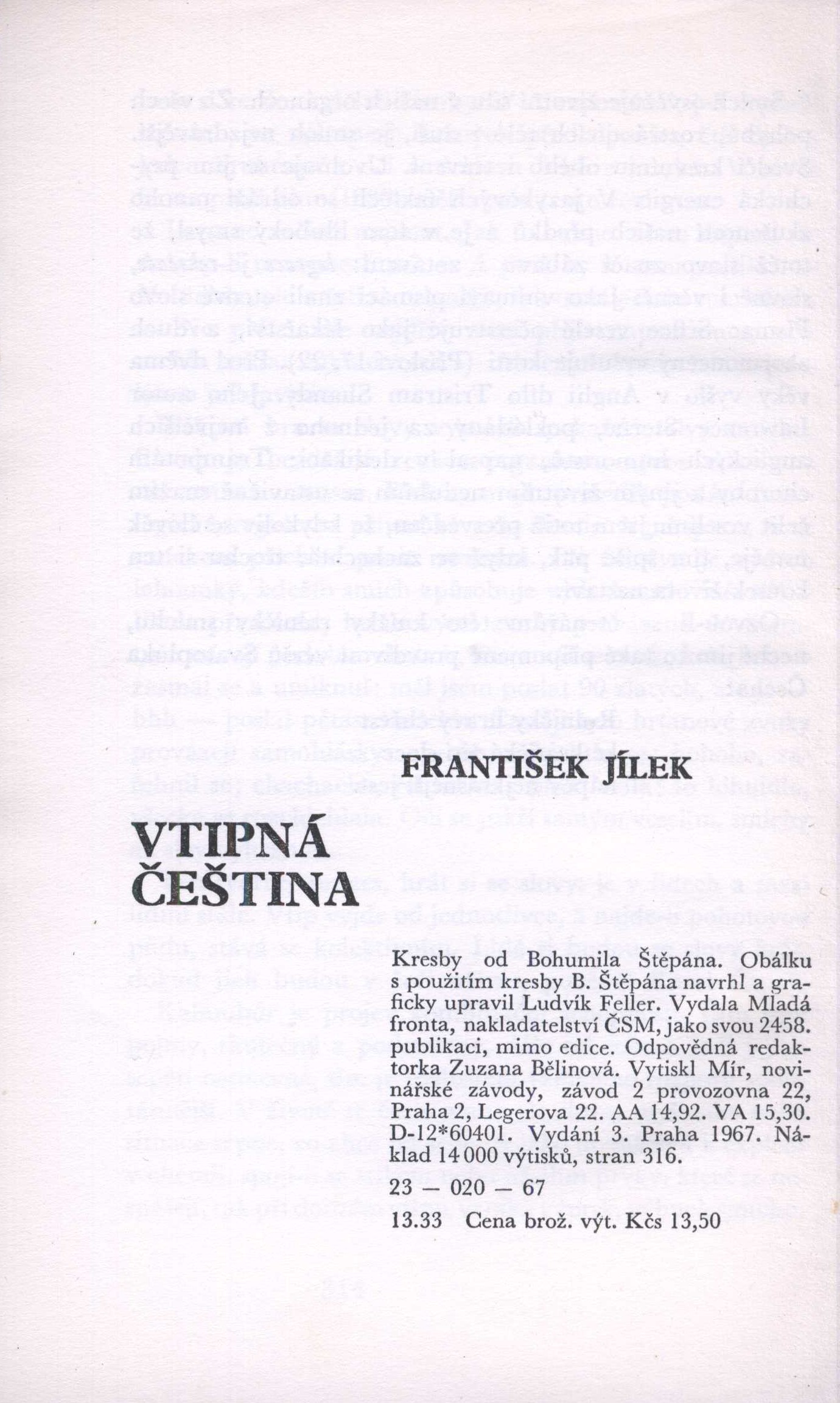 Názvové údaje Jazyk knih černých, jinak smolných / napsal Fr. Oberpfalcer Osobní jméno Jílek, František, 1890-1973 (Autor) Další autoři Česká akademie věd a umění (Nakladatel, vydavatel) Průmyslová tiskárna v Praze (Tiskař) Nakladatel V Praze : nákladem České akdemie věd a umění, 1925 Rozsah XIII, [1], 355, [1] s. Klíčová slova české dějiny * Čechy * právní prameny * úřední knihy * městské knihy * městský soud * městské úřední knihy * smolné knihy * černé knihy * lingvistika * lingvistická studie * jazykověda * jazykovědná studie * česká mluvnice * česká gramatika * česká lingvistika * gramatika * mluvnice * studie * stol. 16.-18. Počet ex. 2, z toho volných 2 Druh dok. monografie Signatura J M VIII 19, Resler 0079 Názvové údaje Babička : obrazy venkovského života / Božena Němcová ; [obálka a obrázky M. Vořechová-Vejvodová ; úvod Albert Pražák ; doslov František Oberpfalcer] Osobní jméno Němcová, Božena, 1820-1862 (Autor) Další autoři Pražák, Albert, 1880-1956 (Autor úvodu atd.) Jílek, František, 1890-1973 (Autor doslovu, tiráže atd.) Vořechová-Vejvodová, Marie, 1889-1974 (Ilustrátor) (Autor obálky) (Autor podpisu) Korp. Knihtiskárna Jar. Jiránka (Železný Brod, Česko) (Tiskař) Nakladatel Železný Brod : Jaroslav Jiránek, 1944 Rozsah 272, [4] s. : il. Klíčová slova česká literatura * česká próza * dětství * venkov * stol. 19., léta 50. Počet ex. 1, z toho volných 1 Druh dok. monografie Signatura KaG XLI F 12 Názvové údaje Divá Bára / Božena Němcová ; [obrázky Vlastimila Rady ; text přehlédl a po jazykové stránce opravil František Oberpfalcer] Osobní jméno Němcová, Božena, 1820-1862 (Autor) Další autoři Rada, Vlastimil, 1895-1962 (Ilustrátor) Jílek, František, 1890-1973 (Editor) Korp. Knihtiskárna Jar. Jiránka (Železný Brod, Česko) (Nakladatel, vydavatel) (Tiskař) Nakladatel V Železném Brodě : Jaroslav Jiránek, 1943 Rozsah 58 s. : il. ; 19 cm Klíčová slova česká literatura * stol. 19. * česká próza * venkov Počet ex. 3, z toho volných 3 Druh dok. monografie Signatura KaG XLI G2 13, VHB 0883, P 66 F 16 Názvové údaje Vtipná čeština / František Jílek ; kresby od Bohumila Štěpána ; obálku s použitím kresby B. Štěpána navrhl a graficky upravil Ludvík Feller Osobní jméno Jílek, František, 1890-1973 (Autor) Další autoři Štěpán, Bohumil, 1923-1985 (Ilustrátor) Feller, Ludvík, 1929- (Autor obálky) (Knižní grafik) Korp. Mladá fronta (nakladatelství) (Nakladatel, vydavatel) Mír, novinářské závody (tiskárna) (Tiskař) Nakladatel Praha : Mladá fronta, 1967 Výrobce Praha : Mír Rozsah 314 stran : ilustrace ; 20 cm Klíčová slova čeština * humor * příručky * populárně-naučné publikace Počet ex. 4, z toho volných 4 Druh dok. monografie Signatura BVolkova 0172, Holman-Březina 0459, Z B 1 d 43, M 42 e 26 Názvové údaje Česká sémantika / František Jílek ; Univerzita Karlova, Fakulta filologická Osobní jméno Jílek, František, 1890-1973 (Autor) Další autoři Univerzita Karlova (Nakladatel, vydavatel) Státní pedagogické nakladatelství (Nakladatel, vydavatel) Nakladatel Praha : Státní pedagogické nakladatelství, 1956 Rozsah 76 stran Klíčová slova český jazyk * filologie * jazykověda * sémantika * učební texty * učebnice vysokých škol Počet ex. 1, z toho volných 1 Druh dok. monografie Signatura R XVII f 34 Názvové údaje Česká stylistika / František Jílek Osobní jméno Jílek, František, 1890-1973 (Autor) Další autoři Státní pedagogické nakladatelství (Nakladatel, vydavatel) Nakladatel Praha : Státní pedagogické nakladatelství, 1957 Rozsah 57 stran Klíčová slova lingvistika * český jazyk * stylistika Počet ex. 2, z toho volných 2 Druh dok. monografie Signatura J Y I 76, K K I 62 Názvové údaje Čeština je jazyk vtipný / František Jílek ; ilustrace Josefa Lady Osobní jméno Jílek, František, 1890-1973 (Autor) Další autoři Lada, Josef, 1887-1957 (Ilustrátor) Korp. Mladá fronta (nakladatelství) (Nakladatel, vydavatel) Nakladatel Praha : Mladá fronta, 1958 Rozsah 248 stran : ilustrace Klíčová slova čeština * humor Počet ex. 1, z toho volných 1 Druh dok. monografie Signatura P 33 d 63 Názvové údaje Čeština je jazyk vtipný / František Jílek Osobní jméno Jílek, František, 1890-1973 (Autor) Další autoři Lada, Josef, 1887-1957 (Ilustrátor) Korp. Mladá fronta (nakladatelství) (Nakladatel, vydavatel) Nakladatel Praha : Mladá fronta, 1956 Rozsah 231 stran : ilustrace Klíčová slova český jazyk * jazykový styl * humor * čeština Počet ex. 1, z toho volných 1 Druh dok. monografie Signatura P 132 g 23 Názvové údaje J.A. Komenského milý a milostný jazyk otcovský / F. Oberpfalcer Osobní jméno Jílek, František, 1890-1973 (Autor) Další autoři Zora (nakladatelství) (Nakladatel, vydavatel) Nakladatel Praha : Zora, 1921 Rozsah 80 stran Osobní hesla Komenský, Jan Amos, 1592-1670 - pedagog, českobratrský teolog Klíčová slova český jazyk * vývoj jazyka * studie Počet ex. 1, z toho volných 1 Druh dok. monografie Signatura J V VII 21 Názvové údaje Jak žili naši otcové : mezi písmáky pod Krkonošemi / Fr. Jílek-Oberpfalcer ; dřevorytem vyzdobil Karel Štika Osobní jméno Jílek, František, 1890-1973 (Autor) Další autoři Štika, Karel, 1898-1978 (Ilustrátor) Korp. Josef Krbal (nakladatelství) (Nakladatel, vydavatel) Grafické závody V. a A. Janata (Tiskař) Nakladatel Vrchlabí : Nákladem Josefa Krbala, 1946 Výrobce V Novém Bydžově : Grafické závody V. & A. Janata Rozsah 344 stran, 32 stran obrazových příloh : ilustrace, fotografie ; 24 cm Klíčová slova etnografie * regionální literatura * regionální dějiny * kroniky * kronikáři * venkovský život * lidové zvyky * lidová slovesnost * Podkrkonoší * podkrkonošské nářečí * stol. 18.-20. Po