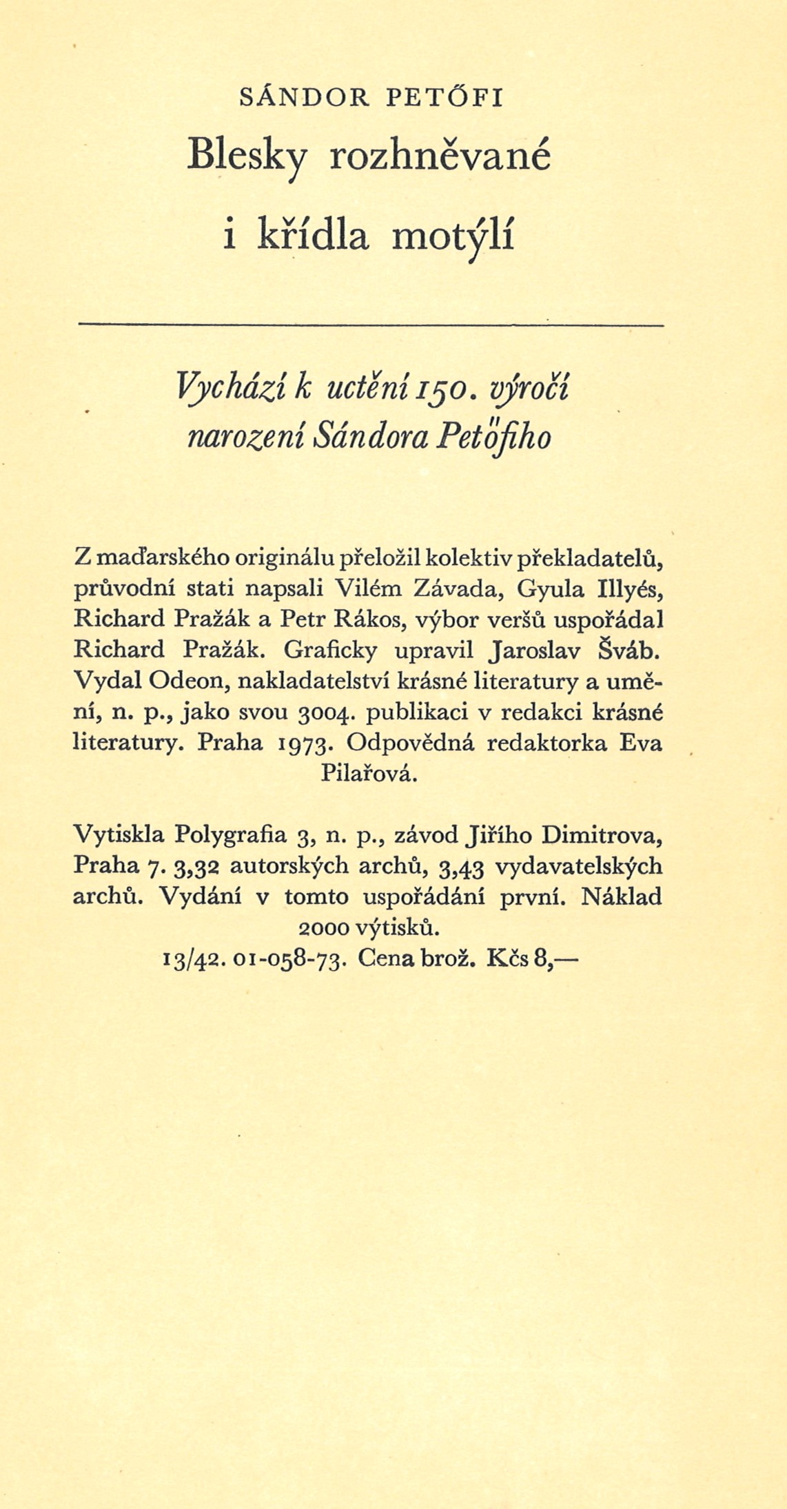 Názvové údaje Zvon v pustě : básně / János Arany ; z maďarských originálů výbor uspořádal a poznámkami doprovodil Ladislav Hradský ; přeložili Kamil Bednář a Ladislav Hradský ; předmluvu napsal Richard Pražák ; graficky upravil František Muzika Osobní jméno Arany, János, 1817-1882 (Autor) Další autoři Bednář, Kamil, 1912-1972 (Překladatel) (Dedikátor) Hradský, Ladislav, 1911-1987 (Překladatel) Pražák, Richard, 1931-2010 (Autor úvodu atd.) Holan, Vladimír, 1905-1980 (Dedikant) Korp. Státní nakladatelství krásné literatury, hudby a umění (Nakladatel, vydavatel) Nakladatel Praha : Státní nakladatelství krásné literatury, hudby a umění 1957 Rozsah 154 stran Klíčová slova maďarská literatura * maďarští básníci * epická poezie * epické skladby * lyrická poezie * lyrické básně * balady Počet ex. 1, z toho volných 1 Druh dok. monografie Signatura Holan 603 Názvové údaje Česko-maďarské kulturní vztahy od osvícenství do roku 1848 / Richard Pražák ; Obálka Luboš Červinka Osobní jméno Pražák, Richard, 1931-2010 (Autor) Další autoři Červinka, Lubomír, 1955- (Grafický technik) Nakladatel Brno : Masarykova univerzita, [1994] Výrobce Knihtiskárna Strojil) Rozsah 143 s. ; 24 cm Klíčová slova Čechy * Maďarsko * česko-maďarské vztahy * dějiny * politický vývoj * osvícenství * národní obrození Počet ex. 1, z toho volných 1 Druh dok. monografie Signatura M 220 b 59 Názvové údaje Josef Dobrovský : hungarista a ugrofinista / Richard Pražák ; Michal Kovář (ed.) ; grafická koncepce edice a návrh obálky Pavel Křepela Osobní jméno Pražák, Richard, 1931-2010 (Autor) Další autoři Kovář, Michal, 1974- (Editor) Křepela, Pavel, 1969- (Knižní grafik) Korp. Masarykova univerzita (Brno, Česko) (Nakladatel, vydavatel) Tiskárna Knopp (Tiskař) Nakladatel Brno : Masarykova univerzita, 2019 Výrobce Nové Město nad Metují : Tiskárna Knopp, s.r.o. Rozsah 122 stran : 1 portrét ; 25 cm Osobní hesla Dobrovský, Josef, 1753-1829 - katolický kněz, filolog, politický, kulturní, literární a církevní historik Klíčová slova hungaristé * ugrofinisté * ugrofinistika * hungaristika * Česko * stol. 18.-19. * Česko * střední Evropa * Maďarsko * kulturní vztahy * mezinárodní spolupráce * stol. 18.-19. * studie Počet ex. 1, z toho volných 1 Druh dok. monografie Signatura LITc 0020 Názvové údaje Bibliografie československé balkanistiky za léta 1966-1968 : určeno pro posluchače filosofických a pedagogogických fakult / sestavili Ivan Dorovský, Richard Pražák a Vladimír Šaur ; k vydání připravila Marta Romportlová Další autoři Pražák, Richard, 1931-2010 (Sestavovatel, kompilátor) Šaur, Vladimír, 1937-2014 (Sestavovatel, kompilátor) Dorovský, Ivan, 1935-2021 (Sestavovatel, kompilátor) Romportlová, Marta, 1939- (Editor) Korp. Univerzita J.E. Purkyně v Brně (Nakladatel, vydavatel) Nakladatel Brno : Univerzita J.E. Purkyně, 1970 Rozsah 83 s. ; 4° Klíčová slova balkánské země * střední Evropa * jihovýchodní Evropa * východní Evropa * literatura * r. 1966-1968 * bibliografie Počet ex. 1, z toho volných 1 Druh dok. monografie Signatura M 78 a 18 Názvové údaje Blesky rozhněvané i křídla motýlí / Sándor Petöfi ; z maďarského originálu přeložil kolektiv překladatelů ; průvodní stati napsali Vilém Závada, Gyula Illyés, Richard Pražák a Petr Rákos ; výbor veršů uspořádal Richard Pražák ; graficky upravil Jaroslav Šváb Osobní jméno Petőfi, Sándor, 1823-1849 (Autor) Další autoři Závada, Vilém, 1905-1982 (Autor) Illyés, Gyula, 1902-1983 (Autor) Pražák, Richard, 1931-2010 (Autor) (Editor) Rákos, Petr, 1925-2002 (Autor) Šváb, Jaroslav, 1906-1999 (Knižní grafik) Korp. Odeon (nakladatelství) (Nakladatel, vydavatel) Polygrafia (tiskárna, Praha) (Tiskař) Nakladatel Praha : Odeon, 1973 Výrobce Praha : Polygrafia 3, n.p. Klíčová slova maďarská literatura * překlad * jubilejní tisk * poezie * výbor básní * milostné básně * revoluční básně * vlastenecké básně Počet ex. 1, z toho volných 1 Druh dok. monografie Signatura P 2 G 7 Názvové údaje Dva žebraví studenti / Kálmán Mikszáth ; z maďarského původního vydání ... přeložil Ladislav Hradský ; předmluvu a doslov napsal, poznámkami opatřil Richard Pražák ; ilustrace Alena Kaftanová ; obálku navrhl Václav Bláha Osobní jméno Mikszáth, Kálmán, 1847-1910 (Autor) Další autoři Hradský, Ladislav, 1911-1987 (Překladatel) Pražák, Richard, 1931-2010 (Autor úvodu atd.) (Autor doslovu, tiráže atd.) Kaftanová, Alena, 1934- (Ilustrátor) Bláha, Václav, 1922-2021 (Autor obálky) Korp. Státní nakladatelství dětské knihy (Nakladatel, vydavatel) Severografia Liberec (tiskárna) (Tiskař) Nakladatel Praha : Státní nakladatelství dětské knihy, 1961 Výrobce Liberec : Severografia, n.p. Rozsah 173 stran : ilustrace ; 21 cm Klíčová slova maďarská literatura * maďarská próza * maďarský román Počet ex. 1, z toho volných 1 Adr. el. zdr. http://krameriusndk.nkp.cz/search/handle/uuid:23ee50a0-880d-11e3-bd09-005056827e51 Druh dok. monografie Signatura JVladislav 451 Názvové údaje Orel v Pešti / Sándor Bródy ; z maďarských originálů ... vybrala a přeložila Anna Rossová ; předmluvu napsal Richard Pražák ; podle grafické osnovy Františka Muziky připravila Hana Keslová Osobní jméno Bródy, Sándor, 1863-1924 (Autor) Další autoři Pražák, Richard, 1931-2010 (Autor úvodu atd.) Rossová, Anna, 1925-1995 (Sestavovatel, kompilátor) (Překladatel) Keslová, Hana (Knižní grafik) Korp. Odeon (nakladatelství) (Nakladatel, vydavatel) Východočeské tiskárny (Tiskař) Nakladatel Praha : Odeon, 1989 Výrobce Havlíčkův Brod : Východočeské tiskárny, závod 4 Rozsah 339 stran ; 17 cm Klíčová slova maďarská literatura * maďarská próza * maďarský román * povídky