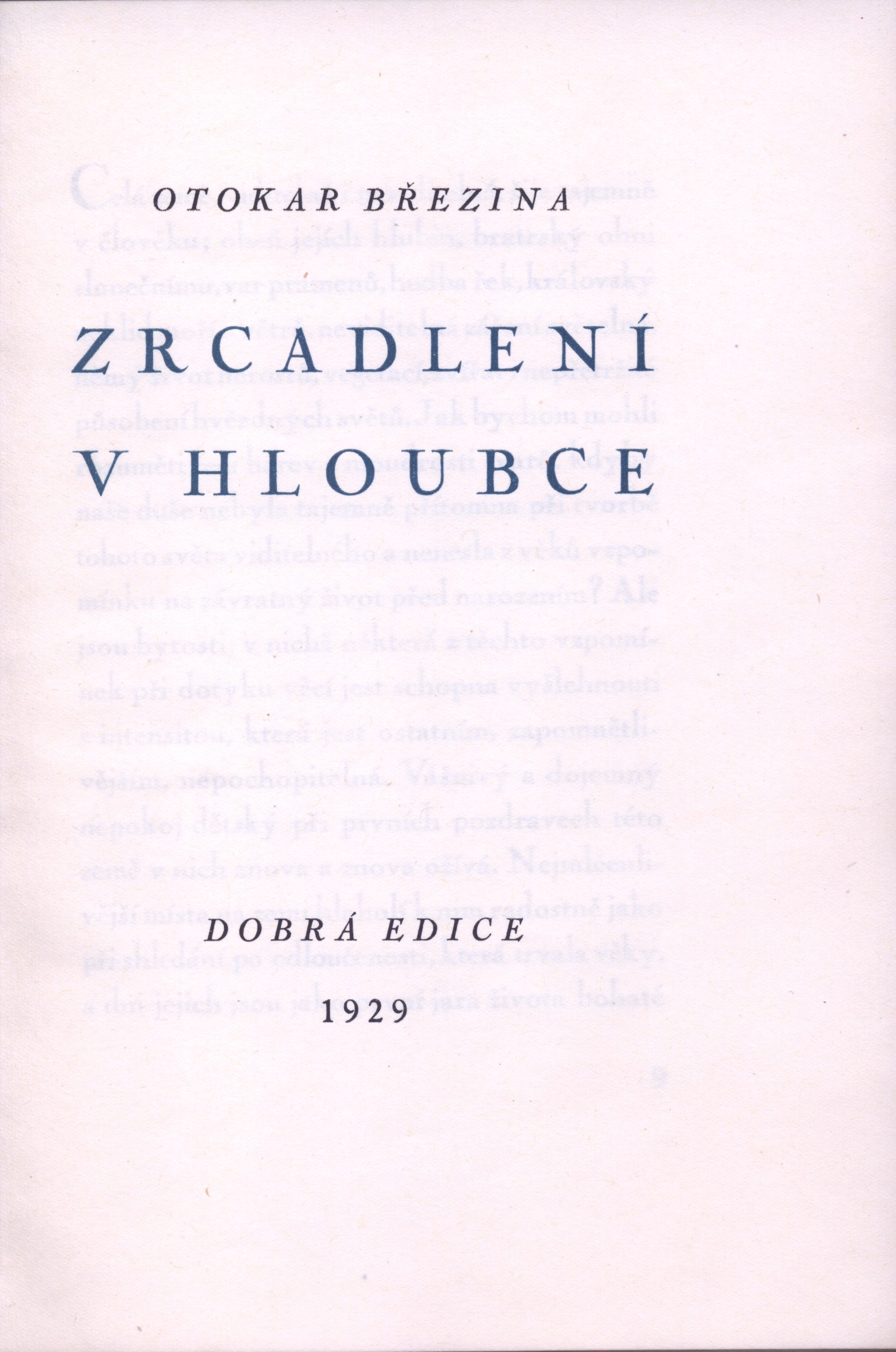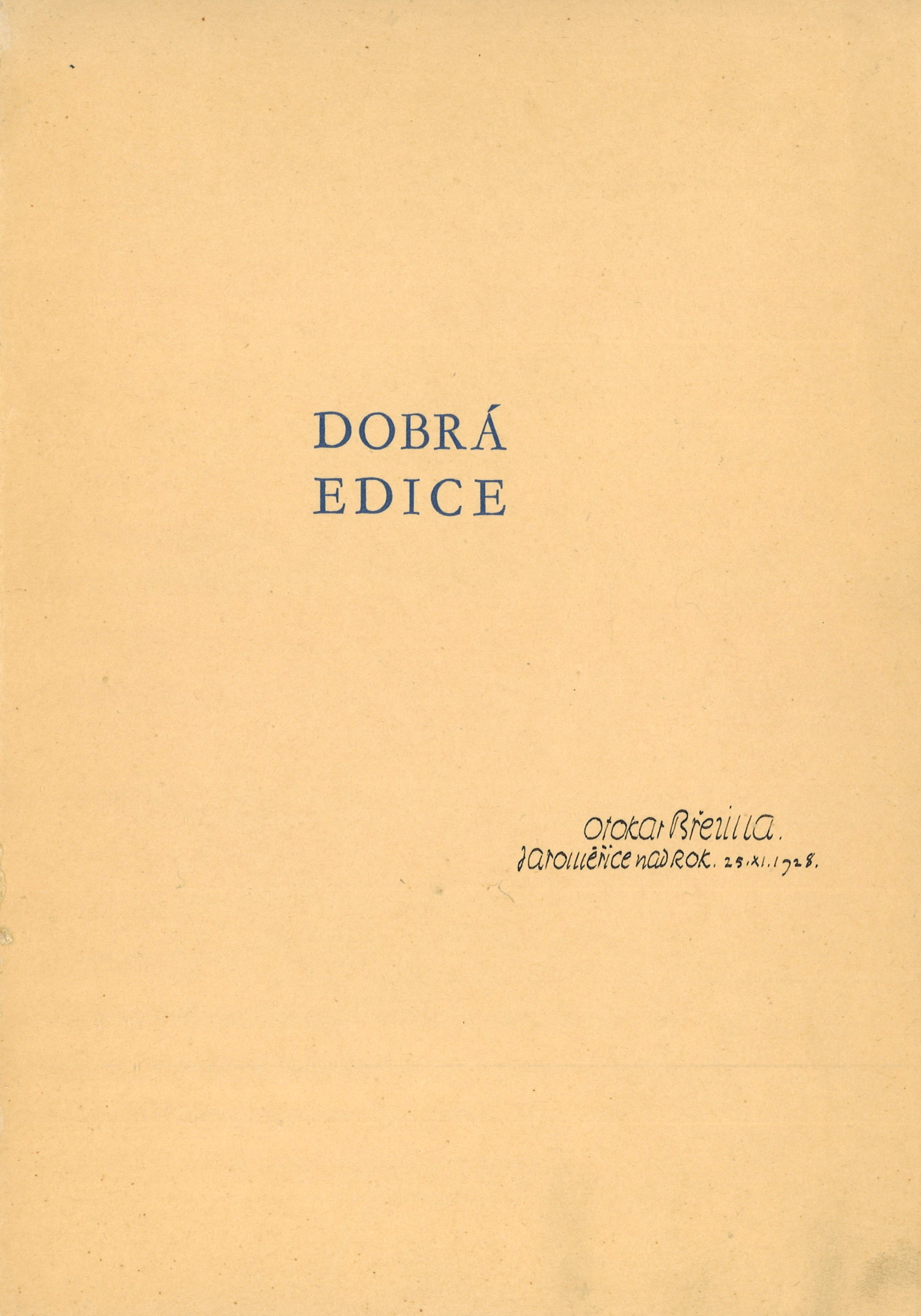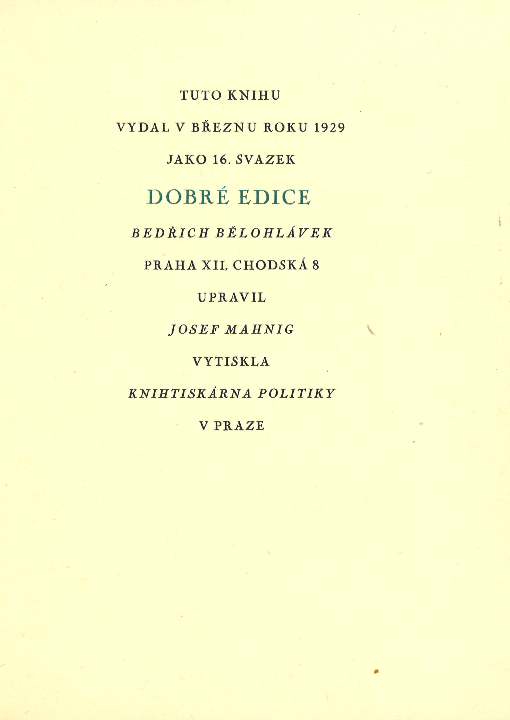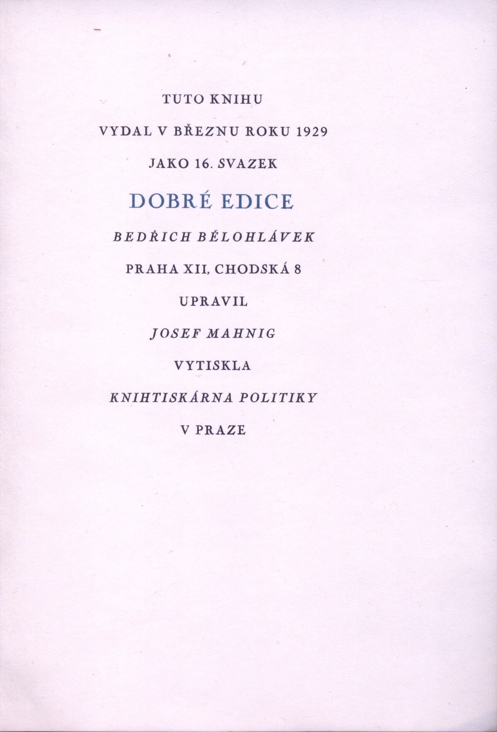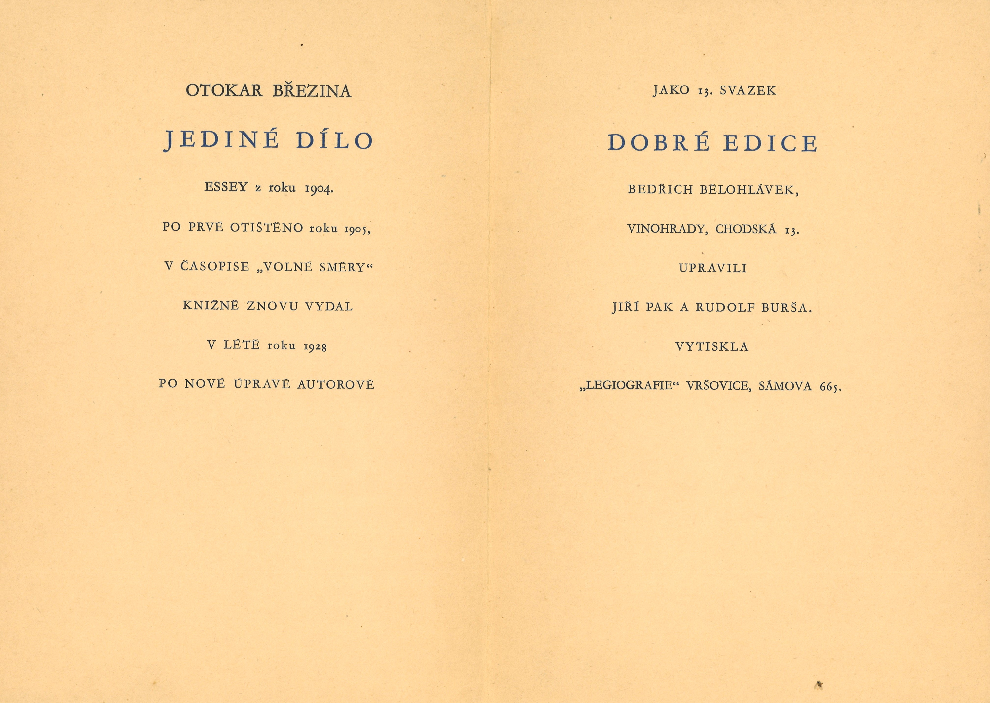 Názvové údaje Jaroslav Jeremiáš : doba - život - dílo / Bedřich Bělohlávek Osobní jméno Bělohlávek, Bedřich, 1902-1991 (Autor) (Dedikátor) Další autoři Karásek ze Lvovic, Jiří, 1871-1951 (Dedikant) Korp. L. Mazáč (nakladatelství) (Nakladatel, vydavatel) Palásek a Kraus (firma) (Tiskař) Nakladatel Praha : L. Mazáč, 1935 Výrobce (V. Palásek a Frant. Kraus) Rozsah 268 s. Osobní hesla Jeremiáš, Jaroslav, 1889-1919 - český hudební skladatel Klíčová slova česká literatura * česká hudba * hudební skladatelé * skladatelé * skladatel * monografie * životopis Počet ex. 1, z toho volných 1 Druh dok. monografie Signatura KaG XV C 183 Názvové údaje Otevřené srdce / Bedřich Bělohlávek Osobní jméno Bělohlávek, Bedřich, 1902-1991 (Autor) Další autoři Bělohlávek, Bedřich, 1902-1991 (Dedikátor) Jeřábek, Josef, 1877-1957 (Dedikant) Nakladatel Praha : vl.n., 1927 Rozsah [Nestr.] Osobní hesla Bělohlávek, Bedřich, 1902-1991 - hudební kritik, redaktor * Jeřábek, Josef, 1877-1957 - pedagog, matematik, znalec hudebního umění Klíčová slova česká literatura * poezie * intimní lyrika * r. 1923-1927 Počet ex. 1, z toho volných 1 Druh dok. monografie Signatura C12a 1424 Názvové údaje Hudba pramenů / Otakar Březina ; obrazy doprovodil František Bílek Osobní jméno Březina, Otokar, 1868-1929 (Autor) (Dedikátor) (Autor podpisu) Další autoři Bílek, František, 1872-1941 (Ilustrátor) Durych, Jaroslav, 1886-1962 (Dedikant) Holman, Petr, 1951-2019 (Korektor tištěných materiálů) Bělohlávek, Bedřich, 1902-1991 (Autor podpisu) Korp. Odkaz (nakladatelství) (Nakladatel, vydavatel) Lidová knihtiskárna J. Skalák a spol. (Tiskař) Nakladatel V Praze : nákladem Vydavatelského sdružení Odkaz, 1918 Výrobce Lidová knihtiskárna J. Skalák a spol. Rozsah 51 stran, 10 nečíslovaných listů obrazových příloh : ilustrace ; 23 cm Klíčová slova česká próza * filozofie umění * idealismus * symbolismus (literatura) * eseje Počet ex. 7, z toho volných 7 Druh dok. monografie Signatura P 138 d 12, P 138 d 13, P 36 b 50, P 66 B 7, Holman-Březina 0242, Holman-Březina 0243, Holman-Březina 0245 Názvové údaje Jediné dílo / Otokar Březina ; upravili Jiří Pak a Rudolf Burša Osobní jméno Březina, Otokar, 1868-1929 (Autor) (Dedikátor) (Autor podpisu) Další autoři Pak, Jiří (Typograf) Burša, Rudolf (Typograf) Bělohlávek, Bedřich, 1902-1991 (Nakladatel, vydavatel) (Dedikant) Korp. Legiografie (tiskárna) (Tiskař) Nakladatel Praha : Bedřich Bělohlávek, 1928 Výrobce Vršovice : Legiografie Rozsah 14 nečíslovaných stran ; 25 cm Klíčová slova česká literatura * filozofická esej * bibliofilie * stol. 20., léta 20. * bibliofilský tisk Počet ex. 6, z toho volných 6 Druh dok. monografie Signatura VHB 1446, P 86 B 5, P 134 A 18, Holman-Březina 0305, Holman-Březina 0311, C12c 5762 Názvové údaje Přítomnost / Otokar Březina ; v úpravě Jiřího Paka a Stanislava Rocha Osobní jméno Březina, Otokar, 1868-1929 (Autor) (Dedikátor) (Autor podpisu) Další autoři Pak, Jiří (Typograf) Roch, Stanislav (Typograf) Bělohlávek, Bedřich, 1902-1991 (Nakladatel, vydavatel) Korp. Legiografie (tiskárna) (Tiskař) Nakladatel Vinohrady : Bedřich Bělohlávek, 1927 Výrobce Vršovice : Legiografie Rozsah 19 nečíslovaných stran ; 25,5 cm Klíčová slova česká literatura * filozofická esej * stol. 20., léta 20. * bibliofilie Počet ex. 6, z toho volných 6 Druh dok. monografie Signatura KaG XVI C 265, VHB 1447, P 134 a 20, Holman-Březina 0286, Holman-Březina 0294, Holman-Březina 0295 Názvové údaje Zrcadlení v hloubce / Otakar Březina ; upravil Josef Mahnig Osobní jméno Březina, Otokar, 1868-1929 (Autor) Záhlaví-korpor. Politika (tiskárna, nakladatelství) (Tiskař) Další autoři Mahnig, Josef (Knižní grafik) Bělohlávek, Bedřich, 1902-1991 (Nakladatel, vydavatel) Korp. Politika (tiskárna, nakladatelství) (Tiskař) Nakladatel Praha : Bedřich Bělohlávek, 1929 Výrobce Knihtiskárna Politiky Rozsah 23 stran ; 25,5 cm Klíčová slova česká literatura * próza * eseje * stol. 20., léta 20. Počet ex. 6, z toho volných 6 Druh dok. monografie Signatura OŘíha 337, P 85 C 7, P 15 B 68, P 134 A 19, Sáňka 2322, Holman-Březina 0308 Názvové údaje Bratři Karamazovi : text k opeře o třech dějstvích / Otokar Jeremiáš, Jaroslav Maria ; podle románu F. M. Dostojevského Osobní jméno Jeremiáš, Otakar, 1892-1962 (Autor) Další autoři Maria, Jaroslav, 1870-1942 (Autor) Dostojevskij, Fedor Michajlovič, 1821-1881 (Bibliografický předchůdce) Bělohlávek, Bedřich, 1902-1991 (Nakladatel, vydavatel) Nakladatel Praha : Bedřich Bělohlávek, 1928 Rozsah 71 stran Klíčová slova opera * operní libreta * texty Počet ex. 5, z toho volných 5 Druh dok. monografie Signatura P 89 e 51, P 133 f 71, P 48 b 108, Eisner 608, P 124 e 22 Názvové údaje Pastýř na horách : [básně z roku 1927] / Jan Jiří ; v úpravě Rudolfa Buršy a Jiřího Paka Osobní jméno Jiří, Jan, 1905- (Autor) Další autoři Burša, Rudolf (Knižní grafik) Pak, Jiří (Knižní grafik) Bělohlávek, Bedřich, 1902-1991 (Nakladatel, vydavatel) Korp. Legiografie (tiskárna) (Tiskař) Nakladatel Praha : Bedřich Bělohlávek, 1928 Výrobce Legiografie Rozsah 18 nečíslovaných stran Klíčová slova česká poezie * básně Počet ex. 5, z toho volných 5 Druh dok. monografie Signatura P II c 24, P 76 a 5, P 77 c 81, P 115 a 25, P 129 e 26 Názvové údaje Sierra Ventana : [básně z roku 1928] / Jan Jiří ; obálku a kresby kreslil Carlos Völlmer Osobní jméno Jiří, Jan, 1905- (Autor) Další autoři Bělohlávek, Bedřich, 1902-1991 (Nakladatel, vydavatel) Korp. Politika (tiskárna, nakladatelství) (Tiskař) Nakladatel Praha : Bedřich Bělohlávek, 1929 Výrobce Politika Rozsah 32 stran Klíčová slova česká poezie * básně * r. 1928 Počet ex. 3, z toho volných 3 D