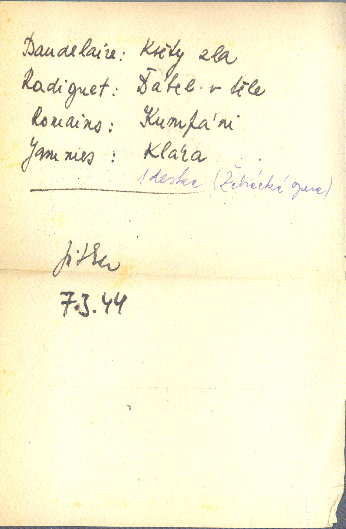 Názvové údaje Lounsko v díle Karla Konráda a Konstantina Biebla / Otakar Bartoš ; [přebal Bohdan Kopecký ; grafická úprava Václav Rykr] Osobní jméno Bartoš, Otakar, 1928-1995 (Autor) (Dedikátor) Další autoři Kopecký, Bohdan, 1928-2010 (Autor obálky) Rykr, Václav Bernard, 1927-1991 (Knižní grafik) Slabý, Zdeněk Karel, 1930-2020 (Dedikant) Nakladatel V Ústí nad Labem : Krajské nakladatelství, 1960 Výrobce Severografia) Rozsah 53 s. : il. Osobní hesla Konrád, Karel, 1899-1971 - redaktor, publicista, prozaik, dramatik * Biebl, Konstantin, 1898-1951 - básník a prozaik Klíčová slova česká literatura * čeští spisovatelé * Lounsko * dílo * stol. 20. * literární náměty * Konrád K. * Biebl K. * studie Počet ex. 1, z toho volných 1 Druh dok. monografie Signatura ZKSlabý 0339 Názvové údaje Lounsko v díle Karla Konráda a Konstantina Biebla / Otakar Bartoš ; [grafická úprava F. J. Müller] Osobní jméno Bartoš, Otakar, 1928-1995 (Autor) (Dedikátor) (Autor podpisu) Další autoři Müller, František Jan, 1896-1967 (Grafický technik) Zápotocký, Antonín, 1884-1957 (Dedikant) Konrád, Karel, 1899-1971 (Autor podpisu) Tittelbach, Vojtěch, 1900-1971 (Autor podpisu) Slabý, Zdeněk Karel, 1930-2020 (Dedikant) Nakladatel Praha : b.n., 1954 Rozsah 53 s. : il. Osobní hesla Konrád, Karel, 1899-1971 - redaktor, publicista, prozaik, dramatik * Biebl, Konstantin, 1898-1951 - básník a prozaik * Bartoš, Otakar, 1928-1995 - polonista, překladatel Klíčová slova česká literatura * Lounsko * dílo * Konrád K. * Biebl K. Počet ex. 2, z toho volných 2 Druh dok. monografie Signatura M 222 g 34, ZKSlabý 0679 Názvové údaje Malé básně prosou / Charles Baudelaire ; přeložil Jaroslav Fořt ; [obálka, lept a vazba od Fr. Muziky] Osobní jméno Baudelaire, Charles, 1821-1867 (Autor) Další autoři Fořt, Jaroslav, 1898-1978 (Překladatel) Biebl, Konstantin, 1898-1951 (Překladatel) (Dřívější majitel) Muzika, František, 1900-1974 (Autor obálky) Tvrdý, Antonín, 1888-1961 (Vazač) Korp. Hyperion (nakladatelství) (Nakladatel, vydavatel) Kryl a Scotti (firma) (Tiskař) Nakladatel V Praze : Erna Janská, 1929 Výrobce Kryl a Scotti) Rozsah 186 s., [1] l. obr. příl. : il. Klíčová slova francouzská literatura * básně v próze * překlad * dekadence * r. 1929 Počet ex. 2, z toho volných 2 Druh dok. monografie Signatura C12a 4345, KaG XV B 241 Názvové údaje Malé básně prosou / Charles Baudelaire ; přeložil Jaroslav Fořt Osobní jméno Baudelaire, Charles, 1821-1867 (Autor) Další autoři Fořt, Jaroslav, 1898-1978 (Překladatel) Biebl, Konstantin, 1898-1951 (Překladatel) (Dřívější majitel) Muzika, František, 1900-1974 (Autor obálky) Tvrdý, Antonín, 1888-1961 (Vazač) Janská, Erna, 1899-1953 (Nakladatel, vydavatel) Korp. Hyperion (nakladatelství) (Nakladatel, vydavatel) Kryl a Scotti (firma) (Tiskař) Nakladatel V Praze : Hyperion, Erna Janská, 1929 Výrobce V Novém Jičíně na Moravě : Kryl a Scotti Rozsah 186 stran : ilustrace ; 15cm Klíčová slova francouzská literatura * Baudelaire Ch. * básně v próze * překlad * Fořt J. Počet ex. 2, z toho volných 2 Druh dok. monografie Signatura Biebl 200, AHO 0054 Názvové údaje Anthologie : 9 básníků Devětsilu / 1. Konstantin Biebl ... [et al.] ; uspořádal redaktor Redu Karel Teige ; typo, obálka a vazba K. Teigeho Osobní jméno Biebl, Konstantin, 1898-1951 (Autor) Další autoři Teige, Karel, 1900-1951 (Editor) (Grafický technik) (Autor obálky) Halas, František, 1901-1949 (Autor) Konrád, Karel, 1899-1971 (Autor) Mařánek, Jiří, 1891-1959 (Autor) Nezval, Vítězslav, 1900-1958 (Autor) Seifert, Jaroslav, 1901-1986 (Autor) Vančura, Vladislav, 1891-1942 (Autor) Voskovec, Jiří, 1905-1981 (Autor) Závada, Vilém, 1905-1982 (Autor) Korp. Odeon, Jan Fromek (Praha) (Nakladatel, vydavatel) Orbis (tiskárna) (Tiskař) Nakladatel Praha : nakladatelství Odeon, Jan Fromek, 1928 Výrobce Vytiskla knihtiskárna Orbis Rozsah 36 nečíslovaných stran Klíčová slova česká literatura * poezie * próza * výběr * antologie * Devětsil * členové * bibliofilská vydání * r. 1928 Počet ex. 5, z toho volných 5 Druh dok. monografie Signatura P 131 c 42, P 27 E 46, Nezval 0778, P 131 B 59, M 200 d 21 Názvové údaje Básně / Konstantin Biebl ; [výbor uspořádal a edičně připravil, medailón o autorovi a ediční poznámku napsal a životopisnou a bibliografickou tabulku sestavil Zdeněk Pešat ; kresba autora od Rudolfa Klimoviče ; typografie Oldřich Hlavsa] Osobní jméno Biebl, Konstantin, 1898-1951 (Autor) Další autoři Pešat, Zdeněk, 1927-2010 (Sestavovatel, kompilátor) (Editor) (Autor komentáře) Klimovič, Rudolf, 1917-1990 (Ilustrátor) Hlavsa, Oldřich, 1909-1995 (Typograf) Nakladatel Praha : Československý spisovatel, 1979 Rozsah 201 s. : il Osobní hesla Biebl, Konstantin, 1898-1951 - básník a prozaik Klíčová slova česká literatura * poezie * výbor Počet ex. 2, z toho volných 2 Druh dok. monografie Signatura AČS 00125, AČS 00125a Názvové údaje Básně / Konstantin Biebl ; [výbor uspořádal a edičně připravil, medailón o autorovi a ediční poznámku napsal a životopisné a bibliografické tabulky sestavil Zdeněk Pešat ; kresba autora od Rudolfa Klimoviče ; typografie Oldřich Hlavsa] Osobní jméno Biebl, Konstantin, 1898-1951 (Autor) Další autoři Pešat, Zdeněk, 1927-2010 (Sestavovatel, kompilátor) (Editor) (Autor komentáře) Klimovič, Rudolf, 1917-1990 (Ilustrátor) Hlavsa, Oldřich, 1909-1995 (Typograf) Bieblová, Marie, 1909-1997 (Dedikátor) (Autor podpisu) Němec, František, 1902-1963 (Dedikant) Nakladatel Praha : Československý spisovatel, 1979 Rozsah 201 s. : il. Klíčová slova česká literatura * poezie * výbor básní * stol. 20., léta 20.-50. Počet ex. 4, z toho volných 4 Druh dok. monografie Signatura C12b 5122, LK P 138 b 56, LK ZH 1 c 42, LK P I 2809 Názvové úd