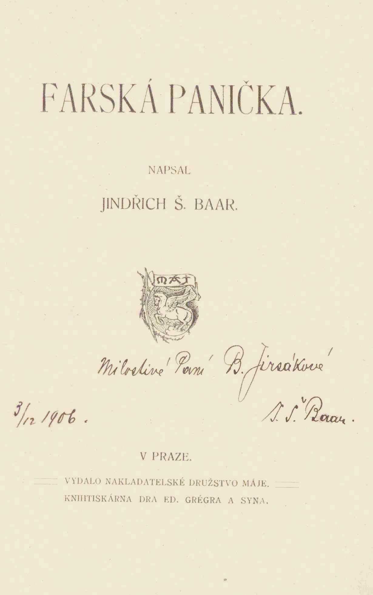 Názvové údaje Bolestné vánoce : památka na válečná léta 1914-1917 / J.Š. Baar Osobní jméno Baar, Jindřich Šimon, 1869-1925 (Autor) (Autor podpisu) (Dedikátor) Další autoři Emil Šprongl (nakladatelství a knihtiskárna) (Nakladatel, vydavatel) Nakladatel V Pelhřimově : Nákladem a tiskem E. Šprongla, [1917] Rozsah 15 s. Klíčová slova česká literatura * pobožnost * válečná léta * r. 1914-1917 * r. 1917 Počet ex. 1, z toho volných 1 Druh dok. monografie Signatura AVrbova 415 Názvové údaje Cestou křížovou / Henryk Š. Baar Osobní jméno Baar, Jindřich Šimon, 1869-1925 (Autor) (Dedikátor) Další autoři Nový život (Prostějov, Choceň, Nový Jičín) (Nakladatel, vydavatel) Lambert Klabusay (Holešov, Velké Meziříčí) (Tiskař) Nakladatel V Novém Jičíně : Nový život, 1900 Výrobce V Holešově : Tiskem Lamberta Klabusaya Rozsah 100 stran : ilustrace Klíčová slova česká literatura * česká próza * česká beletrie * katolická moderna * katolická literatura * faráři * český román * r. 1900 Počet ex. 3, z toho volných 3 Druh dok. monografie Signatura AVrbova 362, KaG XV B2 306, M 156 e 70 Názvové údaje Na děkanství / Od J. Š. Baara. II=02. díl románu Poslední soud Osobní jméno Baar, Jindřich Šimon, 1869-1925 (Autor) Nakladatel Praha : Cyrillo-methodějské knihkupectví Gustav Francl, [1919?] Rozsah 222 s. Klíčová slova česká literatura * próza * román Počet ex. 1, z toho volných 1 Druh dok. monografie Signatura C12a 968/přív. 1 Názvové údaje Druhá kniha z přírody / Jindřich Š. Baar Osobní jméno Baar, Jindřich Šimon, 1869-1925 (Autor) Další autoři Českomoravské podniky tiskařské a vydavatelské. 1908-1918 (Praha, Bratislava (Československo)) (Nakladatel, vydavatel) Rolnická tiskárna (tiskárna) (Tiskař) Nakladatel V Praze : Českomoravské podniky tiskařské a vydavatelské, 1930 Výrobce (Tiskem Rolnické tiskárny) Rozsah 286 s. Klíčová slova česká literatura * česká próza * česká beletrie * sbírka povídek * příhody o zvířatech * r. 1930 Počet ex. 1, z toho volných 1 Druh dok. monografie Signatura AVrbova 391 Názvové údaje Farská panička ; Kohouti : (Farských historek díl 2.) / Jindřich Š. Baar Osobní jméno Baar, Jindřich Šimon, 1869-1925 (Autor) Další autoři Českomoravské podniky tiskařské a vydavatelské. 1908-1918 (Praha, Bratislava (Československo)) (Nakladatel, vydavatel) Rolnická tiskárna (tiskárna) (Tiskař) Nakladatel V Praze : Českomoravské podniky tiskařské a vydavatelské, 1927 Výrobce Tiskem Rolnické tiskárny Rozsah 290 stran Klíčová slova česká próza * český román * katolická literatura * venkov Počet ex. 2, z toho volných 2 Druh dok. monografie Signatura VHB 0249, P 62 e 6 Názvové údaje Farská panička / napsal Jindřich Š. Baar Osobní jméno Baar, Jindřich Šimon, 1869-1925 (Autor) (Dedikátor) Další autoři Nakladatelské družstvo Máje (Nakladatel, vydavatel) Dr. Ed. Grégr a syn (nakladatelství, tiskárna) (Tiskař) Nakladatel V Praze : Nakladatelské družstvo Máje, [1906?] Rozsah 176, 411 s. Klíčová slova česká literatura * česká próza * česká beletrie * vesnický román Počet ex. 1, z toho volných 1 Druh dok. monografie Signatura AVrbova 357 Názvové údaje Hanče ; Pro kravičku ; Skřivánek / Jindřich Šimon Baar ; [doslov naps. Josef Rumler ; obálku a vazbu navrhla Lucie Weisbergrová ; typogr. upr. Antonín Dvořák] Osobní jméno Baar, Jindřich Šimon, 1869-1925 (Autor) Další autoři Rumler, Josef, 1922-1999 (Autor doslovu, tiráže atd.) Weisbergerová-Klenová, Lucie, 1923- (Knižní grafik) Dvořák, Antonín, 1920-1997 (Typograf) Nakladatel Praha : Československý spisovatel, 1957 Rozsah 359 s. Osobní hesla Baar, Jindřich Šimon, 1869-1925 - kněz, prozaik, básník, dramatik, sběratel folklóru Klíčová slova česká literatura * próza * povídky * Chodsko Počet ex. 1, z toho volných 1 Druh dok. monografie Signatura AČS 05912 Názvové údaje Hanče : chodský román / napsal Jindřich Š. Baar Osobní jméno Baar, Jindřich Šimon, 1869-1925 (Autor) (Dedikátor) Další autoři Cyrilometodějská knihtiskárna, knihkupectví a nakladatelství (Nakladatel, vydavatel) Nakladatel V Praze : Cyrillo-Methodějská knihtiskárna a nakladatelství V. Kotrba, 1917 Rozsah 159 stran Klíčová slova česká próza * román * Chodsko Počet ex. 3, z toho volných 3 Druh dok. monografie Signatura AVrbova 364, P 63 e 27, P 46 d 89 Názvové údaje Hanýžka a Martínek / Jindřich Š. Baar ; Ilustr. a obálka Divici Landrové ; V úpr. Methoda Kalába Osobní jméno Baar, Jindřich Šimon, 1869-1925 (Autor) Další autoři Landrová, Divica, 1908-1982 (Ilustrátor) Kaláb, Method, 1885-1963 (Grafický technik) Štěpánková, Hana, 1948- (Autor úvodu atd.) Nakladatel Praha : Vyšehrad, 1950 Rozsah 142 s., il. : il Osobní hesla Baar, Jindřich Šimon, 1869-1925 - kněz, prozaik, básník, dramatik, sběratel folklóru Klíčová slova česká literatura * próza * výbory * vyprávění * literatura pro děti Počet ex. 1, z toho volných 1 Druh dok. monografie Signatura C12c 668 Názvové údaje Hrnčená bába a jiné povídky / Jindřich Šimon Baar ; Uspoř., edič. připr. a medailón o aut. naps. Vladimír Štěpánek ; Kresby na obálce a předsádkách od Jana Kudláčka ; Portrét aut. od Rudolfa Klimoviče ; Typogr. Oldřich Hlavsa Osobní jméno Baar, Jindřich Šimon, 1869-1925 (Autor) Další autoři Štěpánek, Vladimír, 1917-1991 (Sestavovatel, kompilátor) (Editor) (Autor komentáře) Kudláček, Jan, 1928-2017 (Ilustrátor) Klimovič, Rudolf, 1917-1990 (Ilustrátor) Hlavsa, Oldřich, 1909-1995 (Grafický technik) Nakladatel Praha : Československý spisovatel, 1983 Rozsah 303 s. Osobní hesla Baar, Jindřich Šimon, 1869-1925 - kněz, prozaik, básník, dramatik, sběratel folklóru Klíčová slova česká literatura * próza * povíd