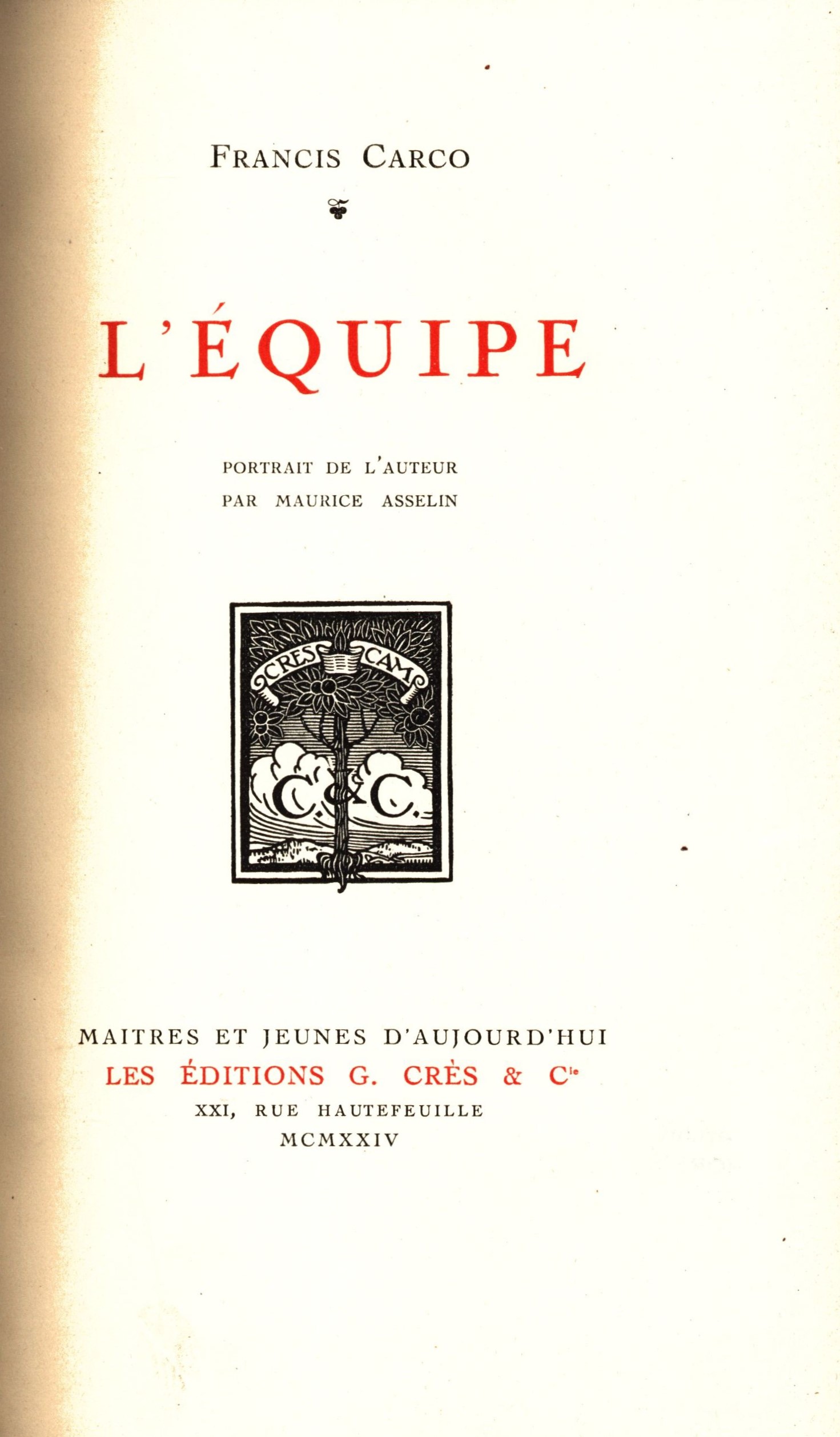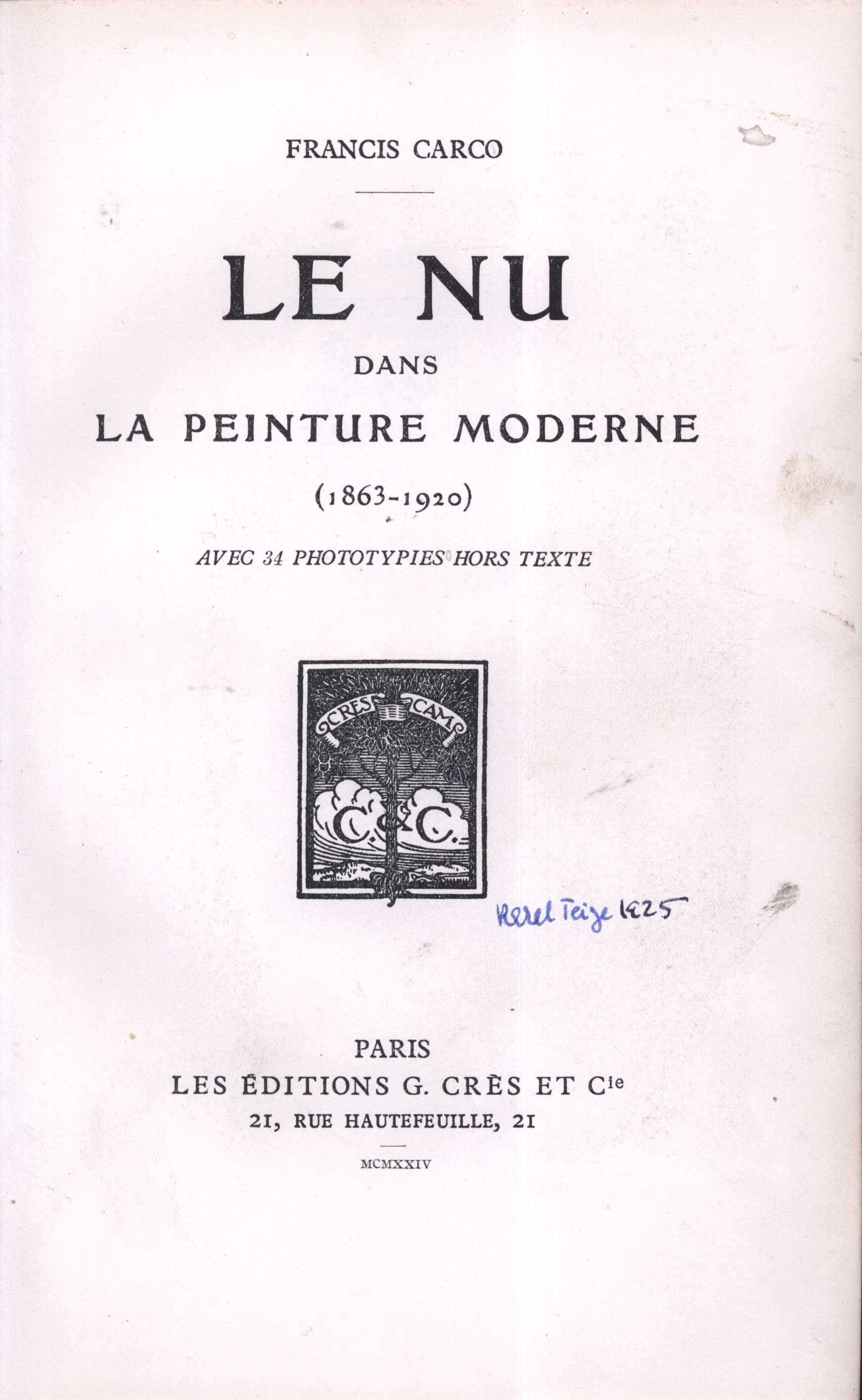 Názvové údaje La lumière noire : roman / Francis Carco Osobní jméno Carco, Francis, 1886-1958 (Autor) Další autoři Albin Michel (nakladatelství, Paříž, Francie) (Nakladatel, vydavatel) Paul Dupont (Paříž) (Tiskař) Nakladatel Paris : Albin Michel, 1934 Výrobce Paul Dupont) Rozsah 254 s. Klíčová slova francouzská literatura * francouzská próza * francouzský román * stol. 20., léta 20. Počet ex. 1, z toho volných 1 Druh dok. monografie Signatura KaG XII C2 97 Názvové údaje De Montmartre au quartier latin / Francis Carco Osobní jméno Carco, Francis, 1886-1958 (Autor) Další autoři Albin Michel (nakladatelství, Paříž, Francie) (Nakladatel, vydavatel) L. Bellenand (Fontenay-aux-Roses, Francie) (Tiskař) Nakladatel Paris : Albin Michel, c1927 Výrobce Louis Bellenand) Rozsah 247 s. Klíčová slova francouzská literatura * francouzská próza * francouzský román * stol. 20., léta 20. Počet ex. 1, z toho volných 1 Druh dok. monografie Signatura KaG LXI 295 Názvové údaje Rien qu'une femme : roman / Francis Carco Osobní jméno Carco, Francis, 1886-1958 (Autor) Další autoři Albin Michel (nakladatelství, Paříž, Francie) (Nakladatel, vydavatel) Association linotypiste (tiskárna) (Tiskař) Nakladatel Paris : Albin Michel, c1924 Výrobce Association linotypiste) Rozsah 256 s. Klíčová slova francouzská literatura * francouzská próza * francouzský román * stol. 20., léta 20. Počet ex. 1, z toho volných 1 Druh dok. monografie Signatura VHB 2115 Názvové údaje Le nu dans la peintre moderne : 1863-1920 : avec 34 phototypies hors texte / Francis Carco Osobní jméno Carco, Francis, 1886-1958 (Autor) Nakladatel Paris : Crès, 1924 Rozsah iv, 162 s., 32 obr. příl. Klíčová slova výtvarné umění * malířství * stol. 19.-20. * obrazové publikace Počet ex. 1, z toho volných 1 Druh dok. monografie Signatura Teige 210 Názvové údaje Perversité : roman / Francis Carco Osobní jméno Carco, Francis, 1886-1958 (Autor) Další autoři J. Ferenczi et fils (Paris (Francie)) (Nakladatel, vydavatel) Imprimerie Ramlot et Cie (tiskárna) (Tiskař) Klub pro soudobou literaturu (spolek) (Dřívější majitel) Nakladatel Paris : J. Ferenczi et fils, c1925 Výrobce (Imprimerie Ramlot et Cie) Rozsah 256 s. Klíčová slova francouzská literatura * francouzská próza * francouzský román * stol. 20., léta 20. Počet ex. 1, z toho volných 1 Druh dok. monografie Signatura KaG XII E2 47 Názvové údaje Le roman de François Villon / Francis Carco Osobní jméno Carco, Francis, 1886-1958 (Autor) Další autoři Nedoma, Miloslav, 1875-1954 (Dřívější majitel) Korp. Librairie Plon. Les petit-fils de Plon et Nourrit (Paris, Francie) (Nakladatel, vydavatel) Nakladatel Paris : Librairie Plon, 1926 Rozsah 301 s. Osobní hesla Villon, François, asi 1429-asi 1463 - franc. básník Klíčová slova francouzská literatura * životopisné romány * životopisný román * Villon F. Počet ex. 1, z toho volných 1 Druh dok. monografie Signatura KaG LII F3 26 Názvové údaje L'amour vénal / Francis Carco Osobní jméno Carco, Francis, 1886-1958 (Autor) Další autoři Le Divan (nakladatelství) (Nakladatel, vydavatel) Imprimerie Alençonnaise (tiskárna) (Tiskař) Nakladatel Paris : Le Divan, 1926 Výrobce Alençon : Imprimerie Alençonnaise Rozsah 196 stran ; 17 cm Klíčová slova francouzská literatura * francouzská próza * francouzští autoři * stol. 19.-20. * francouzsky psaná literatura Počet ex. 1, z toho volných 1 Druh dok. monografie Signatura JVladislav 2447 Názvové údaje L'équipe / Francis Carco Osobní jméno Carco, Francis, 1886-1958 (Autor) Další autoři Asselin, Maurice, 1882-1947 (Ilustrátor) Korp. Georges Crès et Cie (Paris, Francie) (Nakladatel, vydavatel) Nakladatel Paris : Georges Crès et Cie, 1924 Rozsah 214 stran : ilustrace ; 23 cm Klíčová slova Francie * francouzská literatura * francouzská próza * romány * meziválečné období Počet ex. 1, z toho volných 1 Druh dok. monografie Signatura AHO 0546 Názvové údaje M. de Vlaminck : d'apres un dessin de l'artiste / de notices biogr. et docum. et d'un portrait inédit de l'artiste dessiné par lui-meme et gravé sur bois par Jules Germain ; étude critique par Francis Carco Další autoři Germain, Jules (Autor komentáře) Carco, Francis, 1886-1958 (Autor úvodu atd.) Nakladatel Paris : Éditions de la Nouvelle revue francaise, 1925 Rozsah 63 s. : il. ; 15 cm Klíčová slova česká literatura Počet ex. 1, z toho volných 1 Druh dok. monografie Signatura Holan 1630 Názvové údaje Maurice Utrillo : vingt-sept reproductions de peintures et dessins / précédées d'une étude critique par Francis Carco ; de notices biographiques et documentaires et d'un portrait inédit de l'artiste dessiné par Suzanne Valadon et gravé sur bois par Georges Aubert Další autoři Aubert, Georges, 1866-1961 (Rytec) Valadon, Suzanne, 1865-1938 (Autor podpisu) Carco, Francis, 1886-1958 (Autor úvodu atd.) Korp. Éditions de la Nouvelle Revue Française (Nakladatel, vydavatel) Nakladatel Paris : Éditions de la Nouvelle Revue Française, 1921 Rozsah 63 s. : il. Osobní hesla Utrillo, Maurice, 1883-1955 - francouzský malíř Klíčová slova francouzská literatura * francouzské umění * francouzské výtvarné umění * francouzští malíři * francouzští umělci * francouzští výtvarníci * moderní umění * moderní umělecké směry Počet ex. 1, z toho volných 1 Druh dok. monografie Signatura KaG IV C 22