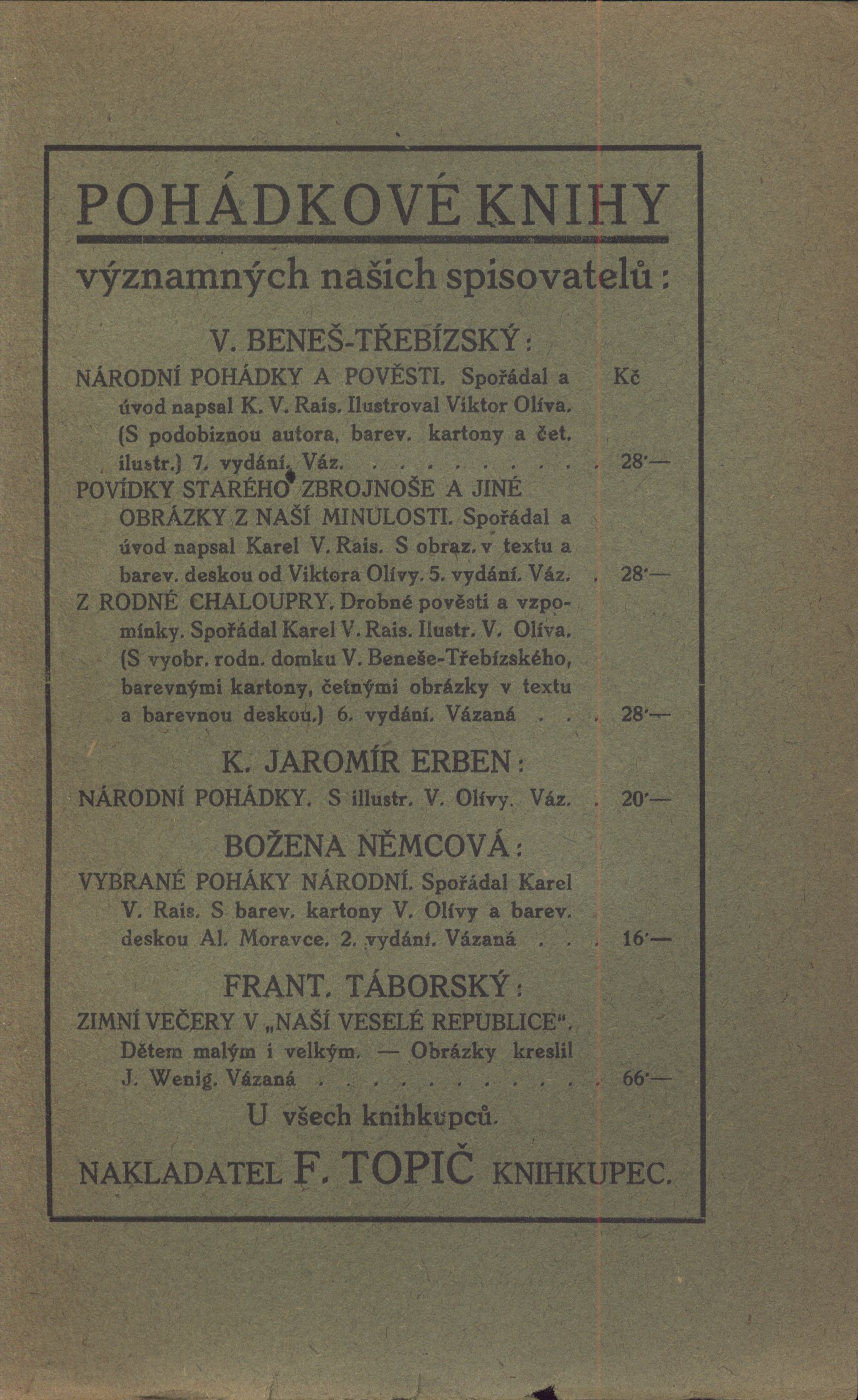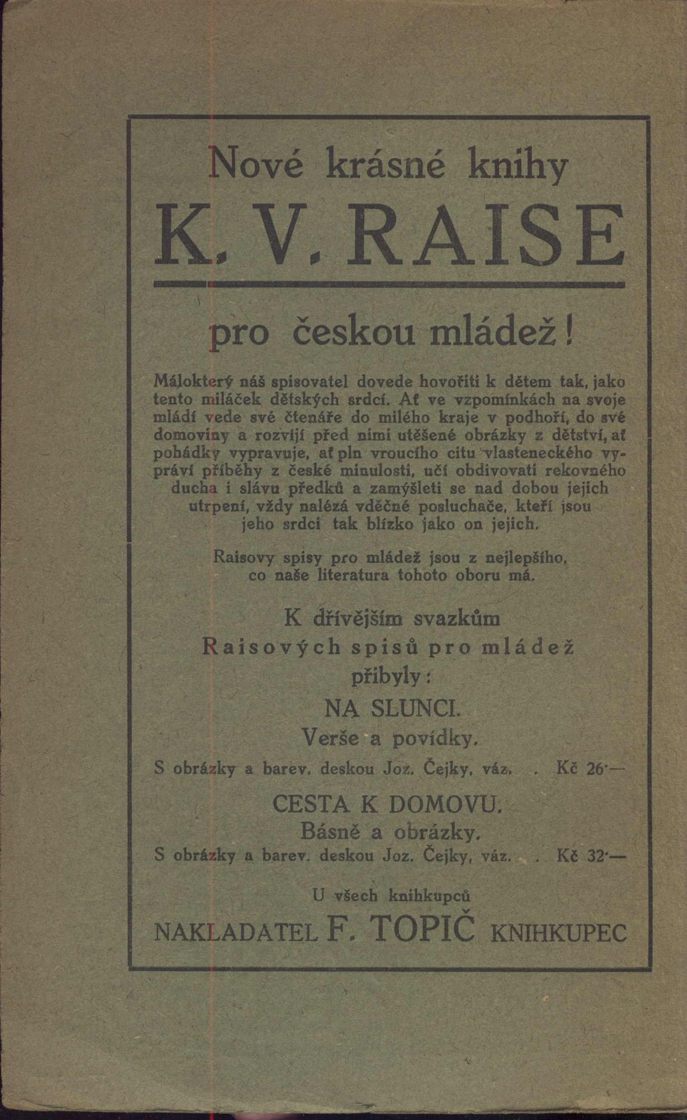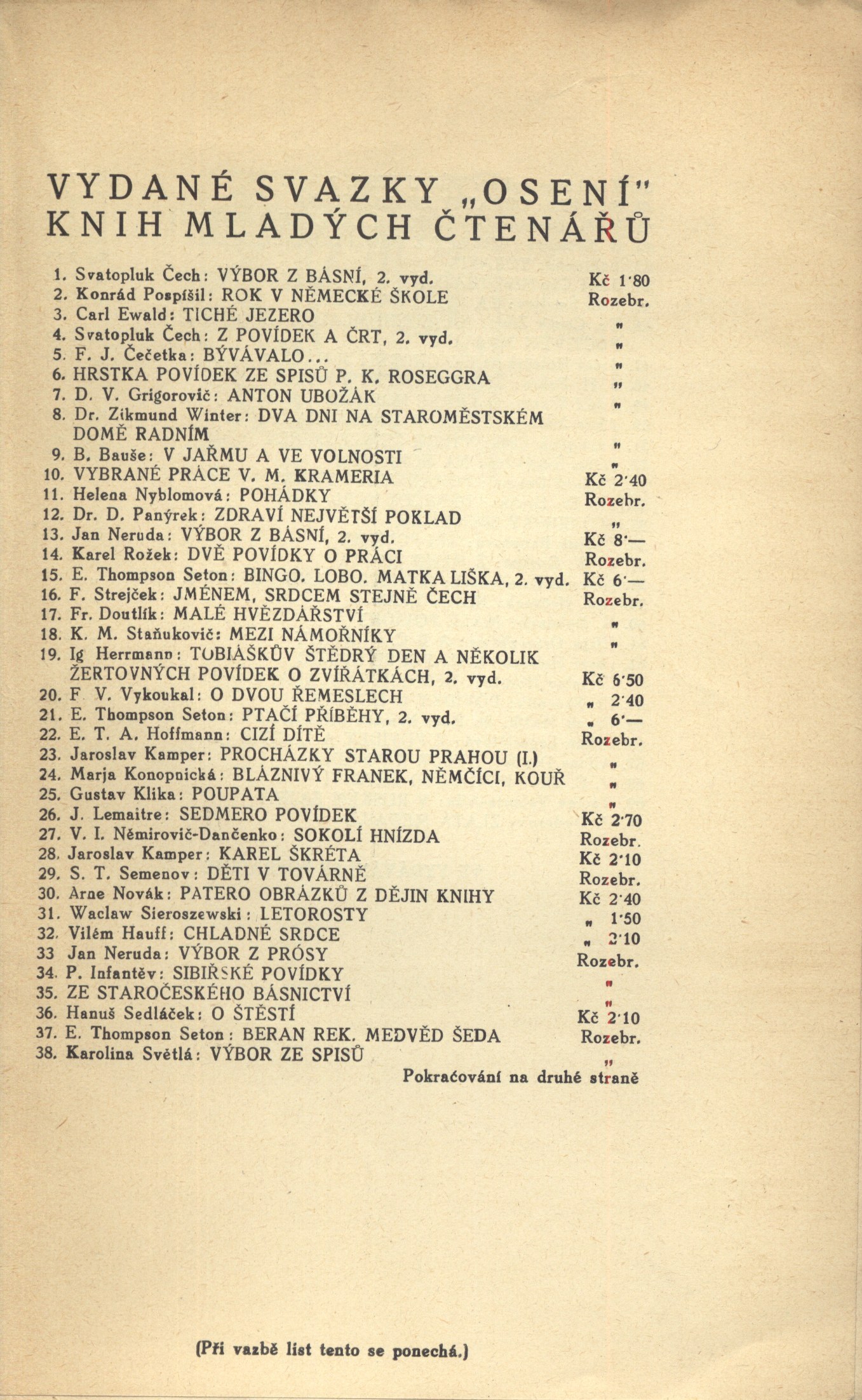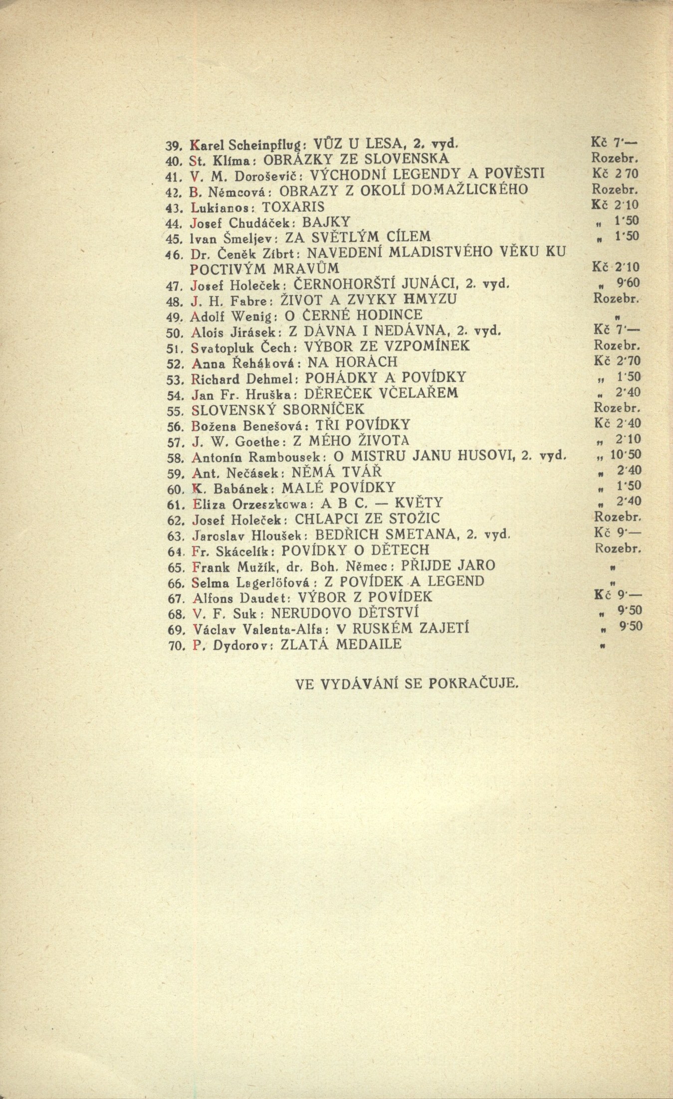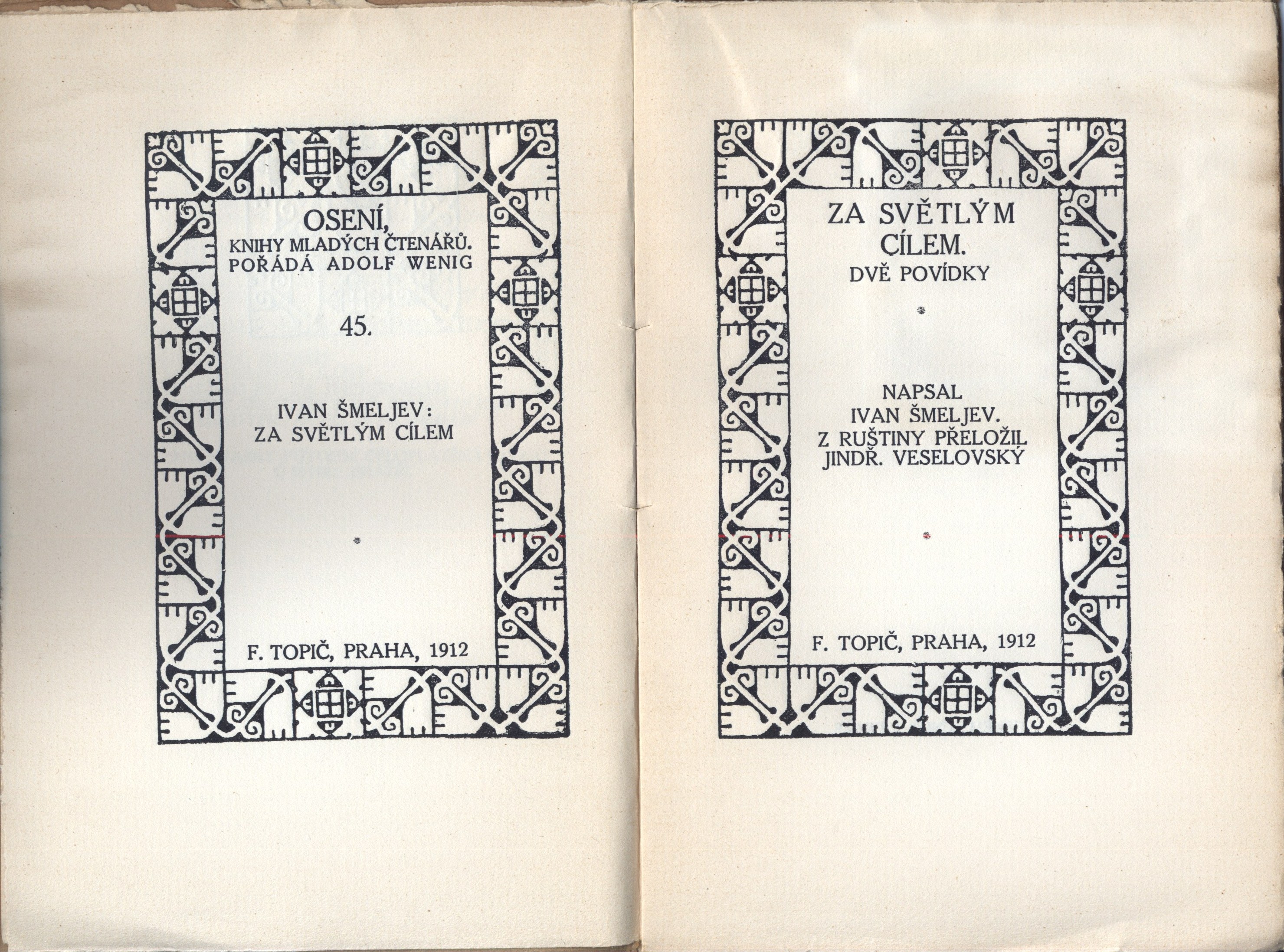 Názvové údaje Zlatá medaile / P. Dydorov ; z ruštiny přeložil Jindř. Veselovský Osobní jméno Dydorov, P. (Autor) Další autoři Veselovský, Jindřich, 1863-1933 (Překladatel) Benda, Jaroslav, 1882-1970 (Knižní grafik) Korp. F. Topič (nakladatelství) (Nakladatel, vydavatel) Osvěta (tiskárna) (Tiskař) Nakladatel Praha : F. Topič, 1925 Výrobce Osvěta, společnost s r. o.) Rozsah 67 s. : il. ; 19 cm Klíčová slova ruská literatura * próza * překlad * studentský život * Rusko * stol. 20., léta 10. Počet ex. 1, z toho volných 1 Druh dok. monografie Signatura Topič 0407 Názvové údaje Feďka Rudokop / Němirovič Dančenko ; přeložil J. Veselovský Osobní jméno Nemirovič-Dančenko, Vladimir Ivanovič, 1858-1943 (Autor) Další autoři Veselovský, Jindřich, 1863-1933 (Překladatel) Korp. Jan Laichter (nakladatelství) (Nakladatel, vydavatel) L. Štorkán a Al. Jaroš (tiskárna) (Tiskař) Tělocvičná jednota Sokol (Nusle, Česko) (Dřívější majitel) Nakladatel V Praze : Jan Laichter, 1910 Výrobce (Štorkán a Jaroš) Rozsah 111, [1] s. Klíčová slova ruská literatura * ruská próza * literatura pro děti * literatura pro děti a mládež * novela Počet ex. 1, z toho volných 1 Druh dok. monografie Signatura KaG XXVIII D 47 Názvové údaje Za světlým cílem : dvě povídky / napsal Ivan Šmeljev ; z ruštiny přeložil Jindř. Veselovský Osobní jméno Šmeljev, Ivan Sergejevič, 1873-1950 (Autor) Další autoři Veselovský, Jindřich, 1863-1933 (Překladatel) Benda, Jaroslav, 1882-1970 (Knižní grafik) Korp. F. Topič (nakladatelství) (Autor) Unie (tiskárna) (Tiskař) Nakladatel Praha : F. Topič, 1912 Výrobce (Unie) Rozsah 54 s. : il. ; 20 cm Osobní hesla Šmeljev, Ivan Sergejevič, 1873-1950 - ruský spisovatel Klíčová slova ruská literatura * překlad * povídky Počet ex. 1, z toho volných 1 Druh dok. monografie Signatura Topič 0091 Názvové údaje Sám sobě pomáhej! : hra pro mládež ve 4 dějstvích s dohrou / podle stejnojmenné povídky Němiroviče-Dančenka se svolením autorovým napsal Jindřich Veselovský Osobní jméno Veselovský, Jindřich, 1863-1933 (Překladatel) (Autor adaptace, upravovatel) Další autoři Nemirovič-Dančenko, Vladimir Ivanovič, 1858-1943 (Bibliografický předchůdce) Korp. Ústřední nakladatelství a knihkupectví učitelstva českoslovanského (Praha, Česko) (Nakladatel, vydavatel) Nakladatel Praha : Nákladem Ústředního nakladatelství a knihkupectví učitelstva českoslovanského v Praze VII., 1932 Výrobce (Tiskem Josefa Kolandy) Rozsah 68 s. Klíčová slova ruská próza * dramata * divadelní hry Počet ex. 1, z toho volných 1 Druh dok. monografie Signatura DSK 208