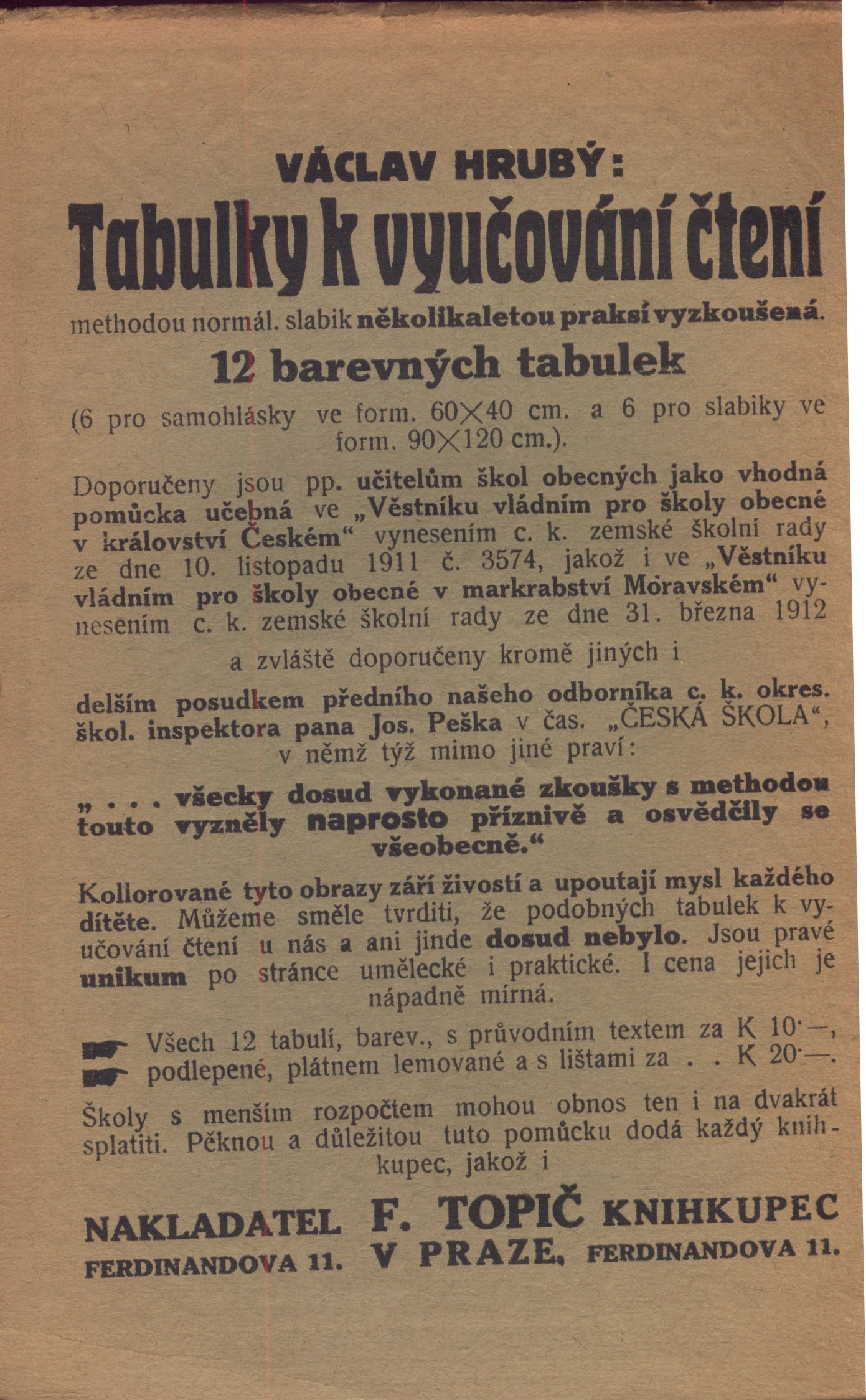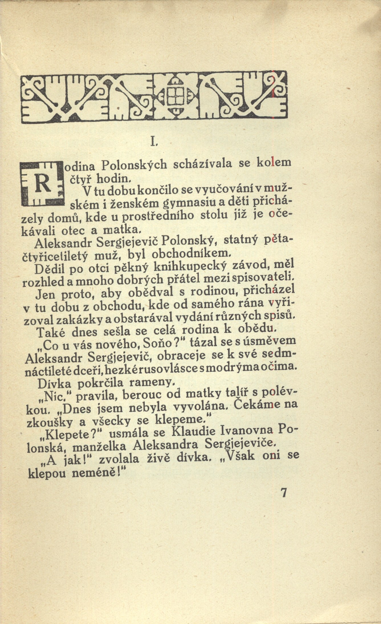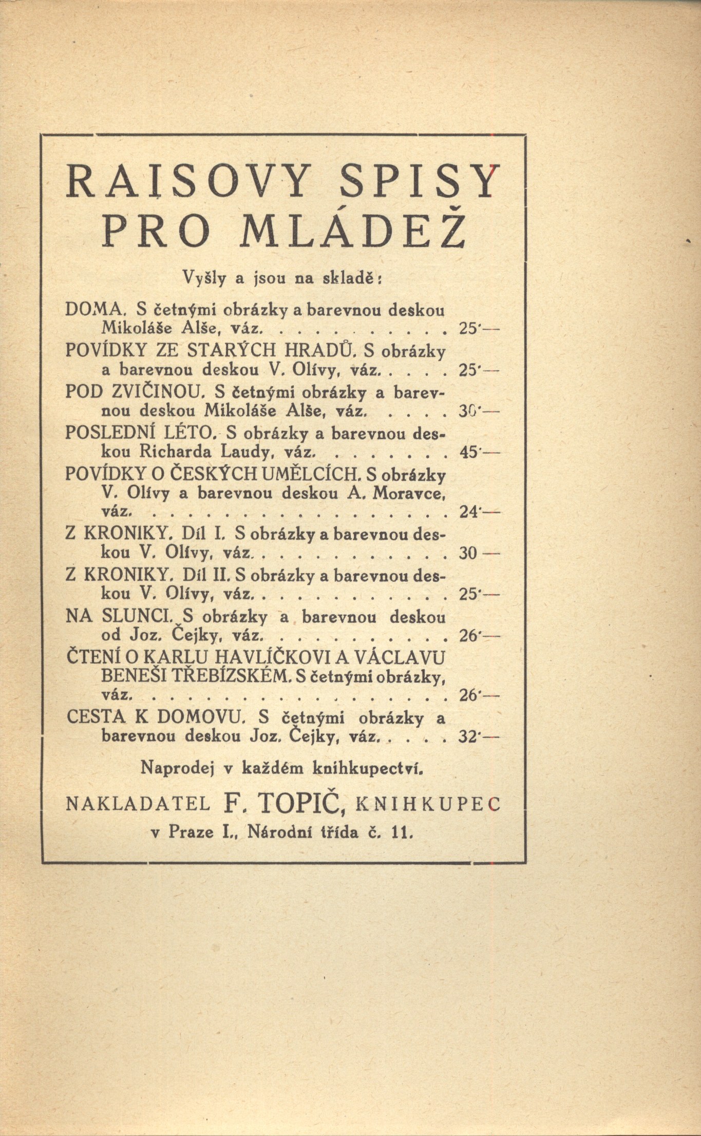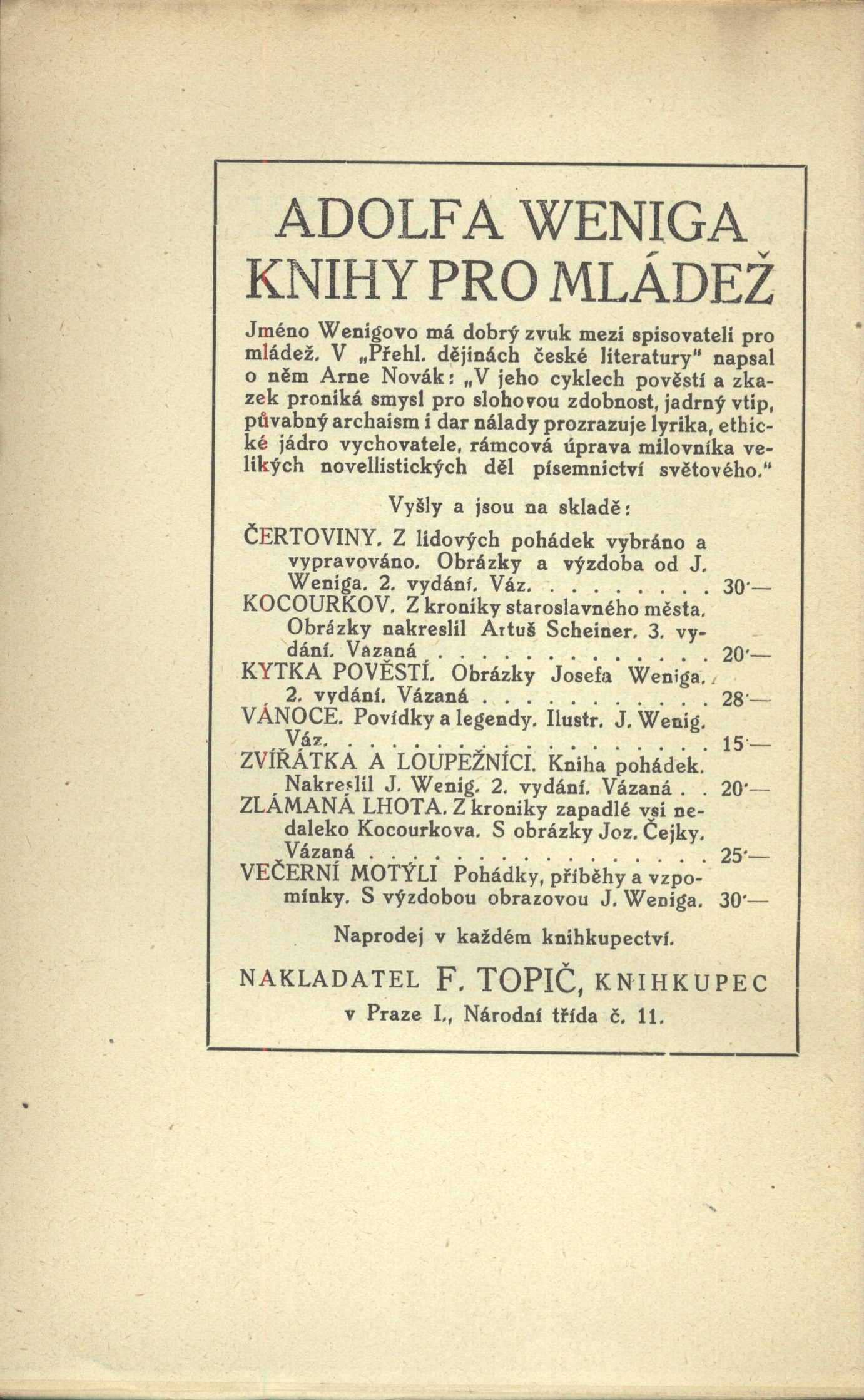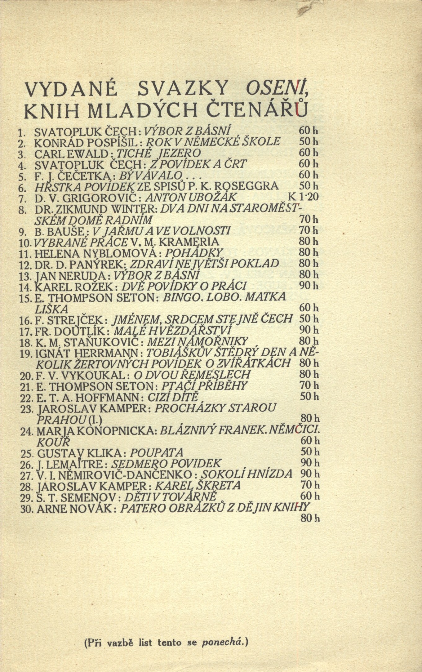 Názvové údaje Zlatá medaile / P. Dydorov ; z ruštiny přeložil Jindř. Veselovský Osobní jméno Dydorov, P. (Autor) Další autoři Veselovský, Jindřich, 1863-1933 (Překladatel) Benda, Jaroslav, 1882-1970 (Knižní grafik) Korp. F. Topič (nakladatelství) (Nakladatel, vydavatel) Osvěta (tiskárna) (Tiskař) Nakladatel Praha : F. Topič, 1925 Výrobce Osvěta, společnost s r. o.) Rozsah 67 s. : il. ; 19 cm Klíčová slova ruská literatura * próza * překlad * studentský život * Rusko * stol. 20., léta 10. Počet ex. 1, z toho volných 1 Druh dok. monografie Signatura Topič 0407 Názvové údaje Feďka Rudokop / Němirovič Dančenko ; přeložil J. Veselovský Osobní jméno Nemirovič-Dančenko, Vladimir Ivanovič, 1858-1943 (Autor) Další autoři Veselovský, Jindřich, 1863-1933 (Překladatel) Korp. Jan Laichter (nakladatelství) (Nakladatel, vydavatel) L. Štorkán a Al. Jaroš (tiskárna) (Tiskař) Tělocvičná jednota Sokol (Nusle, Česko) (Dřívější majitel) Nakladatel V Praze : Jan Laichter, 1910 Výrobce (Štorkán a Jaroš) Rozsah 111, [1] s. Klíčová slova ruská literatura * ruská próza * literatura pro děti * literatura pro děti a mládež * novela Počet ex. 1, z toho volných 1 Druh dok. monografie Signatura KaG XXVIII D 47 Názvové údaje Za světlým cílem : dvě povídky / napsal Ivan Šmeljev ; z ruštiny přeložil Jindř. Veselovský Osobní jméno Šmeljev, Ivan Sergejevič, 1873-1950 (Autor) Další autoři Veselovský, Jindřich, 1863-1933 (Překladatel) Benda, Jaroslav, 1882-1970 (Knižní grafik) Korp. F. Topič (nakladatelství) (Autor) Unie (tiskárna) (Tiskař) Nakladatel Praha : F. Topič, 1912 Výrobce (Unie) Rozsah 54 s. : il. ; 20 cm Osobní hesla Šmeljev, Ivan Sergejevič, 1873-1950 - ruský spisovatel Klíčová slova ruská literatura * překlad * povídky Počet ex. 1, z toho volných 1 Druh dok. monografie Signatura Topič 0091 Názvové údaje Sám sobě pomáhej! : hra pro mládež ve 4 dějstvích s dohrou / podle stejnojmenné povídky Němiroviče-Dančenka se svolením autorovým napsal Jindřich Veselovský Osobní jméno Veselovský, Jindřich, 1863-1933 (Překladatel) (Autor adaptace, upravovatel) Další autoři Nemirovič-Dančenko, Vladimir Ivanovič, 1858-1943 (Bibliografický předchůdce) Korp. Ústřední nakladatelství a knihkupectví učitelstva českoslovanského (Praha, Česko) (Nakladatel, vydavatel) Nakladatel Praha : Nákladem Ústředního nakladatelství a knihkupectví učitelstva českoslovanského v Praze VII., 1932 Výrobce (Tiskem Josefa Kolandy) Rozsah 68 s. Klíčová slova ruská próza * dramata * divadelní hry Počet ex. 1, z toho volných 1 Druh dok. monografie Signatura DSK 208