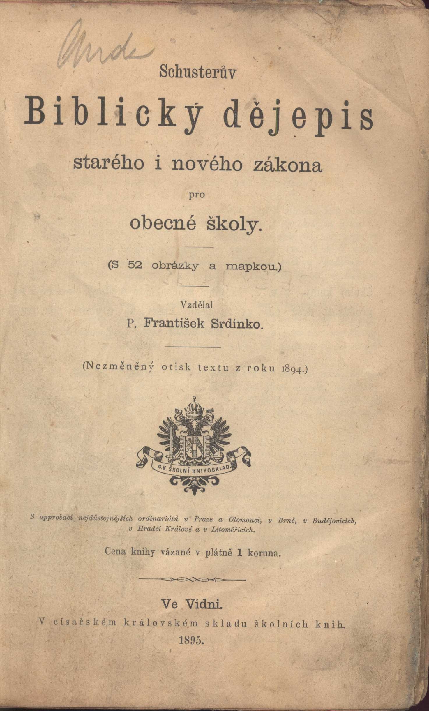 Názvové údaje Schusterův Biblický dějepis starého i nového zákona pro obecné školy : (s 52 obrázky a mapkou) / vzdělal František Srdínko Osobní jméno Schuster, Ignaz, 1813-1869 (Autor) Další autoři Srdínko, František, 1830-1912 (Editor) Korp. C.k. sklad školních knih (Vídeň) Karel Goriško (tiskárna, Vídeň) Nakladatel Ve Vídni : V císařském královském skladu školních knih, 1895 Výrobce Ve Vídni : tiskem Karla Goriška Rozsah 210 stran : ilustrace ; 22 cm Předmětová hesla biblické postavy * biblické události * biblické příběhy * učení katolické církve Klíčová slova německá literatura * Schuster I. * biblické příběhy * ilustrované příběhy * český překlad * Srdínko F. * r. 1895 Počet ex. 1, z toho volných 1 Druh dok. monografie Signatura VZinková 0632 Názvové údaje Schusterův Biblický dějepis Starého i Nového zákona pro školy obecné : s 52 obrázky a s mapkou Svaté země / vzdělal P. František Srdínko ; s approbací nejdůstojnějších ordinariátů v Praze a v Olomouci, v Brně, v Budějovicích, v Hradci Králové a v Litoměřicích Osobní jméno Schuster, Ignaz, 1813-1869 (Autor) Další autoři Srdínko, František, 1830-1912 (Jiná role) Korp. C.k. školní kněhosklad (Praha) (Nakladatel, vydavatel) Nakladatel V Praze : Císařský královský školní knihosklad, 1905 Rozsah 216 s., [2] l. obr. příl. : il., mp. ; 8° Klíčová slova překladová literatura * biblický dějepis * Starý zákon * Nový zákon * biblické postavy * biblické události * Ježíš Nazaretský * Svatá země * r. 1905 Počet ex. 1, z toho volných 1 Druh dok. monografie Signatura AVrbova 158