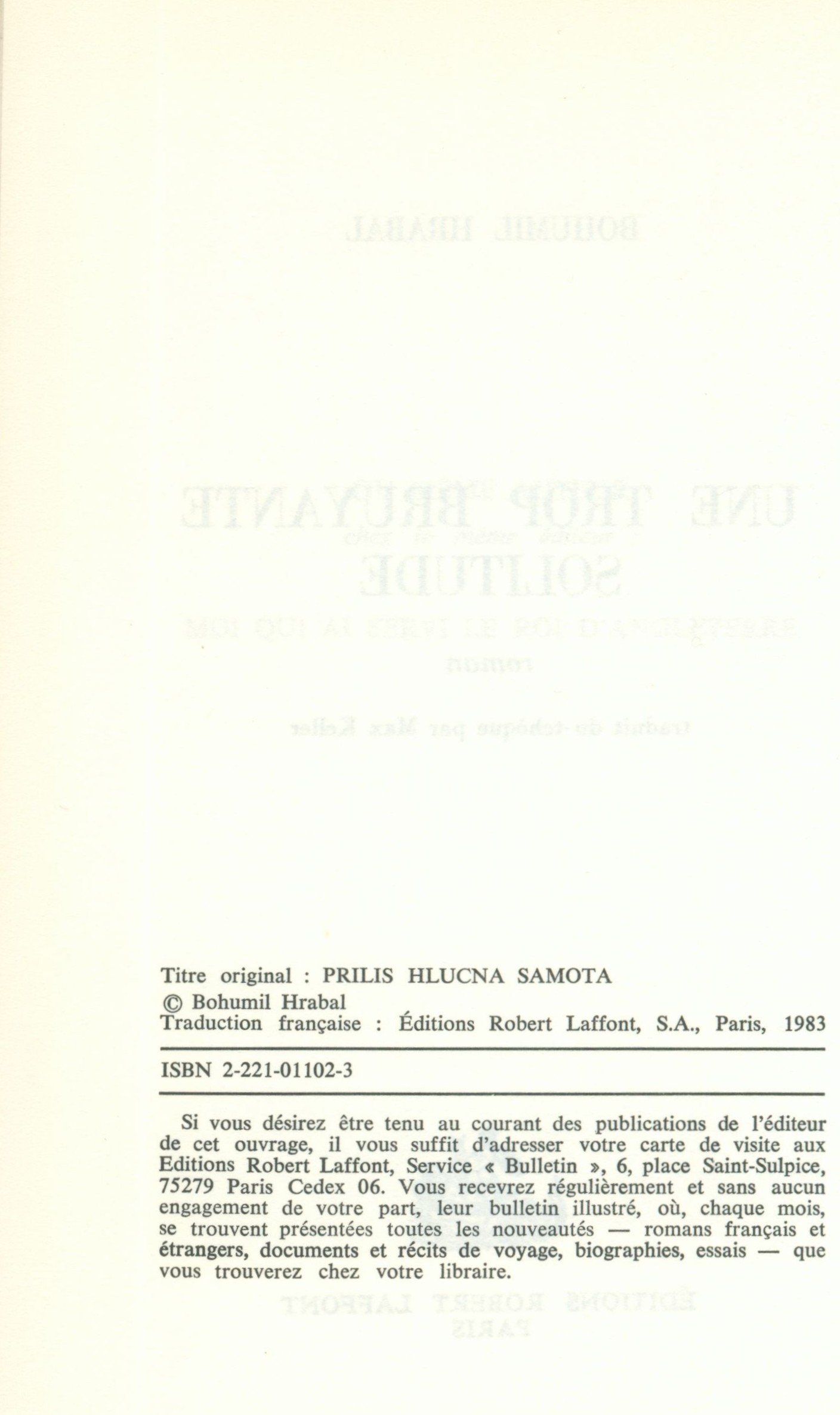 Názvové údaje Listopadový uragán / Bohumil Hrabal ; návrh obálky, grafická úprava a technická redakce Miloš Peer Osobní jméno Hrabal, Bohumil, 1914-1997 (Autor) Další autoři Peer, Miloš (Autor obálky) (Knižní grafik) (Grafický technik) Korp. Tvorba (vydavatelství) (Nakladatel, vydavatel) Delta (nakladatelství) Nakladatel Praha : Tvorba, 1990 Rozsah 141 stran : ilustrace, portréty Chronologie 1989-1990 Předmětová hesla česká literatura * umělecká literatura * próza * Sametová revoluce (1989 : Československo) * Velvet revolution (1989 : Czechoslovakia) Geografické heslo Česko * Czechia Druh dok. ***nezařazeno*** Názvové údaje Une trop bruyante solitude : roman / Bohumil Hrabal ; traduit du tchèque par Max Keller Osobní jméno Hrabal, Bohumil, 1914-1997 (Autor) Další autoři Keller, Max (Překladatel) Korp. Èditions Robert Laffont (nakladatelství) (Nakladatel, vydavatel) L´Imprimerie Hérissey (tiskárna) (Tiskař) Nakladatel Paris : Èditions Robert Laffont, 1983 Výrobce Évreux : L´Imprimerie Hérissey Rozsah 125 stran ; 21 cm Klíčová slova francouzsky psaná literatura * česká literatura * překlad * próza * román * příběh * dělník * každodenní život * stol. 20., léta 70. Počet ex. 1, z toho volných 1 Druh dok. ***nezařazeno*** Signatura LITb 03061