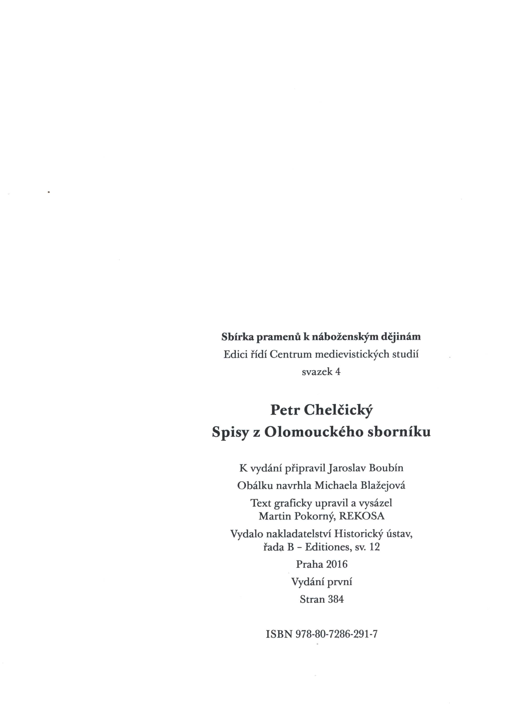 Názvové údaje Znak a bytí : úvahy nad Derridovou grammatologií / Michal Ajvaz ; typografie Martin Pokorný ; obálku navrhla Hana Blažejová Osobní jméno Ajvaz, Michal, 1949- (Autor) Další autoři Pokorný, Martin (Grafický technik) Blažejová, Hana, 1937- (Autor obálky) Korp. Filosofia (nakladatelství) (Nakladatel, vydavatel) Nakladatel Praha : Filosofia, 1994 Výrobce Ústav jaderných informací) Rozsah 35 s. ; 20 cm Osobní hesla Derrida, Jacques, 1930-2004 - francouzský filozof Klíčová slova česká literatura * filozofie * úvahy * jazyk * sémantické gesto * gramatologie * Derrida J. Počet ex. 1, z toho volných 1 Druh dok. monografie Signatura M 219 d 32 Názvové údaje Realismus ve vědě a filosofii : sborník příspěvků / editoři Jiří Nosek a Jiřina Stachová ; obálka Hana Blažejová ; graf. úprava a sazba Martin Pokorný Záhlaví-korpor. Filozofický ústav (Akademie věd ČR) Další autoři Nosek, Jiří, 1948- (Editor) Stachová, Jiřina, 1934- (Editor) Blažejová, Hana, 1937- (Autor obálky) Pokorný, Martin (Grafický technik) Nosek, Jiří, 1948- (Autor úvodu atd.) Korp. Filosofia (nakladatelství) (Nakladatel, vydavatel) Nakladatel Praha : Filosofia, 1995 Výrobce Ústav jaderných informací) Rozsah 459 s. : il. Klíčová slova česká literatura * sborníky * filozofické systémy * filozofické směry * teorie poznání * objektivnost * realismus * pravdivost * morální hodnoty * estetické hodnoty Počet ex. 1, z toho volných 1 Druh dok. monografie Signatura M 222 e 43 Názvové údaje Siet viery / k vydání připravil Jaroslav Boubín ; [obálku navrhla MIchaela Blažejová ; text graficky upravil a vysázel Martin Pokorný, REKOSA] Osobní jméno Chelčický, Petr, asi 1379-asi 1460 (Autor) Další autoři Boubín, Jaroslav, 1954- (Editor) (Autor komentáře textu) Blažejová, Michaela, 1966- (Autor obálky) Pokorný, Martin (Knižní grafik) (Sazeč) Korp. Historický ústav AV ČR (Nakladatel, vydavatel) Nakladatel Praha : Historický ústav, 2012 Rozsah 405 s. Klíčová slova pojednání * komentované vydání * křesťanská literatura * křesťanství * společnost * stát * církev * křesťanské učení * křesťanský život * kritika církve * reformace * Čechy * stol. 15. Počet ex. 1, z toho volných 1 Druh dok. monografie Signatura C12c 3721 Názvové údaje Spisy z Kapitulního sborníku / Petr Chelčický ; k vydání připravil Jaroslav Boubín ; obálku navrhla Michaela Blažejová ; text graficky upravil a vysázel Martin Pokorný, REKOSA Osobní jméno Chelčický, Petr, asi 1379-asi 1460 (Autor) Další autoři Boubín, Jaroslav, 1954- (Editor) (Autor úvodu atd.) Blažejová, Michaela, 1966- (Autor obálky) Pokorný, Martin (Knižní grafik) (Sazeč) Korp. Historický ústav AV ČR (Nakladatel, vydavatel) (Tiskař) Nakladatel Praha : Historický ústav, 2018 Rozsah 498 stran ; 25 cm Osobní hesla Chelčický, Petr, asi 1379-asi 1460 Heslo korporace (zkrác. heslo korp.) : Katolická církev. Metropolitní kapitula sv. Víta, Vojtěcha a Václava (Praha, Česko). Knihovna. Rukopis. D 82 Předmětová hesla Christian theologians - Czechia - 15th century * Christian reformers - Czechia - 15th century * Christian theology - Czechia - 1401-1450 * reform of the church - Czechia - 1401-1450 * criticism of the church - Czechia - 1401-1450 * Christianity and civilization - Czechia - 1401-1450 * Christian polemics - Czechia - 1401-1450 * Czech literature - 1401-1450 * Christian literature - Czechia - 1401-1450 * Czech manuscripts - 1401-1450 * textual criticism Geografické heslo Prague (Czechia) Klíčová slova česká literatura * křesťanská literatura * pojednání * kritické vydání * textová analýza * křesťanské polemiky * kritika církve * reforma církve * křesťanská teologie * křesťanští teologové * křesťanští reformátoři * Chelčický P. * české rukopisy * Česko * r. 1401-1450 * stol. 15. Počet ex. 1, z toho volných 1 Druh dok. monografie Signatura C12c 5193 Názvové údaje Spisy z Olomouckého sborníku / Petr Chelčický ; k vydání připravil Jaroslav Boubín ; obálku navrhla Michaela Blažejová ; text graficky upravil a vysázel Martin Pokorný, REKOSA Osobní jméno Chelčický, Petr, asi 1379-asi 1460 (Autor) Další autoři Boubín, Jaroslav, 1954- (Editor) (Autor úvodu atd.) (Autor komentáře textu) Chelčický, Petr, asi 1379-asi 1460 Dílo. Olomoucký sborník Chelčický, Petr, asi 1379-asi 1460 Replika proti Mikuláši Biskupcovi Chelčický, Petr, asi 1379-asi 1460 Řeč sv. Pavla o starém člověku Chelčický, Petr, asi 1379-asi 1460 Řeč o základu zákonóv lidských Chelčický, Petr, asi 1390-asi 1460. Řeč o očistci Chelčický, Petr, asi 1379-asi 1460 Výklad na 20. kapitolu sv. Matouše (o reptavých) Chelčický, Petr, asi 1379-asi 1460 Řeč a zpráva o těle božiem Chelčický, Petr, asi 1379-asi 1460 Řeč o šelmě a obrazu jejiem Chelčický, Petr, asi 1379-asi 1460 Řeč o dvojím lidu (o šelmě a cizoložnici) Chelčický, Petr, asi 1379-asi 1460 Výklad na pašiji sv. Jana Blažejová, Michaela, 1966- (Autor obálky) Pokorný, Martin (Typograf) (Knižní grafik) (Sazeč) Nakladatel Praha : Historický ústav, 2016 Rozsah 382 stran ; 25 cm Osobní hesla Chelčický, Petr, asi 1379-asi 1460 - spisovatel, překladatel a radikální český náboženský a sociální myslitel Heslo korporace (zkrác. heslo korp.) : Vědecká knihovna (Olomouc, Česko). Rukopis. M I 164 Geografické heslo Olomouc (Česko) Klíčová slova česká literatura * křesťanská literatura * křesťanský život * biblická exegeze * husitská teologie * křesťanské polemiky * reformace * křesťanství * společnost * české rukopisy * textová analýza * Chelčický P. * r. 1401-1450 * pojednání * kritické vydání * studie Počet ex. 1, z toho volných 1 Druh dok. monografie Signatura C12c 4707 Názvové údaje Spisy z Pařížského sborníku / Pe