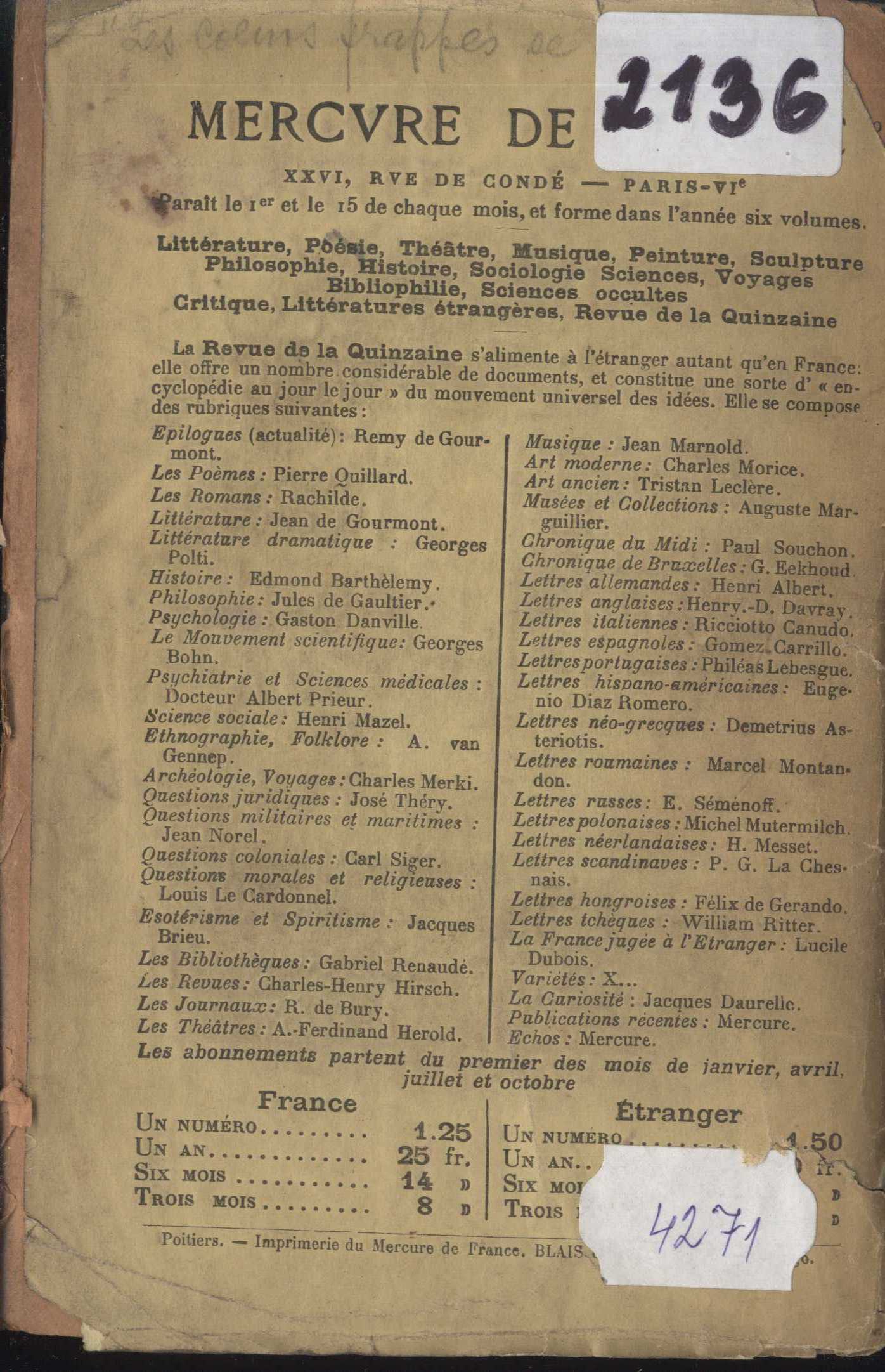 Názvové údaje L' Annonce faite a Marie : mystère en quatre actes et un prologue / Paul Claudel Osobní jméno Claudel, Paul, 1868-1955 (Autor) Další autoři Éditions de la Nouvelle Revue Française (Nakladatel, vydavatel) Nakladatel Paris : Éditions de la Nouvelle Revue Française, 1913 Rozsah 210 s. Klíčová slova francouzská literatura * stol. 20., léta 10. * drama * duchovní literatura * Panna Maria * mystéria * francouzské divadlo * francouzská poezie * katolická literatura Počet ex. 1, z toho volných 1 Druh dok. monografie Signatura KaG XII E 40 Názvové údaje L' Annonce faite a Marie : mystère en quatre actes et un prologue / Paul Claudel Osobní jméno Claudel, Paul, 1868-1955 (Autor) (Dedikátor) Další autoři Braunerová, Zdenka, 1858-1934 (Dedikant) (Dřívější majitel) Korp. Éditions de la Nouvelle Revue Française (Nakladatel, vydavatel) Nakladatel Paris : Éditions de la Nouvelle Revue Française, 1912 Rozsah 210 s. Klíčová slova francouzská literatura * stol. 20., léta 10. * drama * duchovní literatura * Panna Maria * mystéria * francouzské divadlo * francouzská poezie * katolická literatura Počet ex. 1, z toho volných 1 Druh dok. monografie Signatura VHB 2135 Názvové údaje Art Poétique : Connaisance du temps - Traité de la co-naissance au monde et de soi même - Développement de l'Église / Paul Claudel Osobní jméno Claudel, Paul, 1868-1955 (Autor) Další autoři Société du Mercure de France (Paris, Francie) (Nakladatel, vydavatel) Imprimerie artistique Lux (Paris, Francie) (Tiskař) Nakladatel Paris : Mercure de France, [1913] Výrobce (Imprimerie artistique Lux) Rozsah 221 s. Klíčová slova francouzská literatura * francouzská poezie * poetika * estetika * výklady * úvahy Počet ex. 1, z toho volných 1 Druh dok. monografie Signatura KaG XII C 69 Názvové údaje Art Poétique : Connaisance du temps - Traité de la co-naissance au monde et de soi même - Développement de l'Église / Paul Claudel Osobní jméno Claudel, Paul, 1868-1955 (Autor) (Dedikátor) Další autoři Braunerová, Zdenka, 1858-1934 (Dedikant) (Dřívější majitel) Korp. Société du Mercure de France (Paris, Francie) (Nakladatel, vydavatel) Blais et Roy (Poitiers, Francie) (Tiskař) Nakladatel Paris : Mercure de France, 1907 Rozsah 203 s. Klíčová slova francouzská literatura * francouzská poezie * poetika * estetika * výklady * úvahy Počet ex. 1, z toho volných 1 Druh dok. monografie Signatura VHB 2136 Názvové údaje Cesta krížová = (Le Chemin de Croix) / Paul Claudel ; [přeložil Emil Boleslav Lukáč ; typograficky upravil M. Kaláb] Osobní jméno Claudel, Paul, 1868-1955 (Autor) Další autoři Lukáč, Emil Boleslav, 1900-1979 (Překladatel) Kaláb, Method, 1885-1963 (Typograf) Korp. Ladislav Kuncíř (nakladatelství a knihkupectví) (Nakladatel, vydavatel) Průmyslová tiskárna v Praze (Tiskař) Nakladatel [Praha : L. Kuncíř], Edice Philobiblon, 1928 Výrobce (Průmyslová tiskárna) Rozsah 22 s. : il. ; 23 cm Klíčová slova francouzská literatura * poezie * náboženská tematika * překlad * slovenština * ilustrace * číslovaný výtisk * bibliofilský tisk Počet ex. 1, z toho volných 1 Druh dok. monografie Signatura Topič 0675 Názvové údaje Cinq grandes odes suivies d’un processional pour saluer le siècle nouveau / par Paul Claudel Osobní jméno Claudel, Paul, 1868-1955 (Autor) (Dedikant) Další autoři Braunerová, Zdenka, 1858-1934 (Dedikant) (Dřívější majitel) Marten, Miloš, 1883-1917 (Dedikant) (Dřívější majitel) Korp. Imprimerie Durand (tiskárna) (Tiskař) Nakladatel Paris : L’Occident, 1910 Výrobce Imprimerie Durand) Rozsah 171 s. Klíčová slova francouzská literatura * poémy * bibliofilie Počet ex. 2, z toho volných 2 Druh dok. monografie Signatura Bbf VI 0041, VHB 2303 Názvové údaje Connaissance de l'Est / Paul Claudel Osobní jméno Claudel, Paul, 1868-1955 (Autor) Další autoři Karásek ze Lvovic, Jiří, 1871-1951 (Autor podpisu) Korp. Société du Mercure de France (Paris, Francie) (Tiskař obrazu) Imprimerie artistique Lux (Paris, Francie) (Tiskař) Nakladatel Paris : Mercure de France, 1907 Výrobce (Imprimerie artistique Lux) Rozsah 261, [3] s. Klíčová slova francouzská literatura * francouzská próza * drobná próza * drobné prózy * přelom 19. a 20. stol. * moderní literatura Počet ex. 1, z toho volných 1 Druh dok. monografie Signatura KaG XII C 68 Názvové údaje Corona benignitatis ; Anni dei / Paul Claudel Osobní jméno Claudel, Paul, 1868-1955 (Dedikátor) (Autor) Další autoři Braunerová, Zdenka, 1858-1934 (Dedikant) (Dřívější majitel) Korp. Éditions de la Nouvelle Revue Française (Nakladatel, vydavatel) St. Catherine Press Ltd. (tiskárna, Belgie) (Tiskař) Nakladatel Paris : Éditions de la Nouvelle Revue Française, 1920 Výrobce Imprimerie Sainte-Catherine) Rozsah 240 s. Klíčová slova francouzská literatura * katolická poezie * katolická literatura * katolicismus Počet ex. 1, z toho volných 1 Druh dok. monografie Signatura VHB 2134 Názvové údaje Un coup d'oeil sur l'Ame Japonaise : discours aux etudiants de Nikko / Paul Claudel ; avec un portrait de l'auteur gravé sur cuivre par Foujita Osobní jméno Claudel, Paul, 1868-1955 (Autor) Další autoři Foujita, Léonard, 1886-1968 (Ilustrátor) Coulouma, Robert, činný 1918-1957 (Tiskař) Korp. Éditions de la Nouvelle Revue Française (Nakladatel, vydavatel) Vernant et Dollé (Paris, Francie) (Tiskař obrazu) Nakladatel Paris : Éditions de la Nouvelle Revue Française, 1923 Výrobce Coulouma) Rozsah 66 s. : il. + lístek s erraty Klíčová slova francouzská literatura * přednáška * japonská grafika * Japonsko * japonské umění * kultura * úvahy * bibliofilské tisky * bibliofilský tisk * bibliofilská vydání Počet ex. 1, z toho volných 1 Druh dok. monografie Signatura KaG II B 76 Názvové údaje Deux apotrês : Saint Philippe, Saint Jude ; Images sa