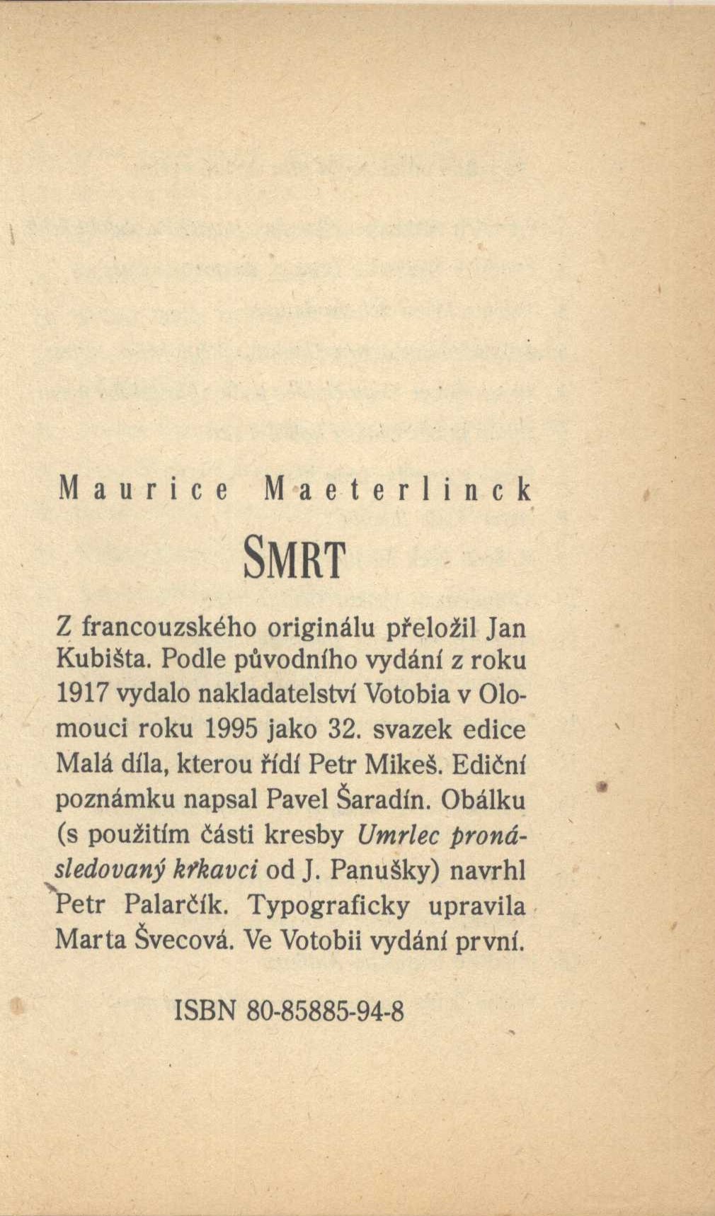 Názvové údaje Noci bezmoci : studie o křesťanství a současné české poesii / Petr Cekota ; [typografickou úpravu a obálku navrhl Petr Palarčík ; redakce Pavel Šaradín] Osobní jméno Cekota, Petr, 1975- (Autor) Další autoři Palarčík, Petr, 1963- (Typograf) (Autor obálky) Šaradín, Pavel, 1969- (Editor) Korp. Votobia (nakladatelství) (Nakladatel, vydavatel) Nakladatel Olomouc : Votobia, 1997 Rozsah 87 s. Osobní hesla Cekota, Petr, 1975- - literární teoretik a historik Klíčová slova česká literatura * studie * esej * česká poezie * křesťanská poezie * křesťanství * studie Počet ex. 2, z toho volných 2 Druh dok. monografie Signatura C12a 987, RSzpuk 0691 Názvové údaje Domysli si sám.. / Kateřina Krasická ; Odpov. red. Pavel Šaradín ; Obálku navrhla Jiřina Vaclová ; Typogr. úpr. Markéta Pučoková Osobní jméno Krasická, Kateřina (Autor) Další autoři Šaradín, Pavel, 1969- (Editor) Vaclová, Jiřina, 1957- (Ilustrátor) Pučoková, Markéta (Grafický technik) Nakladatel Olomouc : Votobia, 1997 Rozsah 65 s. Klíčová slova česká literatura * poezie * sbírka básní Počet ex. 1, z toho volných 1 Druh dok. monografie Signatura C12b 2087 Názvové údaje Úvahy / Bohumil Kubišta ; [předmluva F. X. Šalda ; z původních vydání ... vybral Pavel Šaradín ; obálku (s použitím výřezu z Vlastní podobizny v haveloku B. Kubišty) navrhl Petr Palarčík ; typografická úprava Marta Švecová] Osobní jméno Kubišta, Bohumil, 1884-1918 (Autor) (Umělec) Další autoři Šalda, F. X., 1867-1937 (Autor úvodu atd.) Šaradín, Pavel, 1969- (Sestavovatel, kompilátor) Palarčík, Petr, 1963- (Autor obálky) Švecová, Marta (Typograf) Nakladatel [Olomouc] : Votobia, 1995 Rozsah 108 s. : il. ; 15 cm Klíčová slova česká literatura * úvahy * umění * moderna * umělecký styl * kritika Počet ex. 1, z toho volných 1 Druh dok. monografie Signatura EJulis 0744 Názvové údaje Desetiletí / Bohuslav Blažek, Václav Burian, Roman Jch, Jan Novotný, Jiří Pehe, Pavel Šaradín (ed.), Jiřina Šiklová, Petruška Šustrová, Pavel Švanda, Petr Uhl, Václav Žák ; sestavil Pavel Šaradín ; kresby Martin Burian ; Typografie Jan Světlík Další autoři Blažek, Bohuslav, 1942-2004 (Autor) Burian, Václav, 1959-2014 (Autor) Joch, Roman, 1971- (Autor) Novotný, Jan, 1944- (Autor) Pehe, Jiří, 1955- (Autor) Šaradín, Pavel, 1969- (Autor) (Editor) (Sestavovatel, kompilátor) Šiklová, Jiřina, 1935-2021 (Autor) Šustrová, Petruška, 1947-2023 (Autor) Švanda, Pavel, 1936- (Autor) Uhl, Petr, 1941-2021 (Autor) Žák, Václav, 1945-2025 (Autor) Burian, Martin, 1960- (Ilustrátor) Světlík, Jan, 1970- (Typograf) Korp. Periplum, družstvo nakladatelů (Nakladatel, vydavatel) Printo, spol. s r. o. (tiskárna) (Tiskař) Nakladatel V Olomouci : Periplum, 2003 Výrobce Ostrava : Printo Rozsah 159 stran : ilustrace ; 20 cm Klíčová slova Česko * společnost * politika * vnitropolitická situace * sborníky Počet ex. 1, z toho volných 1 Druh dok. monografie Signatura BVolkova 1221