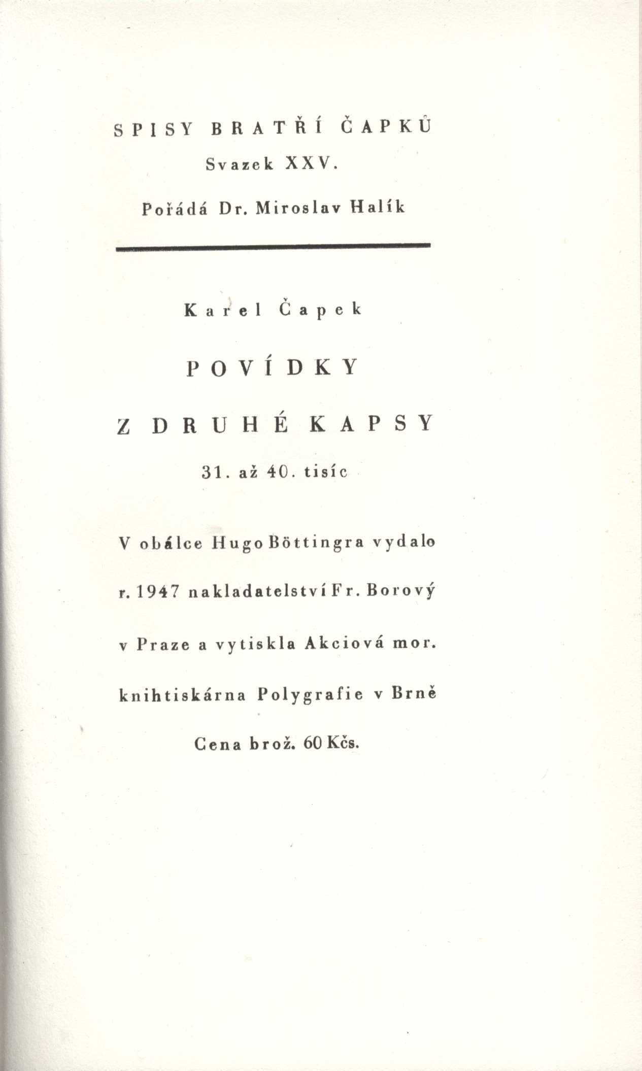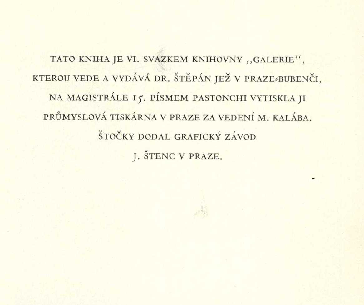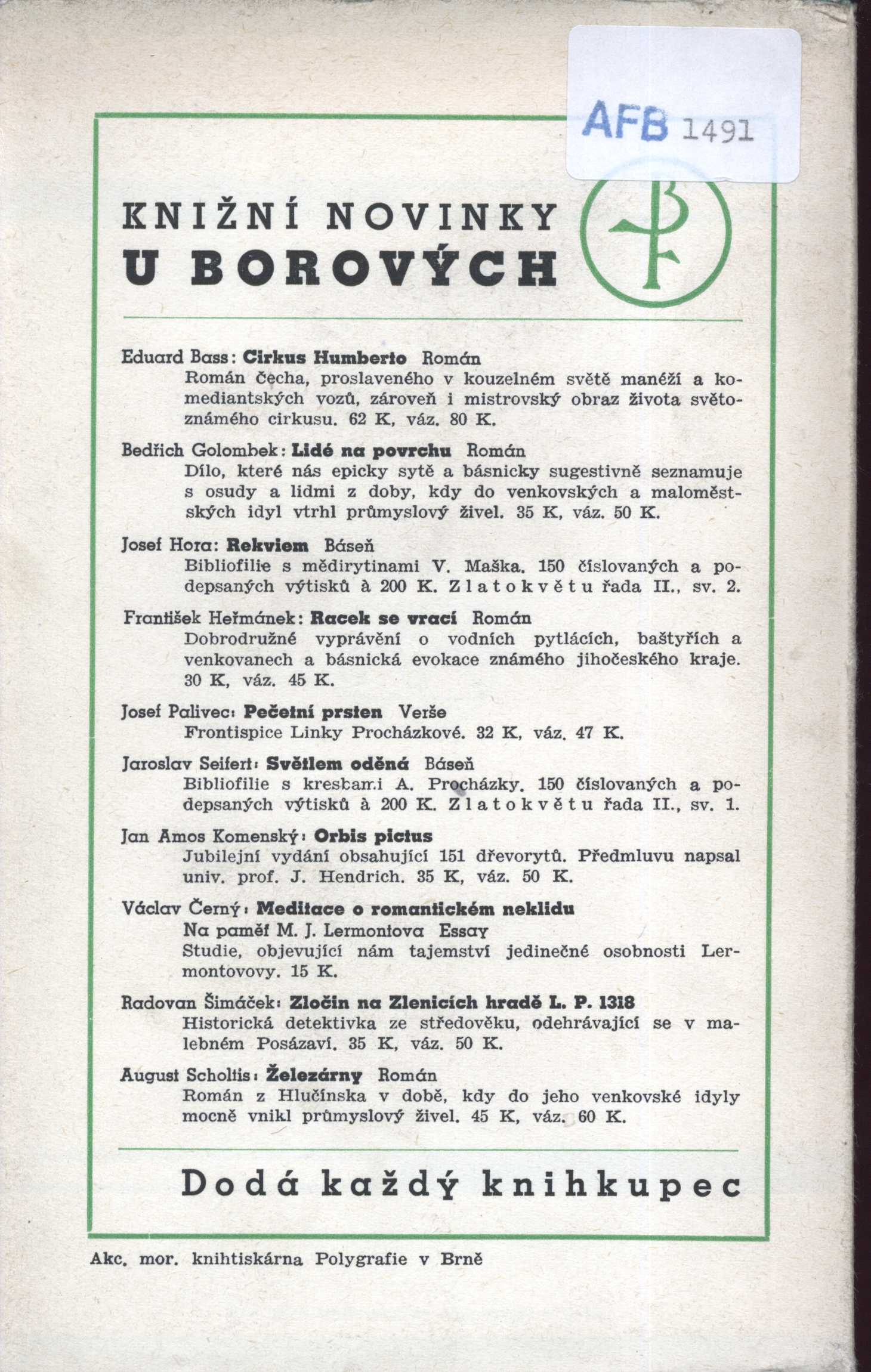 Názvové údaje Svatý Xaverius : romanetto / J. Arbes ; s ilustracemi Huga Böttingera Osobní jméno Arbes, Jakub, 1840-1914 (Autor) Další autoři Boettinger, Hugo, 1880-1934 (Ilustrátor) Grimm, Antonín, 1902-1981 (Dárce) (Dřívější majitel) Korp. F. Šimáček (nakladatelství, tiskárna) Nakladatel Praha : F. Šimáček, 1900 Rozsah 75 stran, 8 nečíslovaných listů obrazové přílohy : ilustrace Klíčová slova česká literatura * česká próza * tajemné příběhy * romaneto * romaneta Počet ex. 6, z toho volných 6 Druh dok. monografie Signatura KaG V23C 56, KaG XXIII C 132, M 147 d 28, P 98 a 45, P 33 b 6, ZA 3 c 8 Názvové údaje Karrikatury / Hugo Böttinger Osobní jméno Boettinger, Hugo, 1880-1934 (Autor) Další autoři Nakladatelství Jan Otto (Nakladatel, vydavatel) Unie (tiskárna) (Tiskař) Nakladatel Praha : J. Otto, 1910 Výrobce (Unie) Rozsah [54] l. : il. Klíčová slova česká literatura * české výtvarné umění * karikatura * karikatury * humorné kresby * kreslený humor * literární život Počet ex. 1, z toho volných 1 Druh dok. monografie Signatura KaG LXIII 19 Názvové údaje H. Boettinger / Jindřich Čadík Osobní jméno Čadík, Jindřich, 1891-1979 (Autor) Další autoři Boettinger, Hugo, 1880-1934 (Umělec) Jež, Štěpán, 1885-1970 (Nakladatel, vydavatel) Korp. Průmyslová tiskárna v Praze (Tiskař) Nakladatel V Praze : Štěpán Jež, 1936 Výrobce (Průmyslová tiskárna) Rozsah 39 s., [23] s. obr. příl. : il. ; 19 cm Osobní hesla Boettinger, Hugo, 1880-1934 - malíř, grafik a karikaturista Klíčová slova čeští malíři * dějiny umění * české grafické umění * česká grafika * drobná grafika * čeští grafici * život a dílo * české malířství * stol. 19.-20. * obrazové publikace Počet ex. 2, z toho volných 2 Druh dok. monografie Signatura VMartínek 0593, KaG IX D2 79 Názvové údaje Betörök, bírák, büvészek és társaik / Karel Čapek ; Fordította András Zádor ; A borítólap Zdeněk Seydl ; Az illusztrációk Hugo Bötinger Osobní jméno Čapek, Karel, 1890-1938 (Autor) Další autoři Zádor, Ondřej, 1912-2008 (Překladatel) Seydl, Zdenek, 1916-1978 (Grafický technik) Boettinger, Hugo, 1880-1934 (Ilustrátor) Nakladatel Bratislava : Slovenské vydavateľstvo krásnej literatúry, 1956 Rozsah 312 s. : il Klíčová slova česká literatura * próza * povídky * stol. 20., léta 20. Počet ex. 3, z toho volných 3 Druh dok. monografie Signatura C12b 910, C12b 910a, C12b 910b Názvové údaje Povídky z druhé kapsy / Karel Čapek ; [v obálce Hugo Böttingra] Osobní jméno Čapek, Karel, 1890-1938 (Autor) Další autoři Boettinger, Hugo, 1880-1934 (Autor obálky) Nakladatel Praha : Fr. Borový, 1947 Výrobce Akciová mor. knihtiskárna Polygrafie) Rozsah 214 s. Klíčová slova česká literatura * próza * povídky * Povídky z druhé kapsy Počet ex. 4, z toho volných 4 Druh dok. monografie Signatura C12b 854, AFB 1927, C12b 931, C12a 579 Názvové údaje Povídky z druhé kapsy / Karel Čapek ; [v obálce Hugo Böttingra] Osobní jméno Čapek, Karel, 1890-1938 (Autor) Další autoři Boettinger, Hugo, 1880-1934 (Autor obálky) Nakladatel Praha : Fr. Borový, 1947 Výrobce Akciová mor. knihtiskárna Polygrafie) Rozsah 214 s. Klíčová slova česká literatura * próza * povídky * Povídky z druhé kapsy Počet ex. 1, z toho volných 1 Druh dok. monografie Signatura AFB 1928 Názvové údaje Povídky z druhé kapsy / Karel Čapek ; [v obálce Hugo Böttingra] Osobní jméno Čapek, Karel, 1890-1938 (Autor) Další autoři Boettinger, Hugo, 1880-1934 (Autor obálky) Nakladatel Praha : Fr. Borový, 1947 Výrobce Akciová mor. knihtiskárna Polygrafie) Rozsah 214 s. Klíčová slova česká literatura * próza * povídky * Povídky z druhé kapsy Počet ex. 1, z toho volných 1 Druh dok. monografie Signatura AFB 1929 Názvové údaje Povídky z druhé kapsy / Karel Čapek ; [v obálce Hugo Böttingra] Osobní jméno Čapek, Karel, 1890-1938 (Autor) Další autoři Boettinger, Hugo, 1880-1934 (Autor obálky) Nakladatel Praha : Fr. Borový, 1947 Výrobce Akciová mor. knihtiskárna Polygrafie) Rozsah 214 s. Klíčová slova česká literatura * próza * povídky * Povídky z druhé kapsy Počet ex. 1, z toho volných 1 Druh dok. monografie Signatura AFB 1930 Názvové údaje Povídky z druhé kapsy / Karel Čapek Osobní jméno Čapek, Karel, 1890-1938 (Autor) Další autoři Boettinger, Hugo, 1880-1934 (Autor obálky) Korp. Fr. Borový (firma) (Nakladatel, vydavatel) Akciová moravská knihtiskárna Polygrafie (Tiskař) Nakladatel Praha : Fr. Borový, 1941 Výrobce Akciová moravská knihtiskárna Polygrafie) Rozsah 207 s. ; 8° Klíčová slova česká literatura * česká próza * Povídky z druhé kapsy * povídky Počet ex. 1, z toho volných 1 Druh dok. monografie Signatura AFB 1491 Názvové údaje Povídky z druhé kapsy / Karel Čapek Osobní jméno Čapek, Karel, 1890-1938 (Autor) Další autoři Boettinger, Hugo, 1880-1934 (Autor obálky) Korp. Fr. Borový (firma) (Nakladatel, vydavatel) Akciová moravská knihtiskárna Polygrafie (Tiskař) Nakladatel Praha : Fr. Borový, 1940 Výrobce Akciová moravská knihtiskárna Polygrafie) Rozsah 214 s. ; 8° Klíčová slova česká literatura * česká próza * Povídky z druhé kapsy * povídky Počet ex. 1, z toho volných 1 Druh dok. monografie Signatura AFB 1311